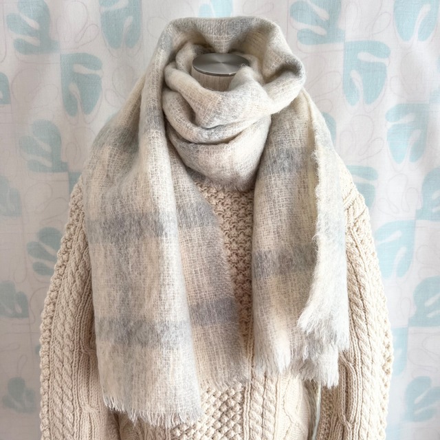 ヴィンテージチェック大判ストール。 アイルランド「Donegal Design」の手編みストールです。 うっとりするほど肌触りの心地良いモヘア混ウール。 合わせやすい優しい色味のチェック柄です。 {年代}--- {from}Euro(アイルランド) {実寸}長さ175cm 幅43cm {色}生成り ライトグレー {素材}モヘア70% ウール30% (100%ピュアニューウール) {コンディション}ノーダメージのグッドコンディションです。 ※必ずお読み下さい※ ★年代は当店の推定です。 ★商品は全て洗浄済みですが ヴィンテージならではの雰囲気を損なうような過度なクリーニングは避けております。 ★目立つダメージなどについては、説明文と画像でフォローしておりますが、目立たないものはUSEDの範囲内と判断し、省略させて頂いております。 ★採寸は平置きで計っております。多少の誤差はご了承下さいませ。 ★当ショップの商品は、すべてUSED、 VINTAGEの為、返品・交換などはお断りさせて頂いております。 ★撮影環境により色の出方が変わります。 ★パソコン環境・モニターなどの設定・仕様等で画像と実際の色合いが多少異なる場合がございます。 ★ブローチには落下防止用にピアスキャッチャーをお付けしております。 ★ご心配な点がございましたら、ご購入前にお気軽にお問い合わせ下さいませ。