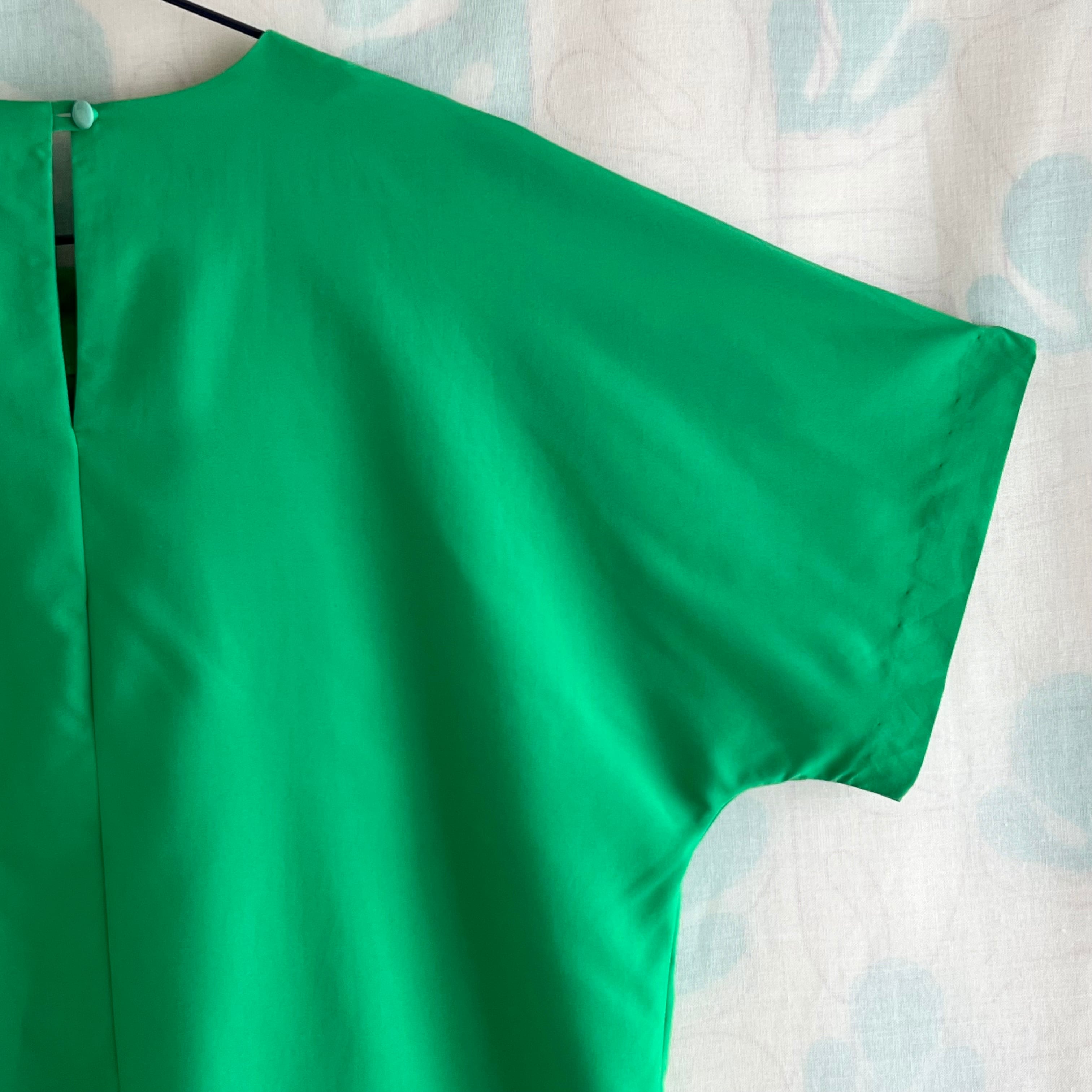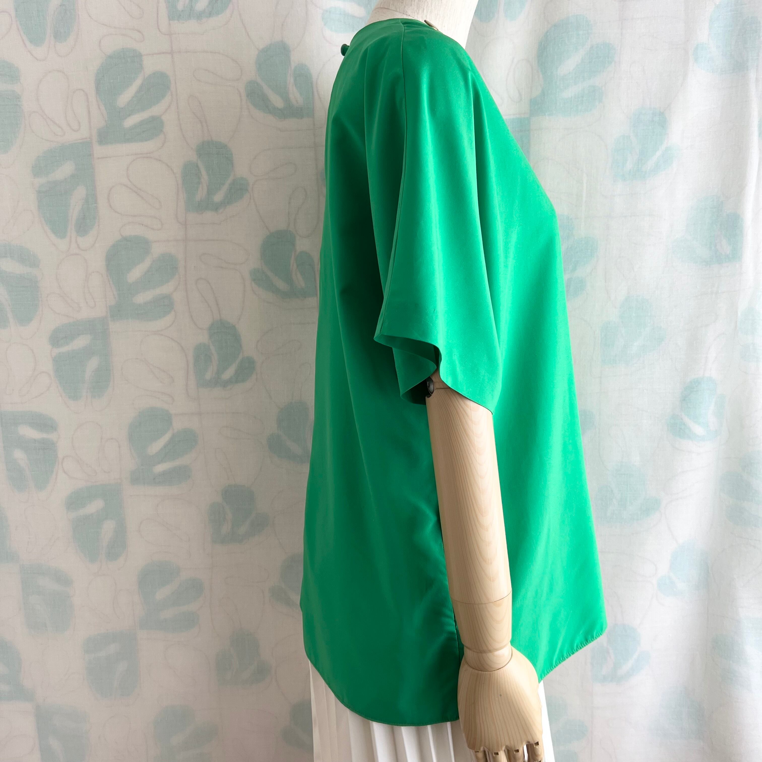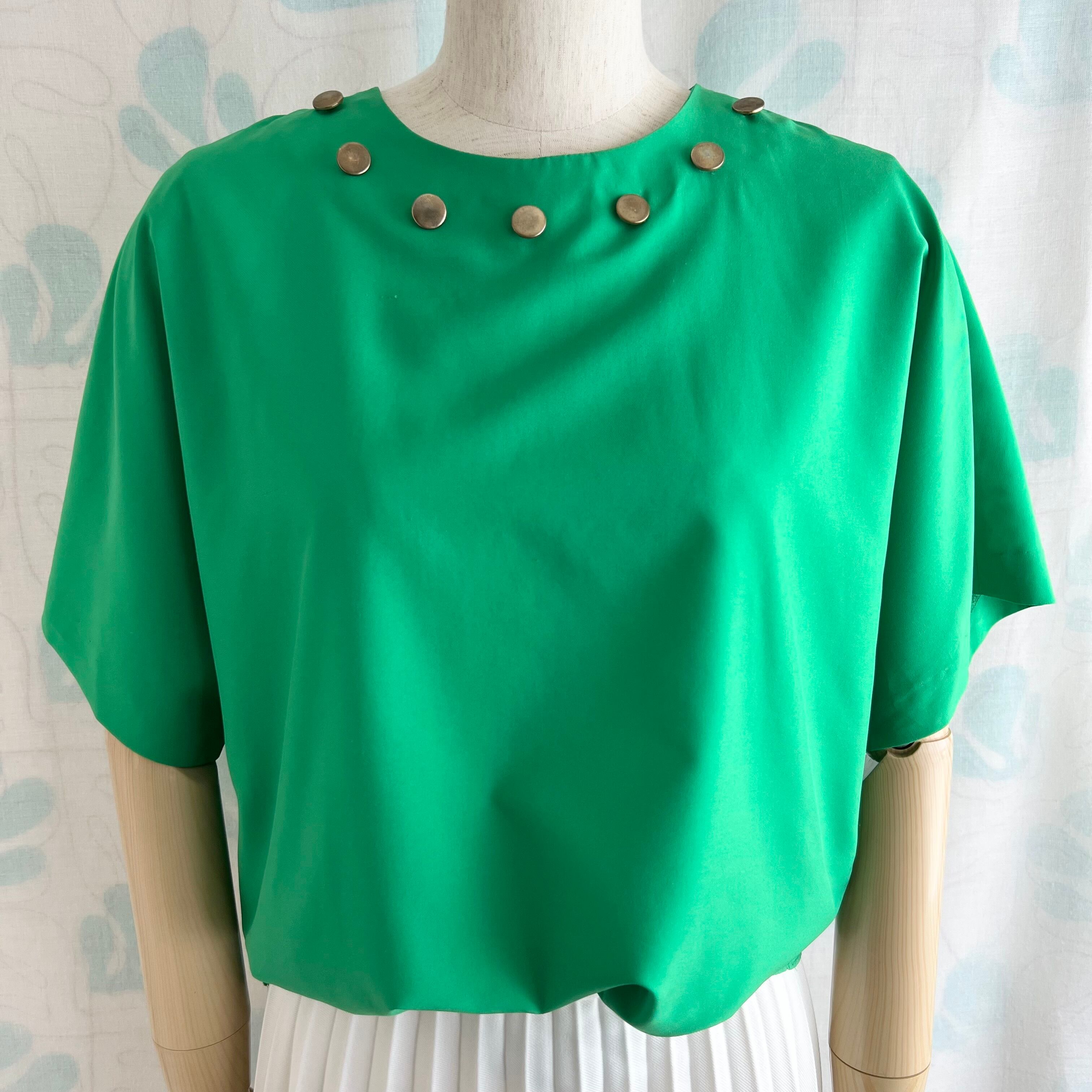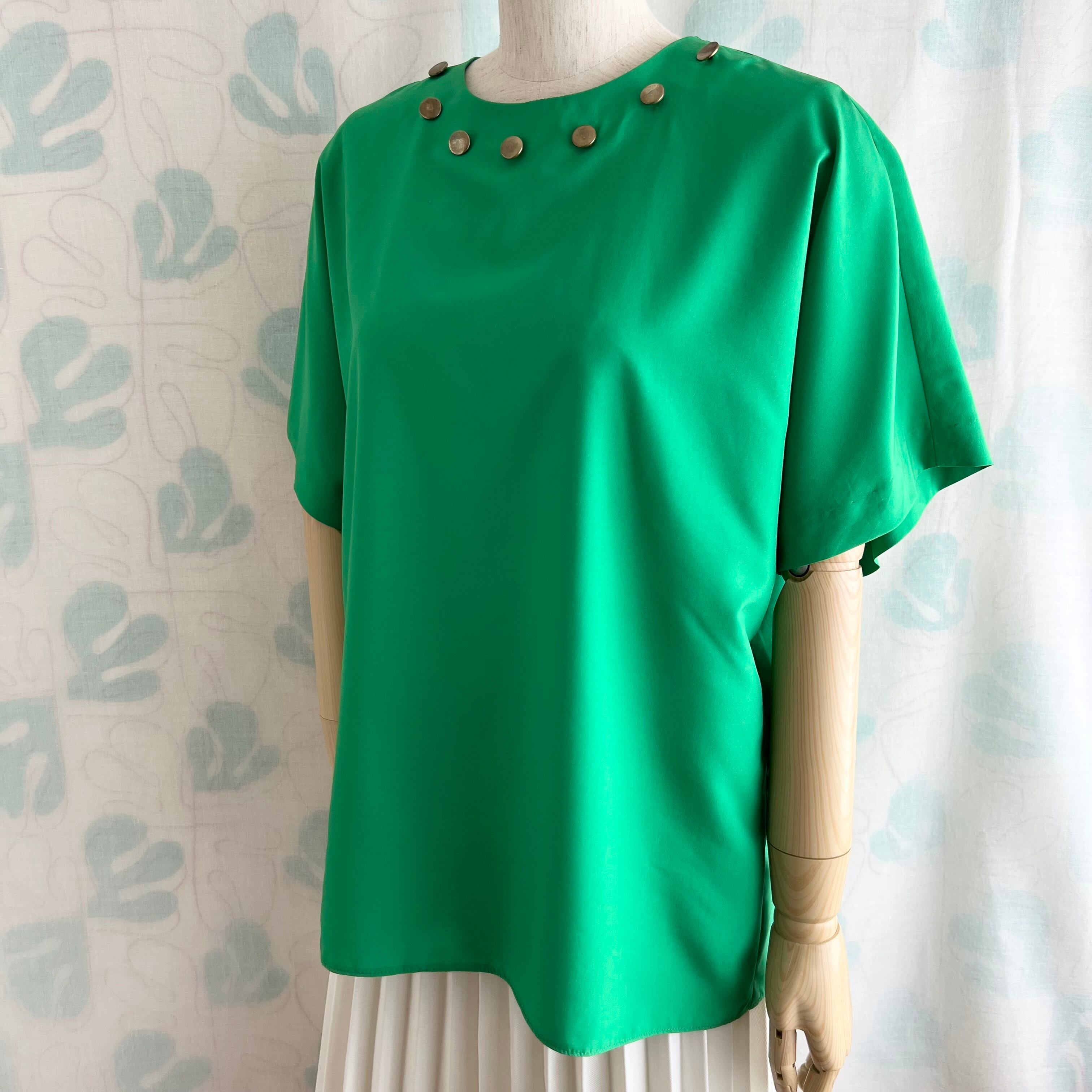 襟ぐりに真鍮色の飾りボタン付き。ドルマンスリーブ。
