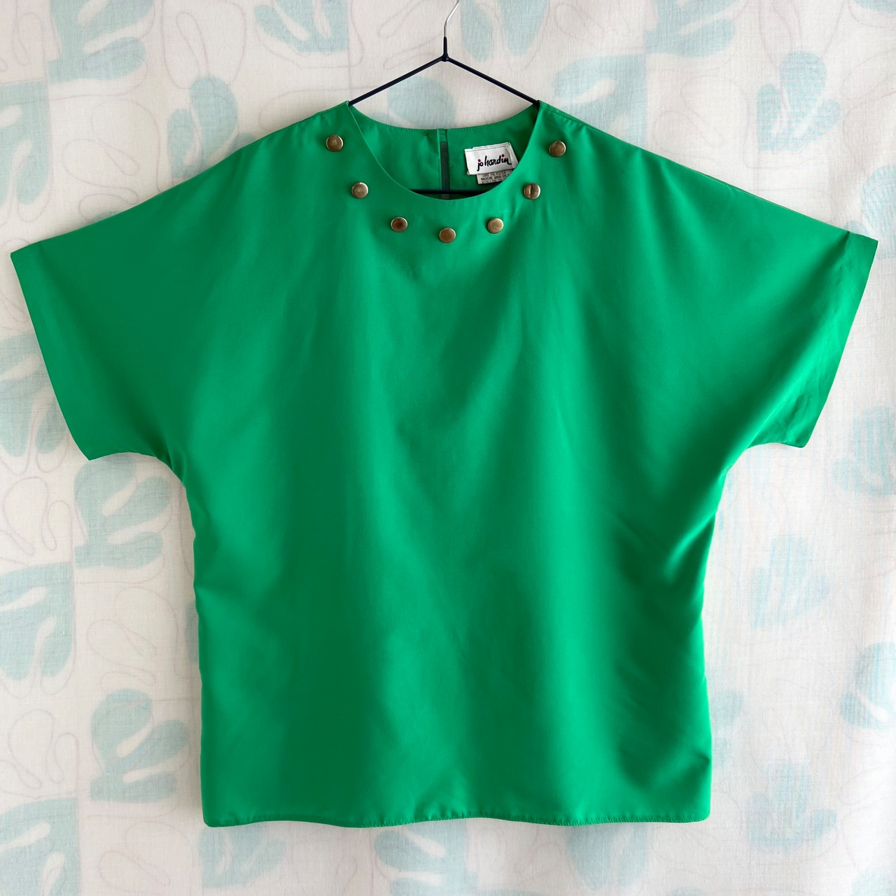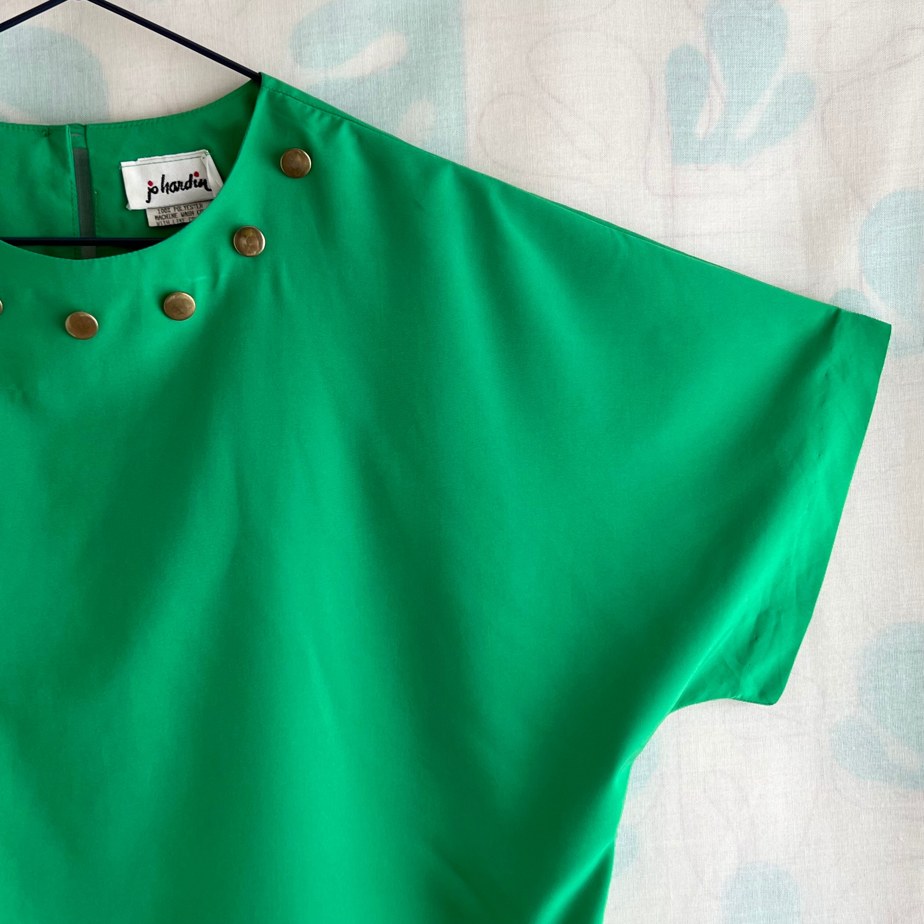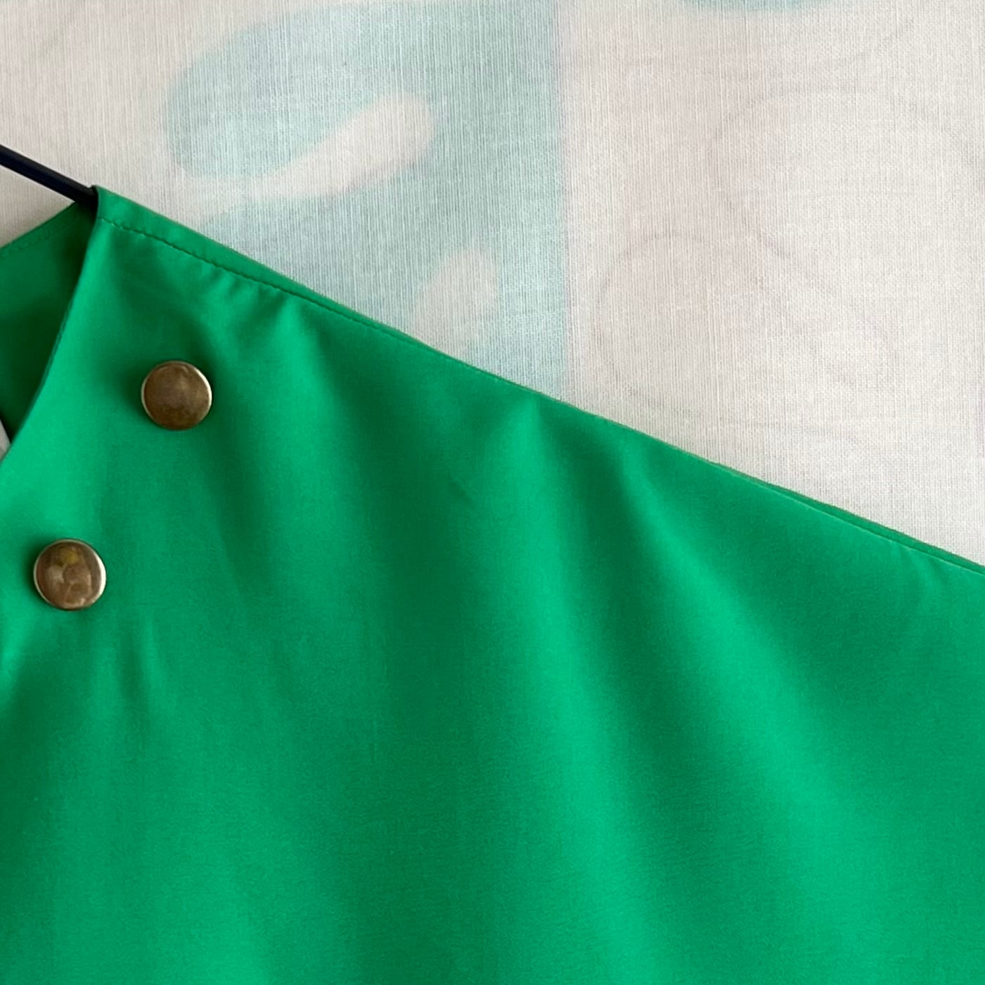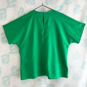 襟ぐりに真鍮色の飾りボタン付き。ドルマンスリーブ。