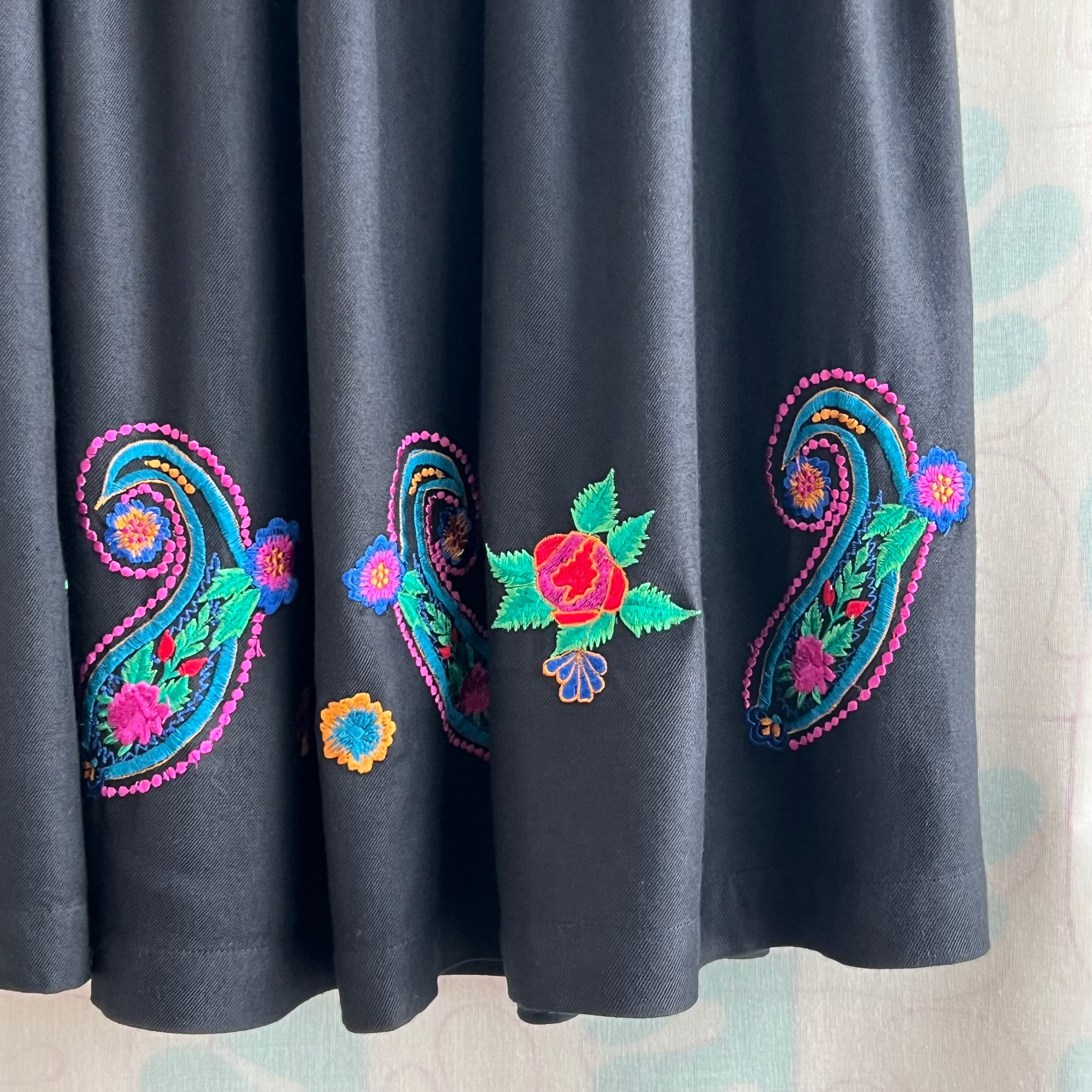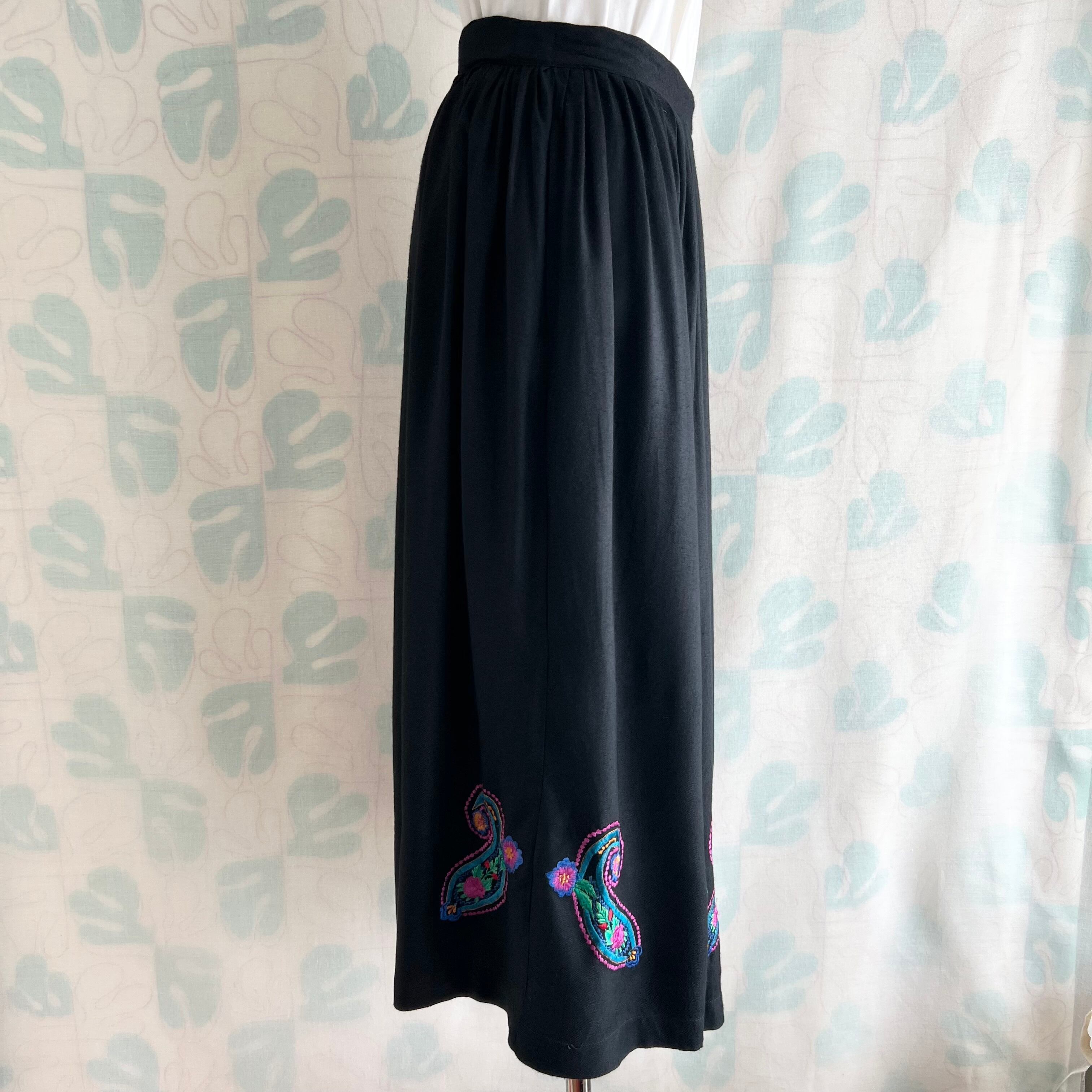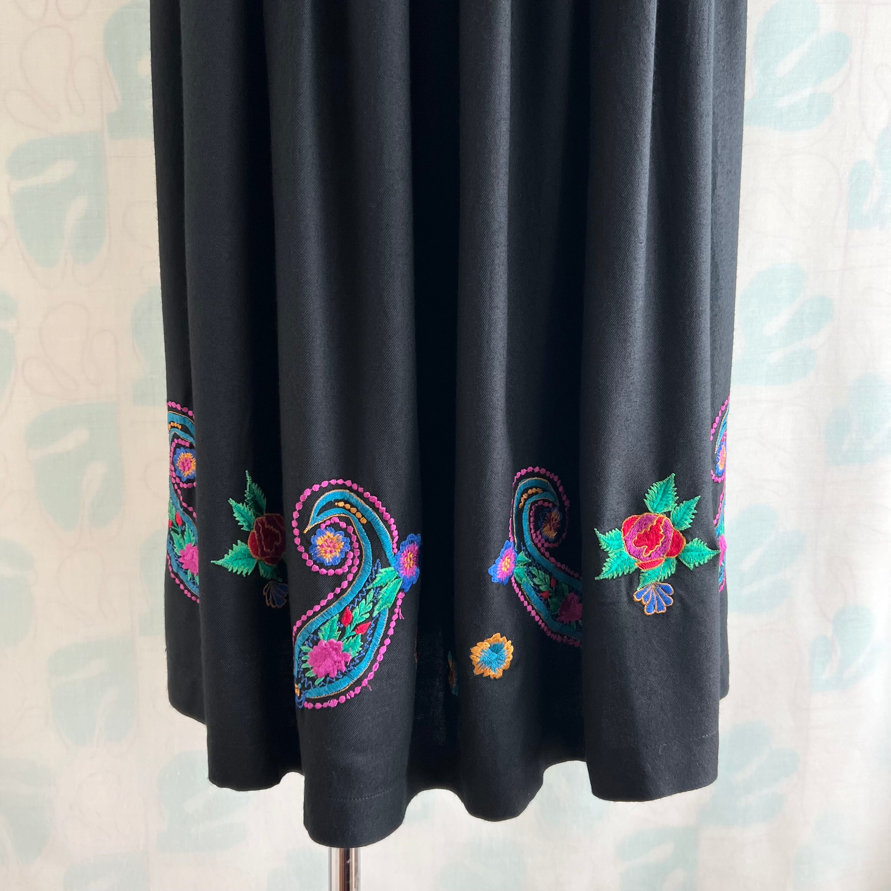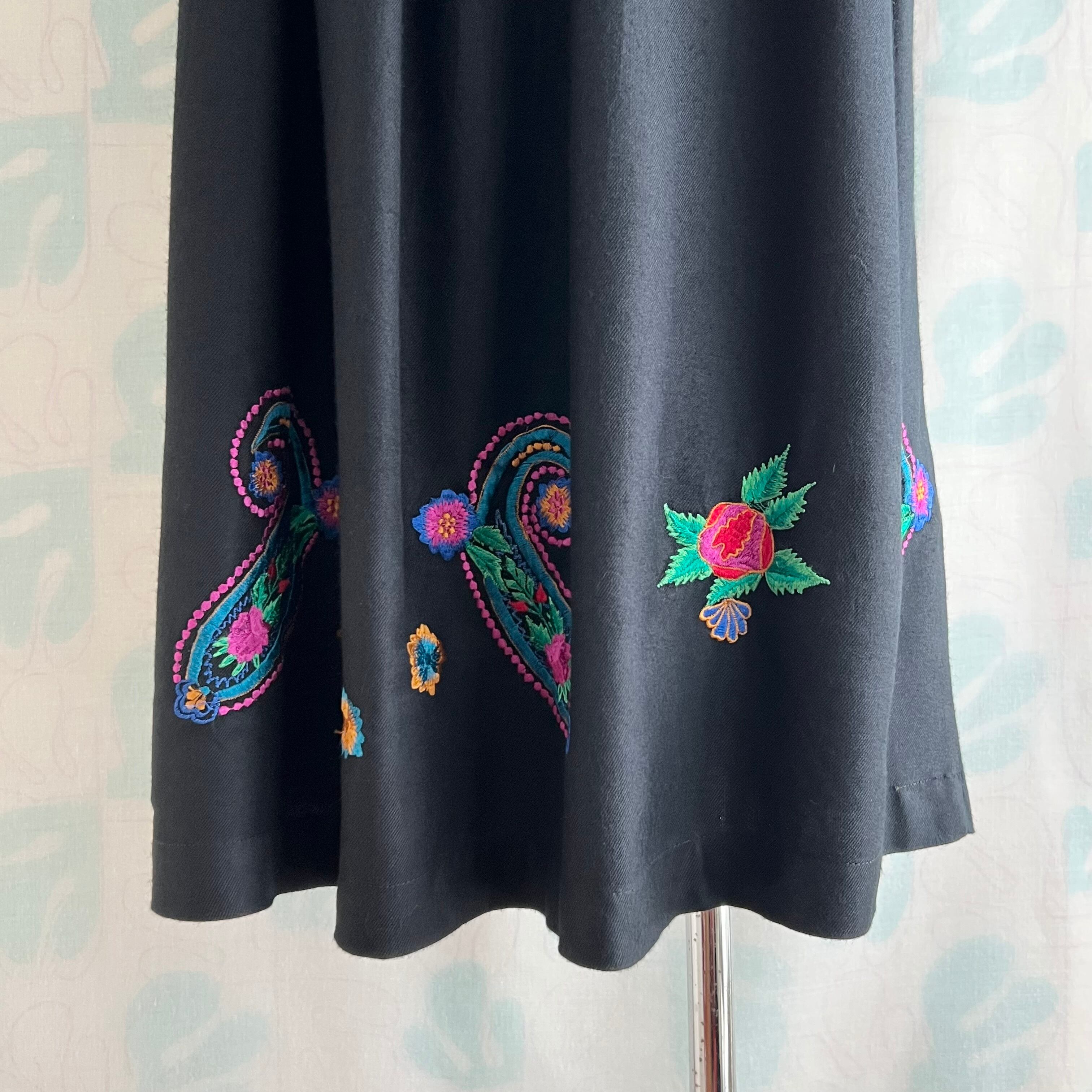 vintage カラフル刺繍ブラックロングスカート。