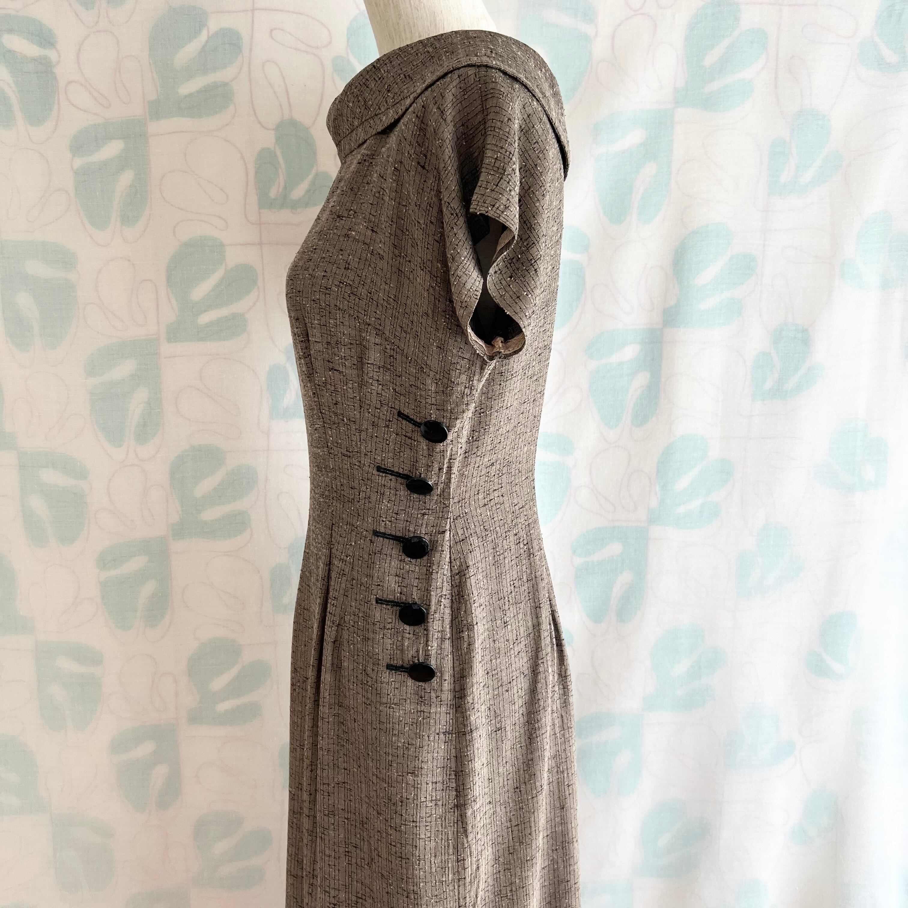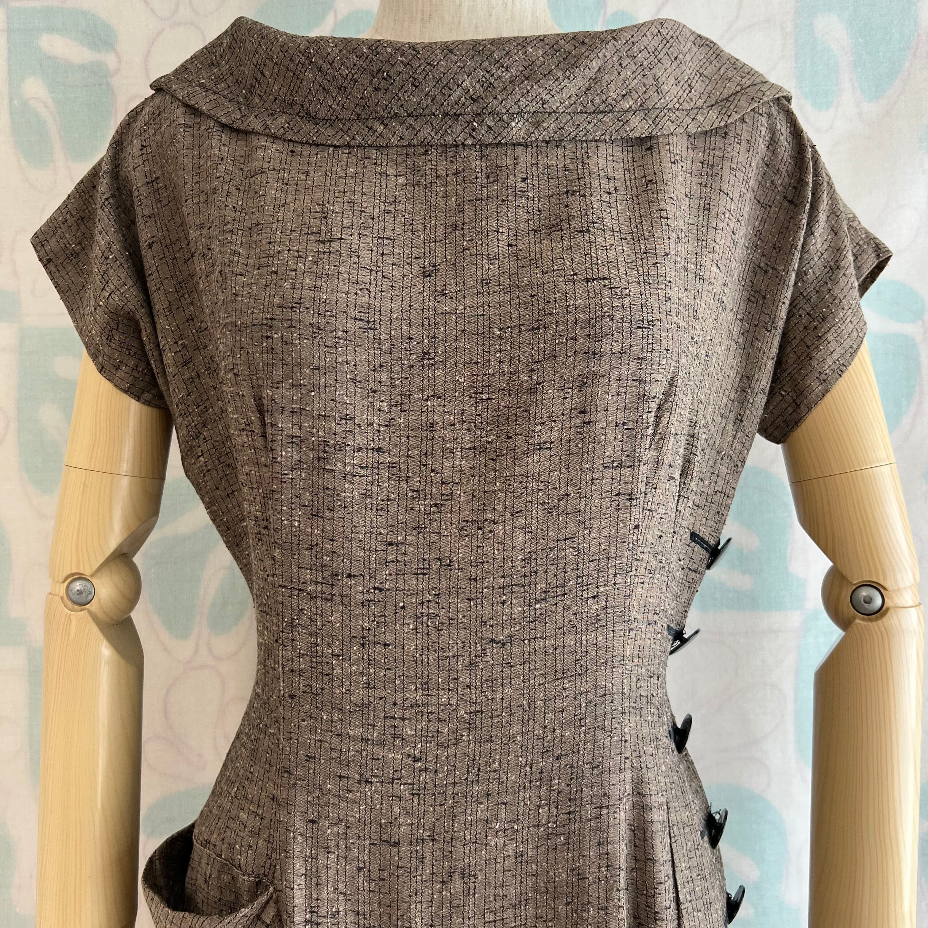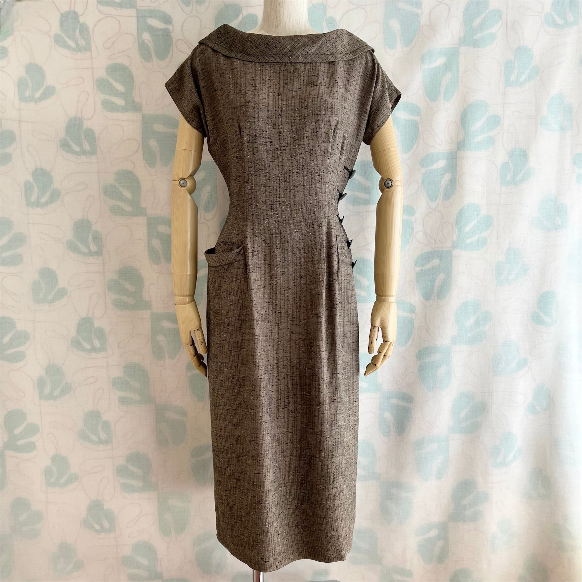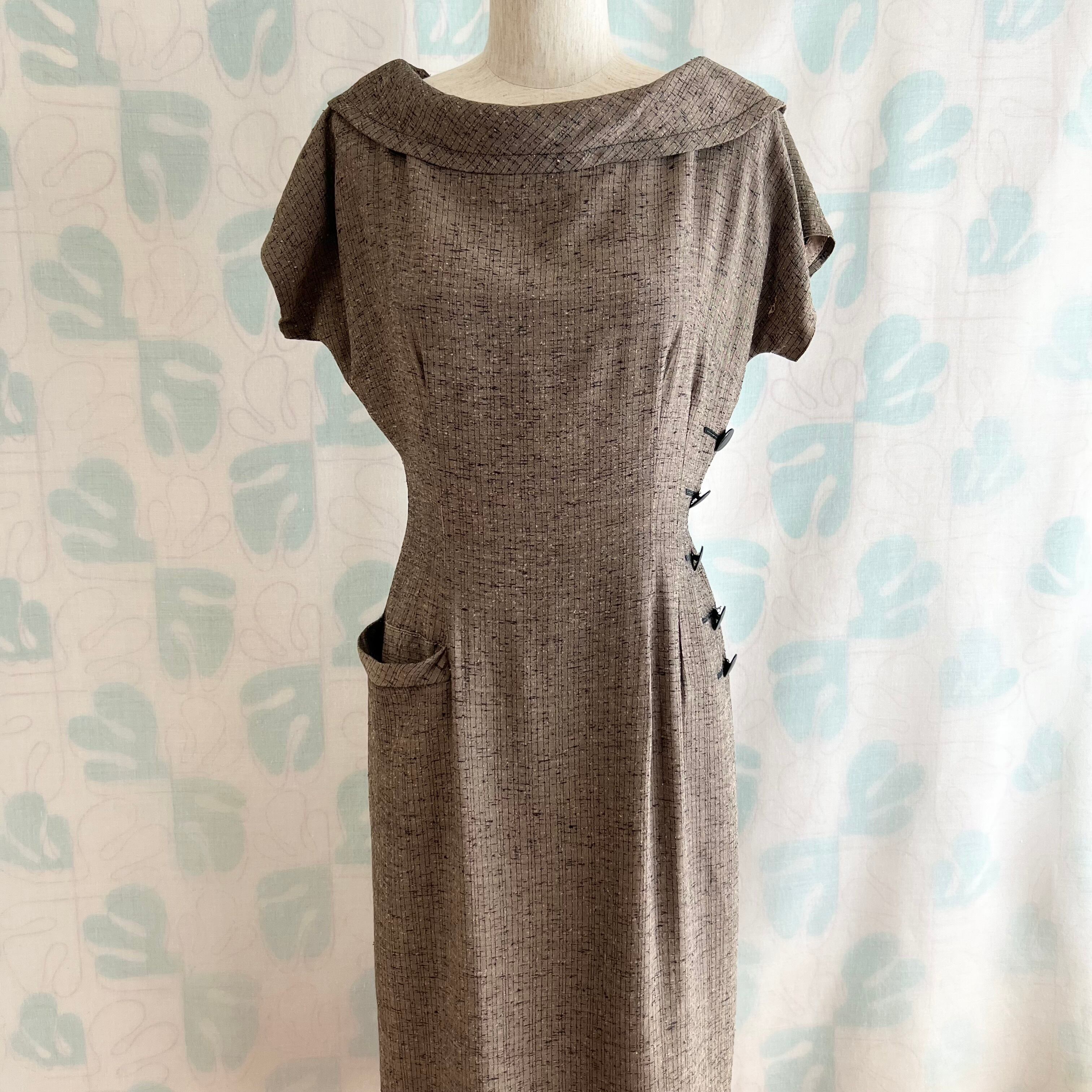 50's ブラウン ロールカラー フレンチスリーブドレス。
