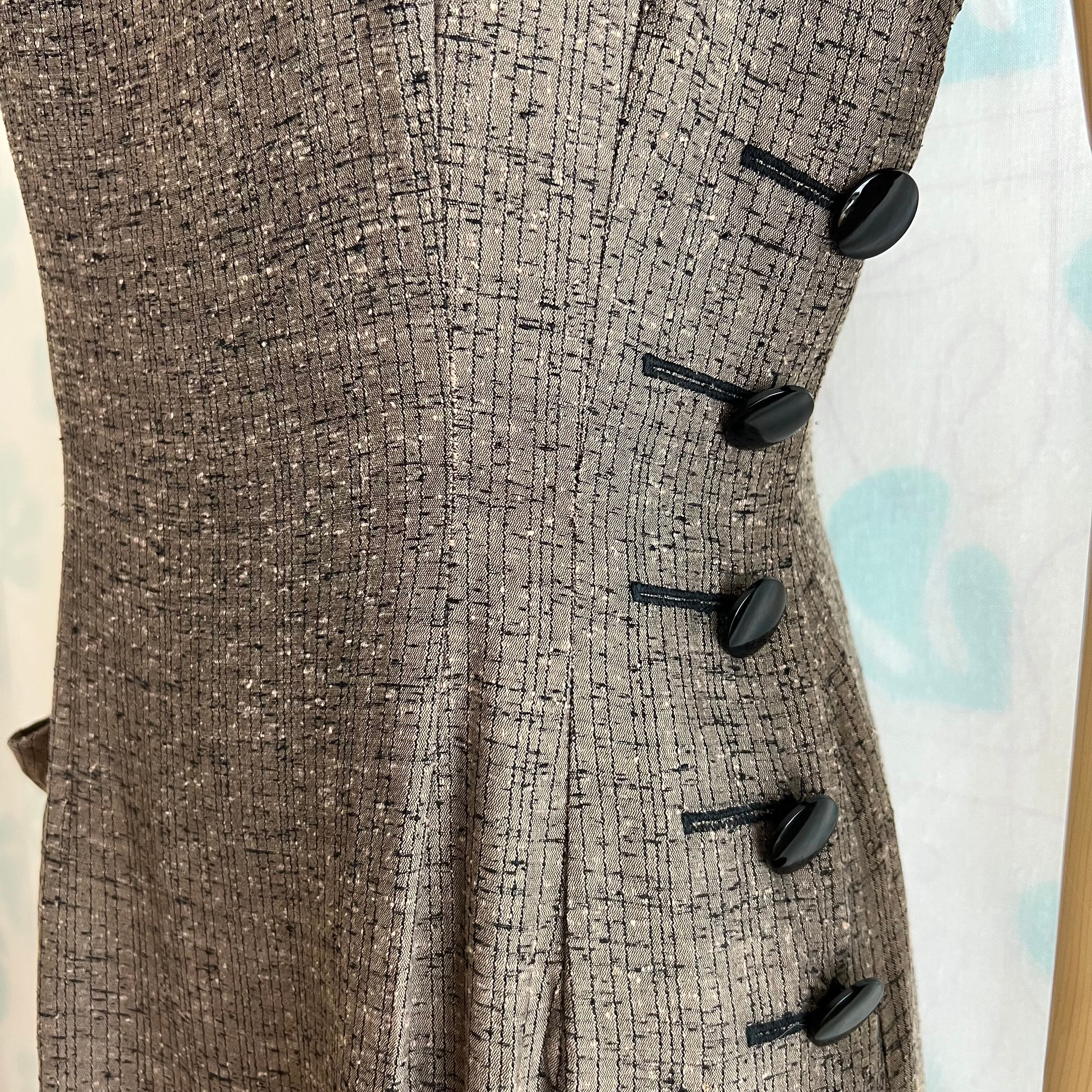 ボディス左に並んだ黒の飾りボタンが印象的なデザイン。