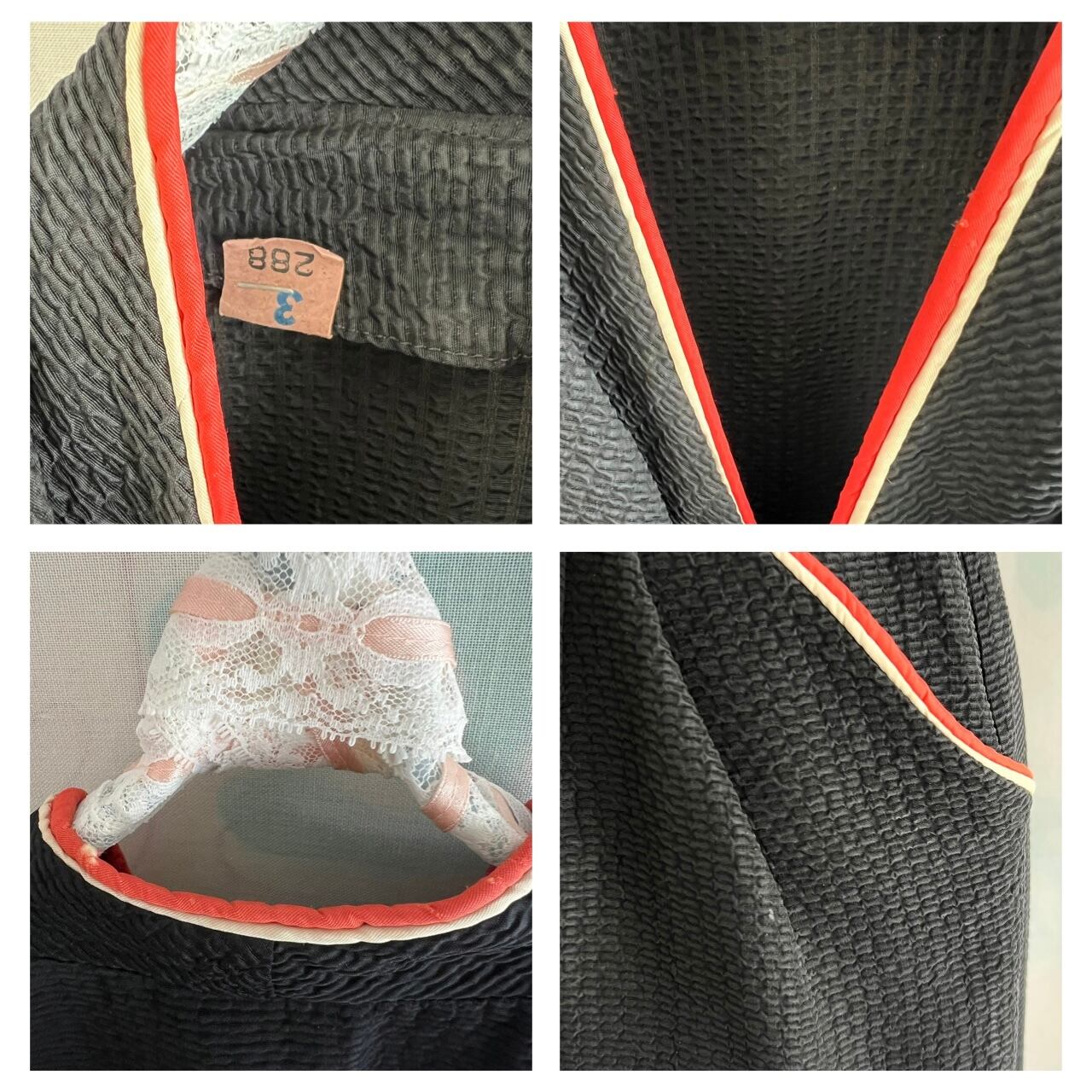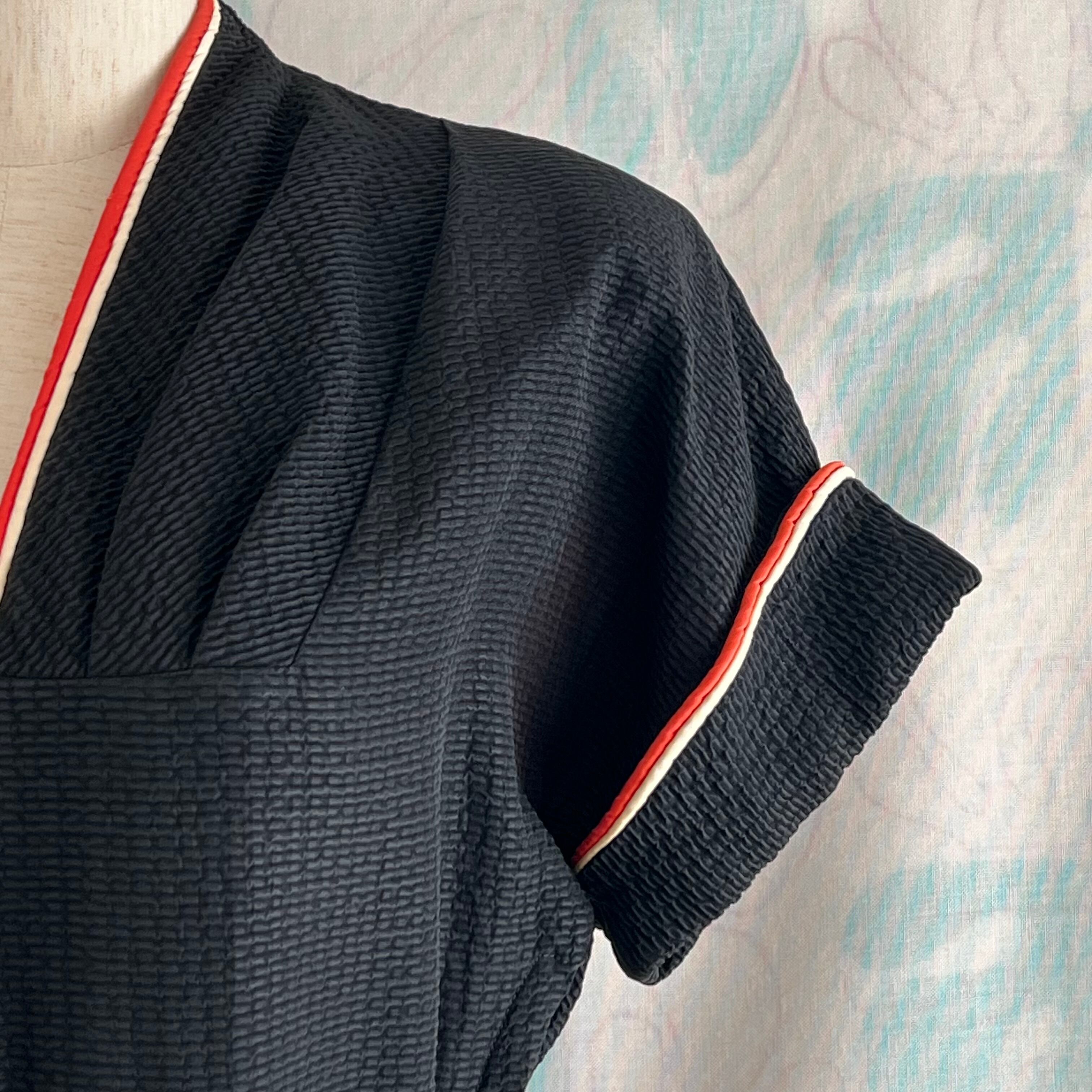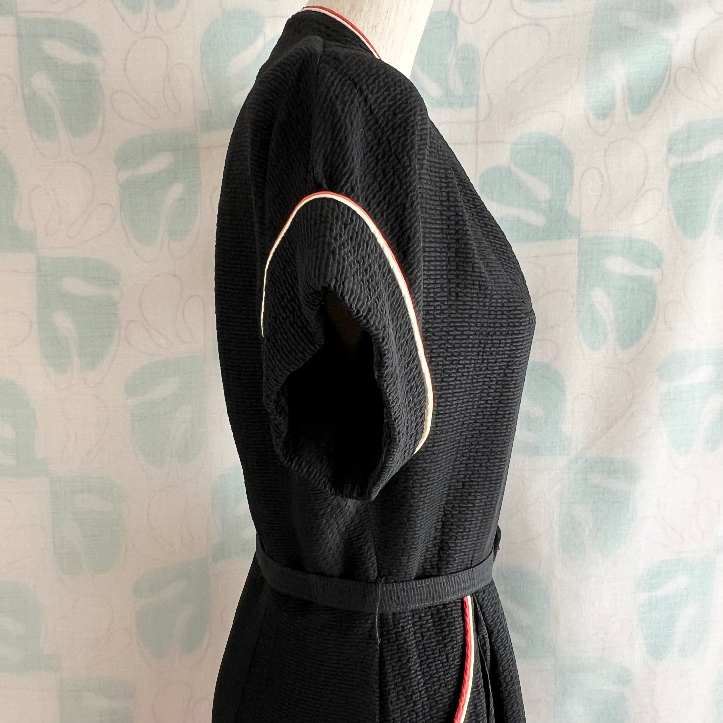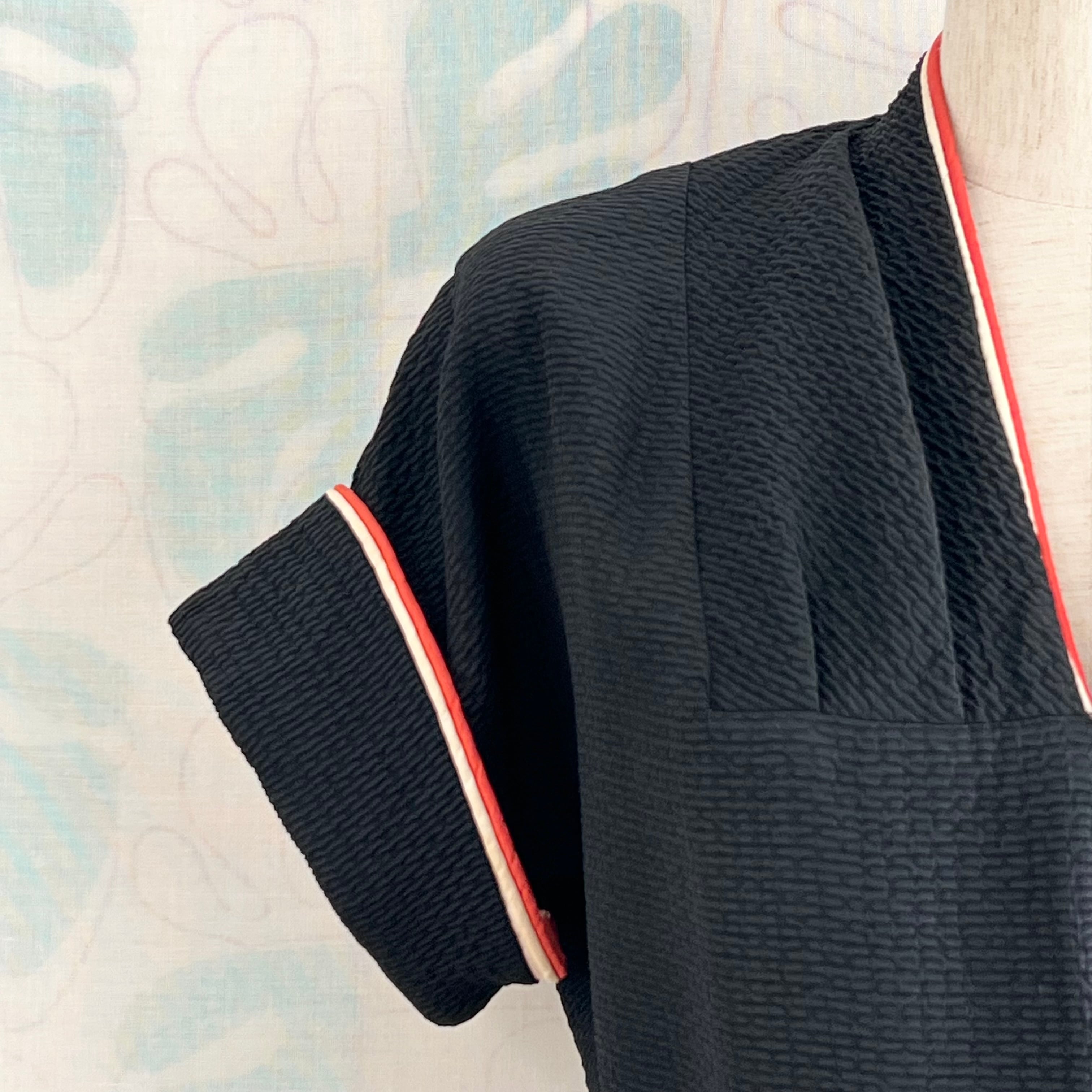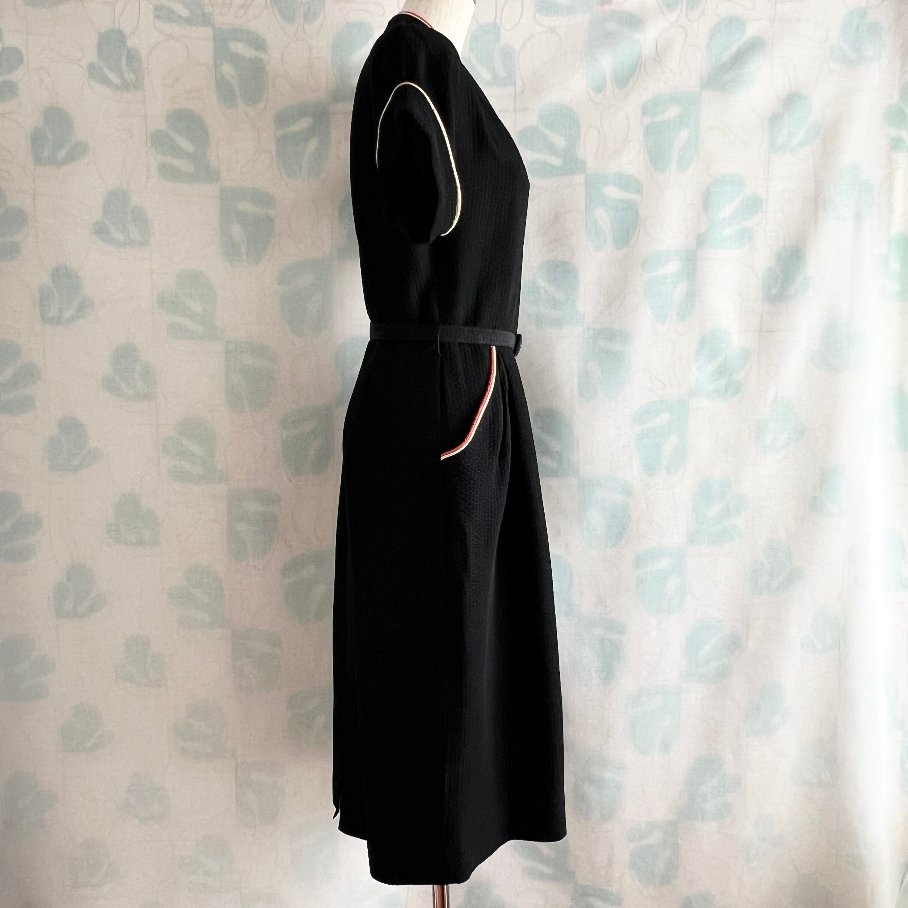 目を引く2色のパイピングが素敵なブラックドレスです。