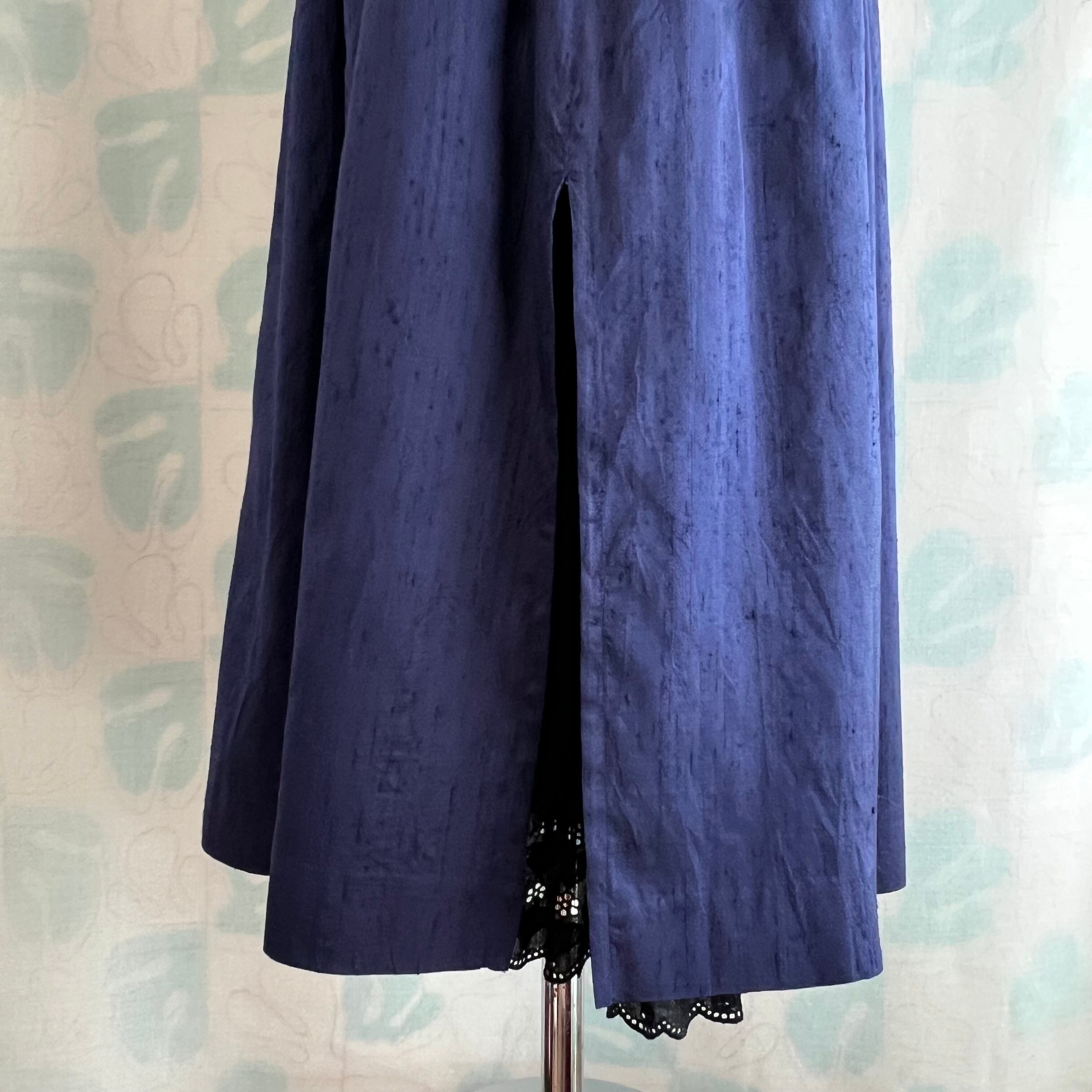 80's ネイビーシルクシャンタンギャザースカート(レース裏地付き)。