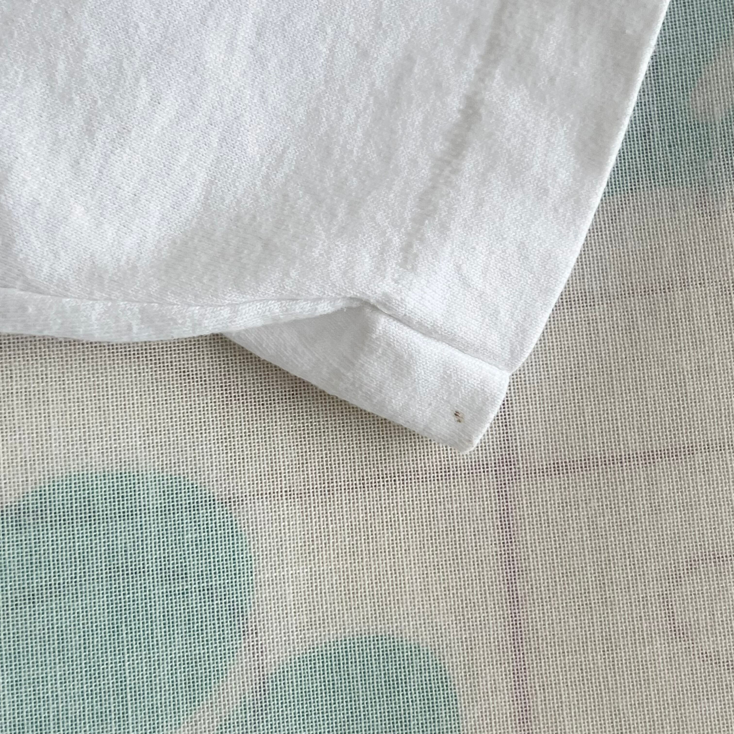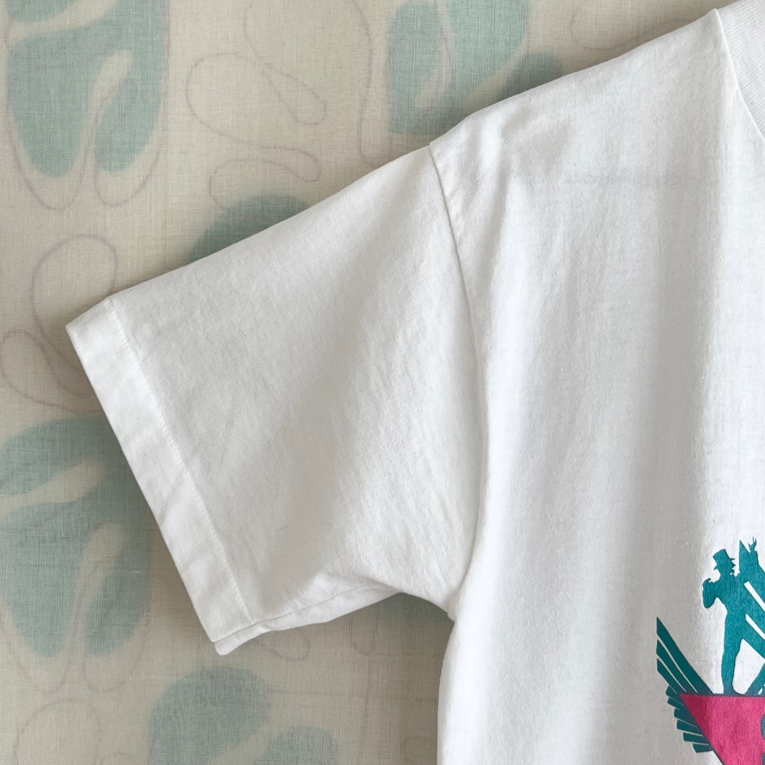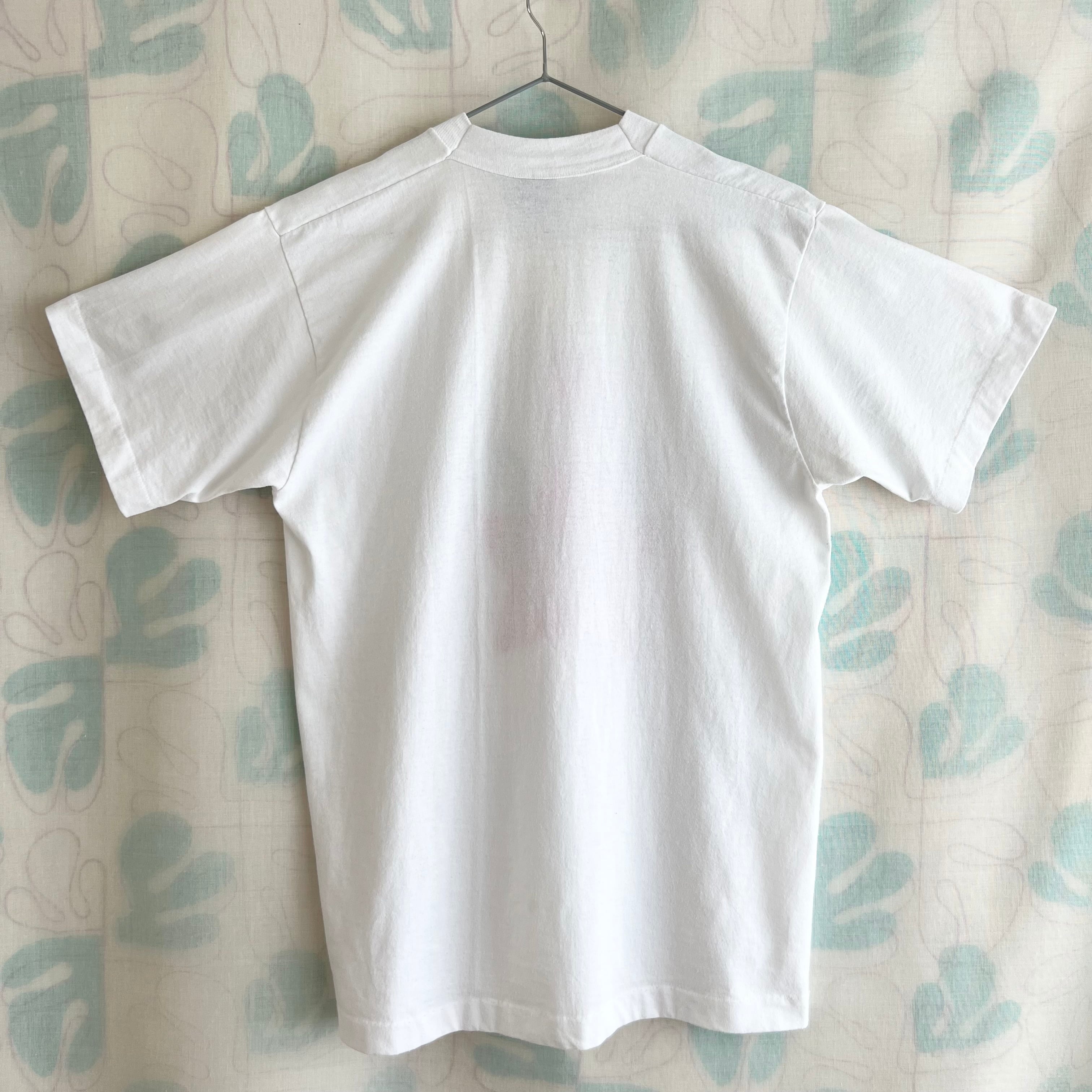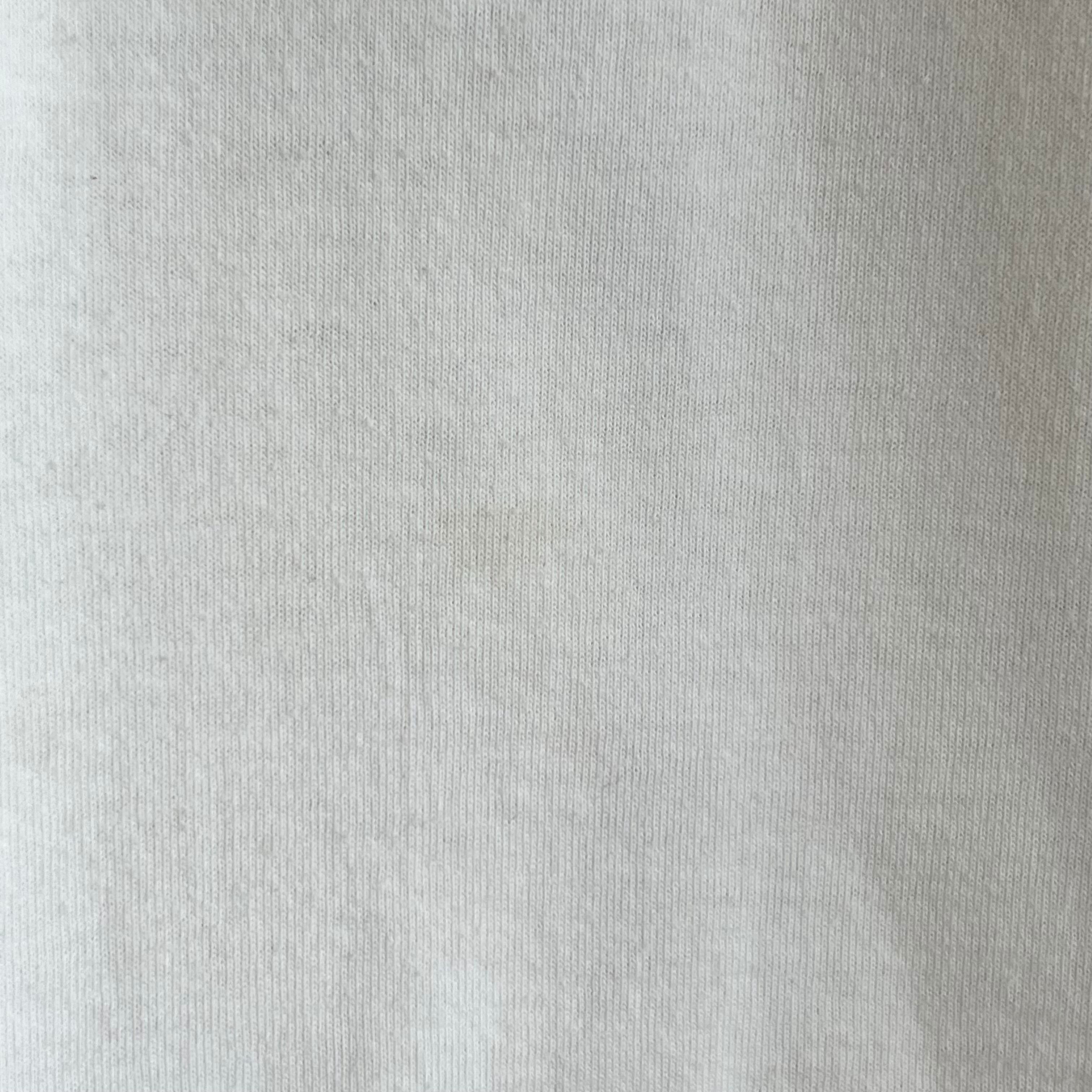 {コンディション}微細な毛玉、後ろ左の袖口に点染み、フロント左のプリント下の方に1cm程の薄ら染み、生地の折り線があります。プリントは綺麗な状態です。