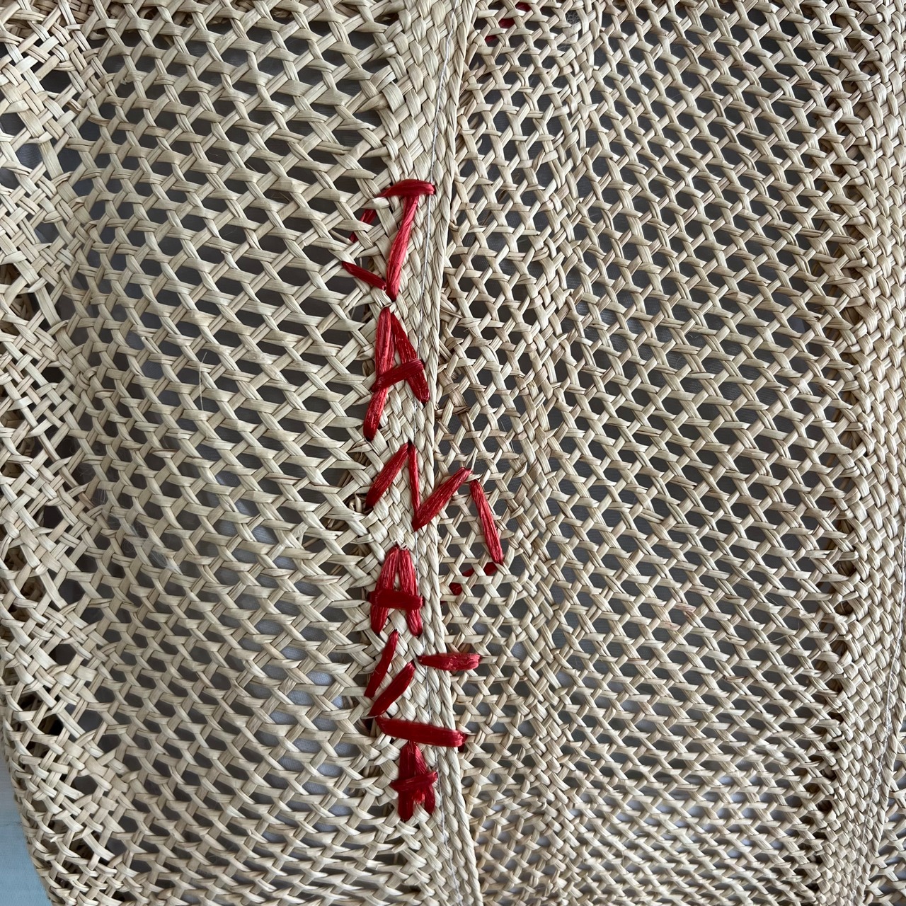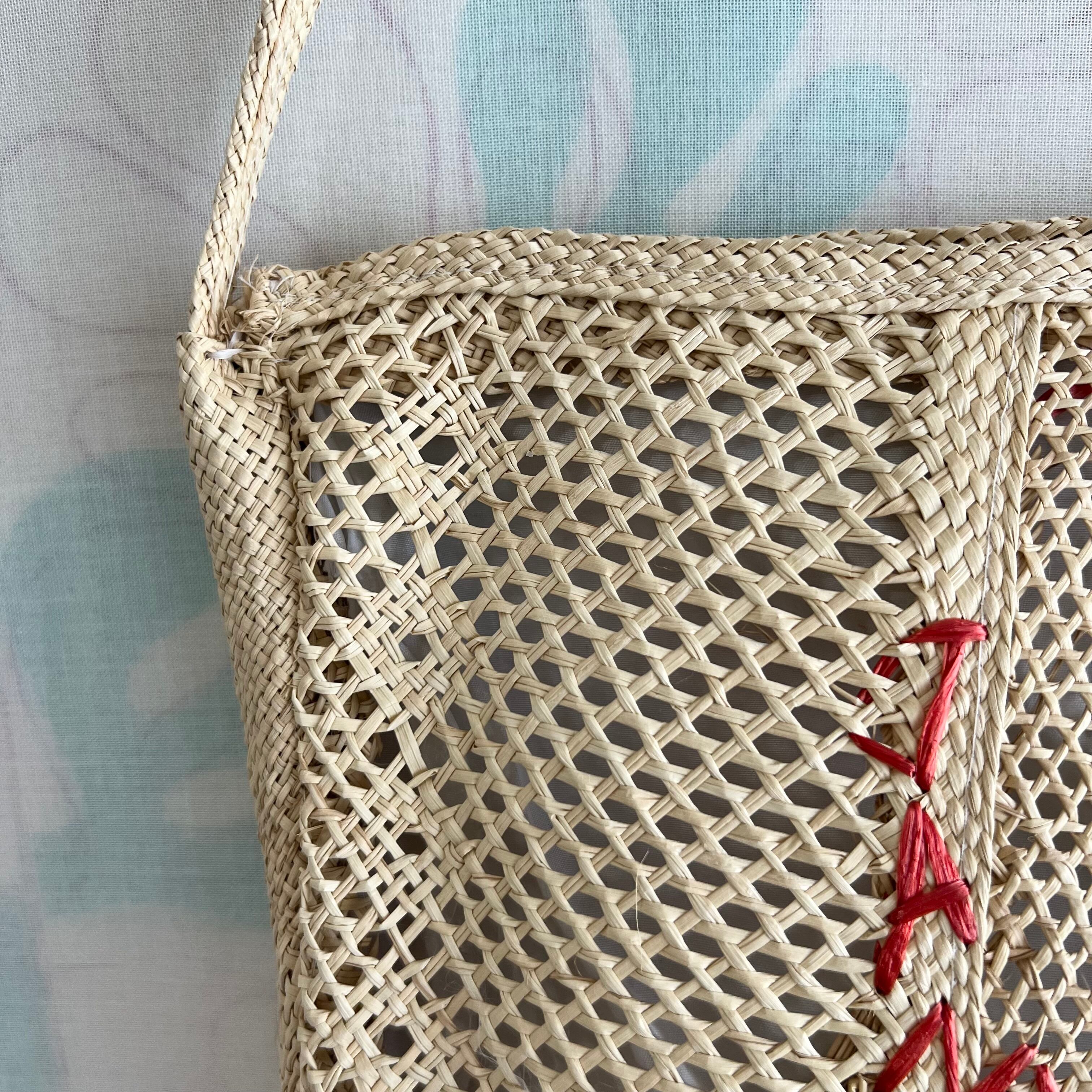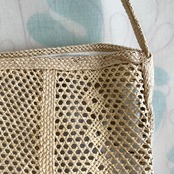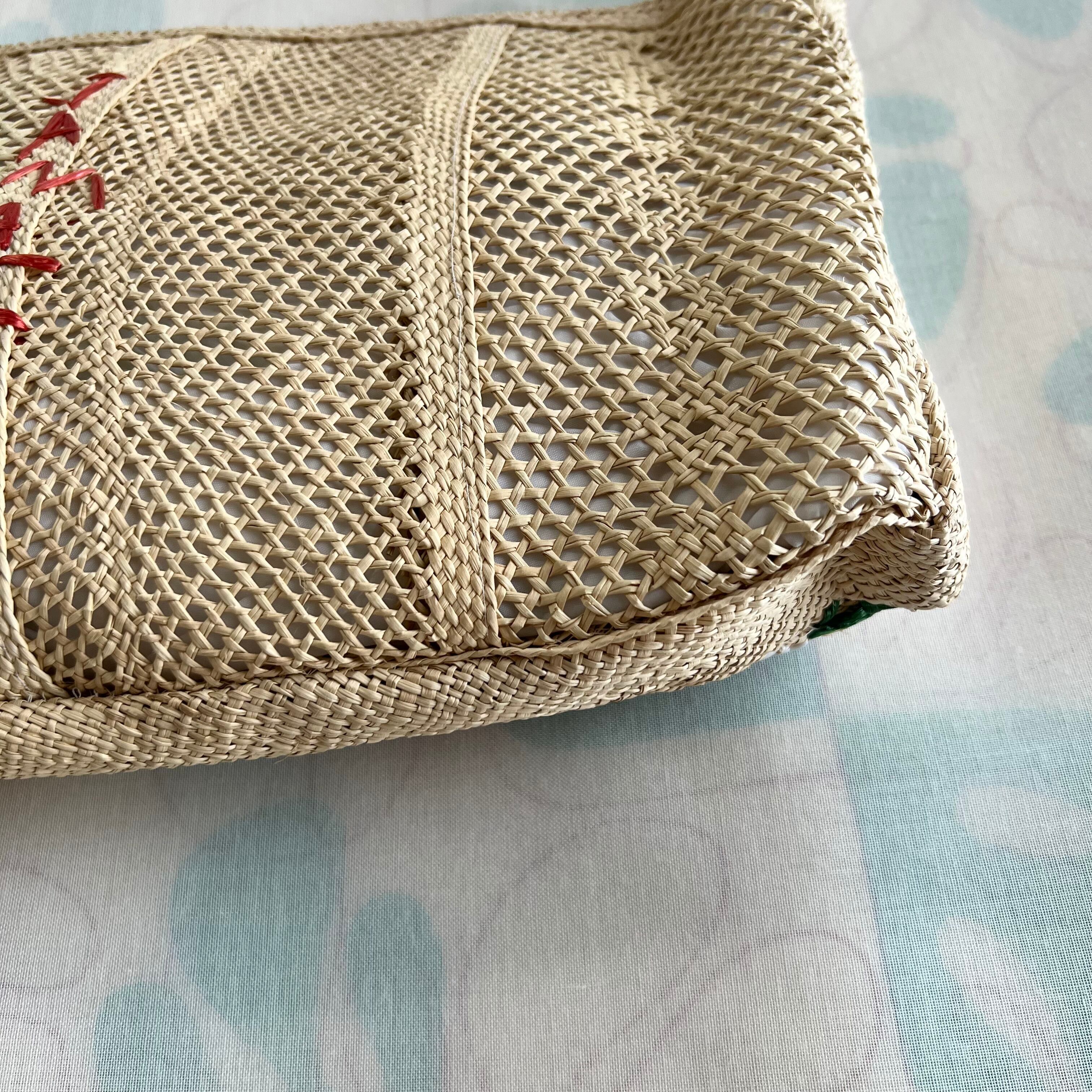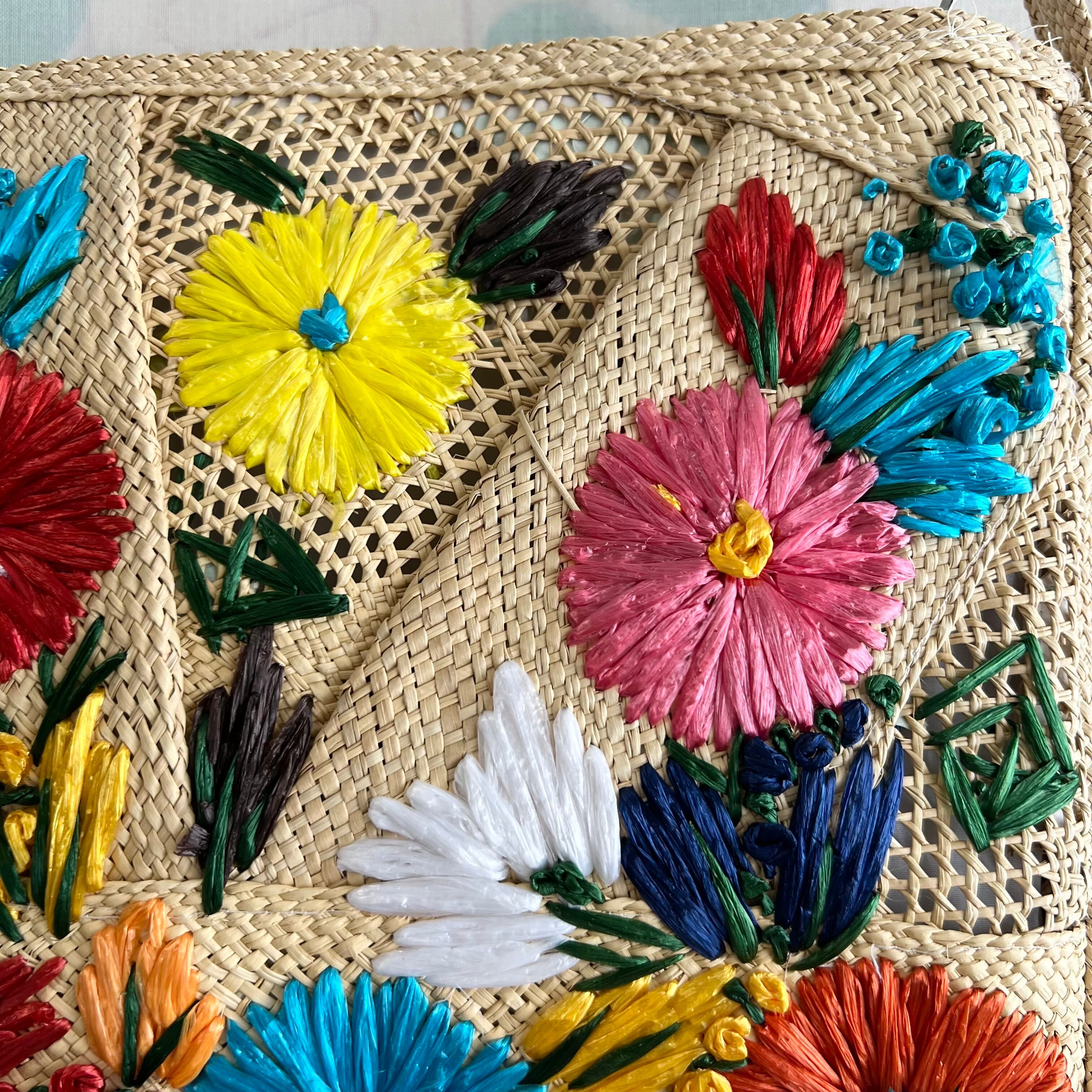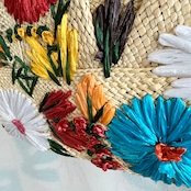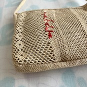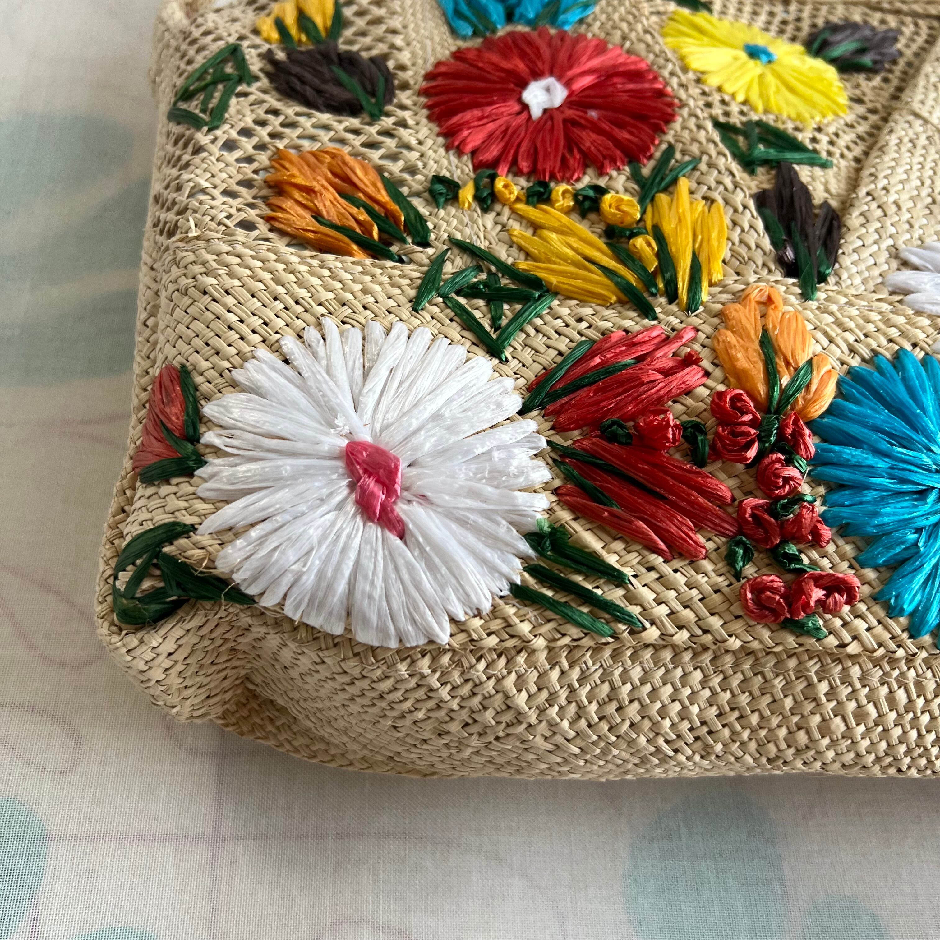 {コンディション}取手付け根の縫製に雑さが見られます。刺繍テープの端が出ているお花(右上小さな茶色と左下赤のと真ん中下青の花)があります。天然木皮の飛び出しが数箇所あります。裏地は若干の使用感はありますが、ダメージは見当たりません。