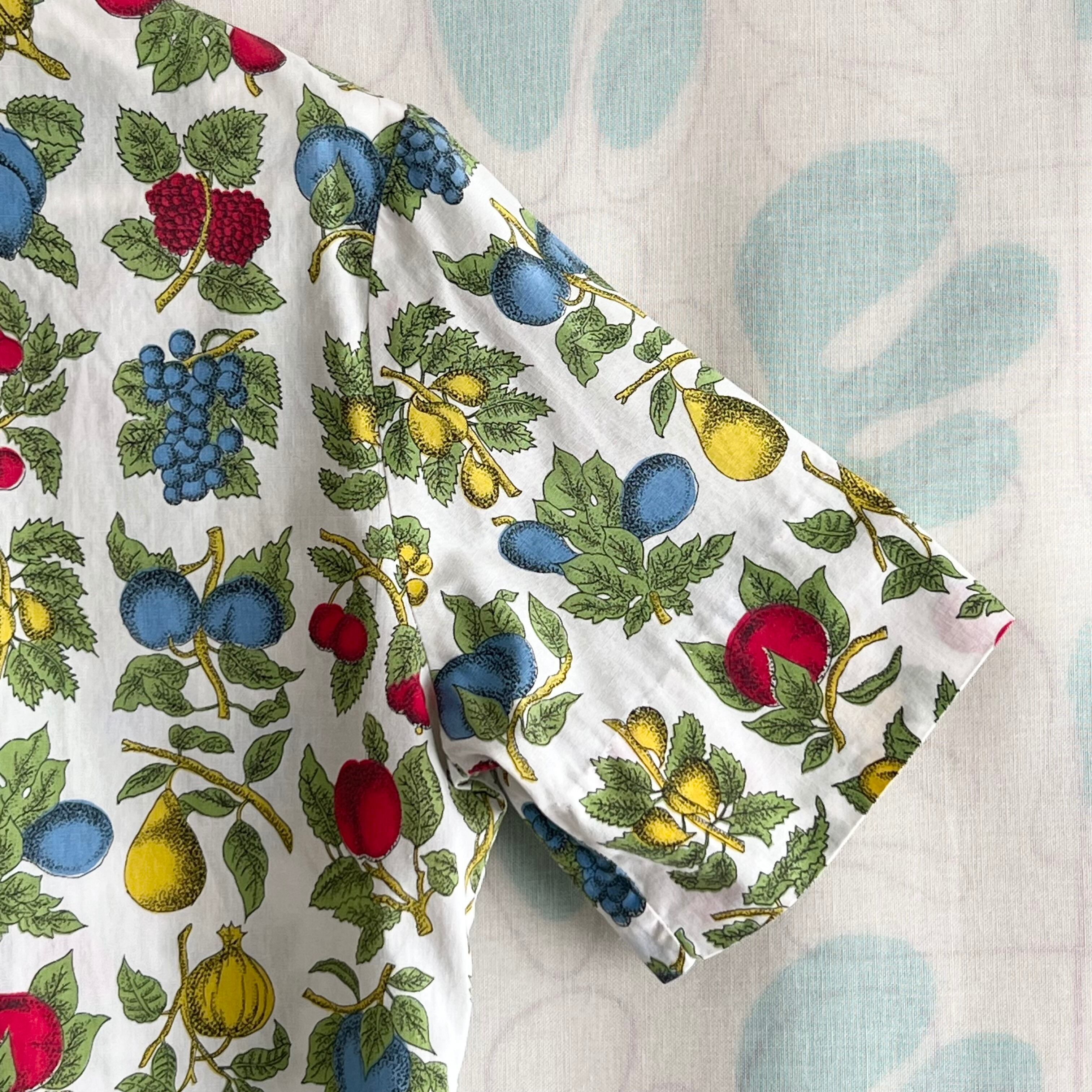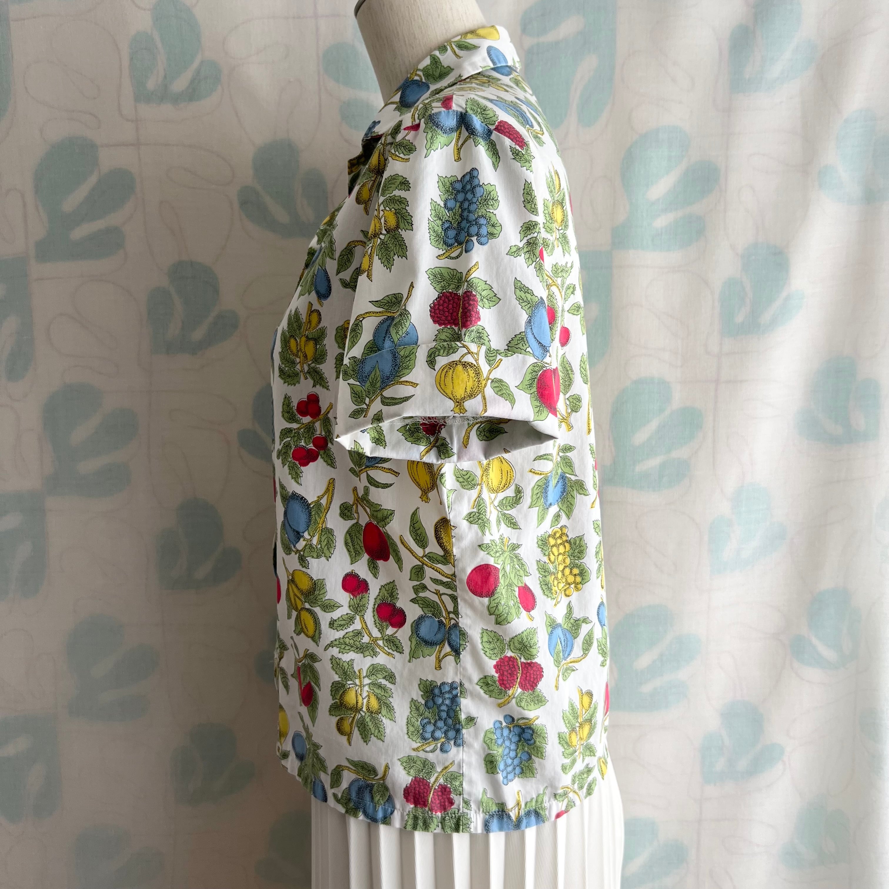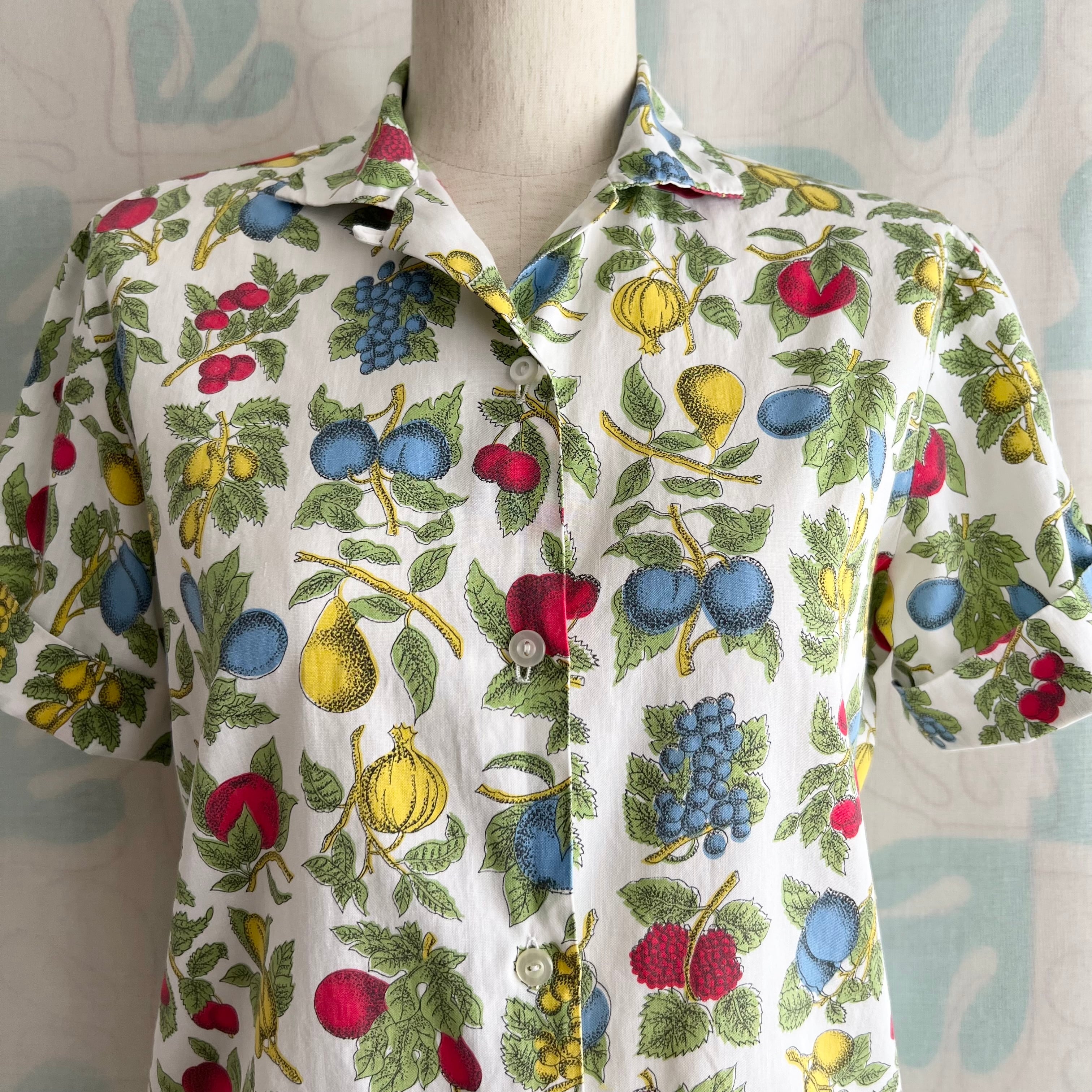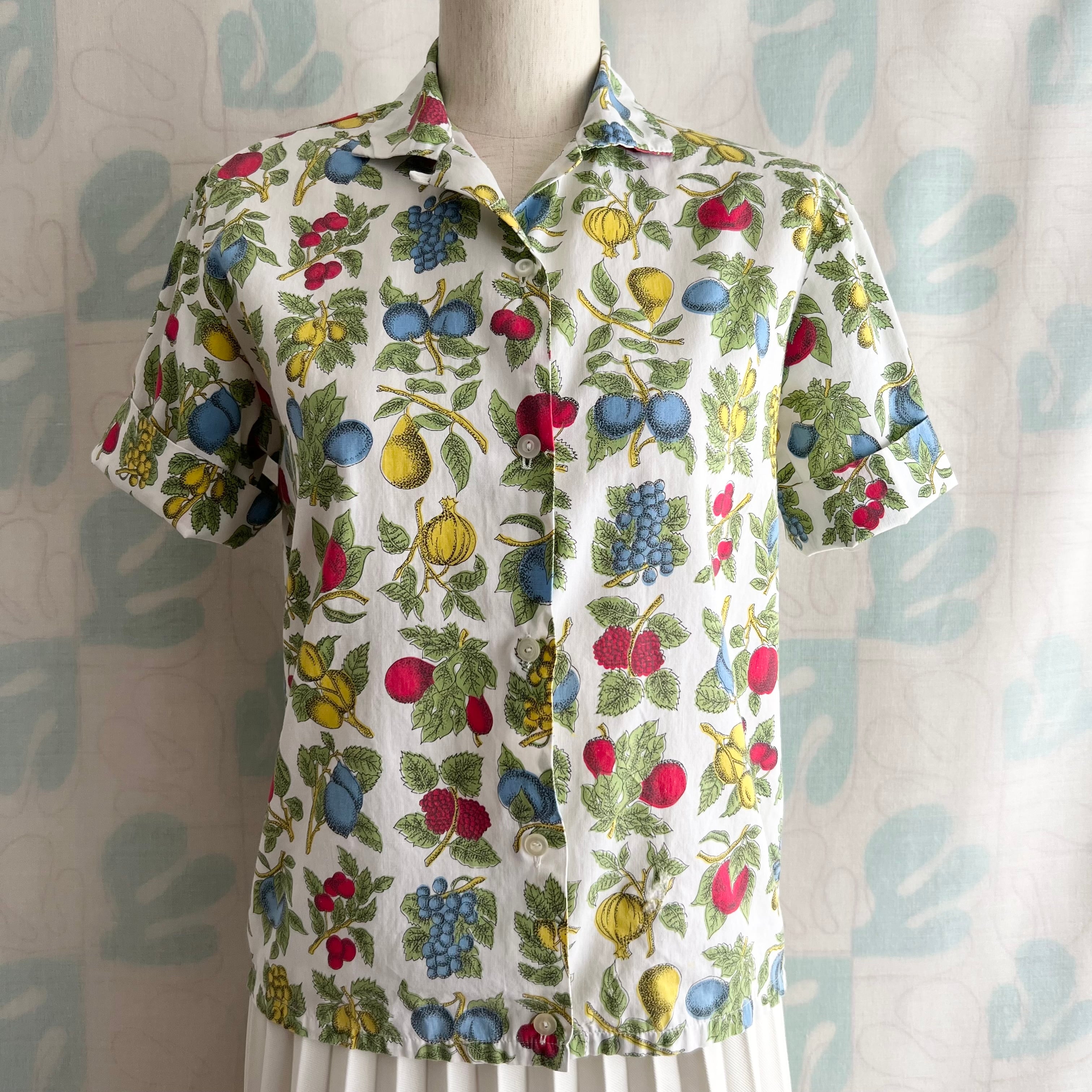 素敵なフルーツ柄が図鑑のように並ぶオープンカラーブラウスです。