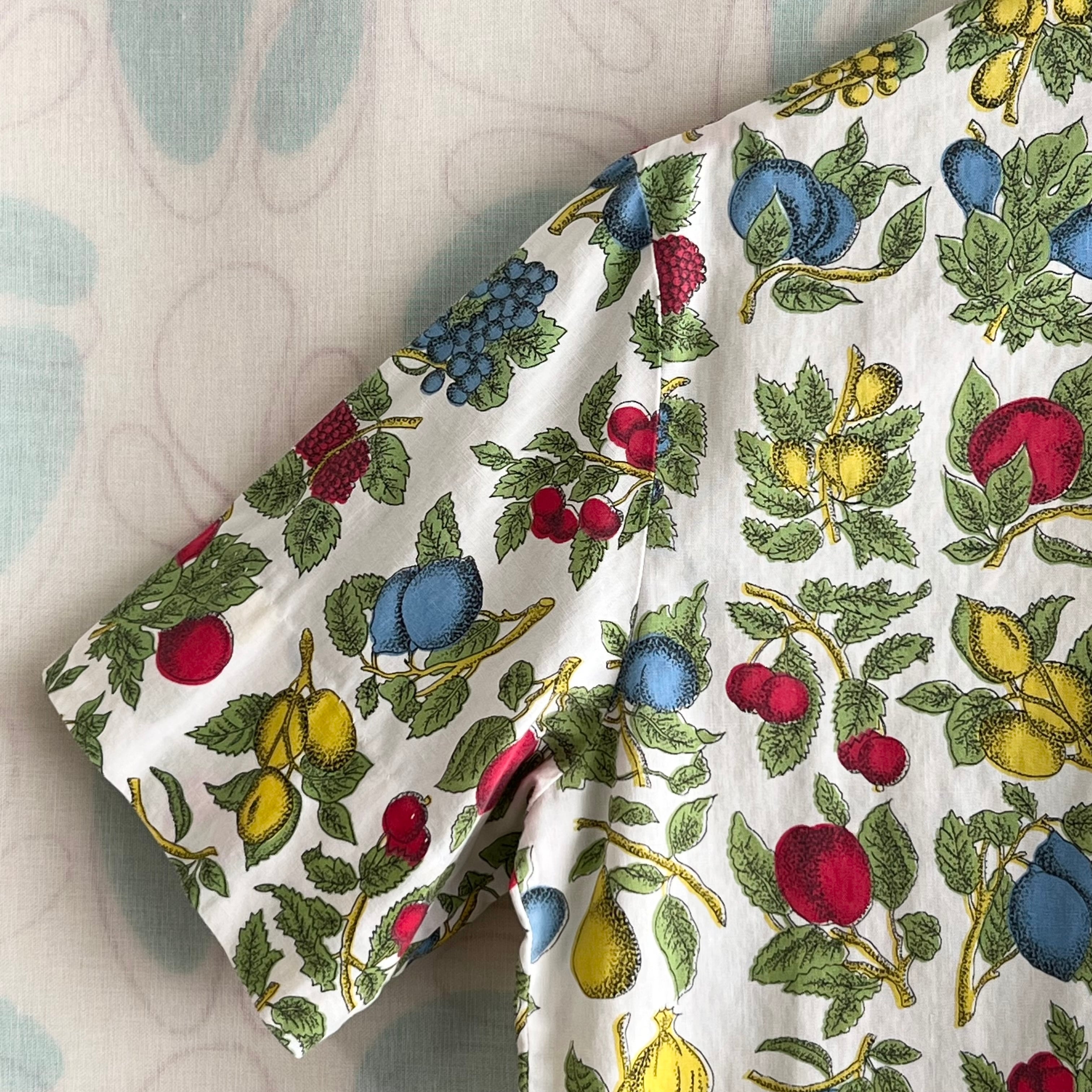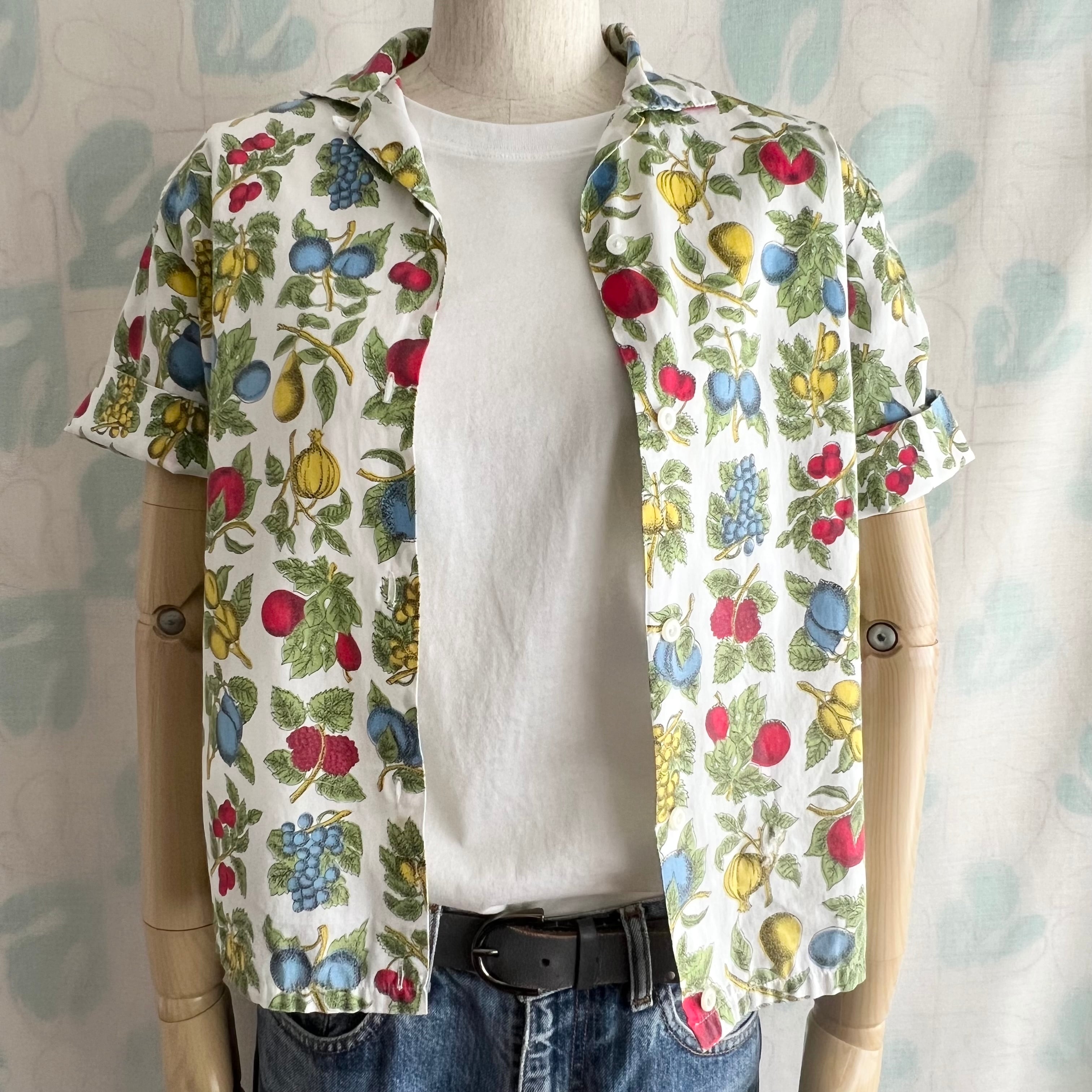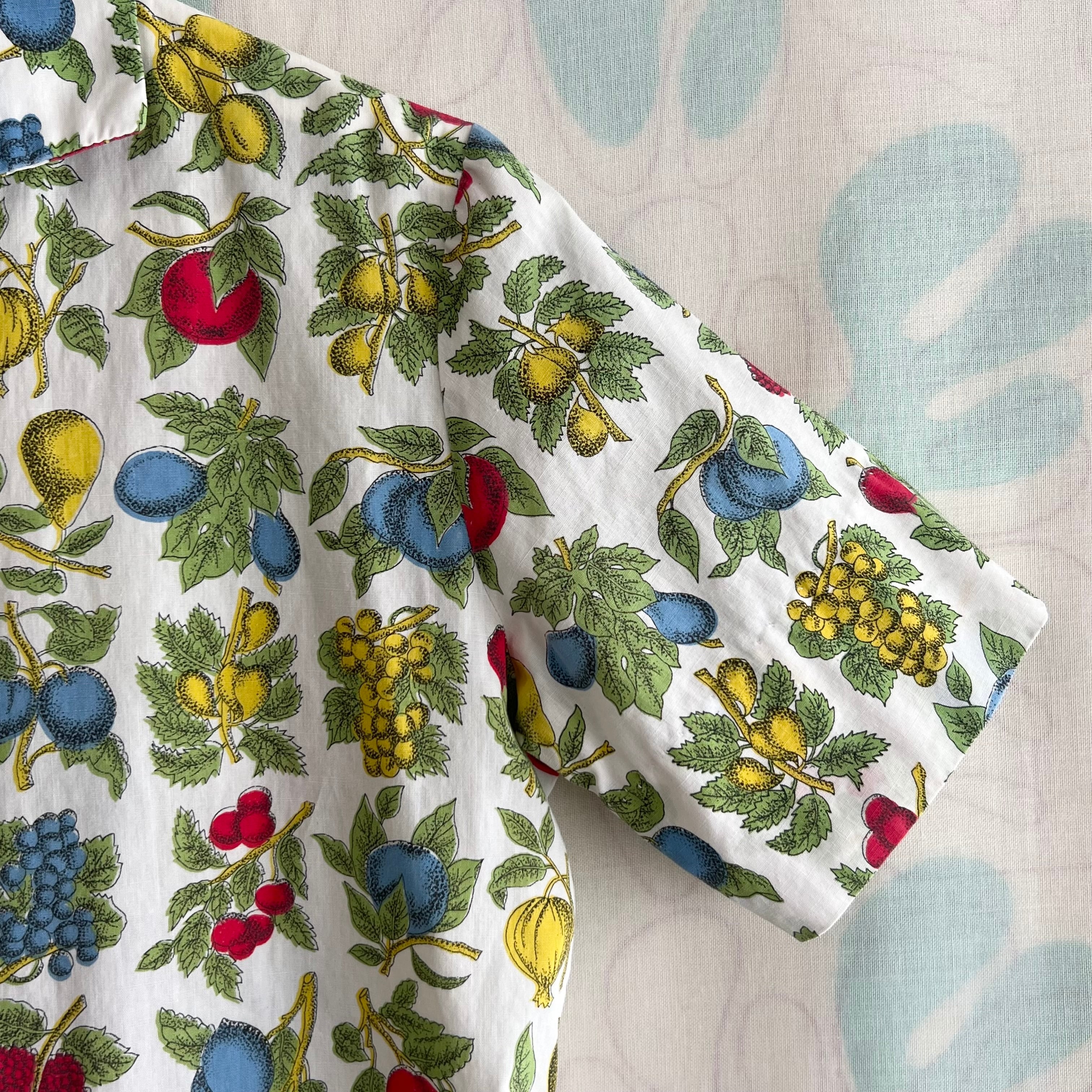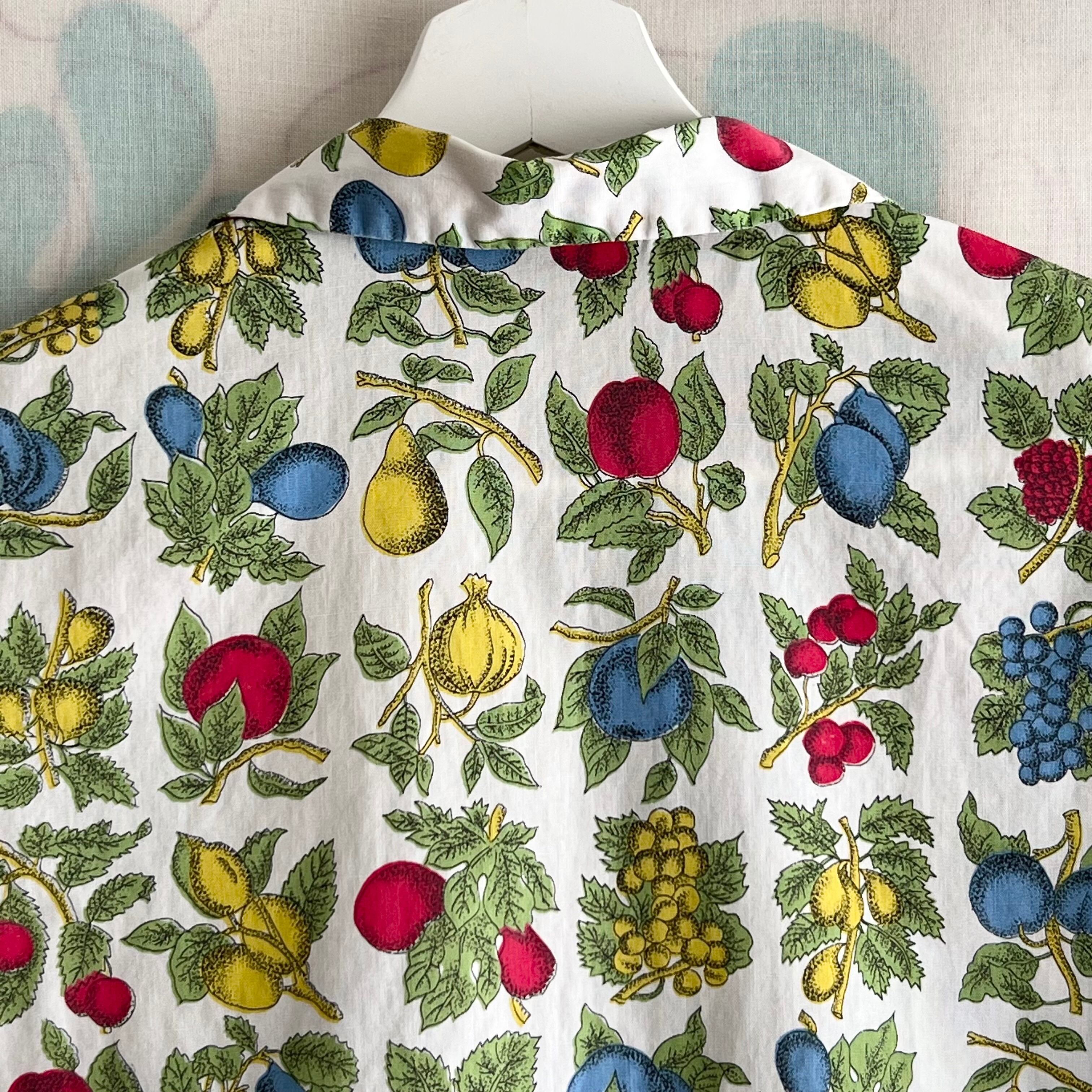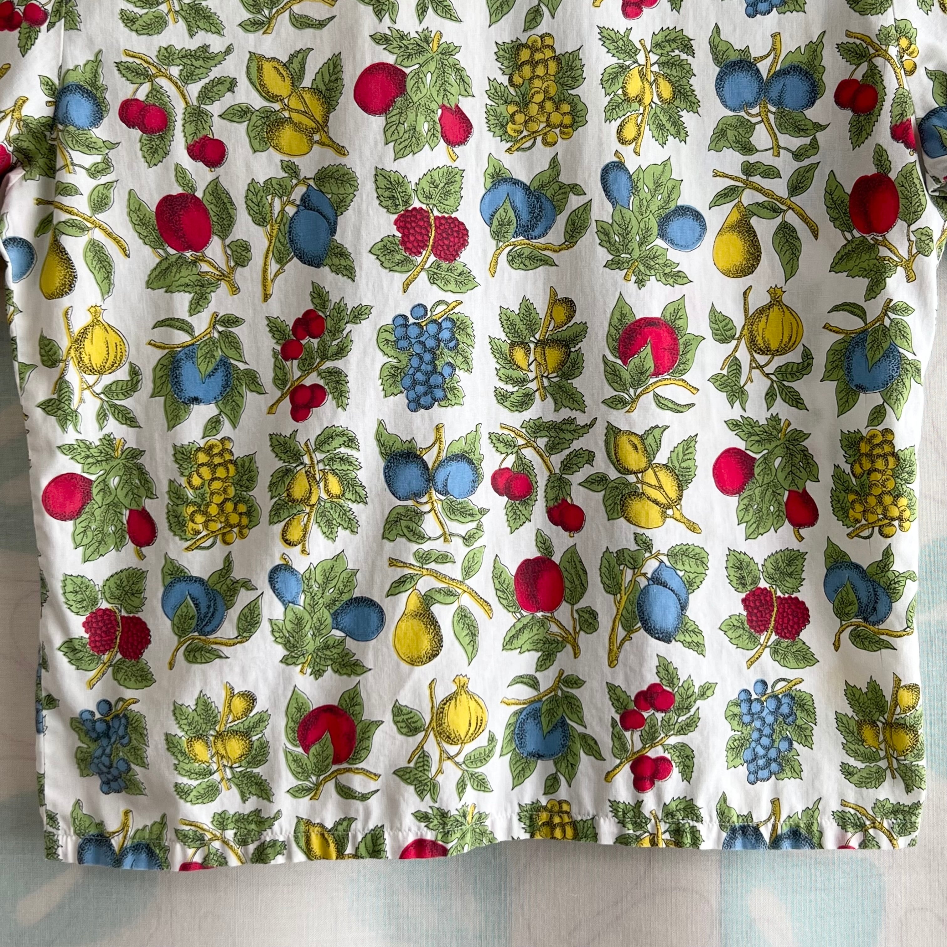 素敵なフルーツ柄が図鑑のように並ぶオープンカラーブラウスです。