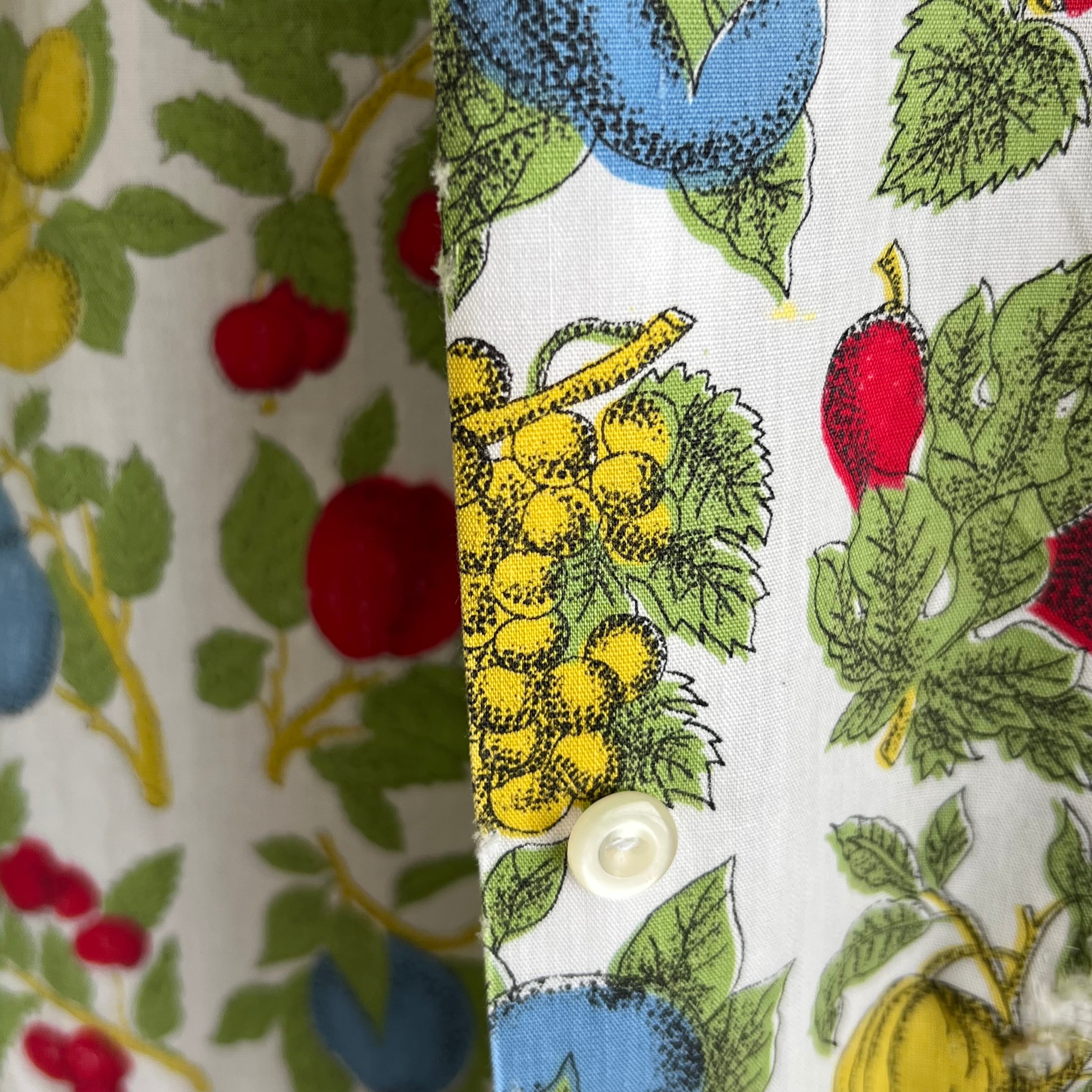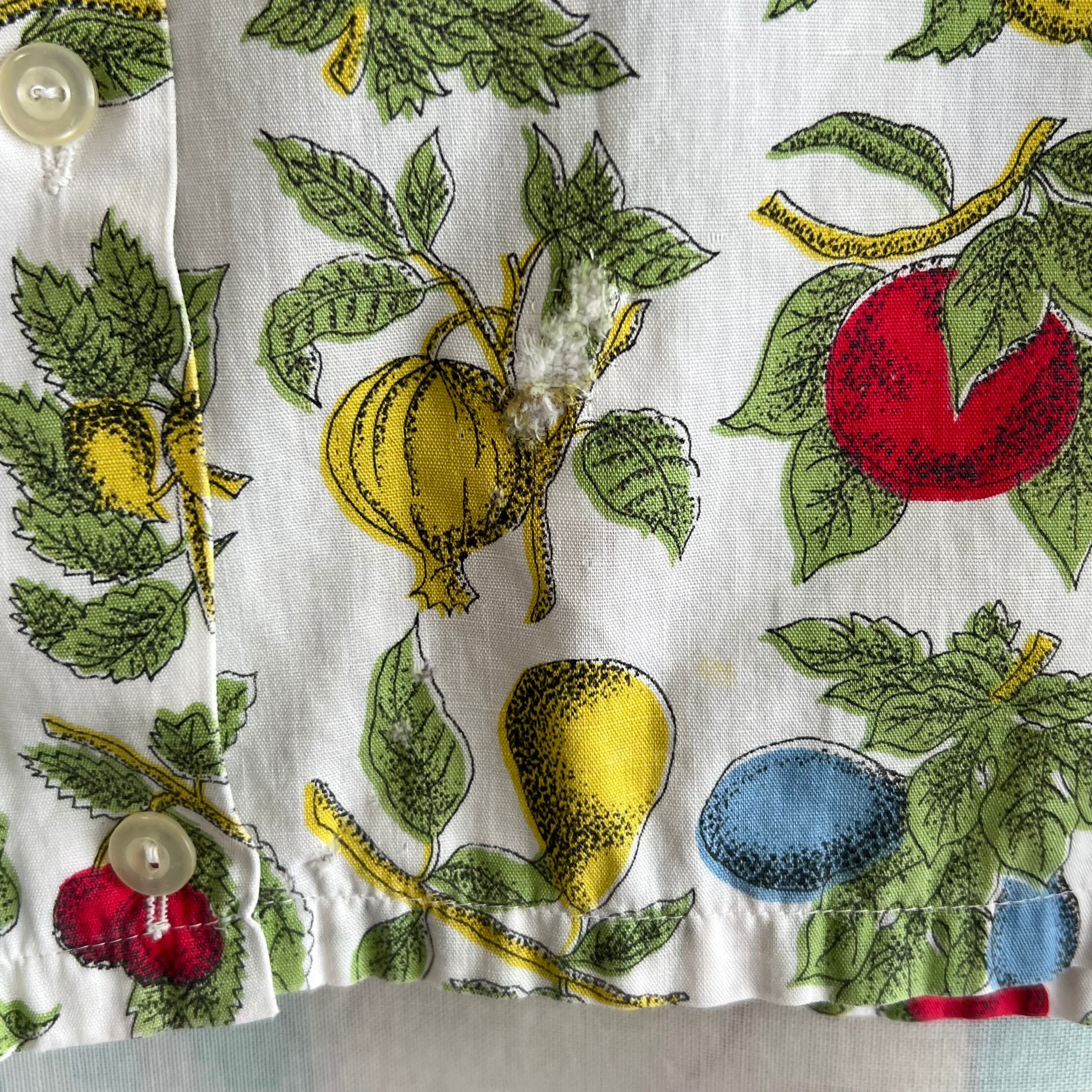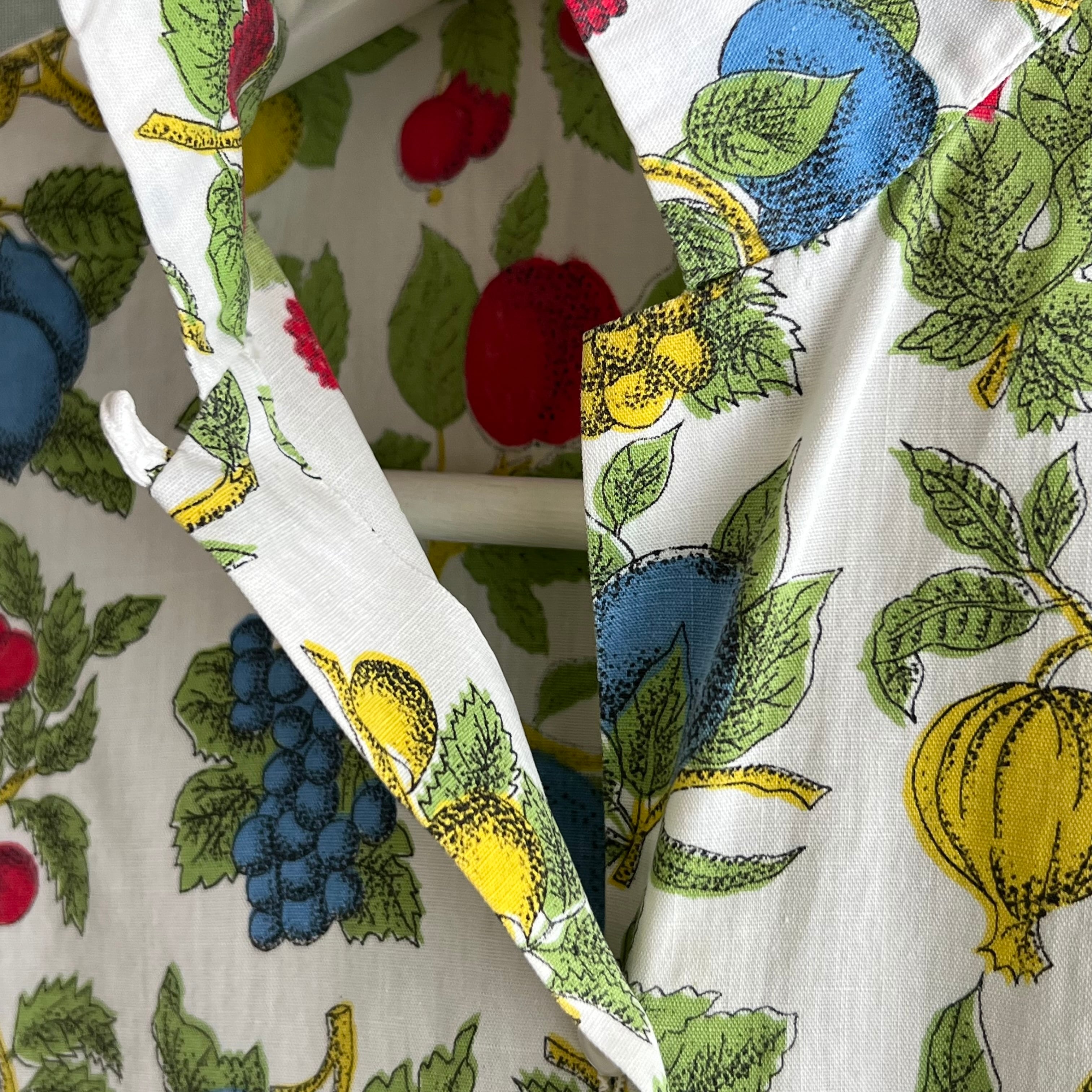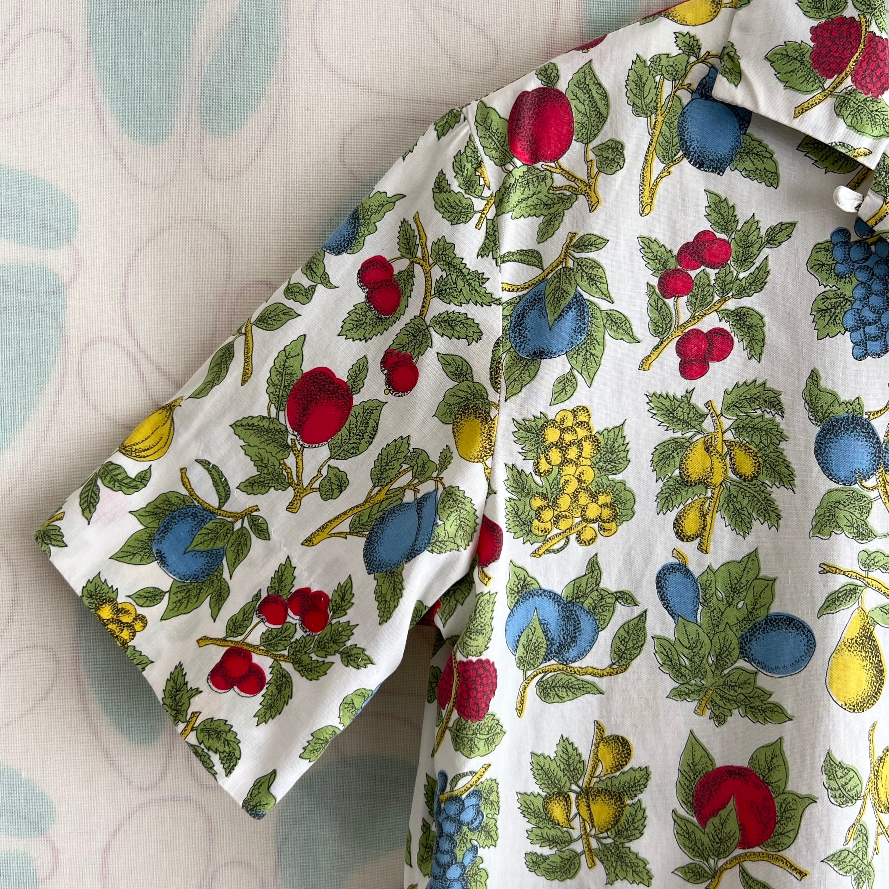 素敵なフルーツ柄が図鑑のように並ぶオープンカラーブラウスです。