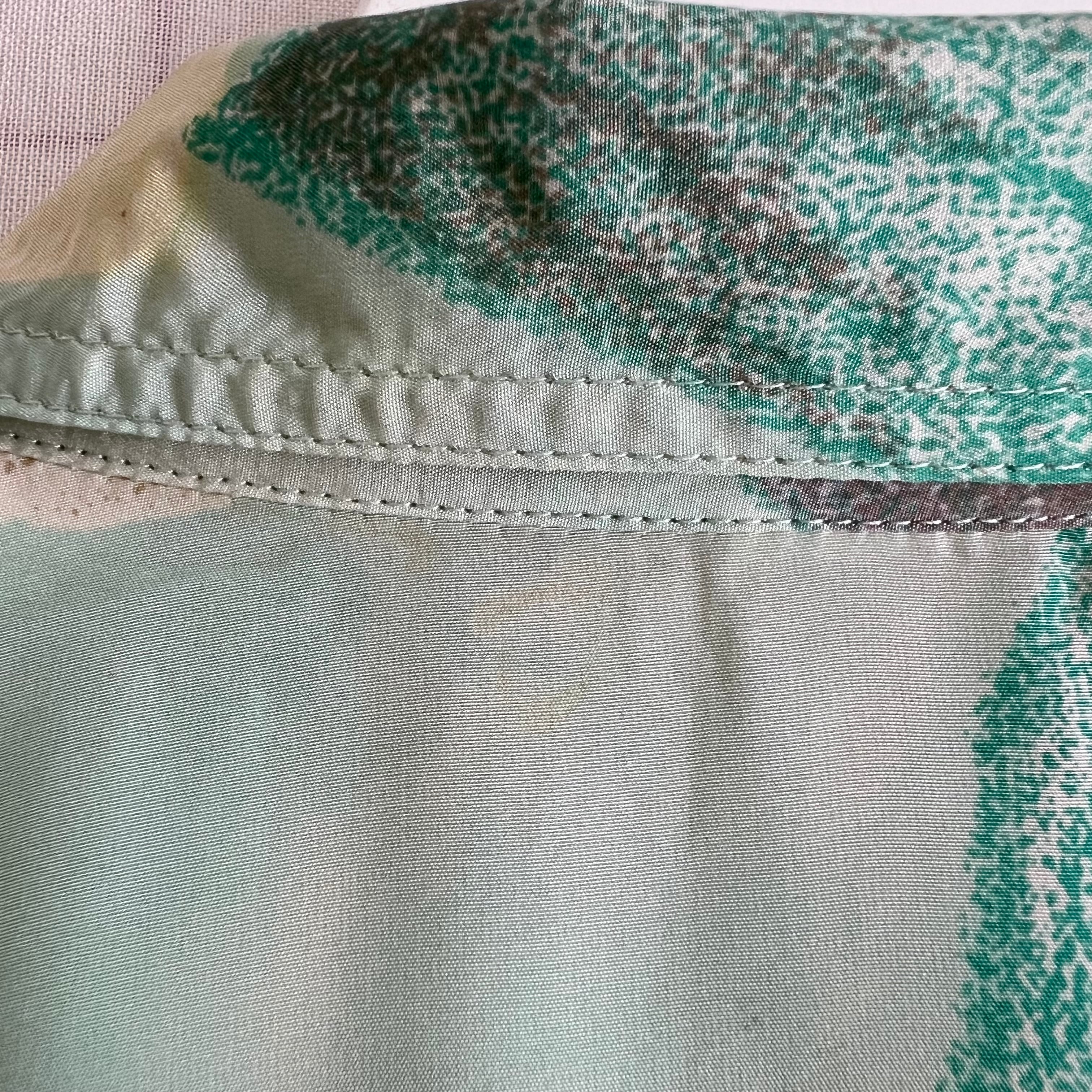 {コンディション}ミスプリントと思われる着色が散見されます。(染みや汚れ?にしてはプリントと同色)第二ボタンを留めた左見頃に小ホール、後ろ襟に和染みがあります。