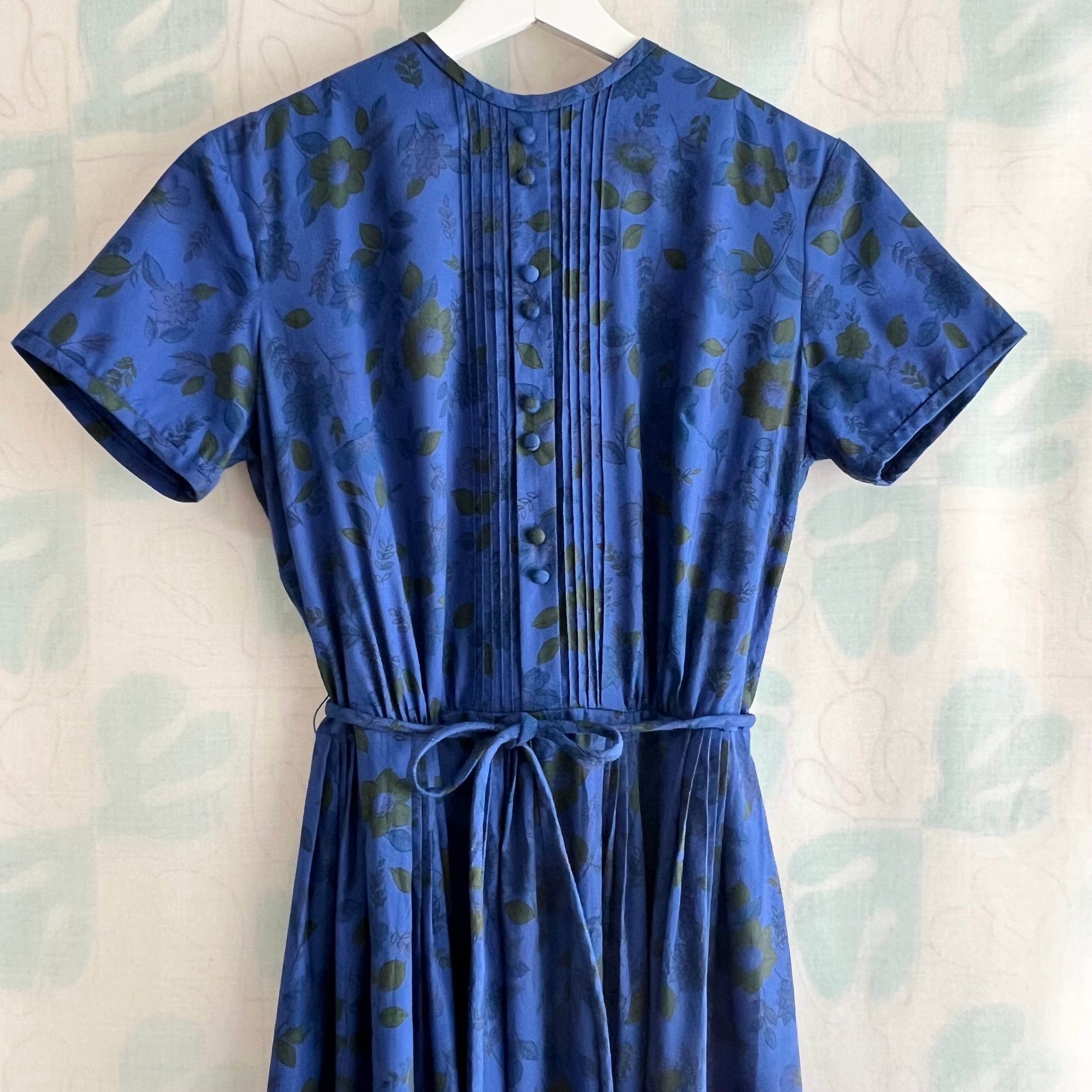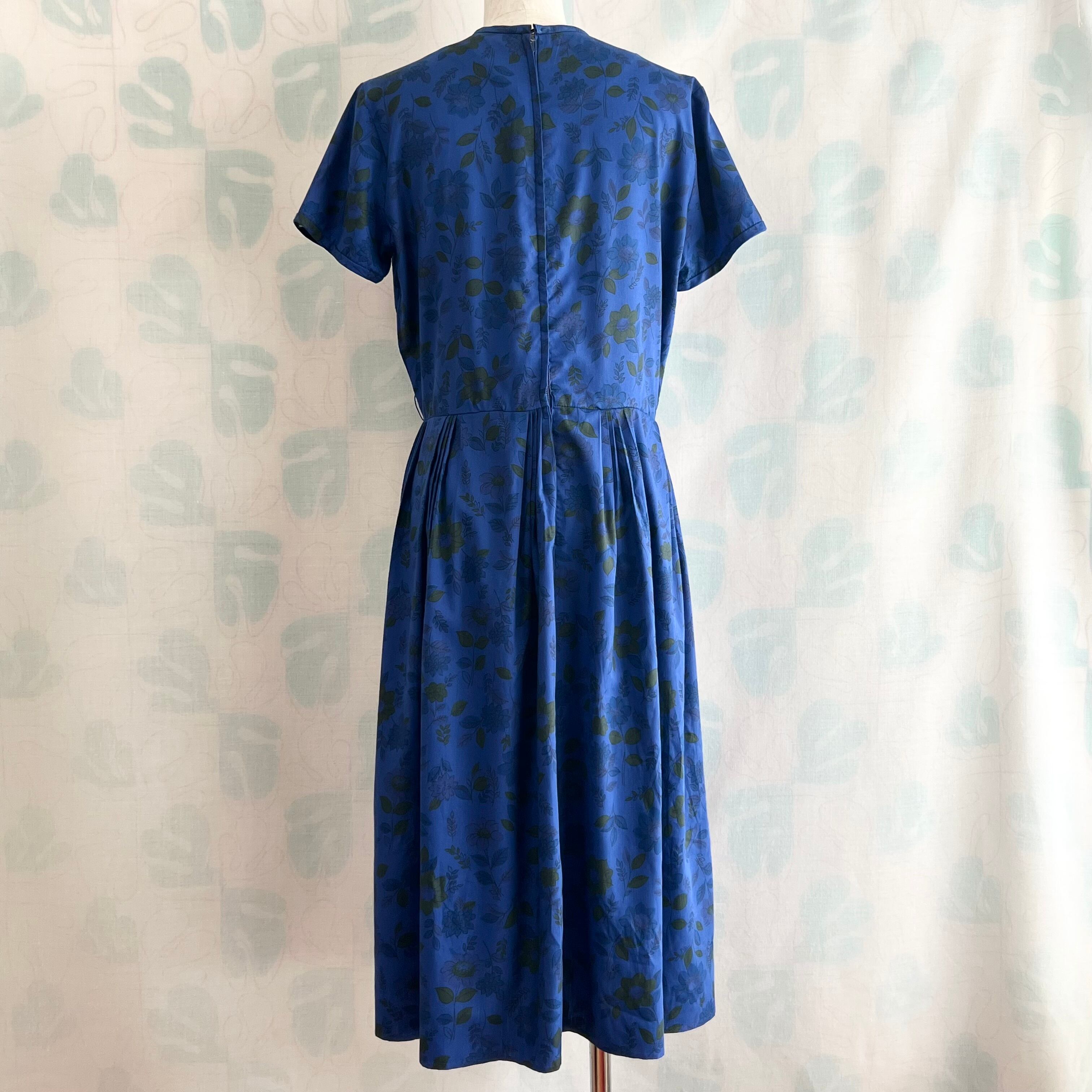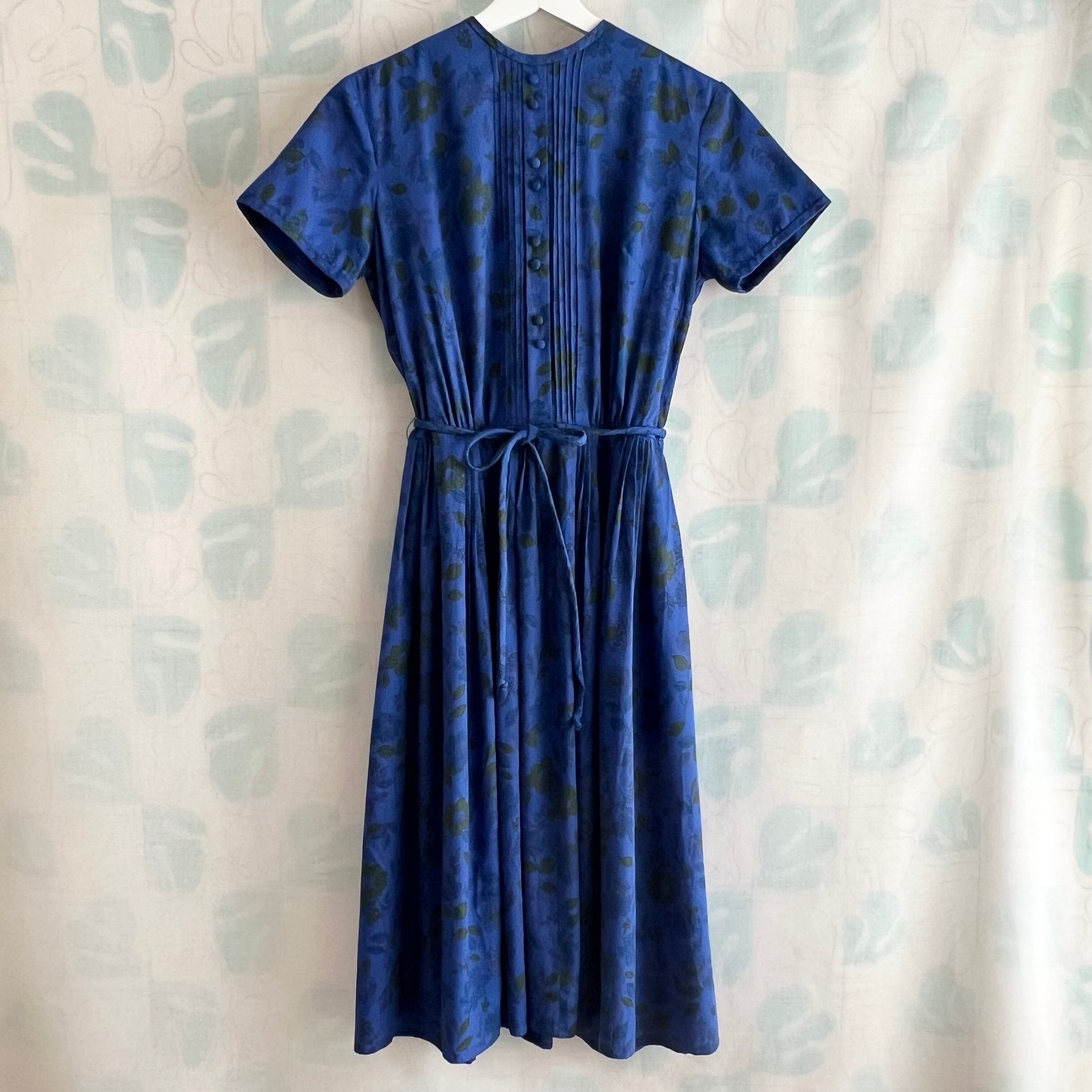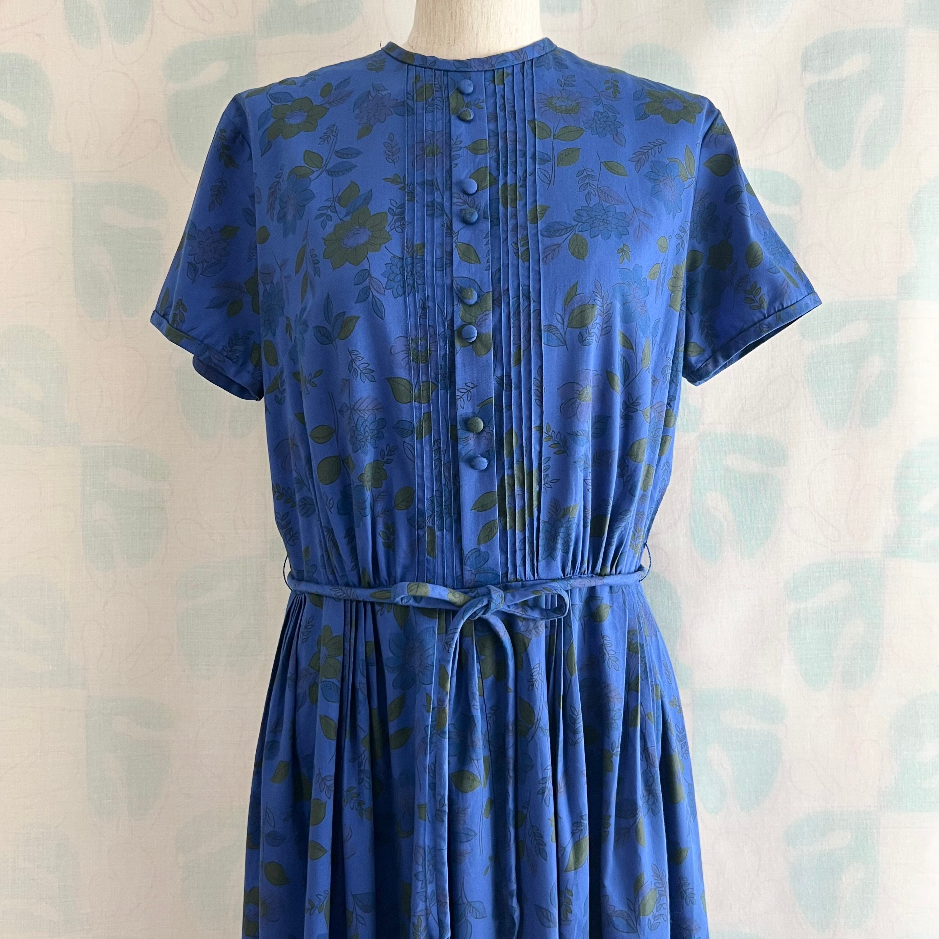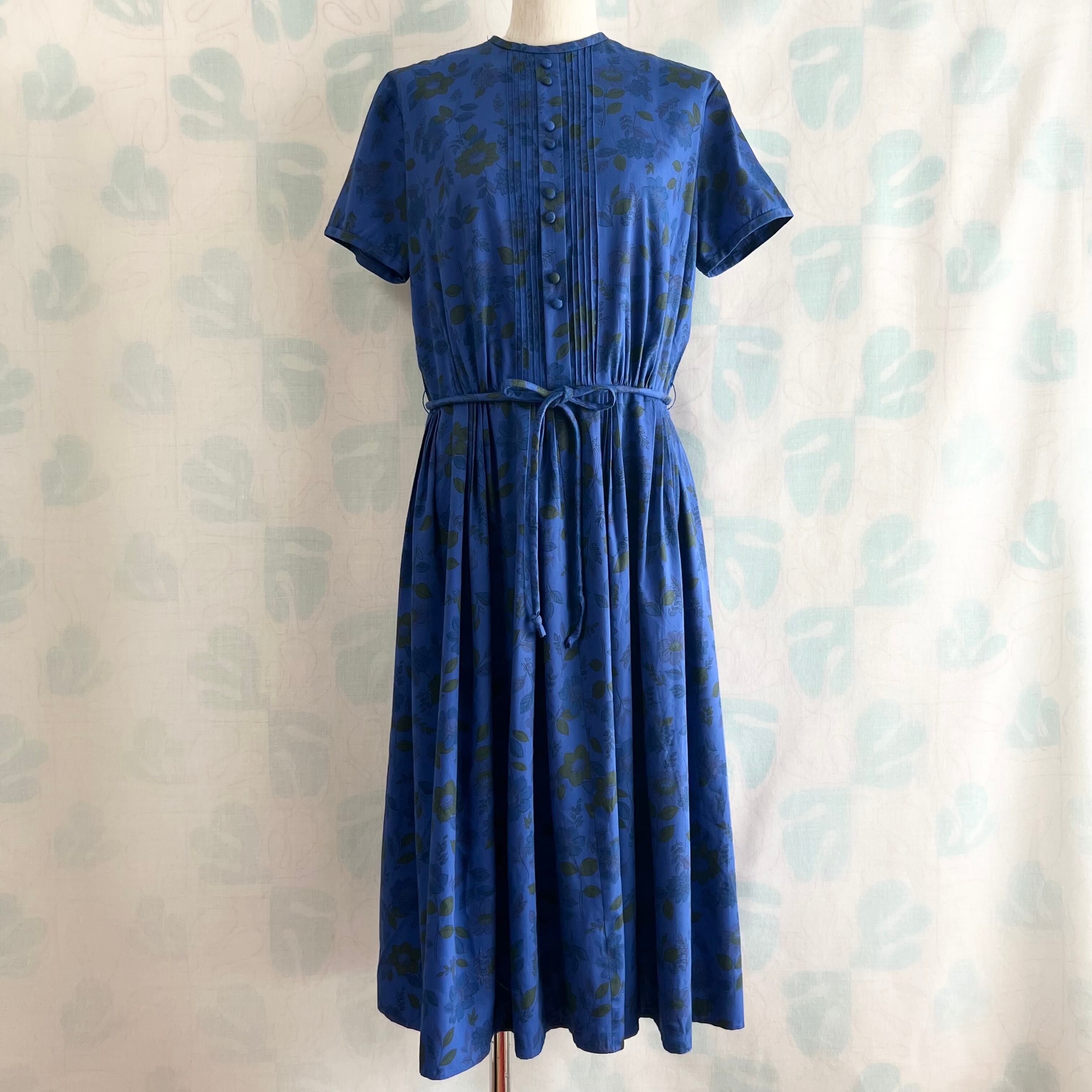 60's ダークブルー ボタニカルプリントワンピース。ベルト付き。