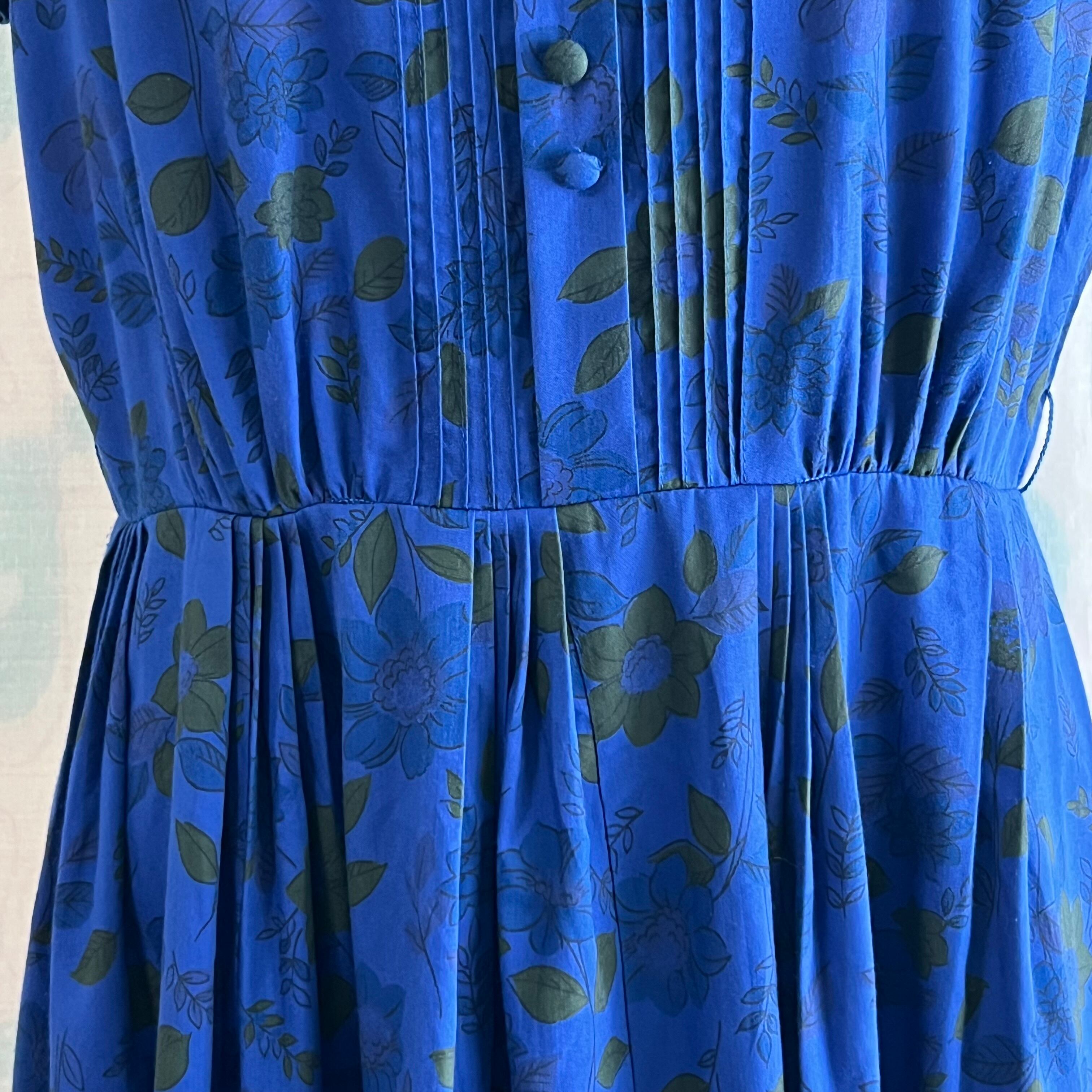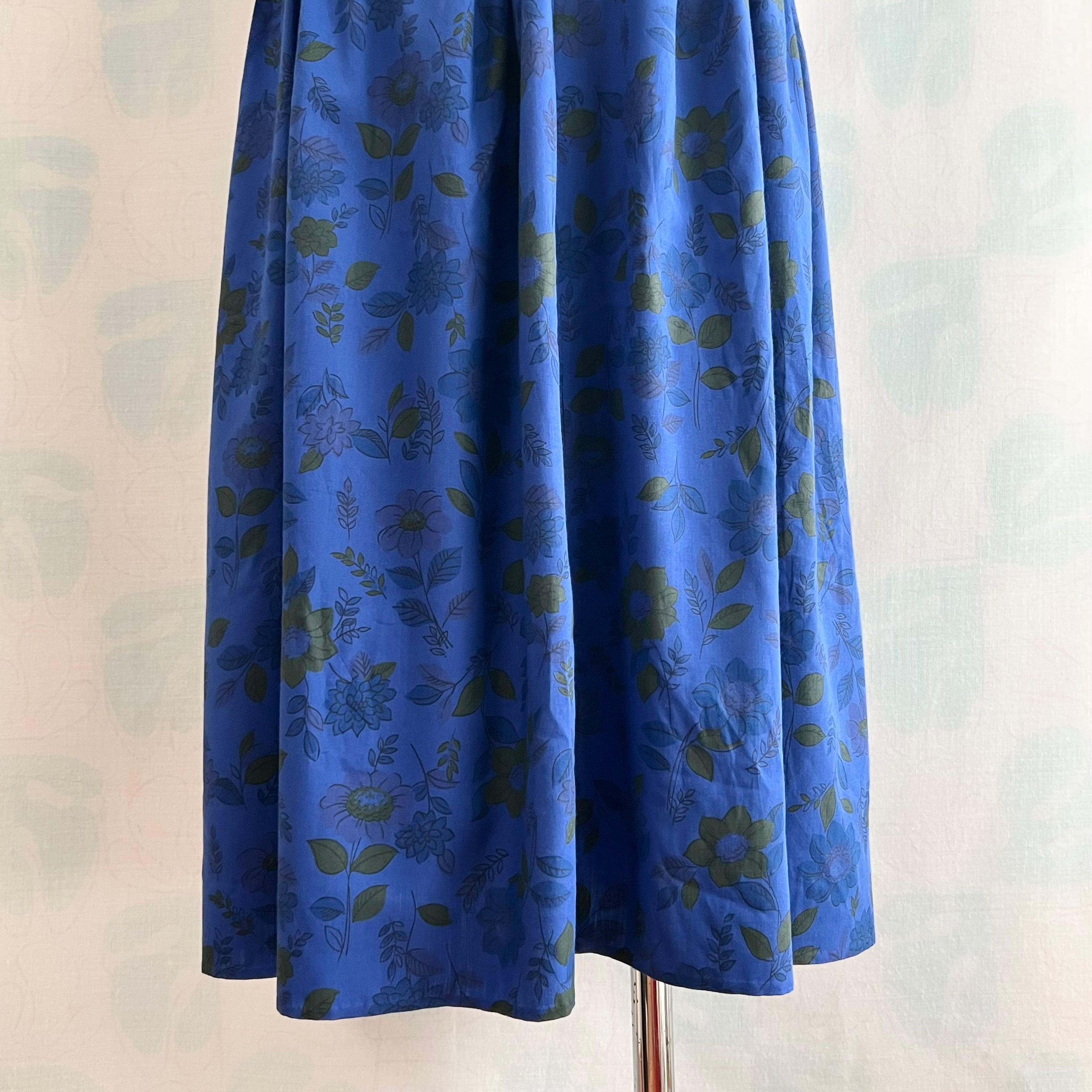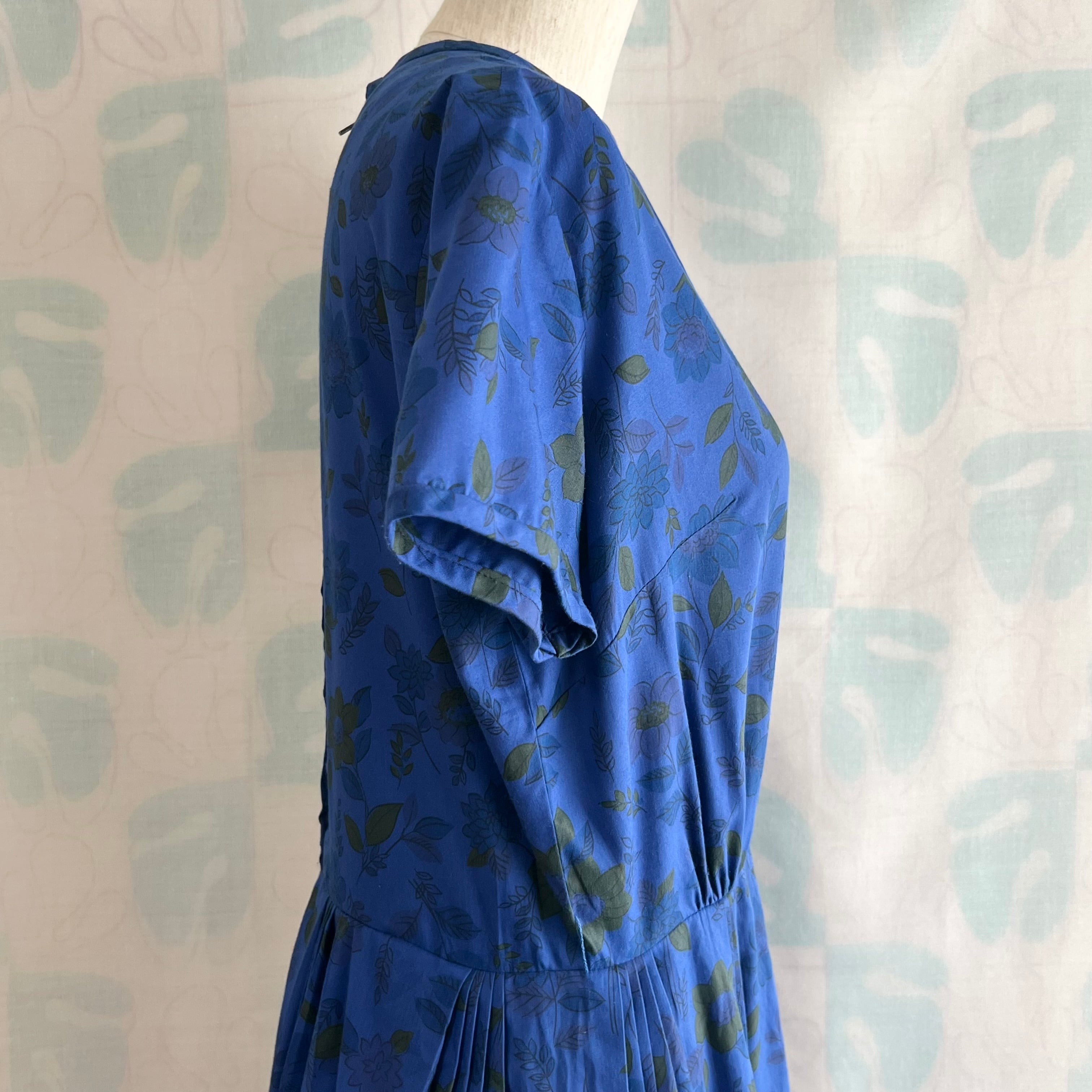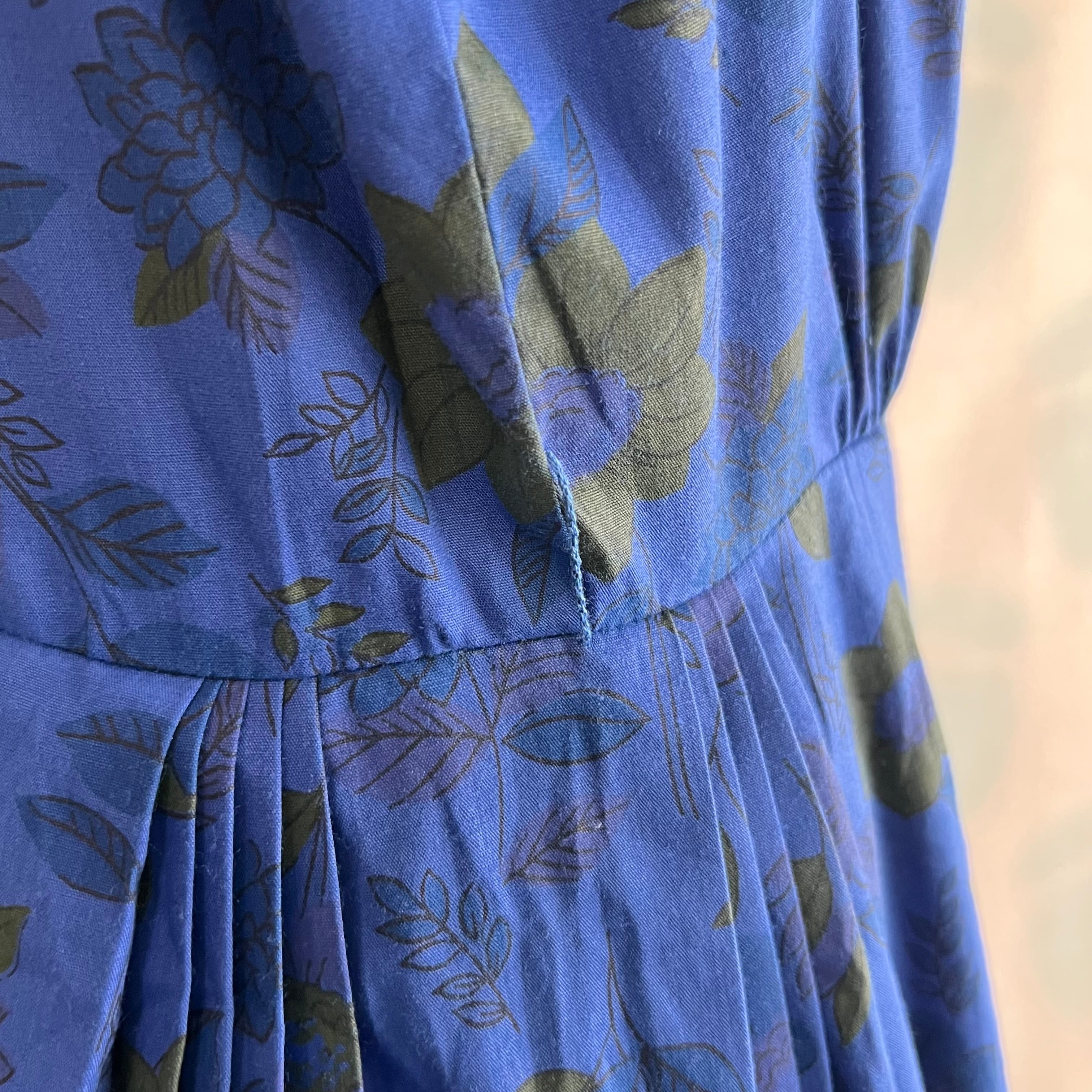 60's ダークブルー ボタニカルプリントワンピース。ベルト付き。