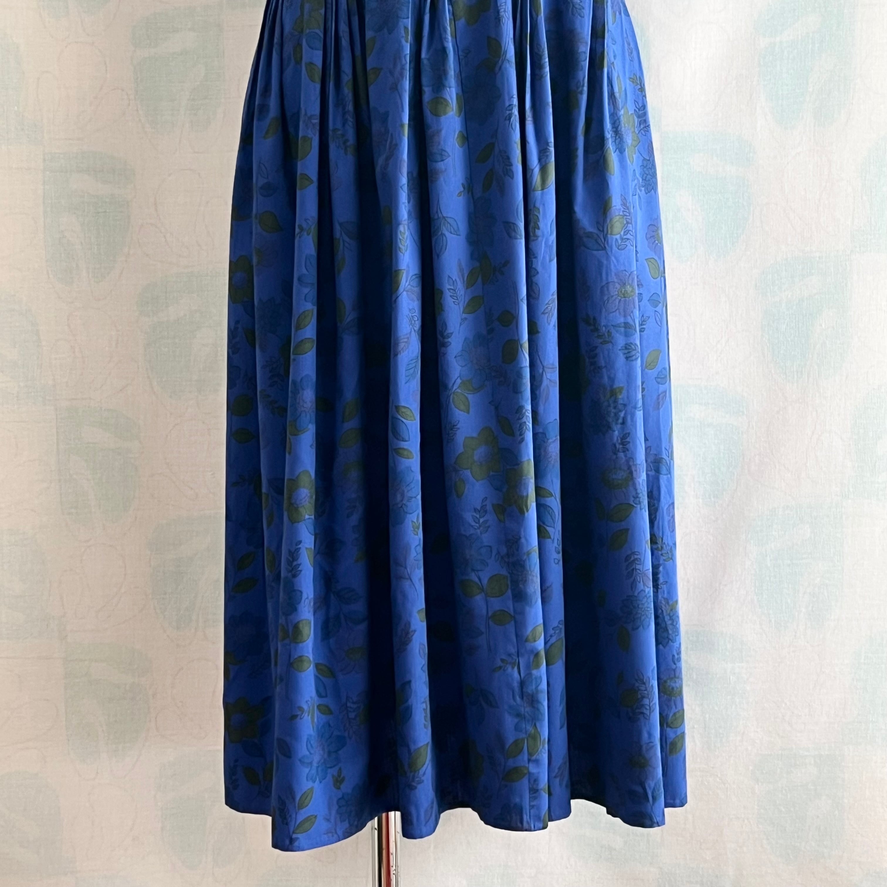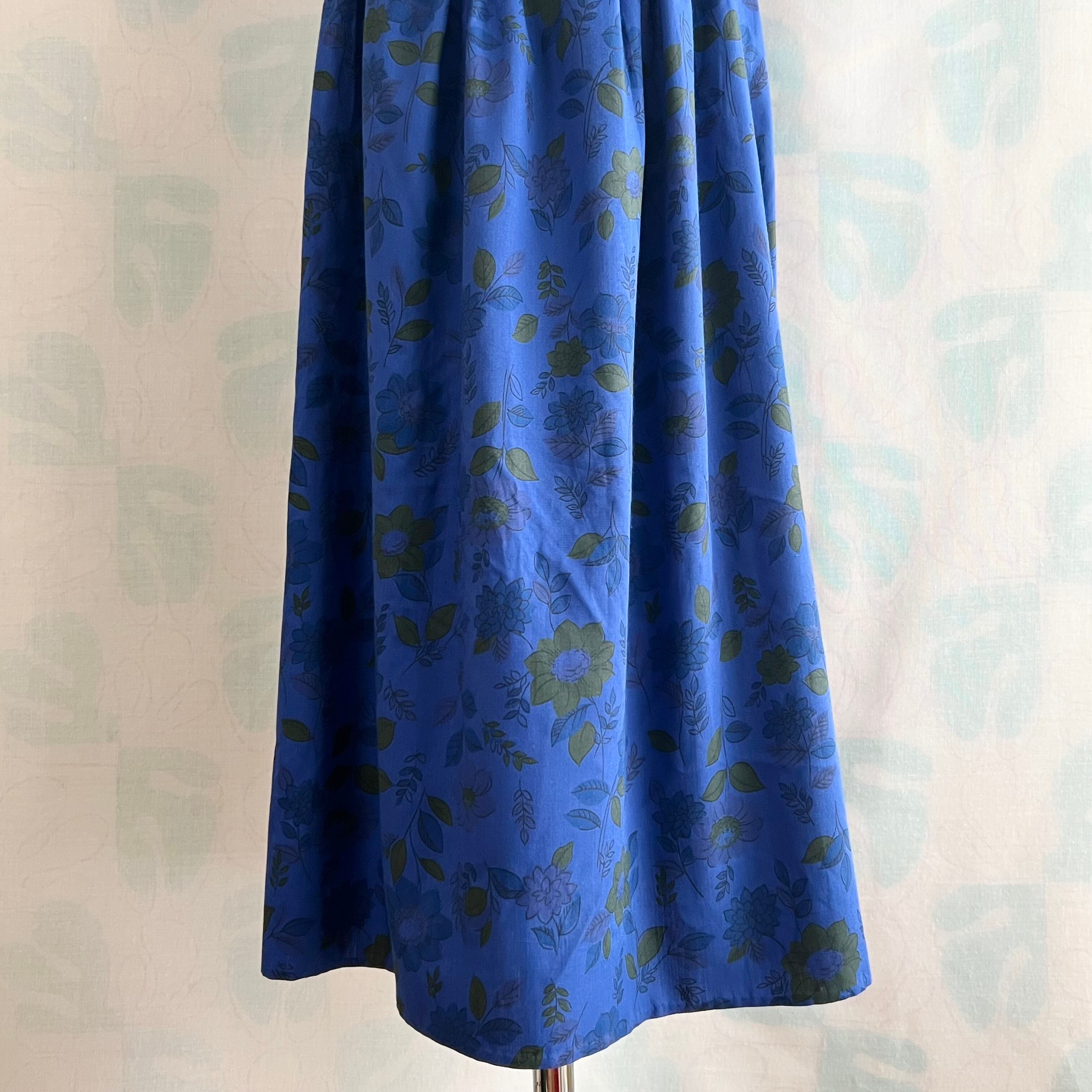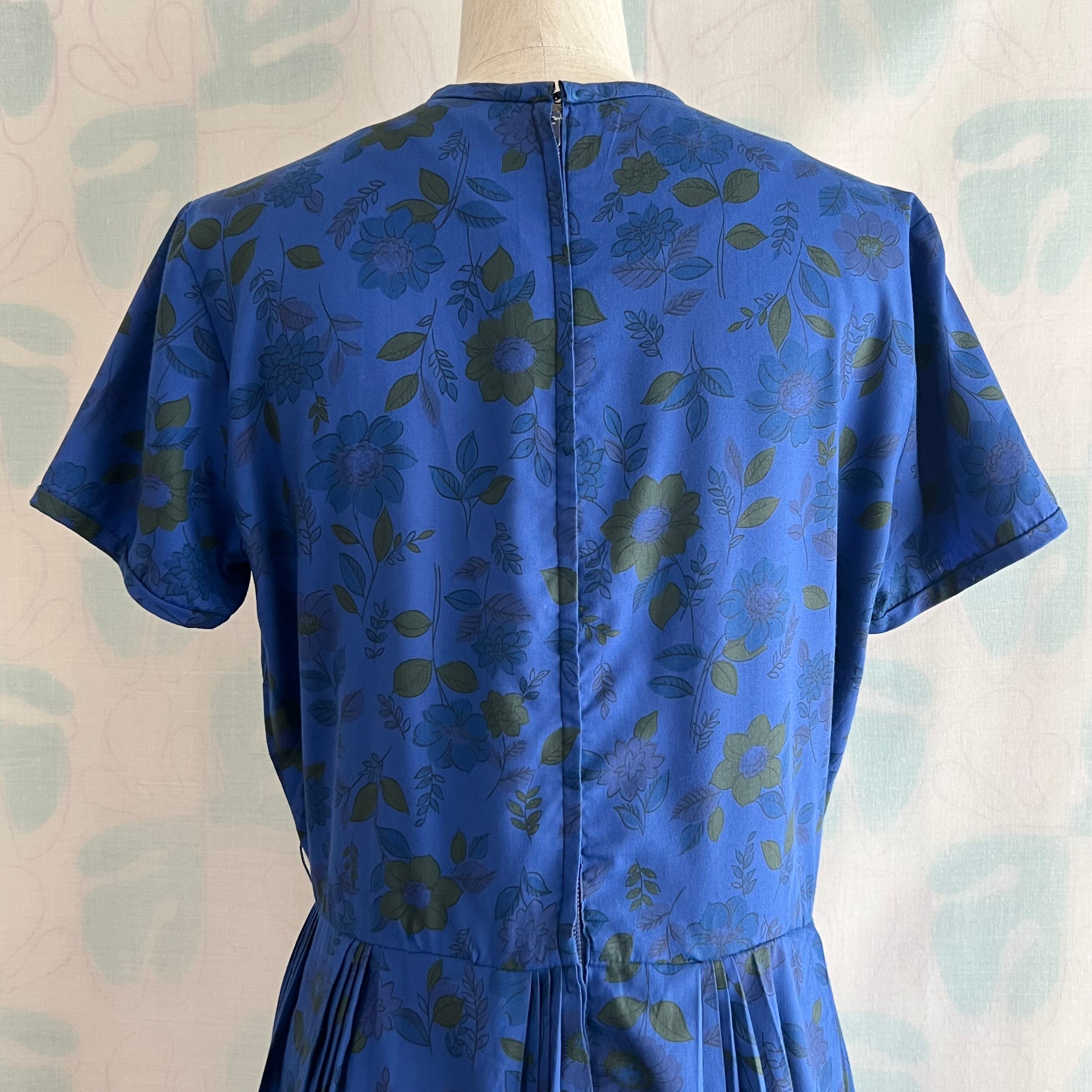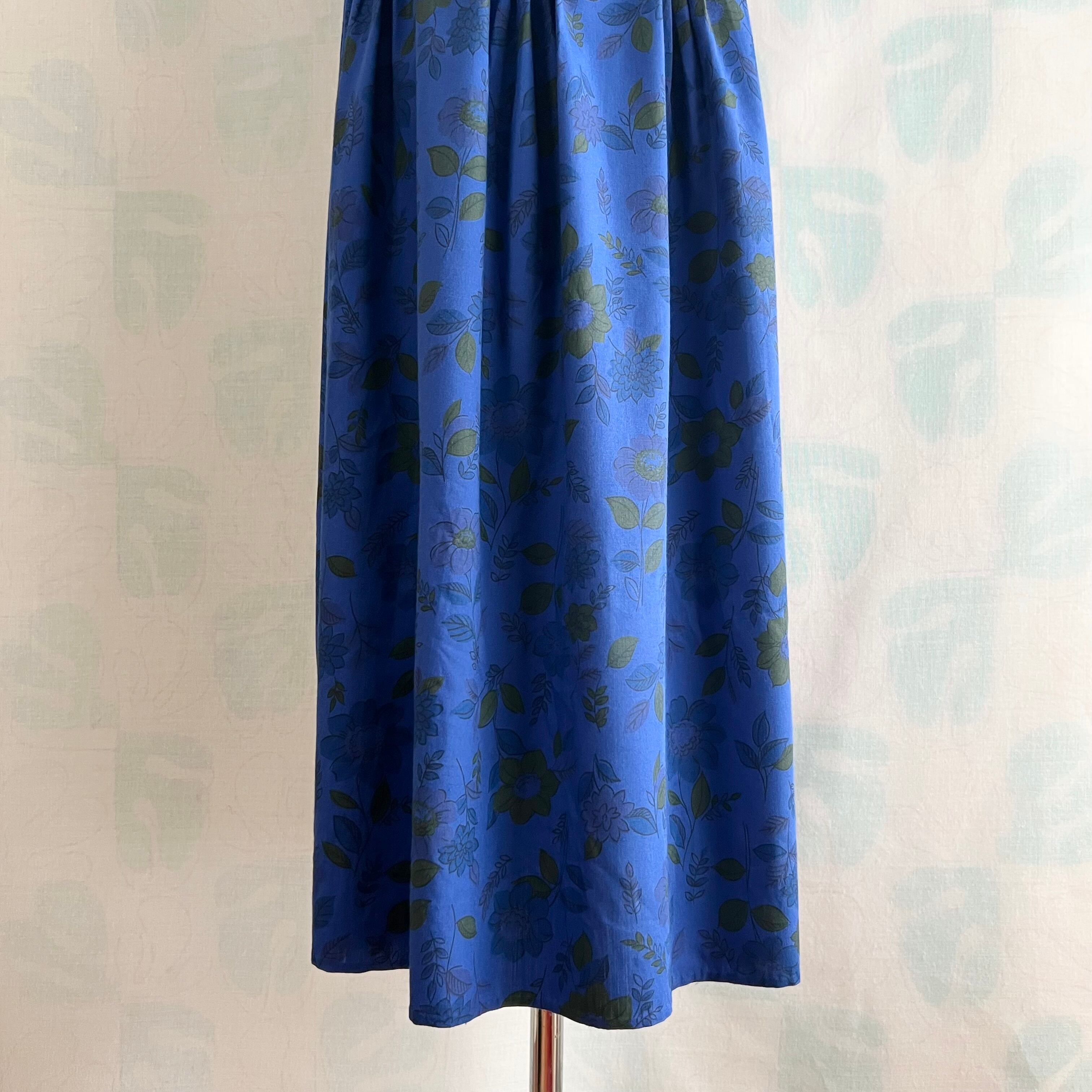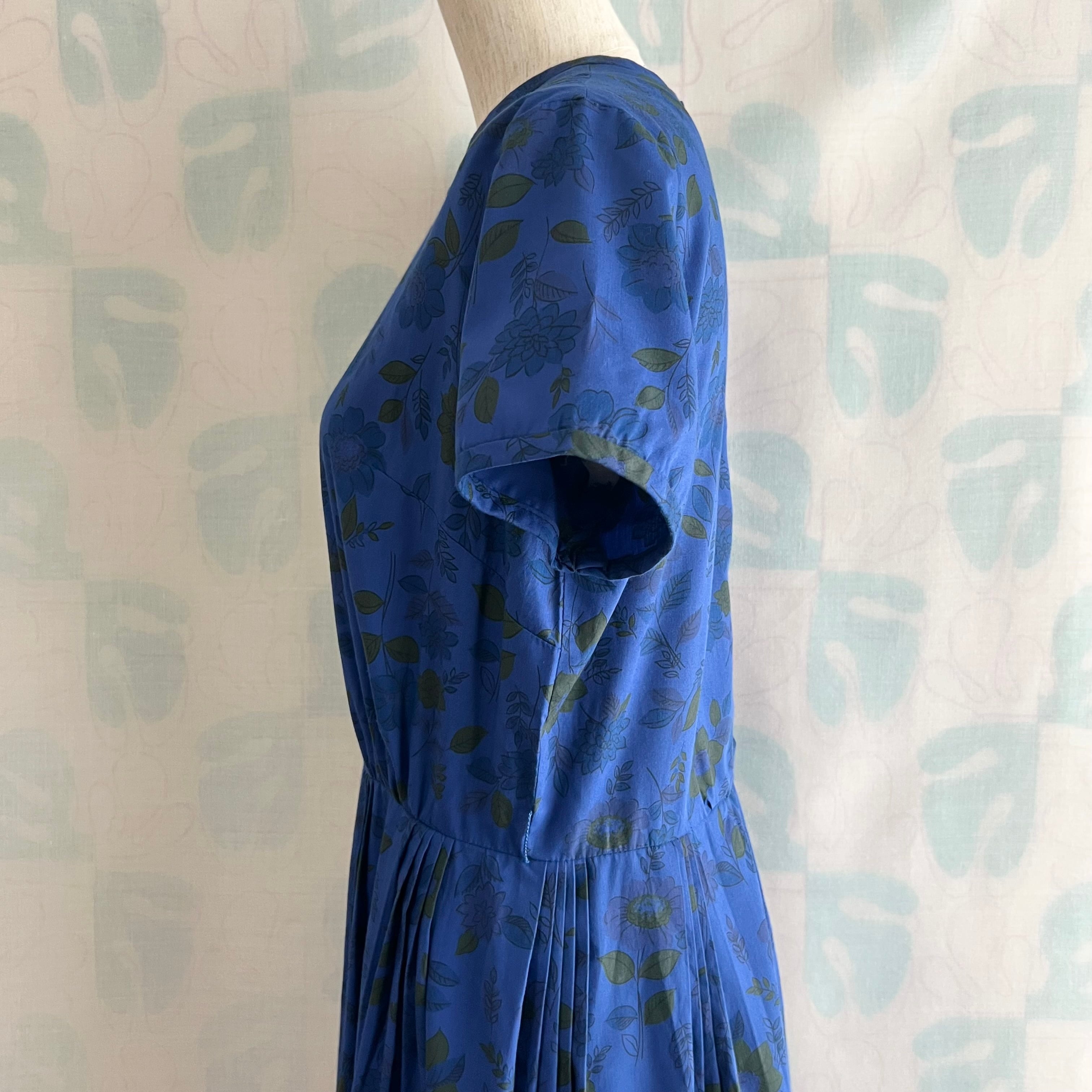 60's ダークブルー ボタニカルプリントワンピース。ベルト付き。