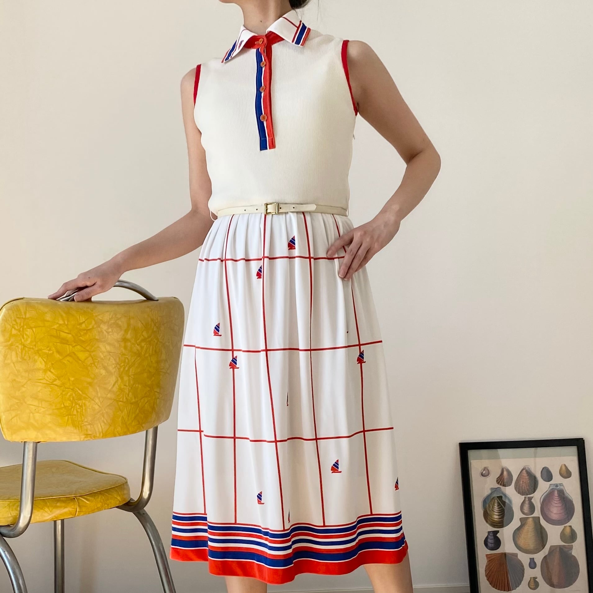80's tricolore marine print dress with belt