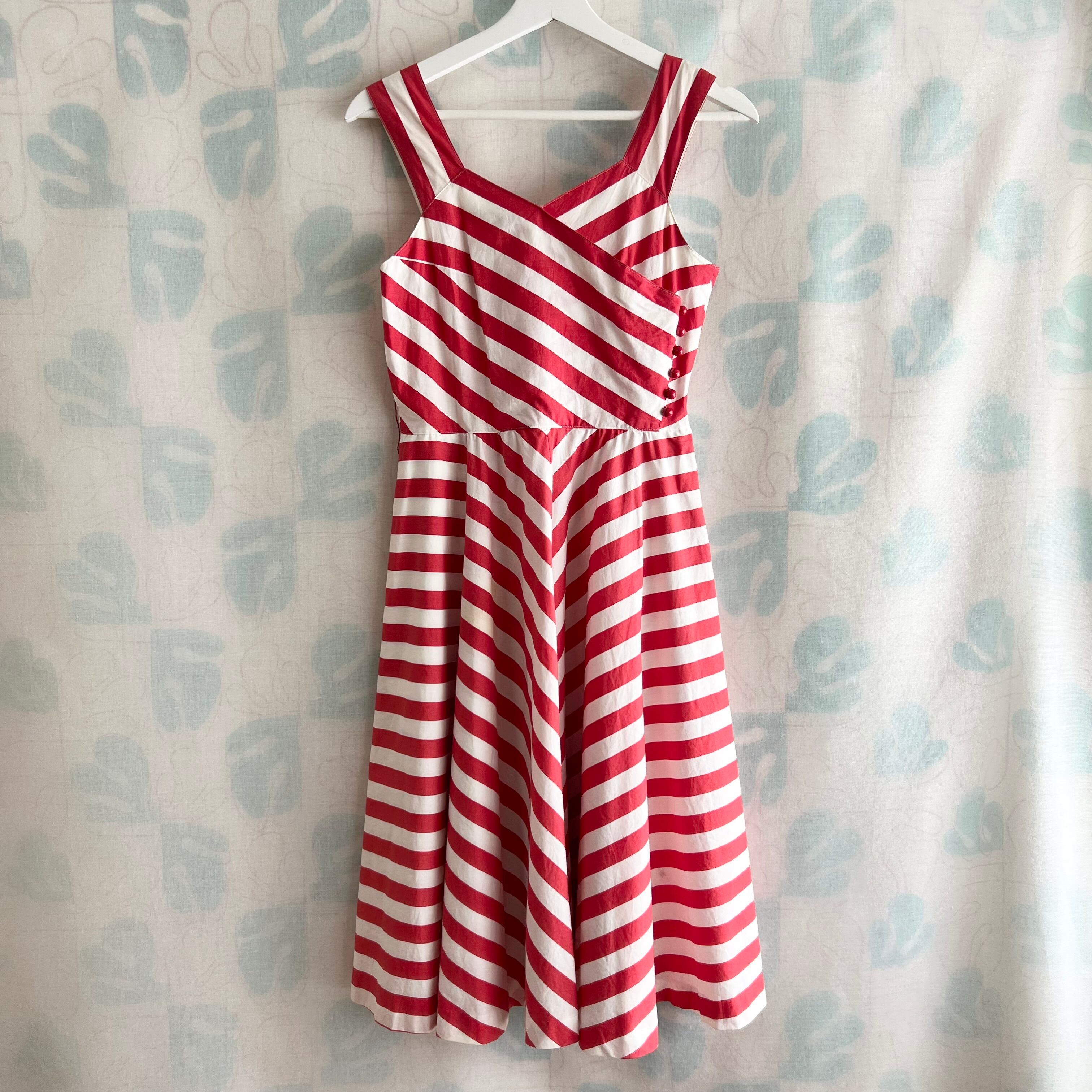 丸い飾りボタンが左脇に連なり、カシュクール風のデザイン。