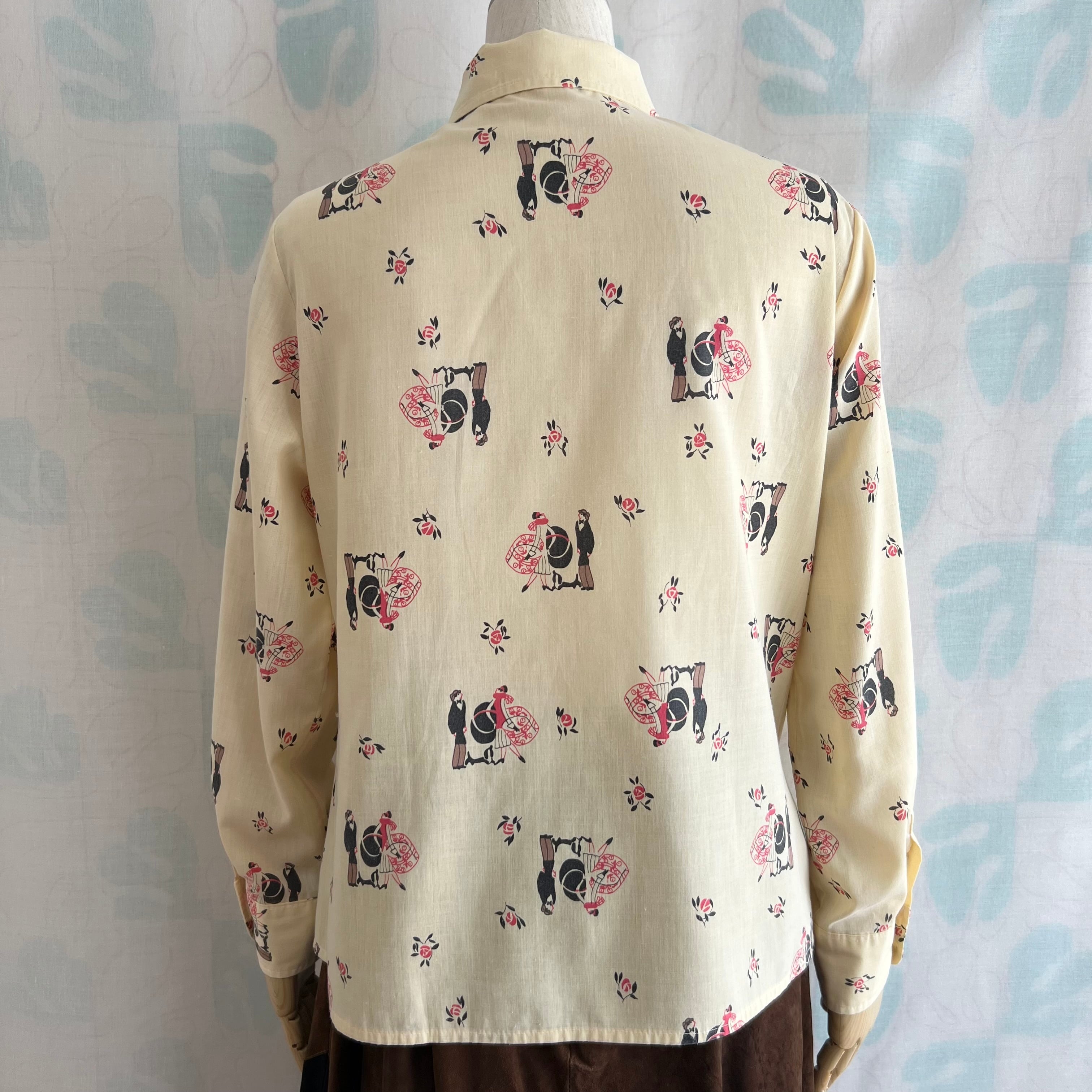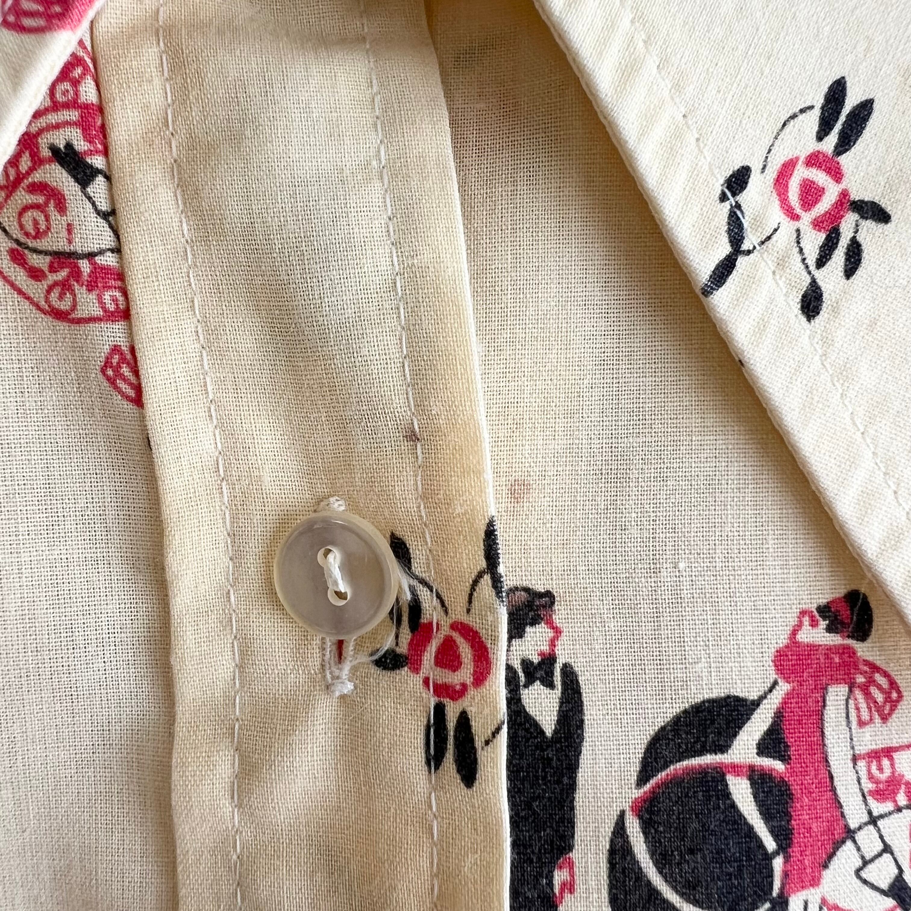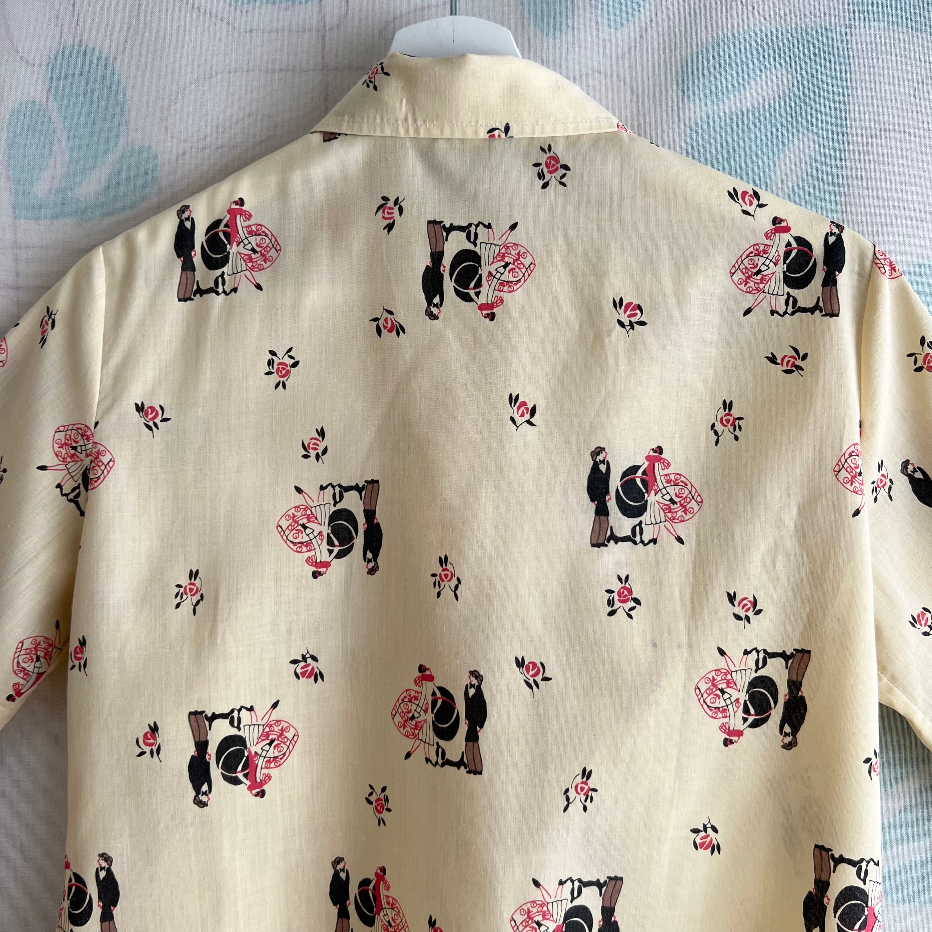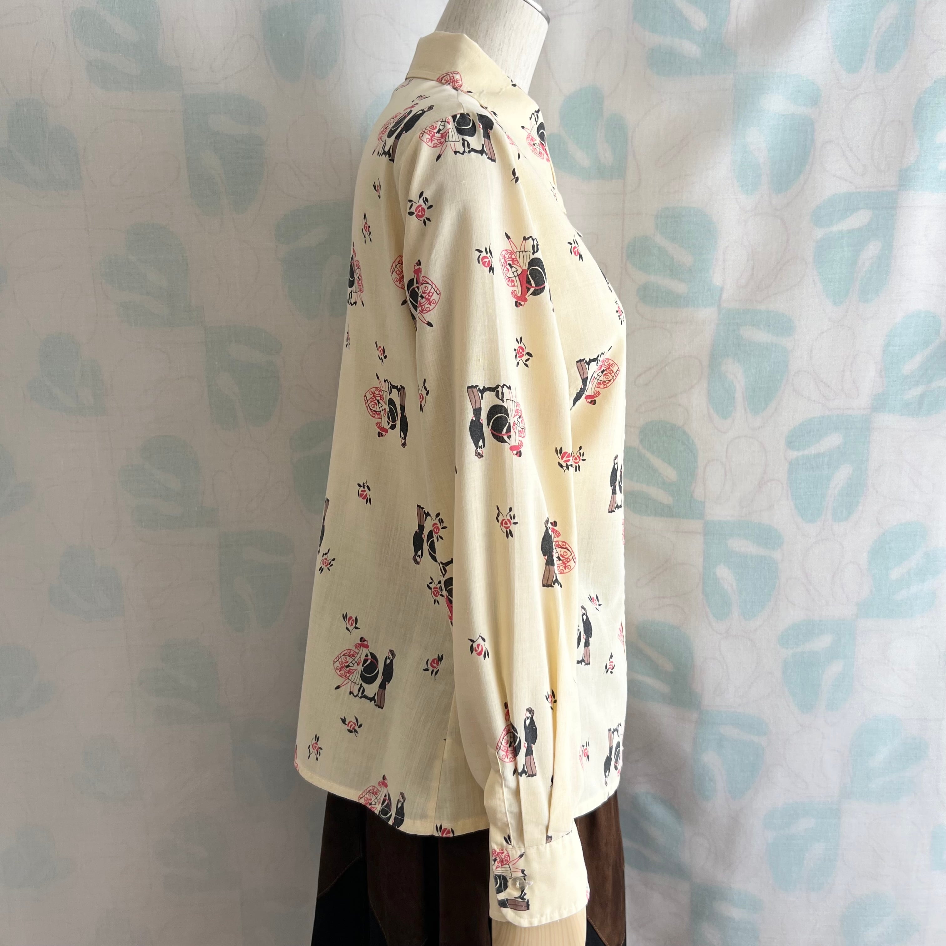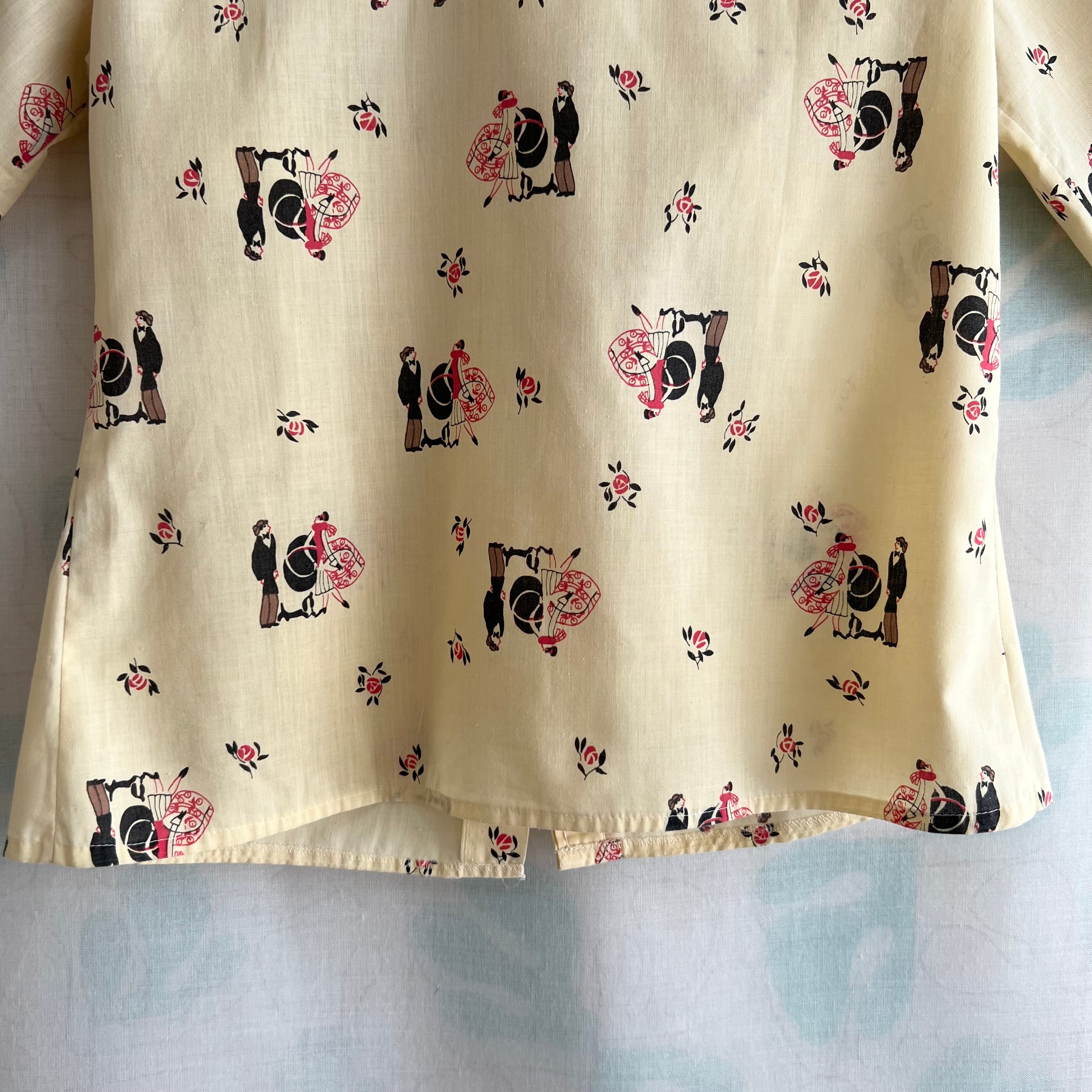 70's 「20年代ギャッツビーな装いの淑女と紳士」プリントの長袖ブラウス。