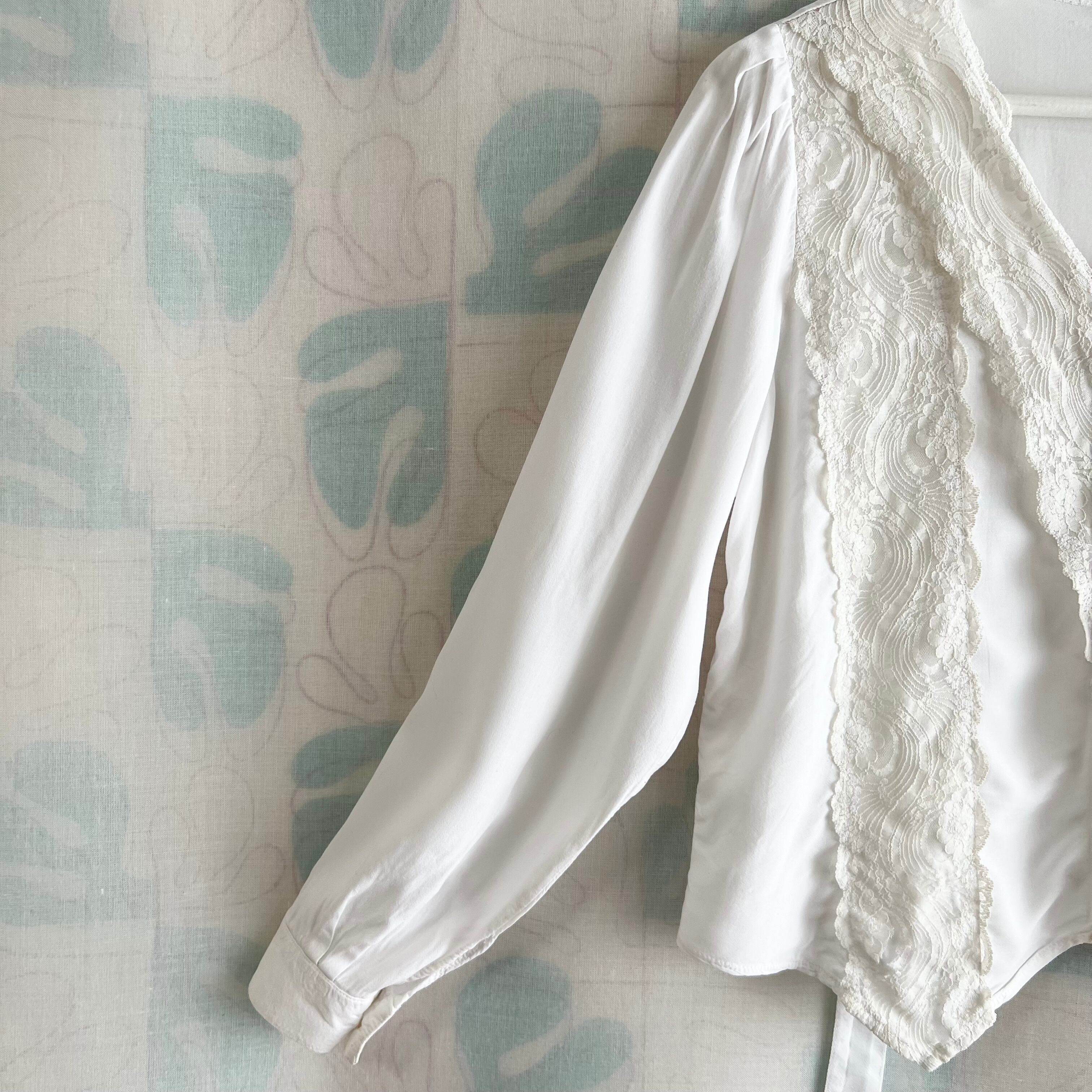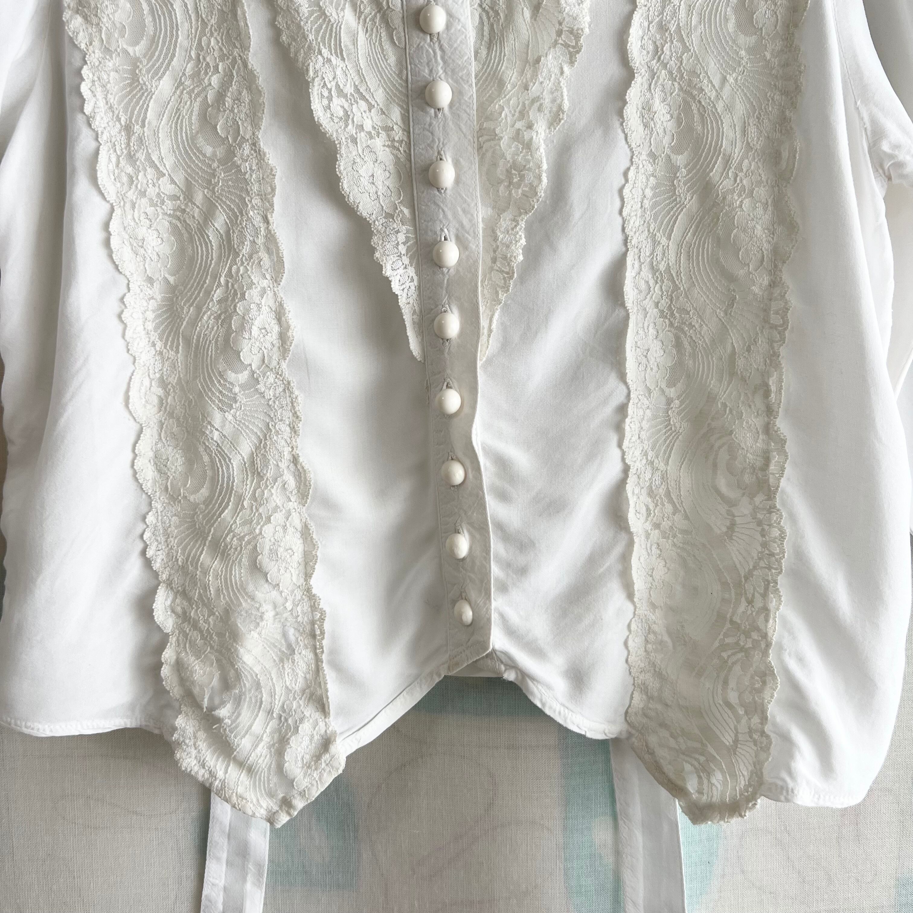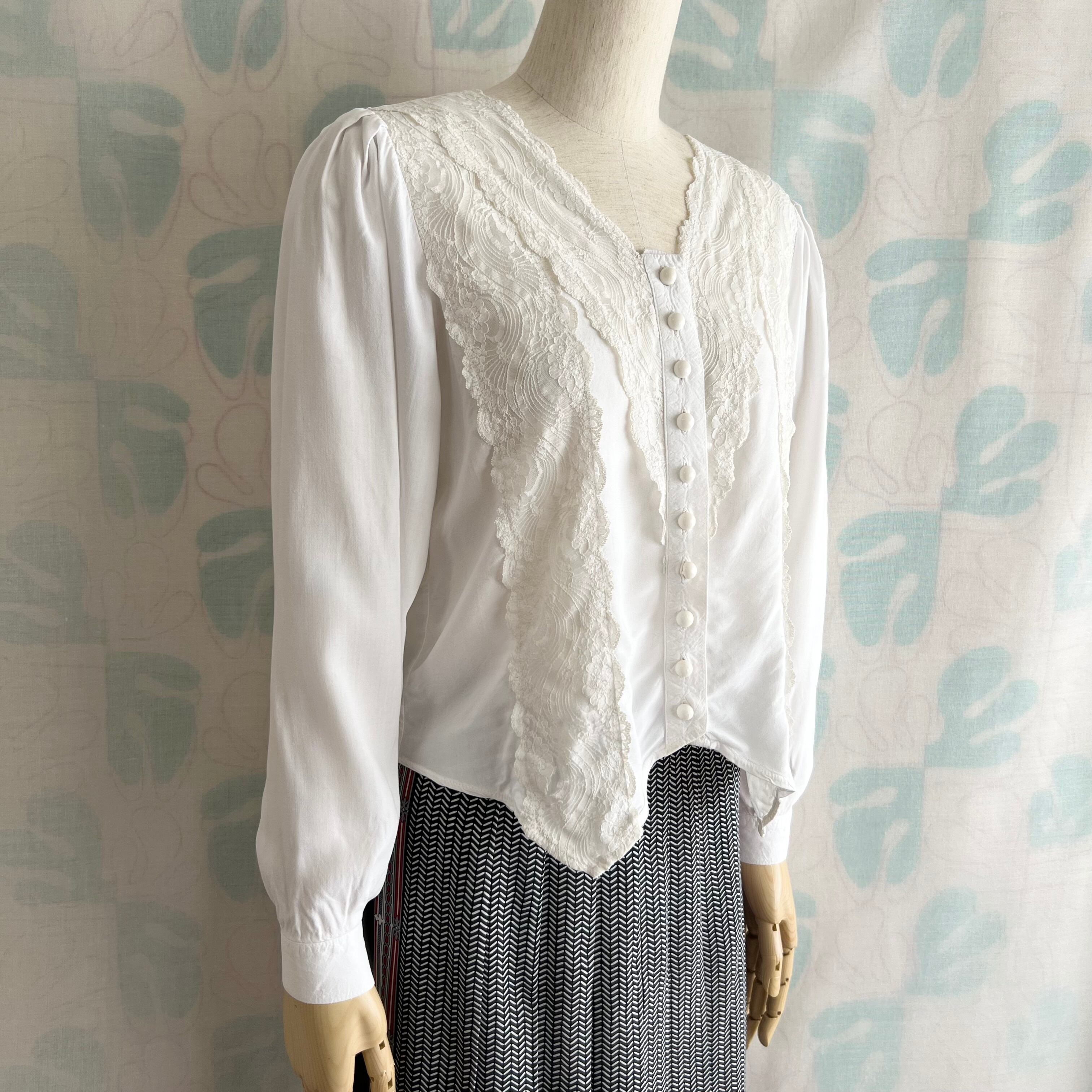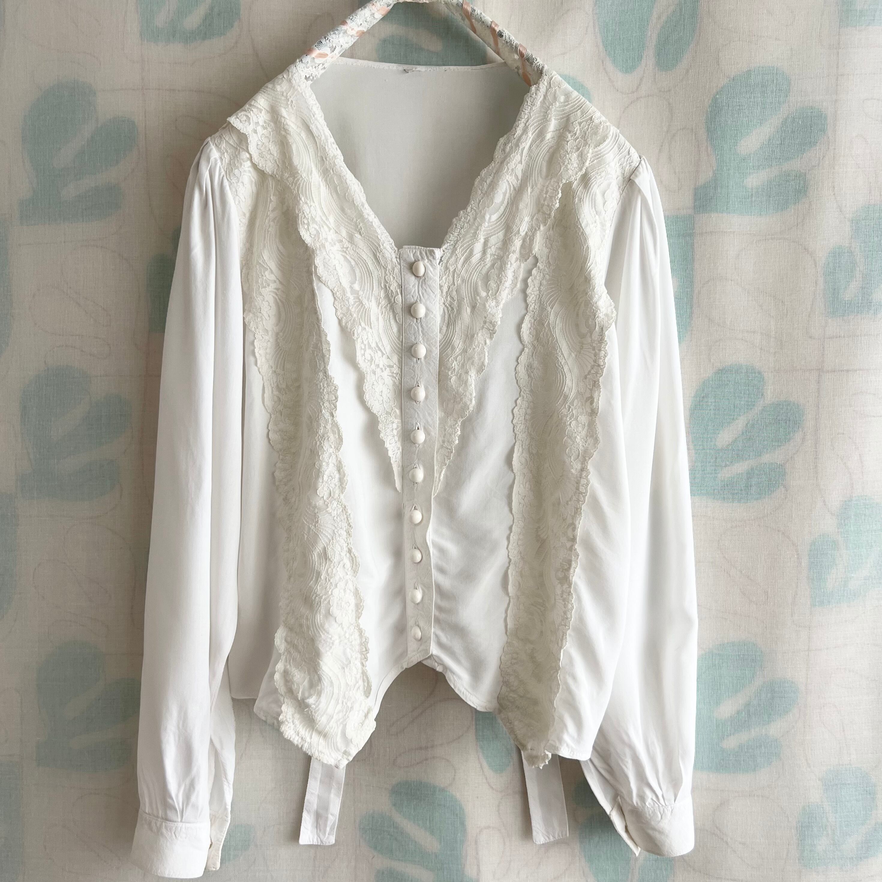 白ベースにオフ白レースがあしらわれた、少しエドワーディアン風なブラウスです。