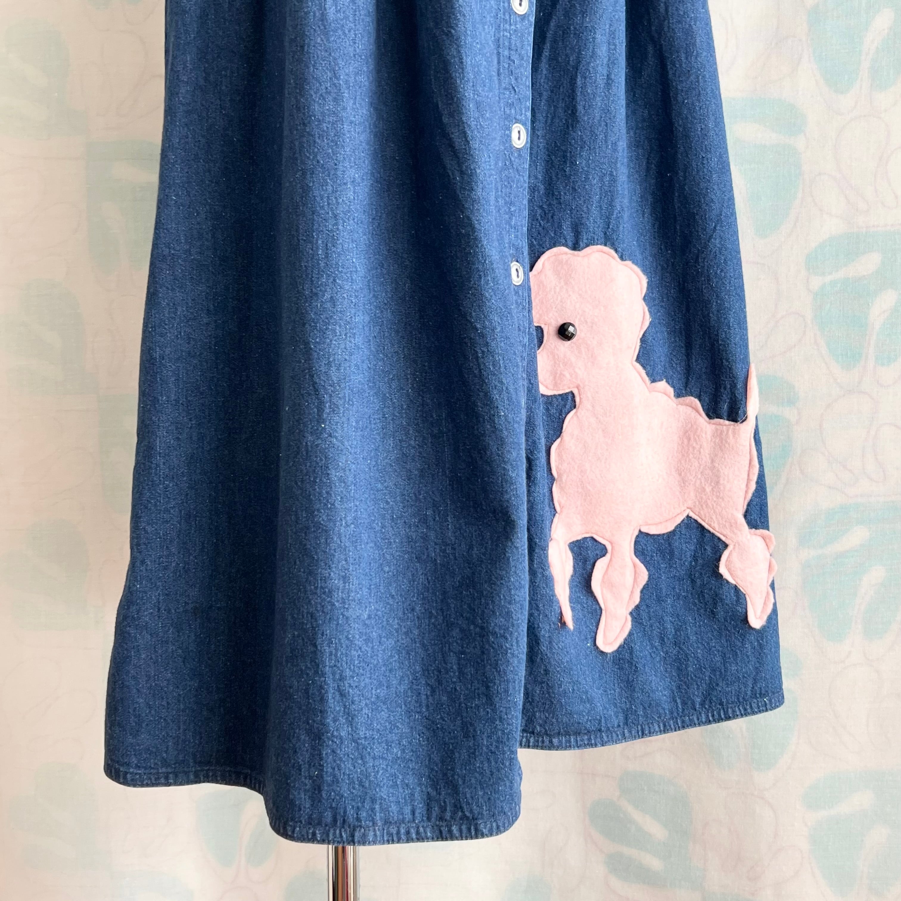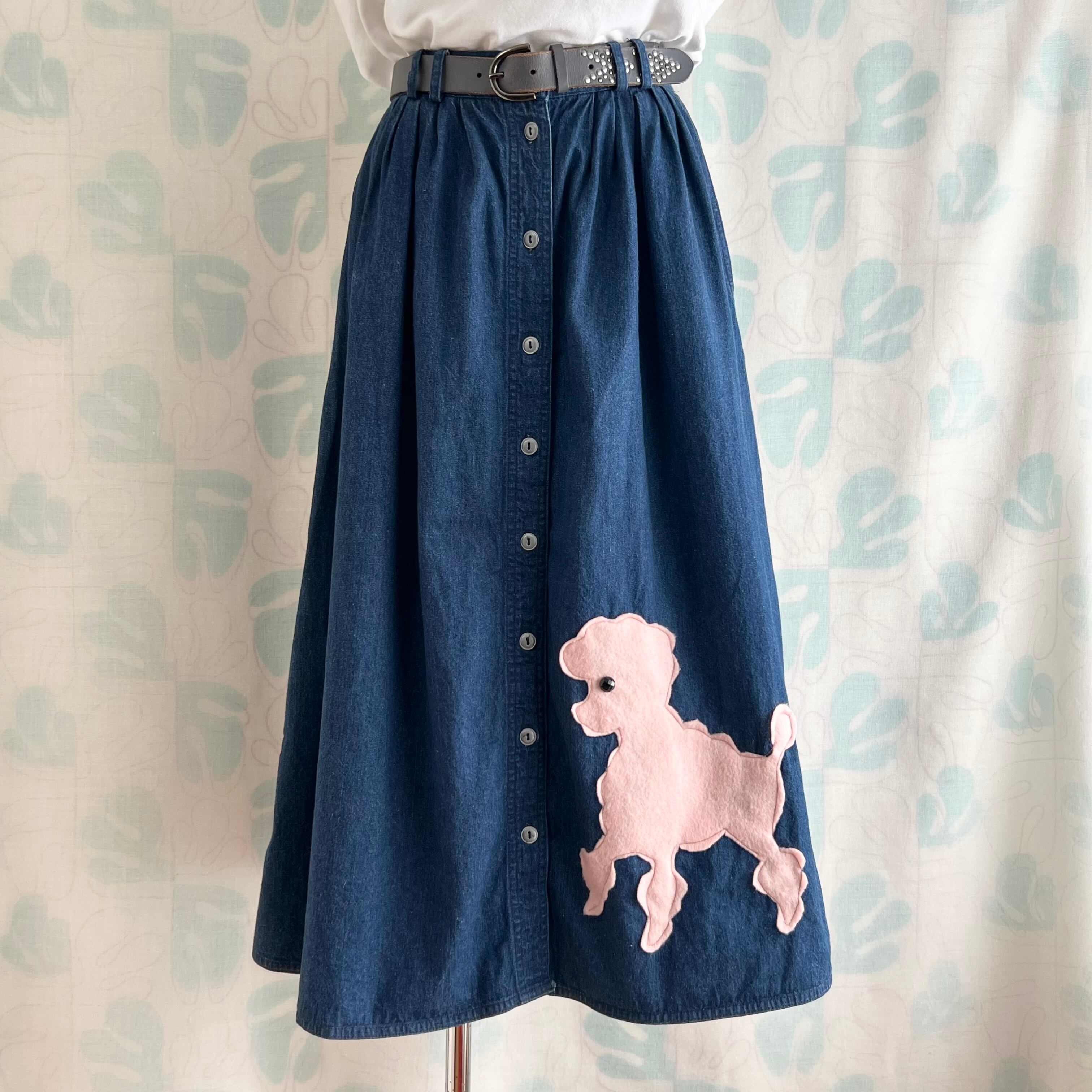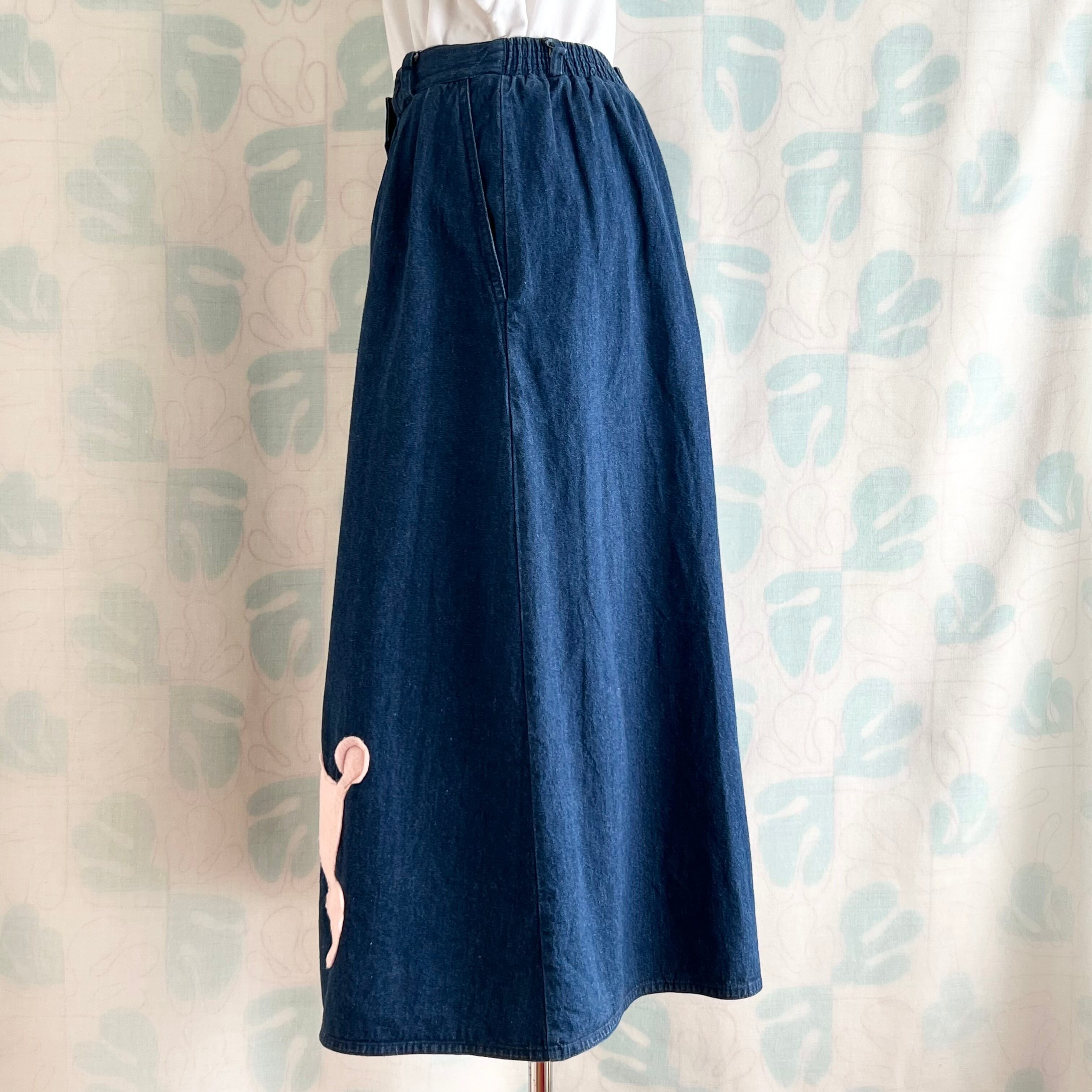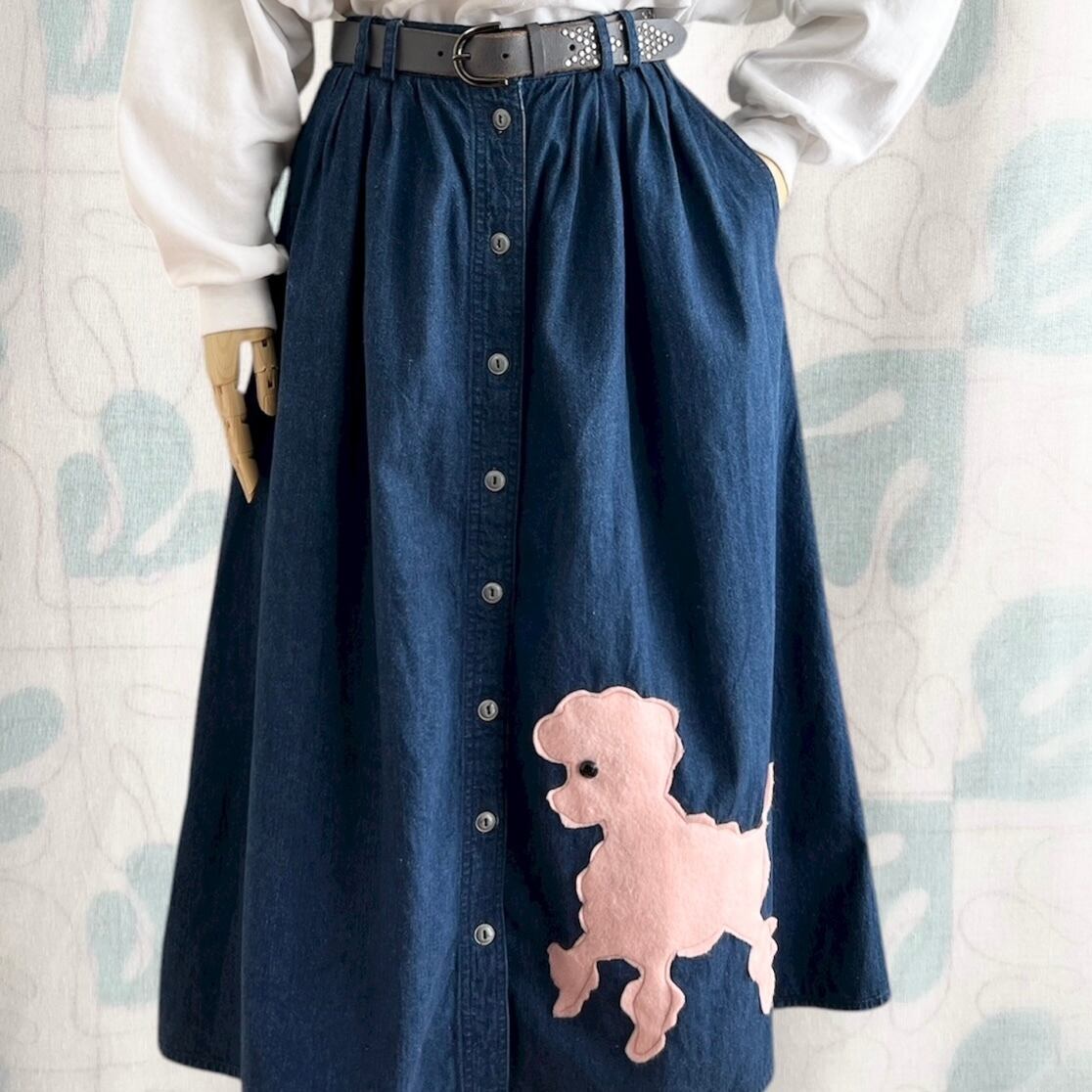 インディゴデニムにライトピンクのプードルアップリケが付いたロングスカートです。