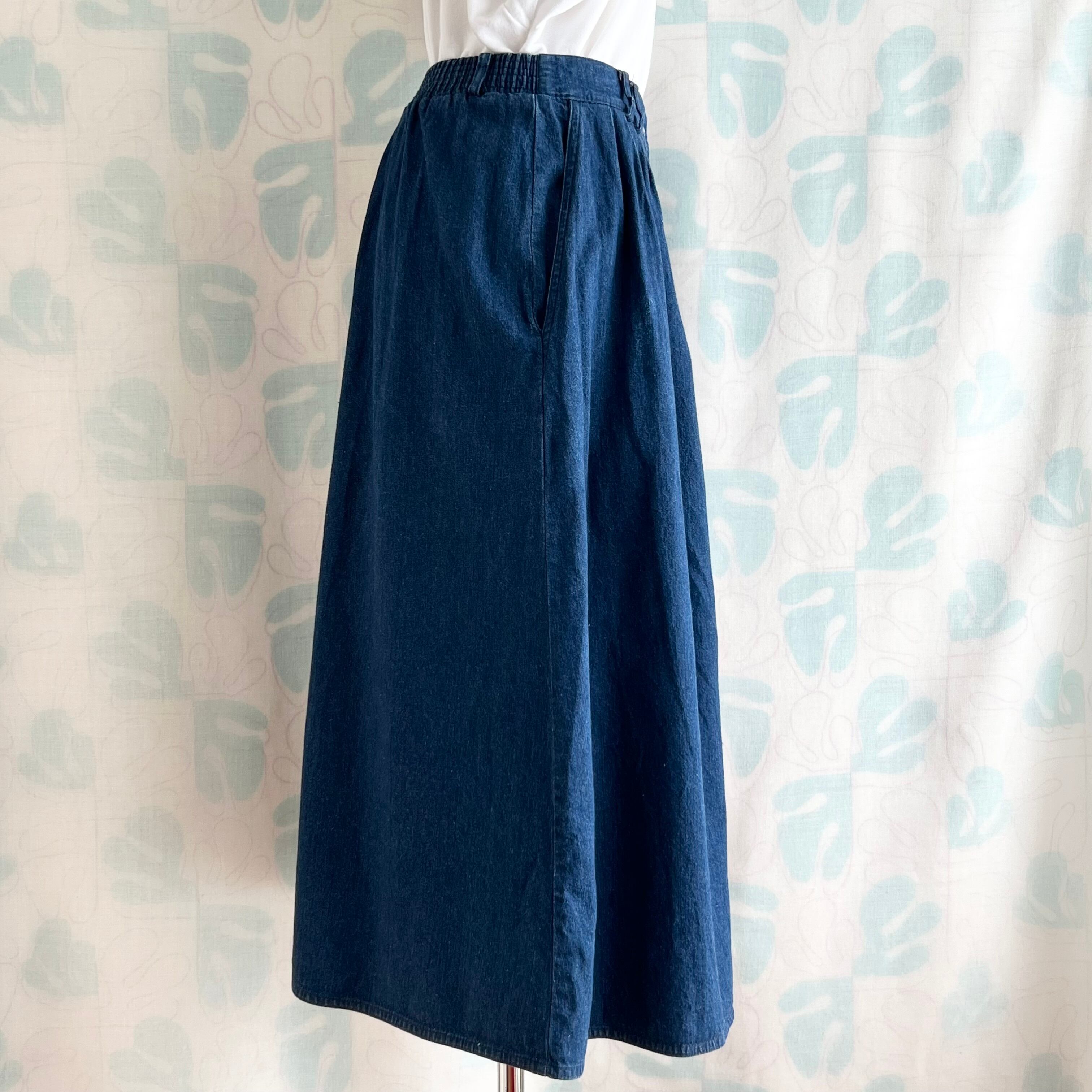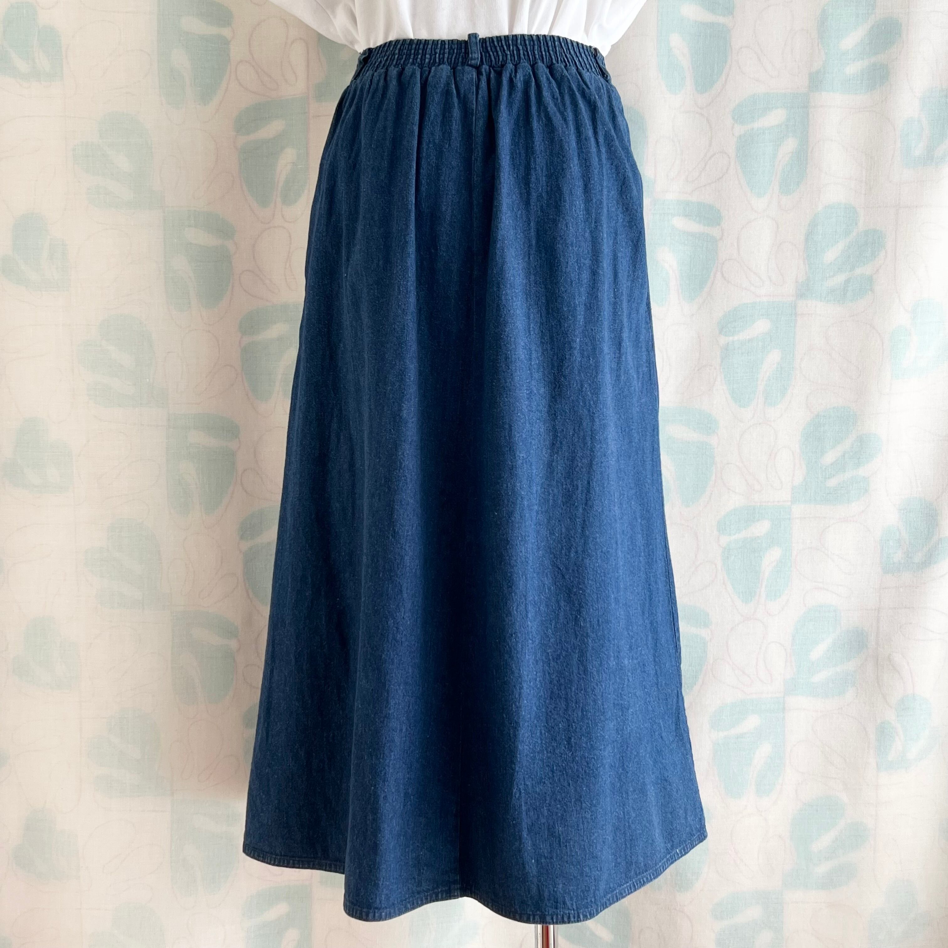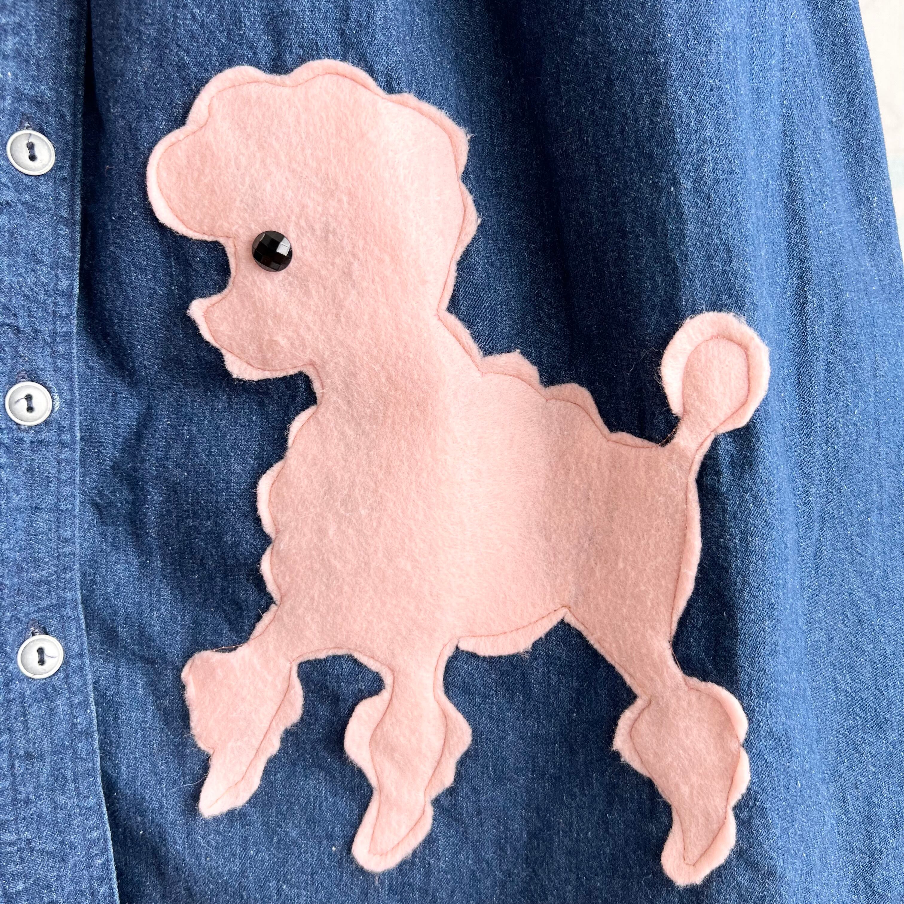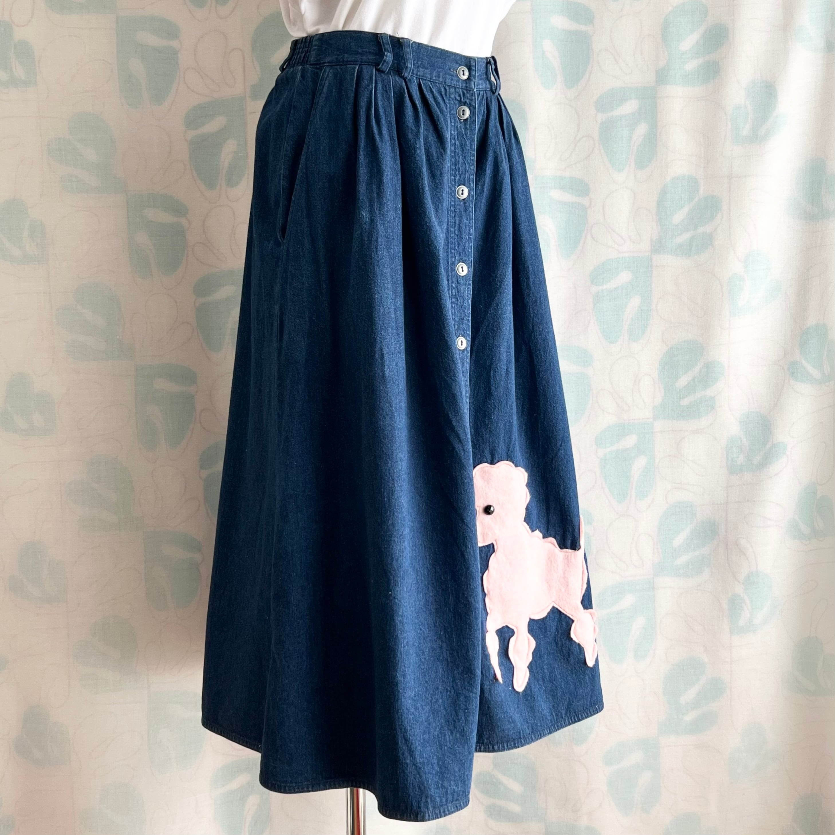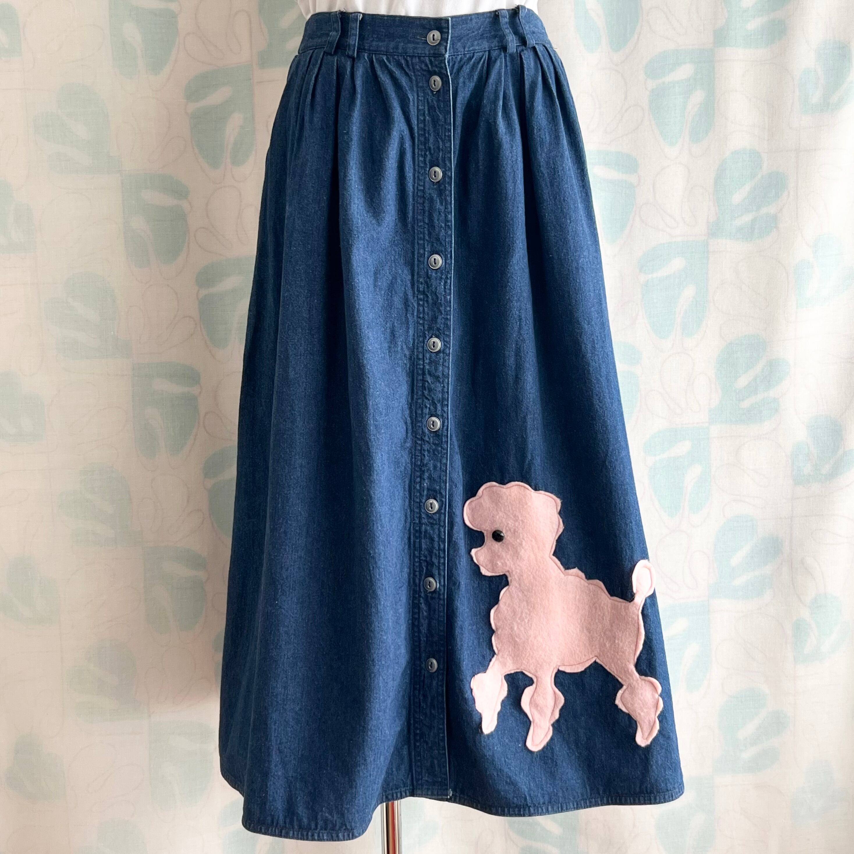 インディゴデニムにライトピンクのプードルアップリケが付いたロングスカートです。