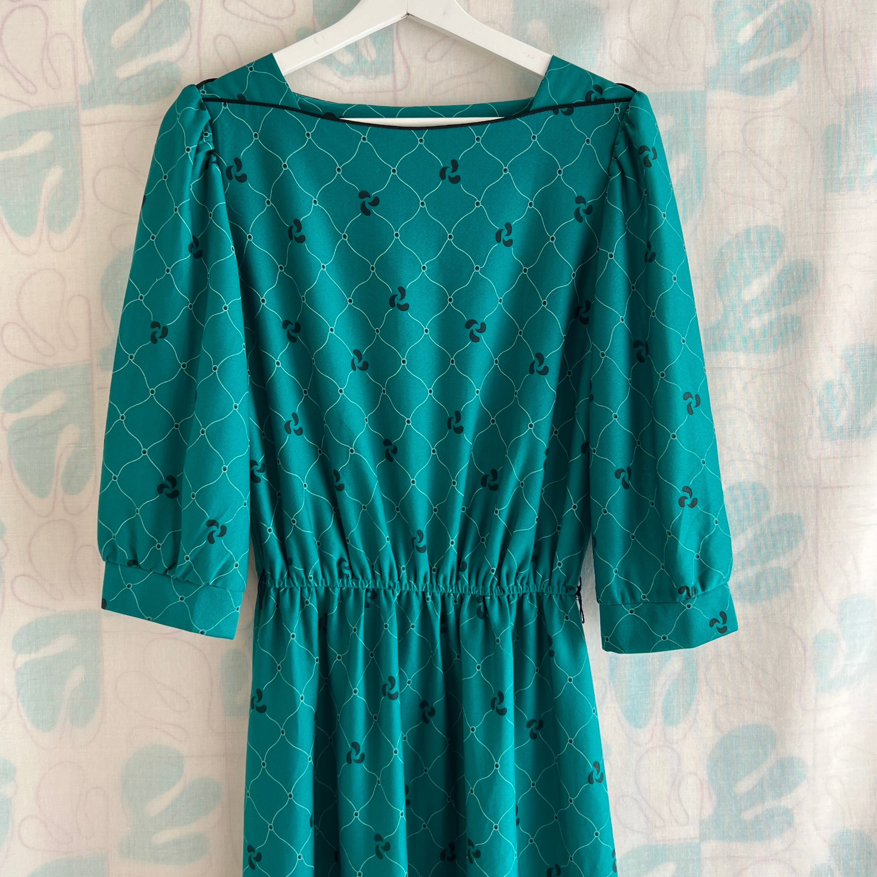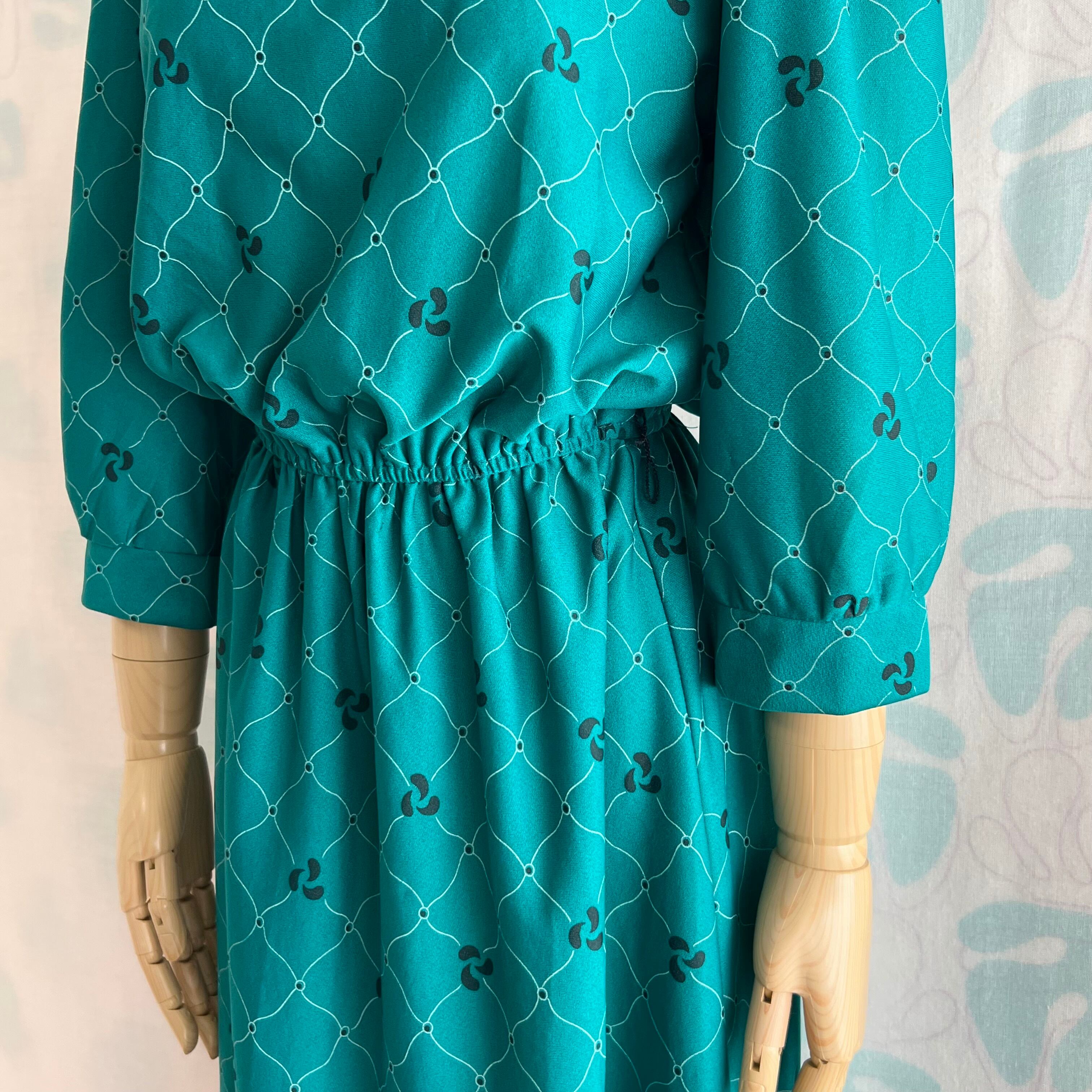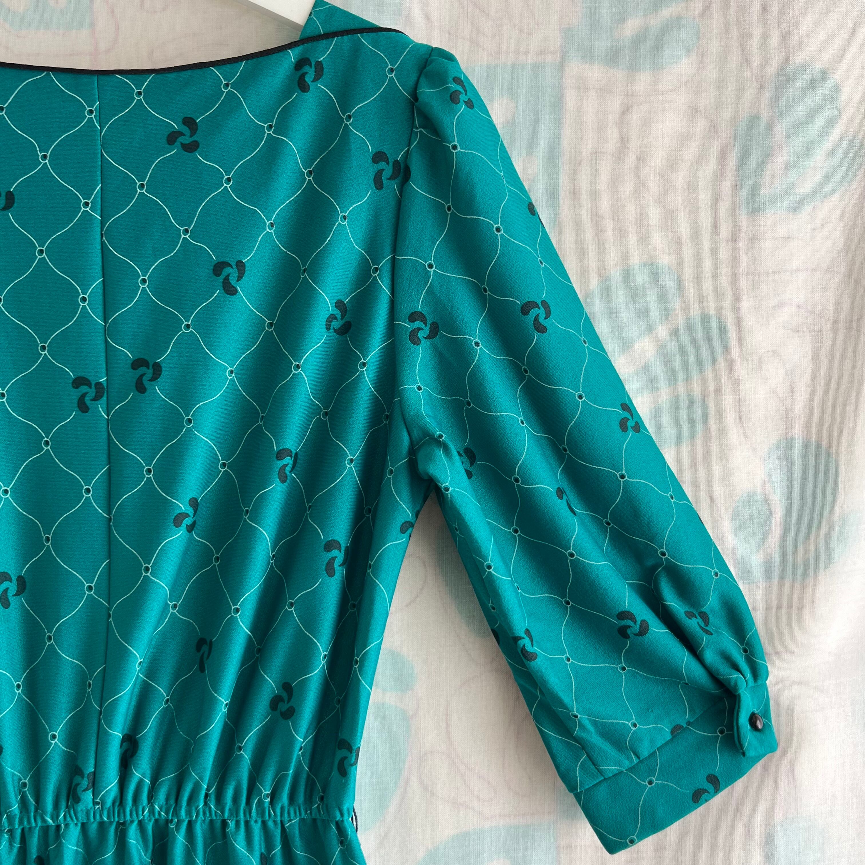 鮮やかなピーコックグリーンにブラックのユニークな総柄のワンピースです。