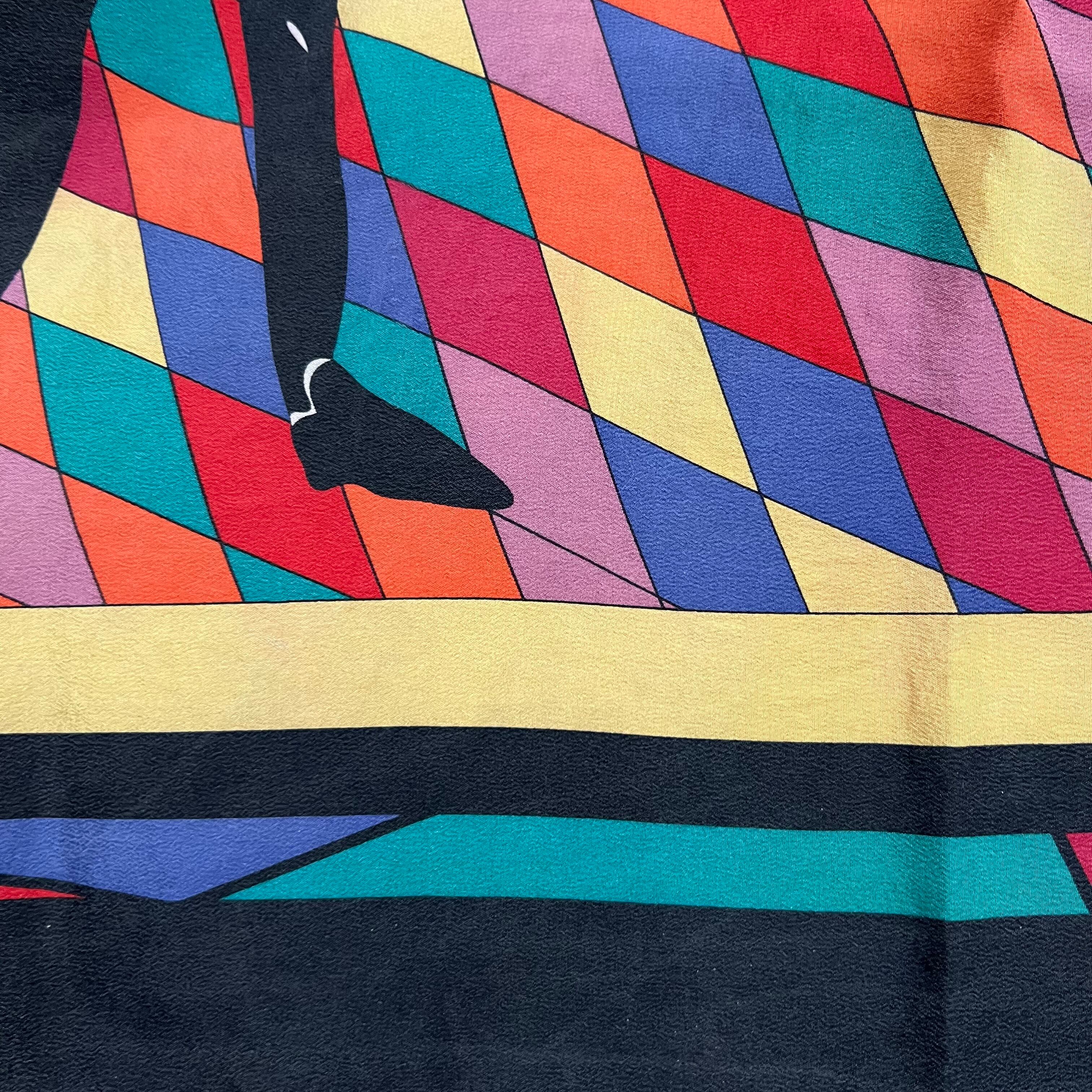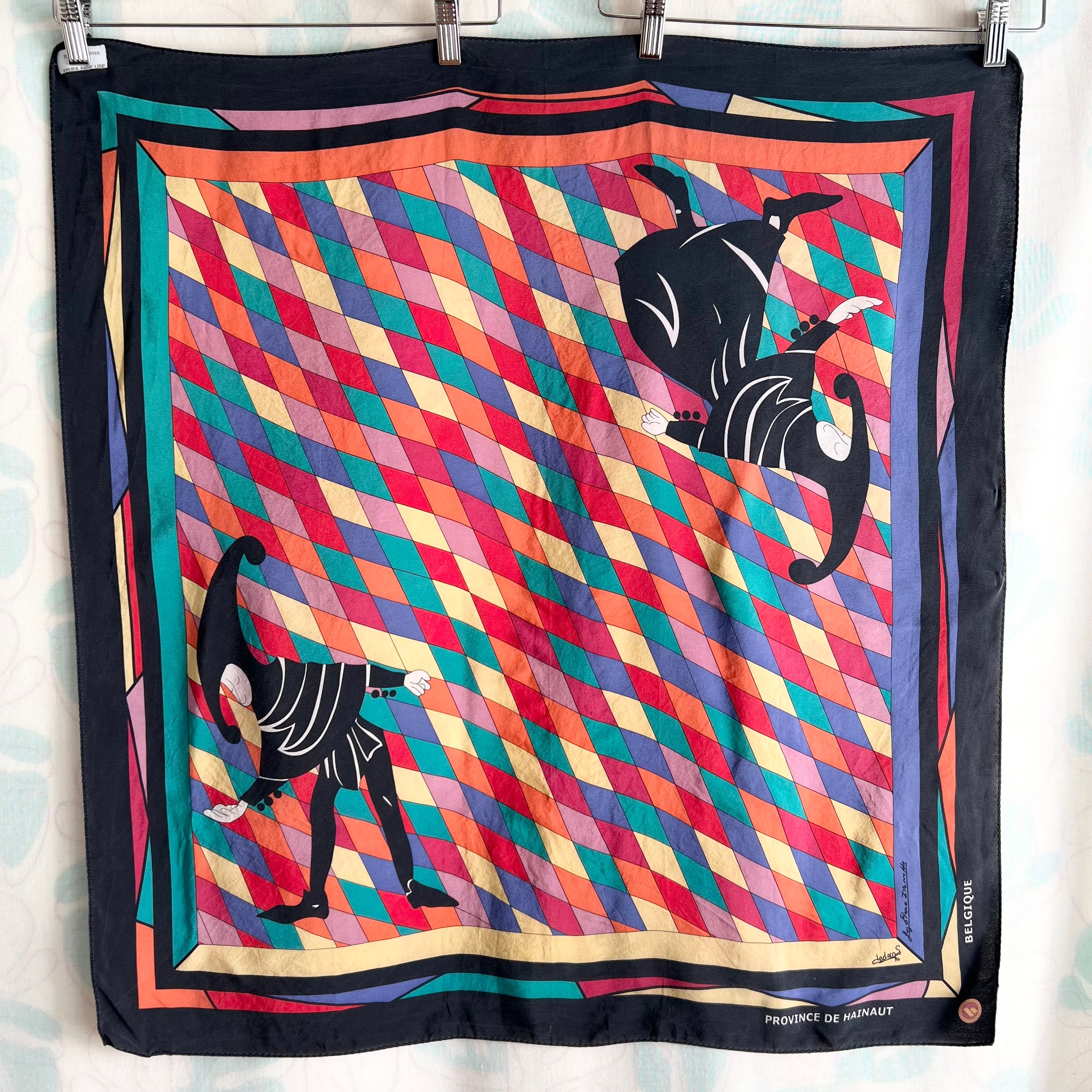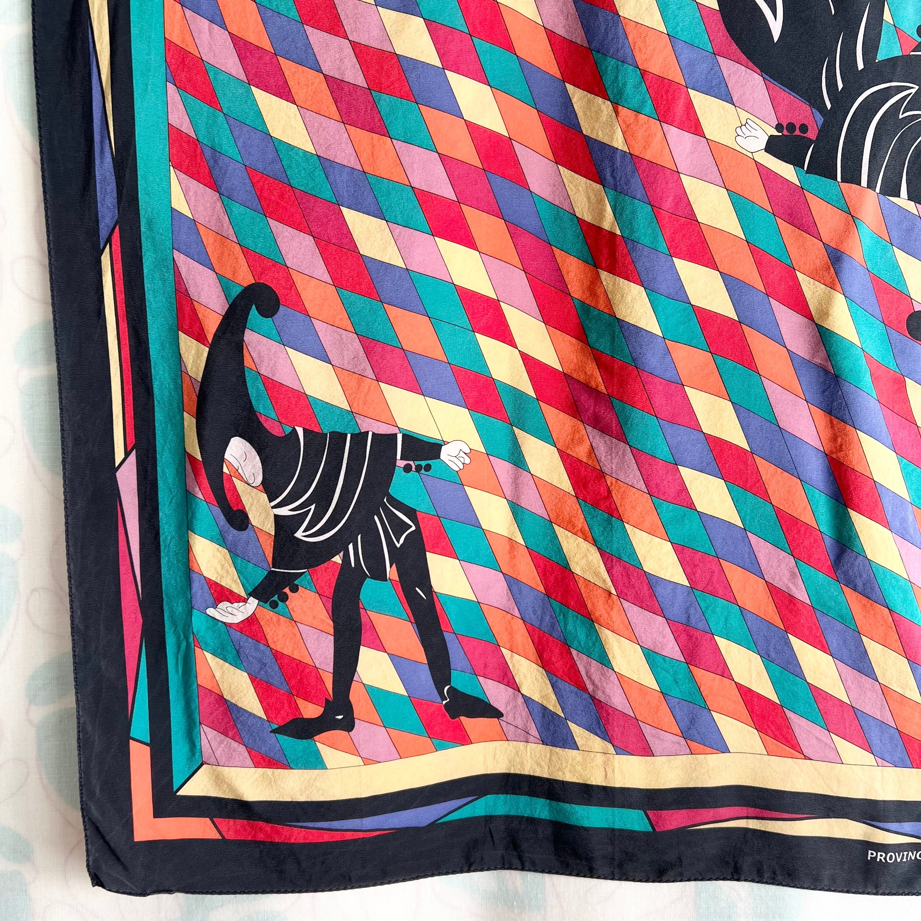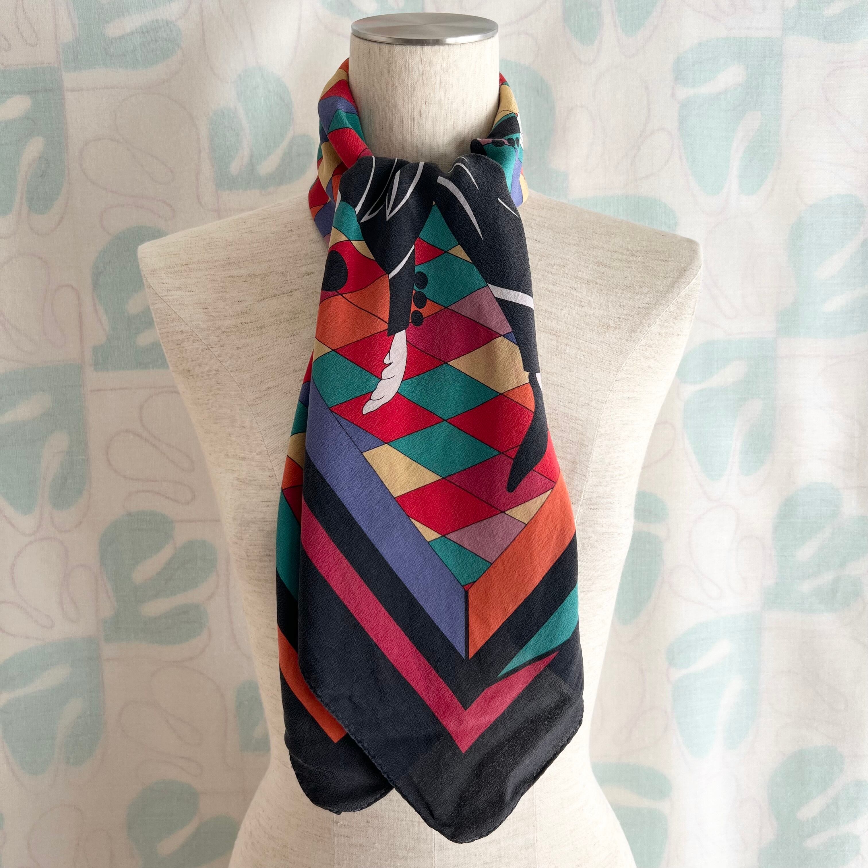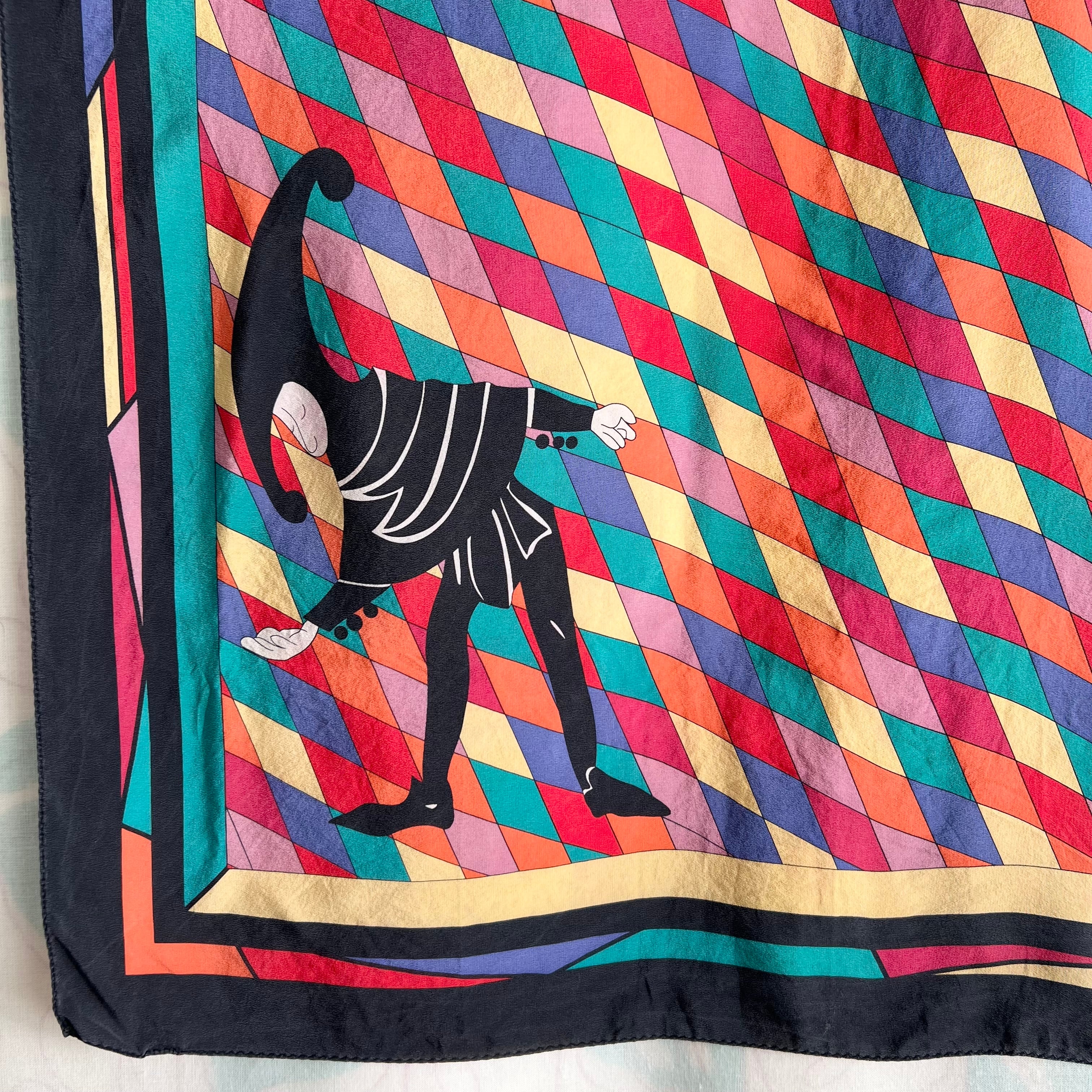 カラフルなダイヤ柄にピエロのような修道士のような人物がプリントされたユニークなスカーフです。