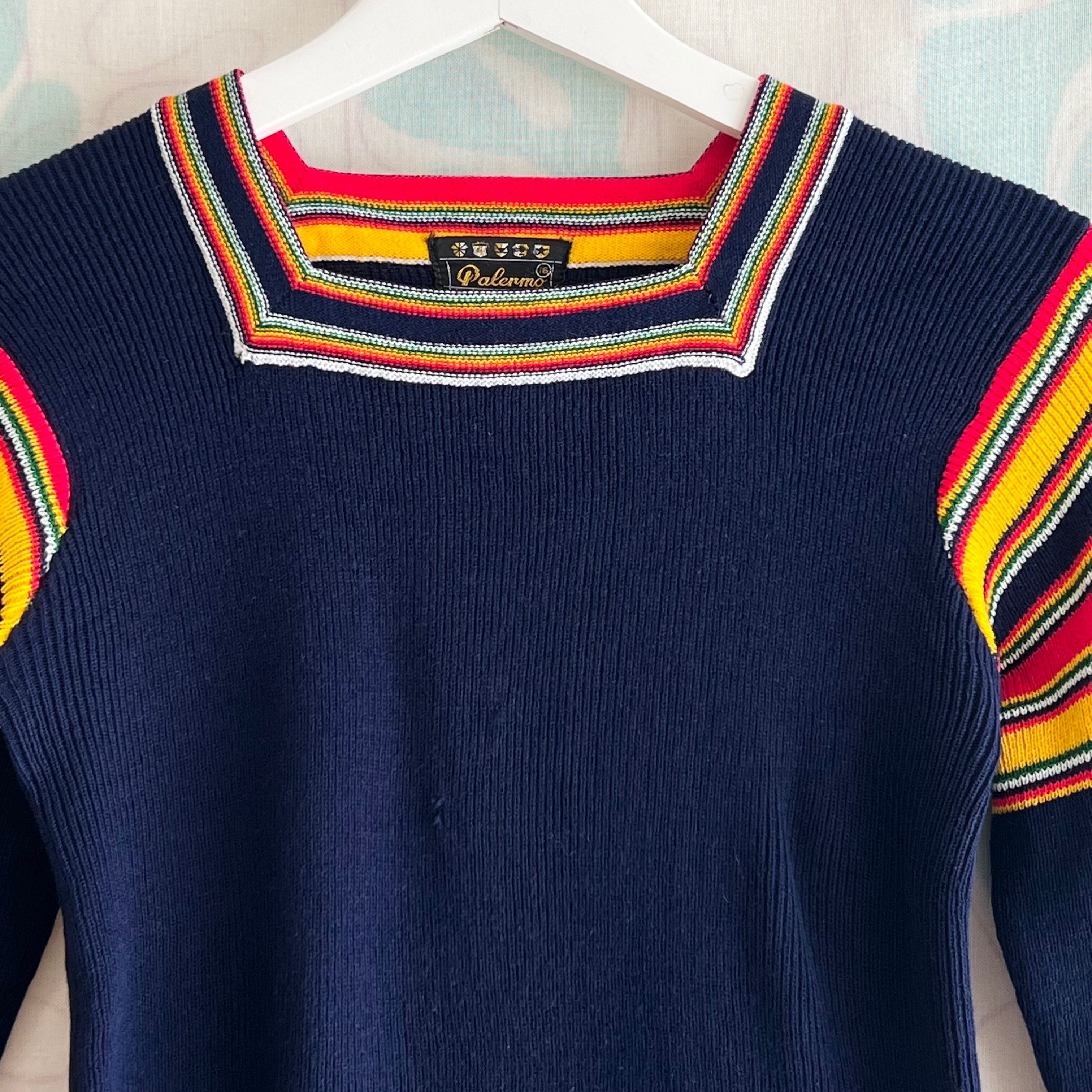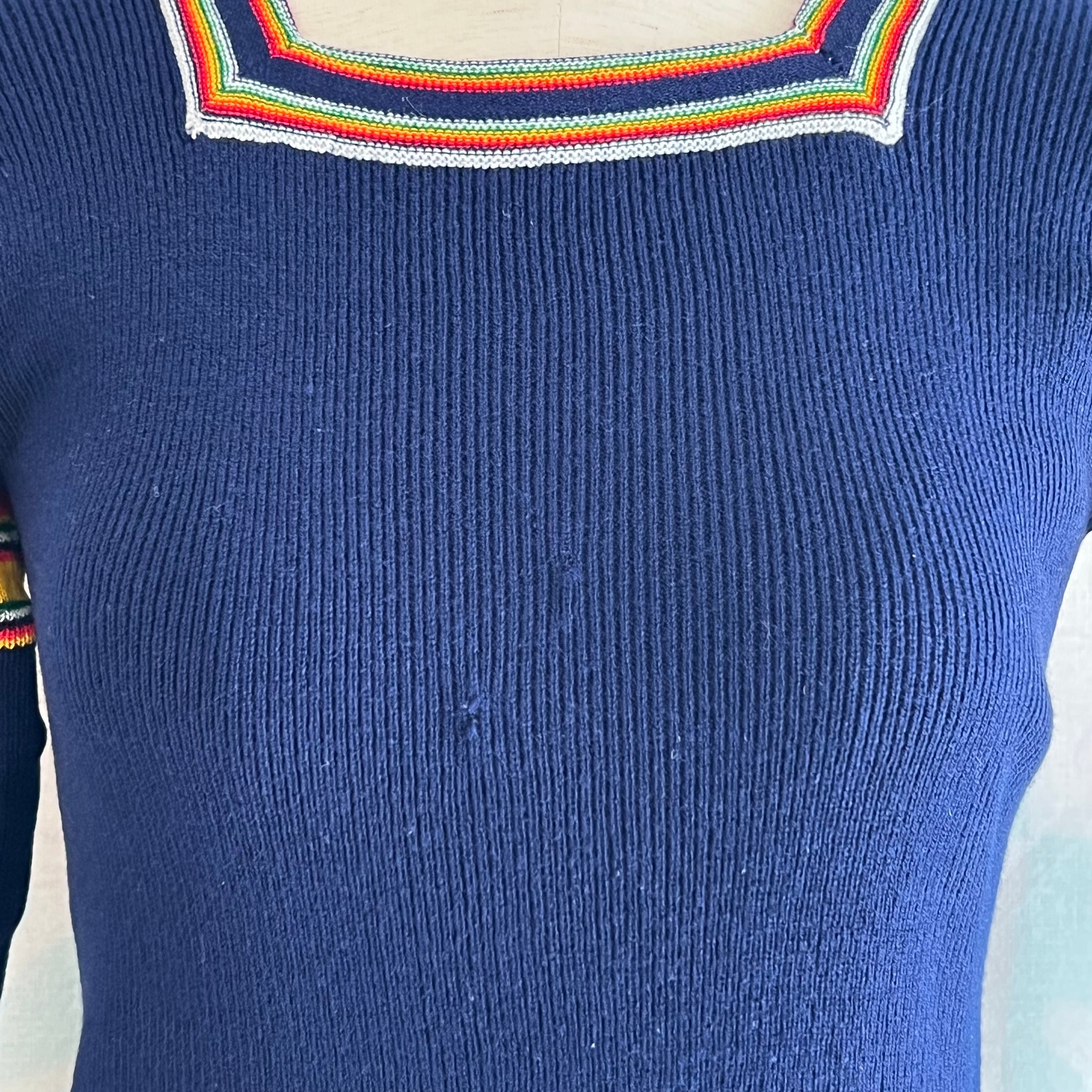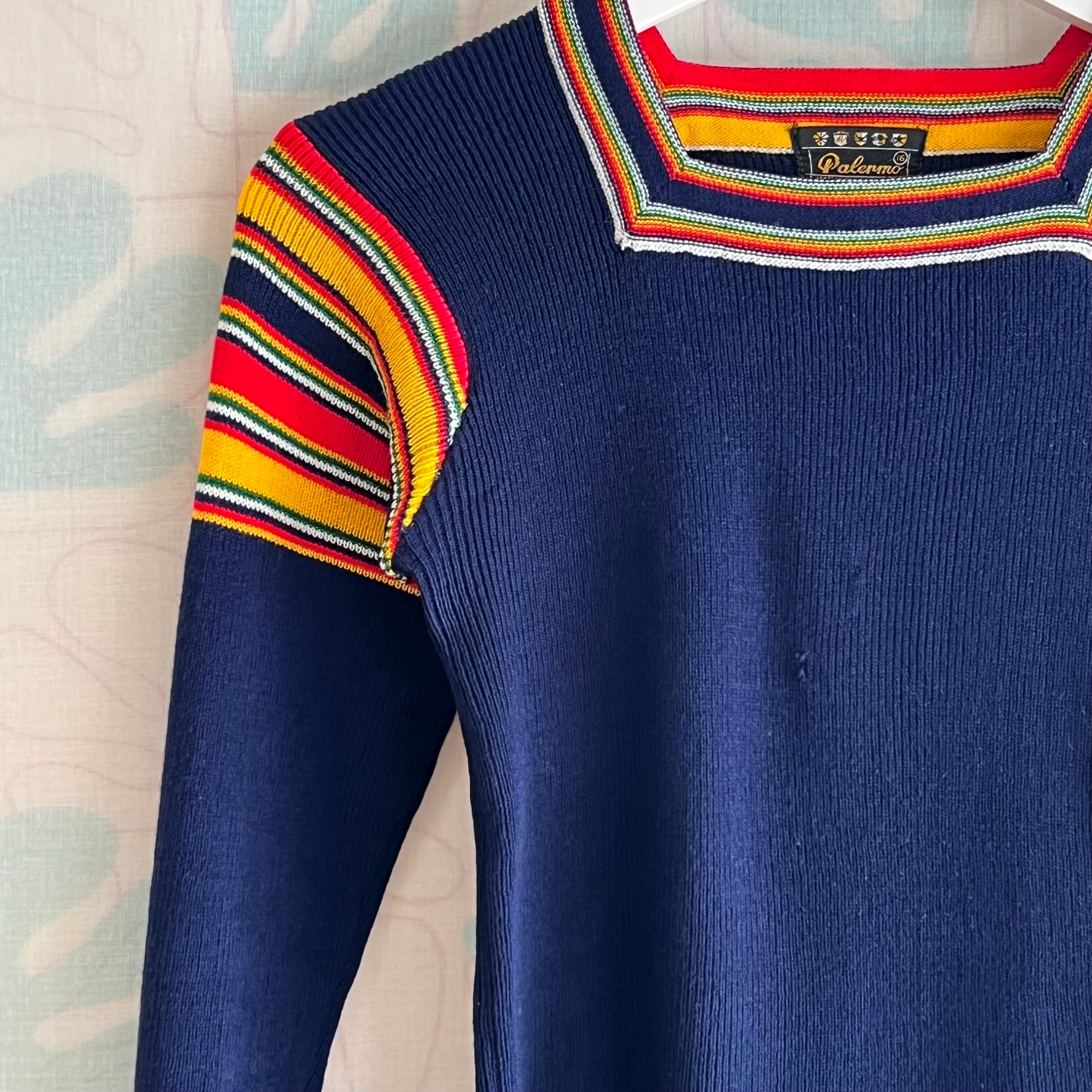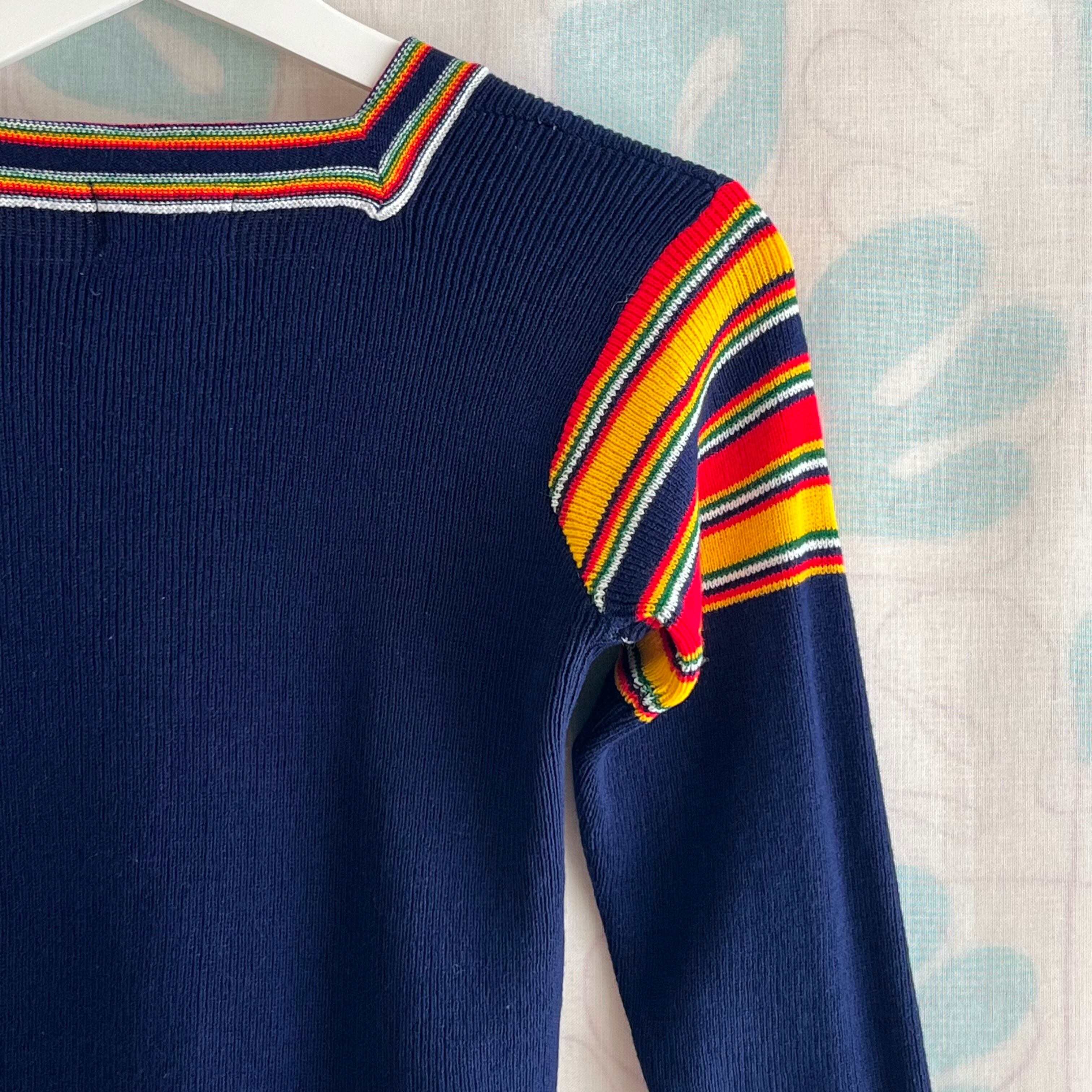 70's navy ribbed knit sweater with colorful stripes