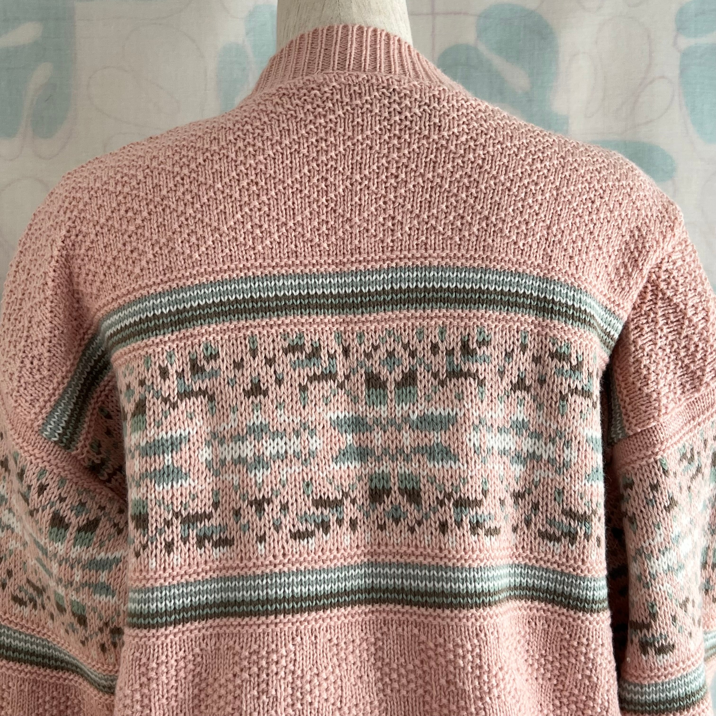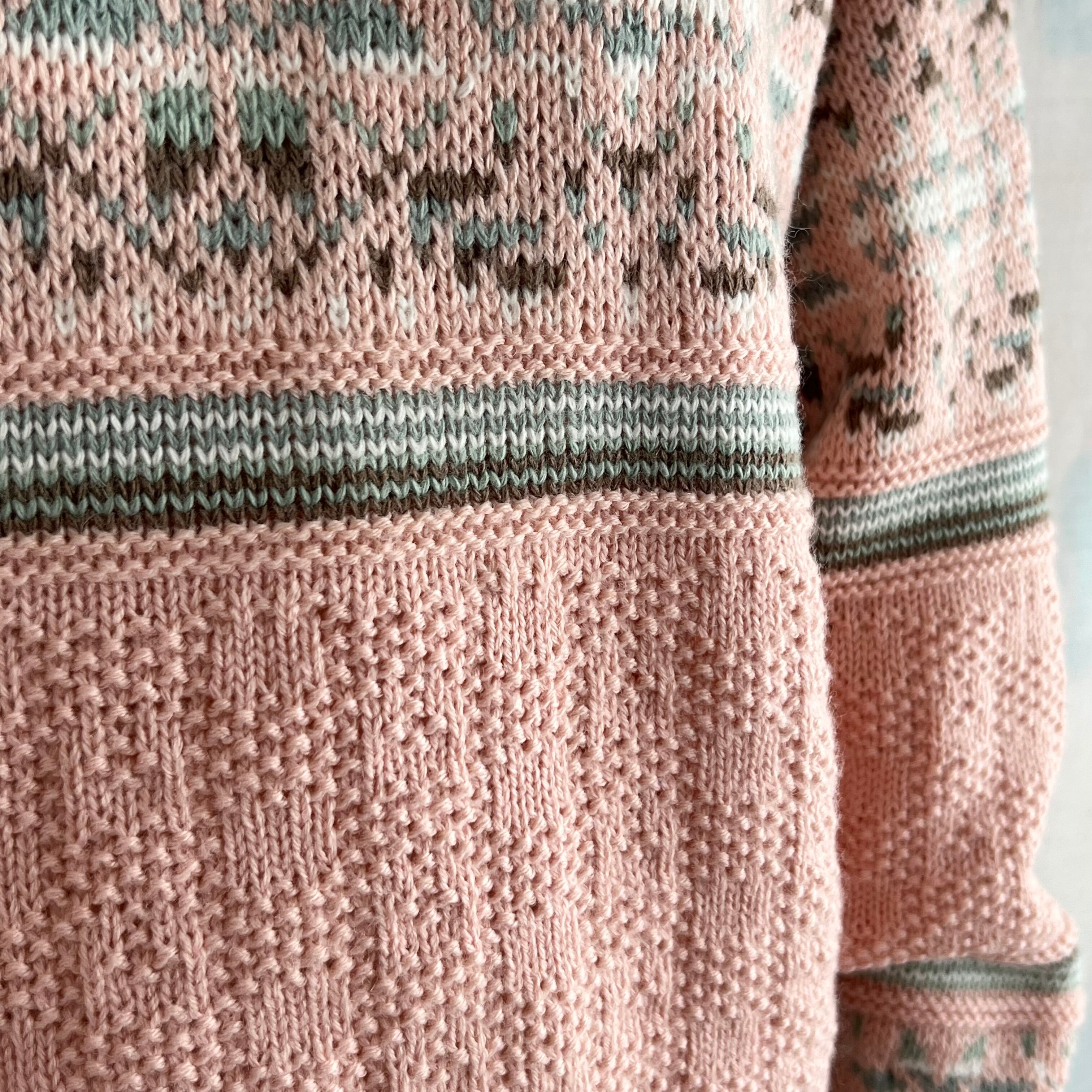 ミックスの編み地とペールトーンの多色使いの柄がほっこり可愛いです。