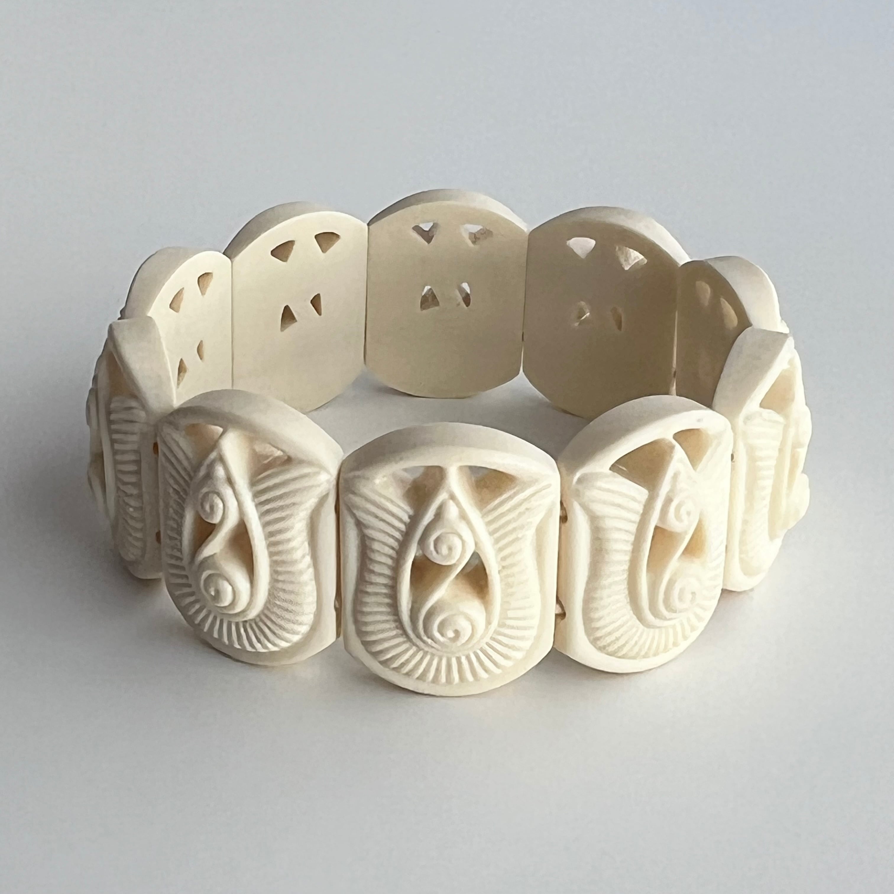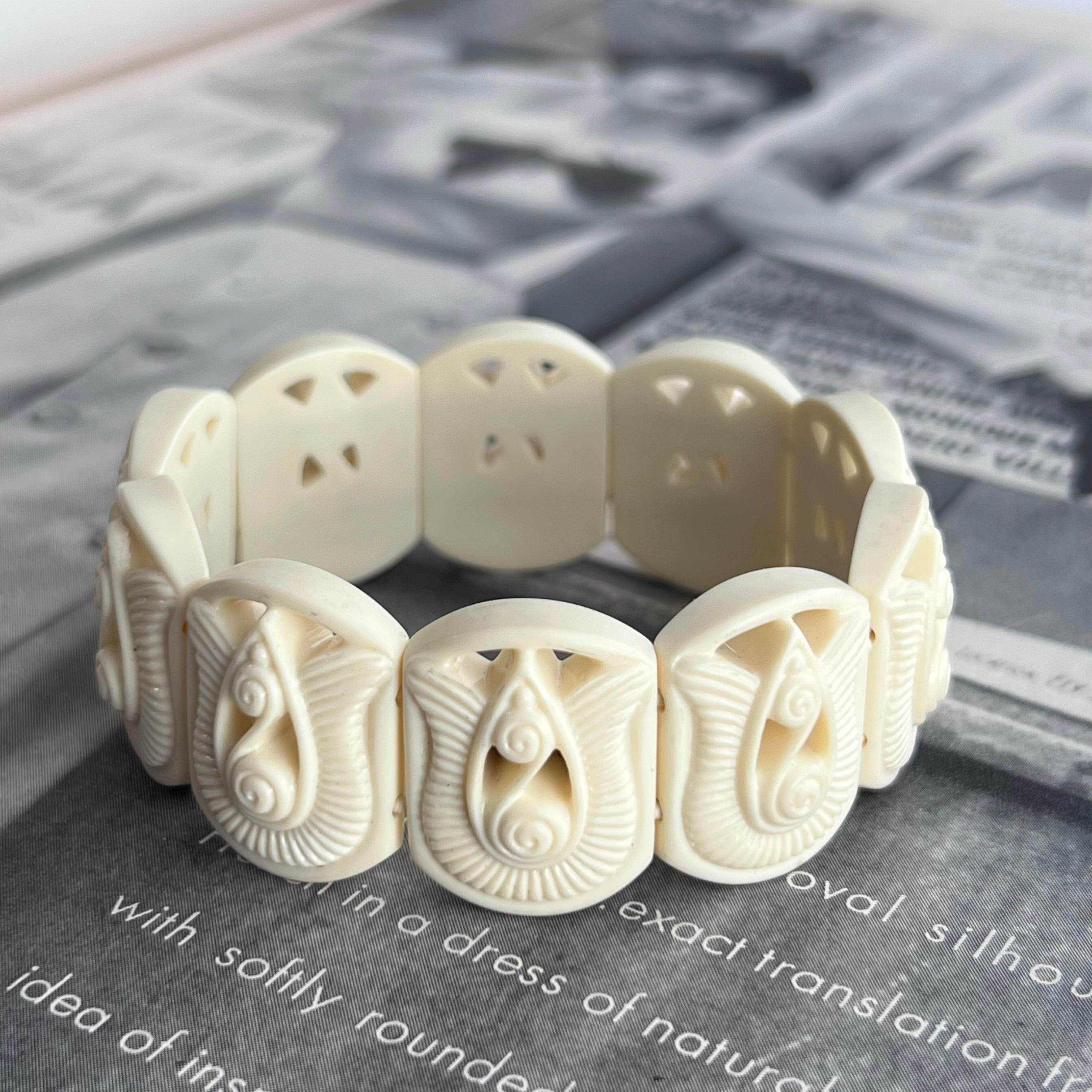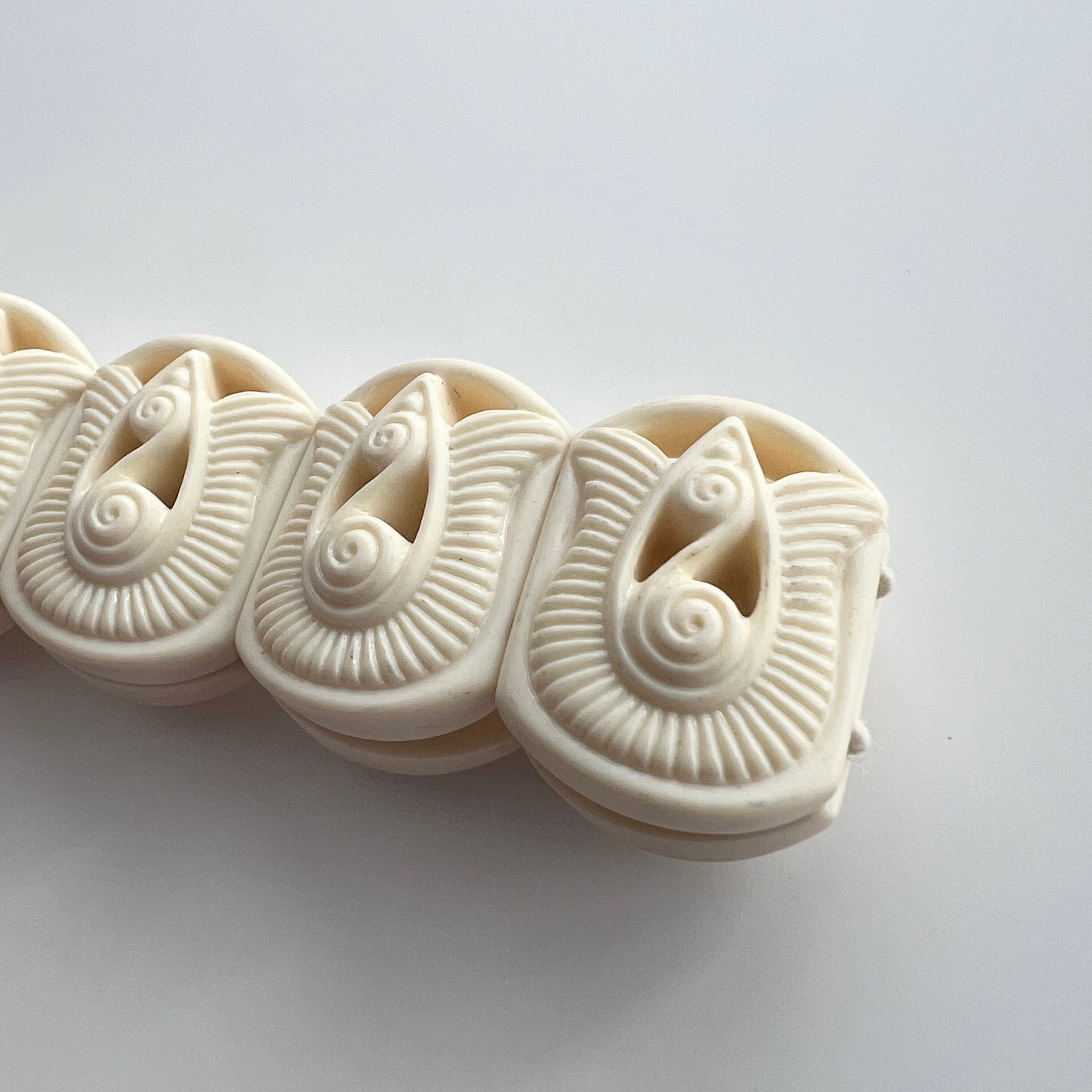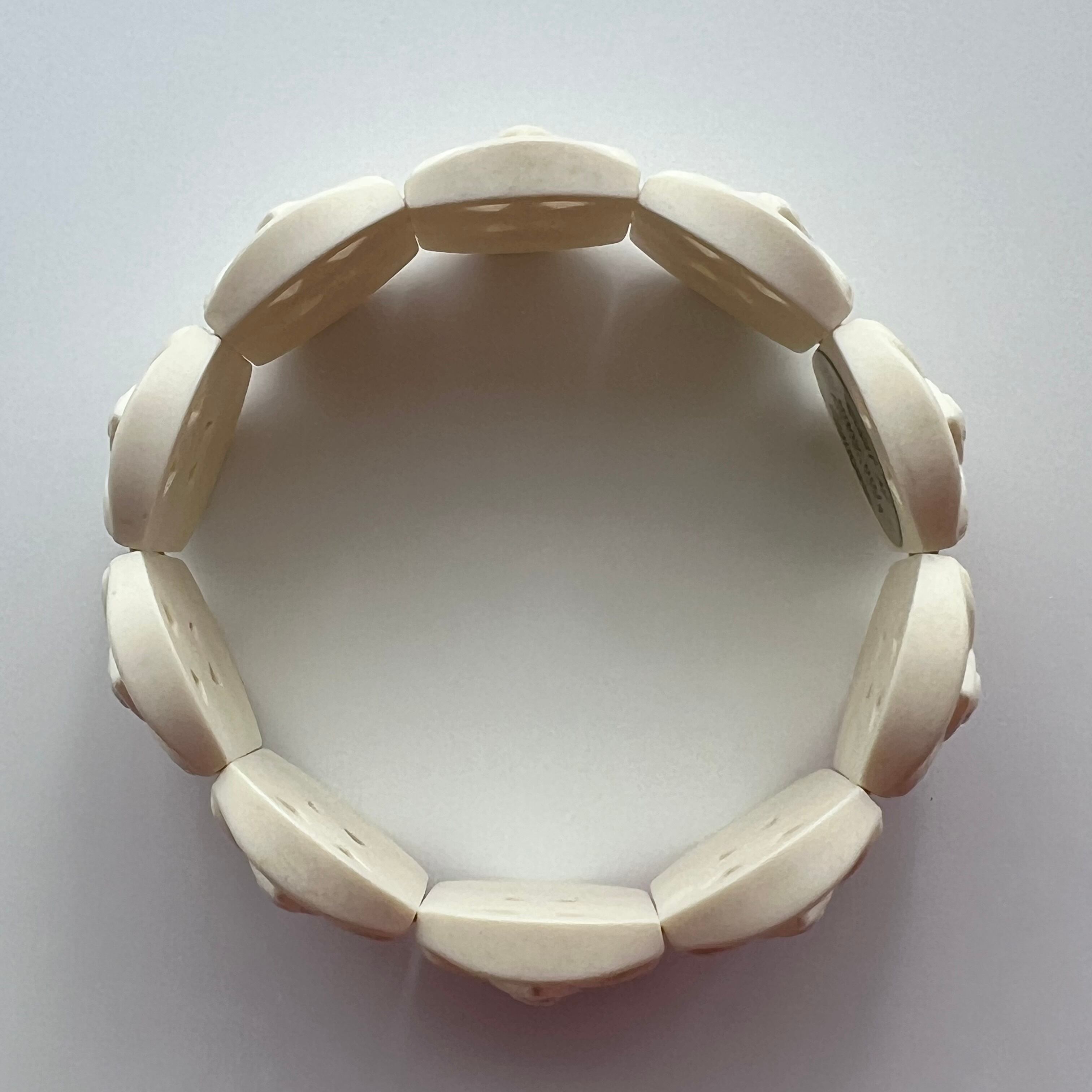 象牙色クリームのプラスチック素材にアール・ヌーヴォー調のチューリップモチーフが並ぶ、とても可愛いデザインのブレスレットです。