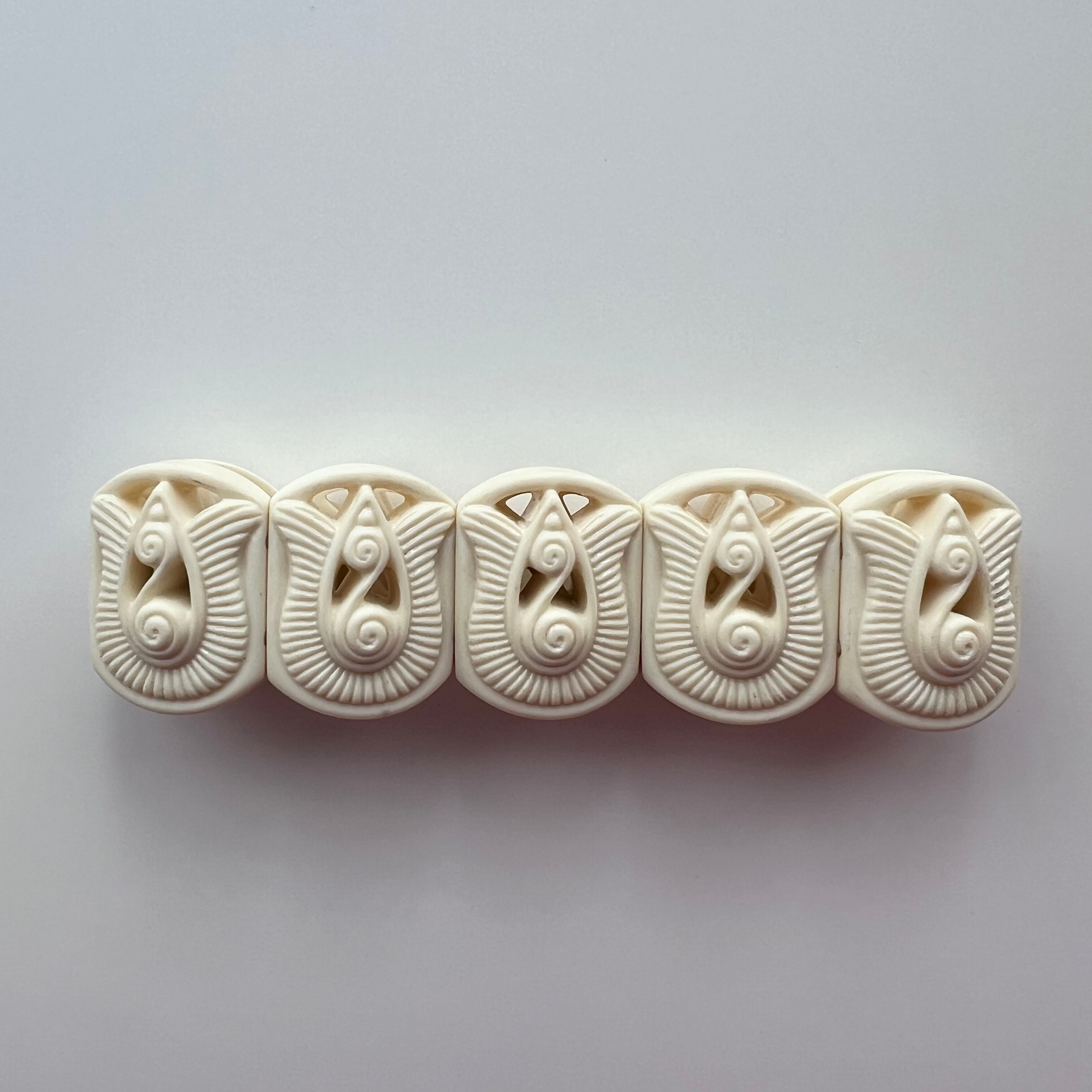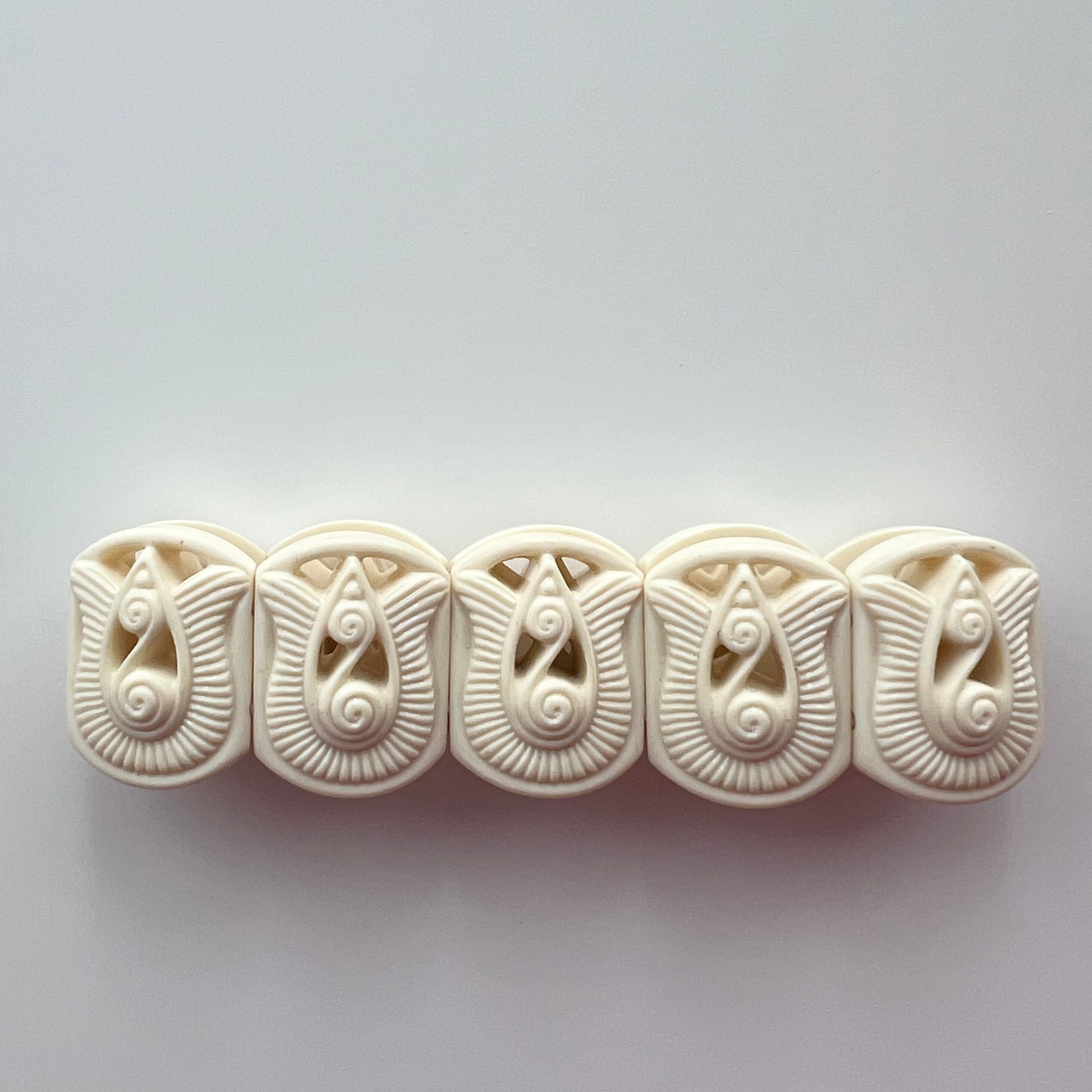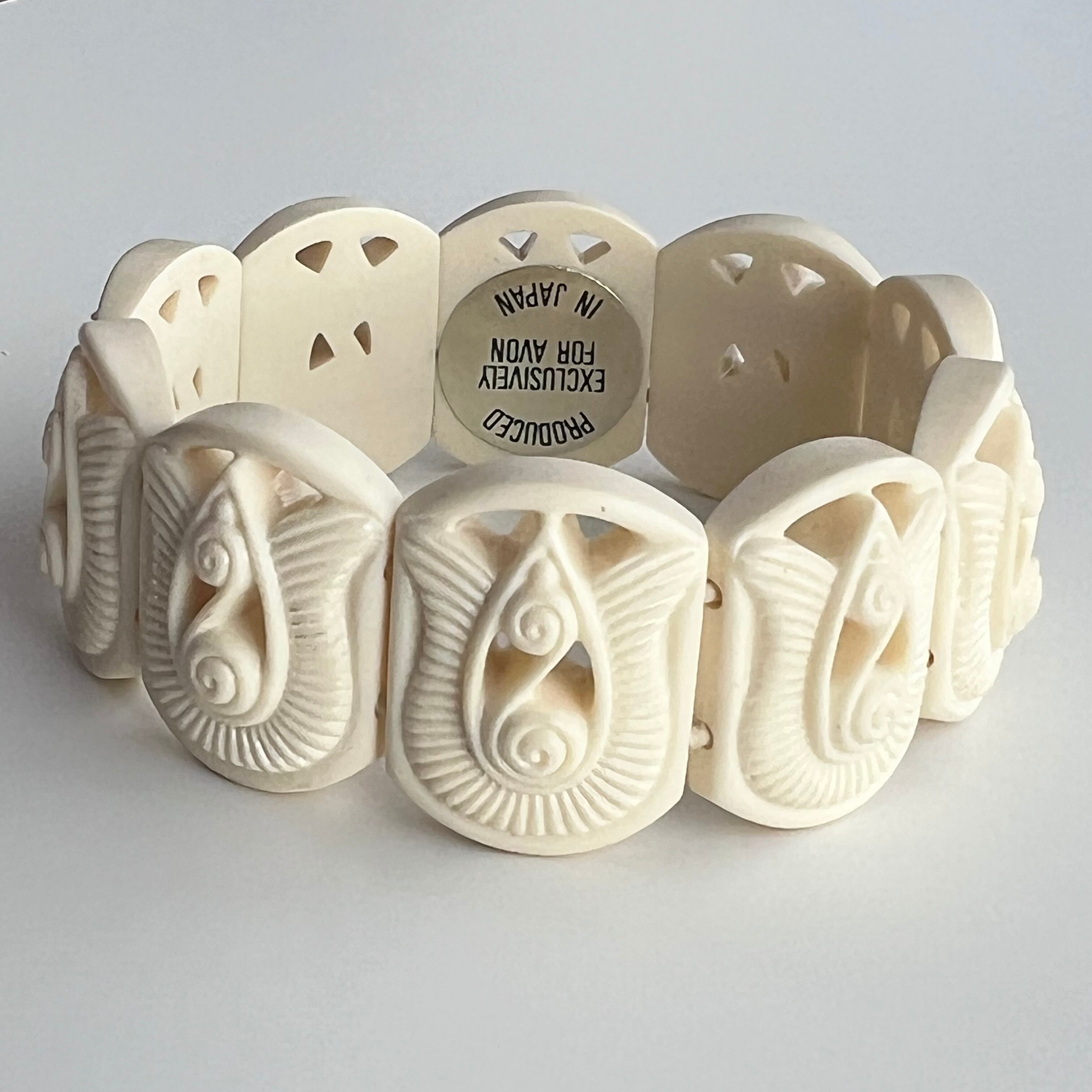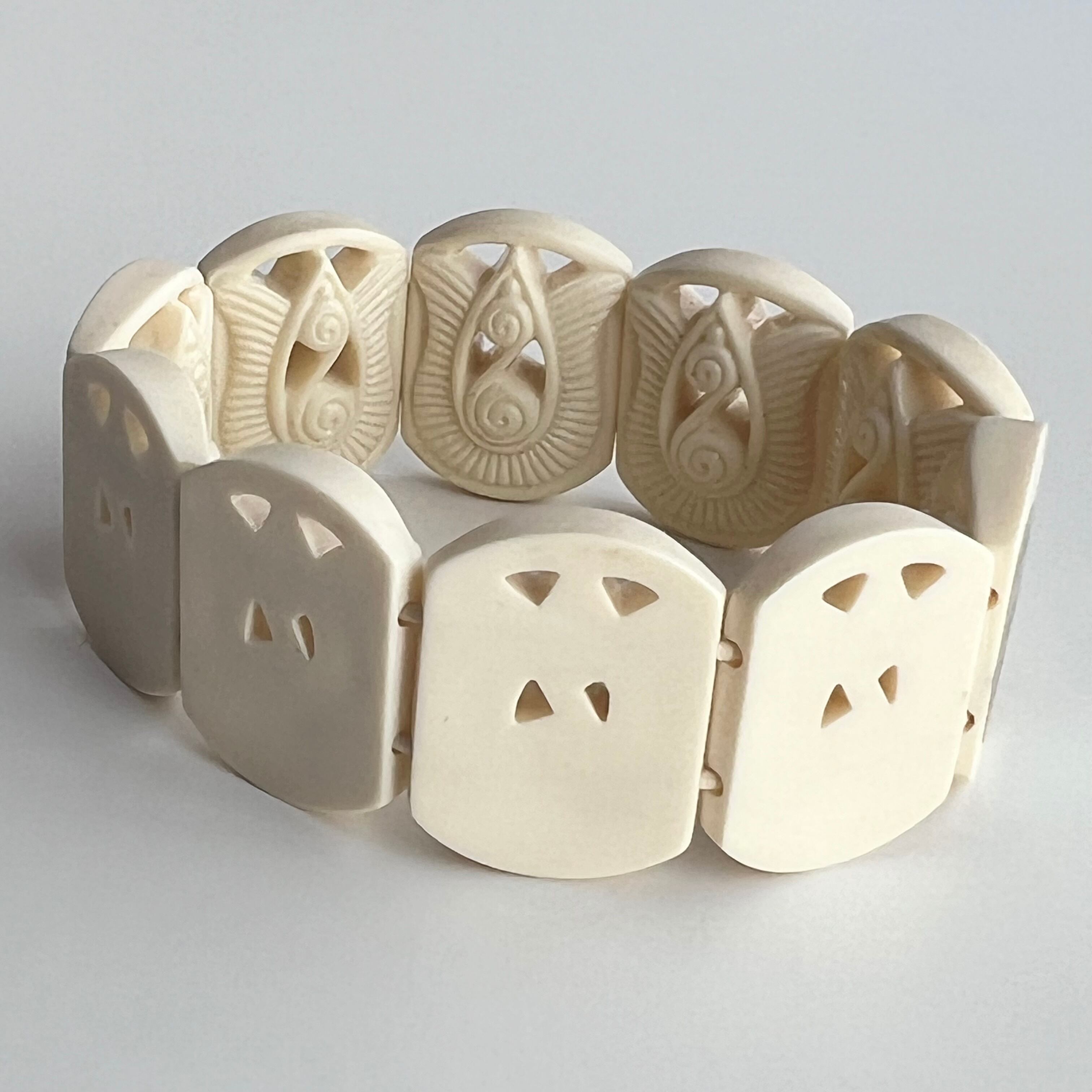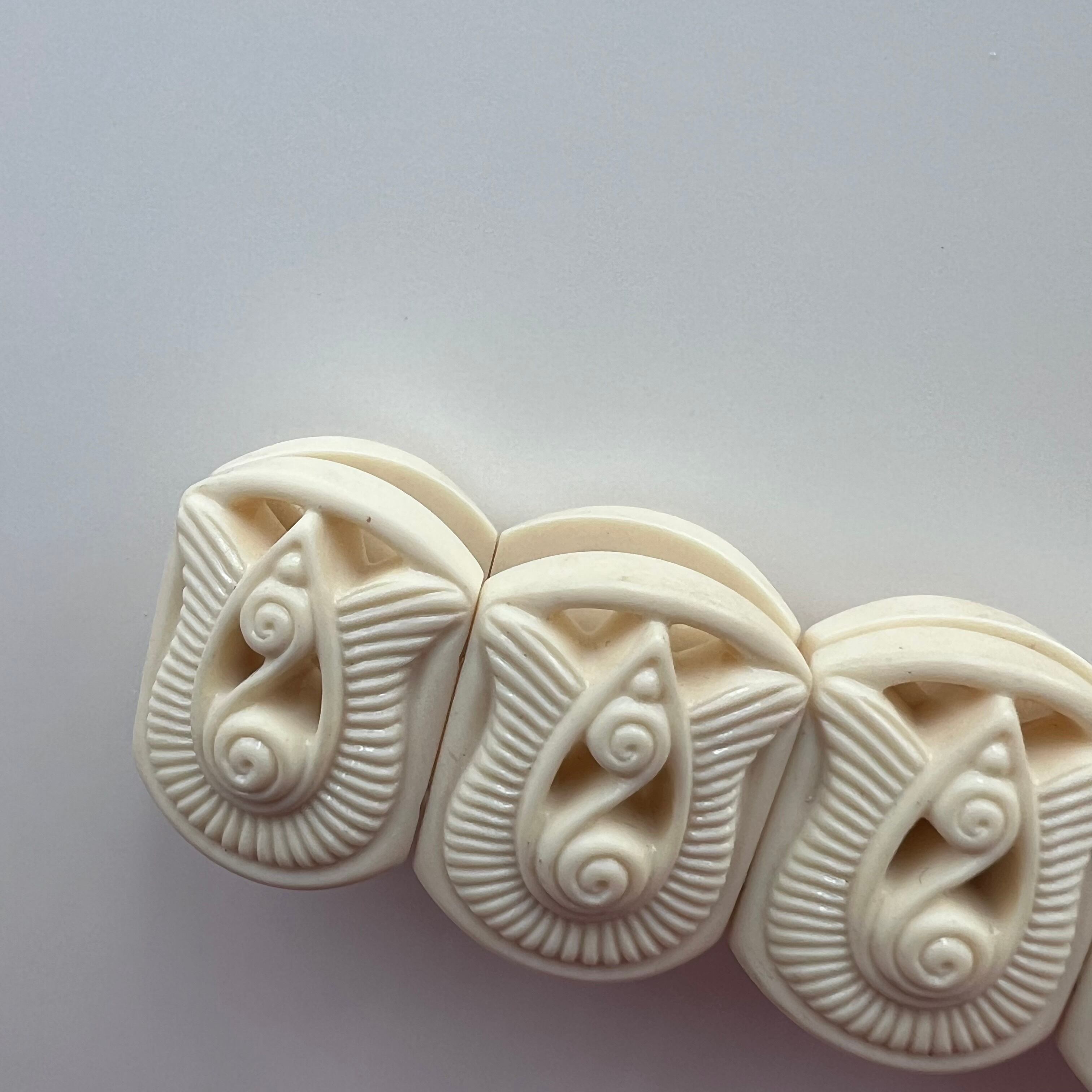 象牙色クリームのプラスチック素材にアール・ヌーヴォー調のチューリップモチーフが並ぶ、とても可愛いデザインのブレスレットです。