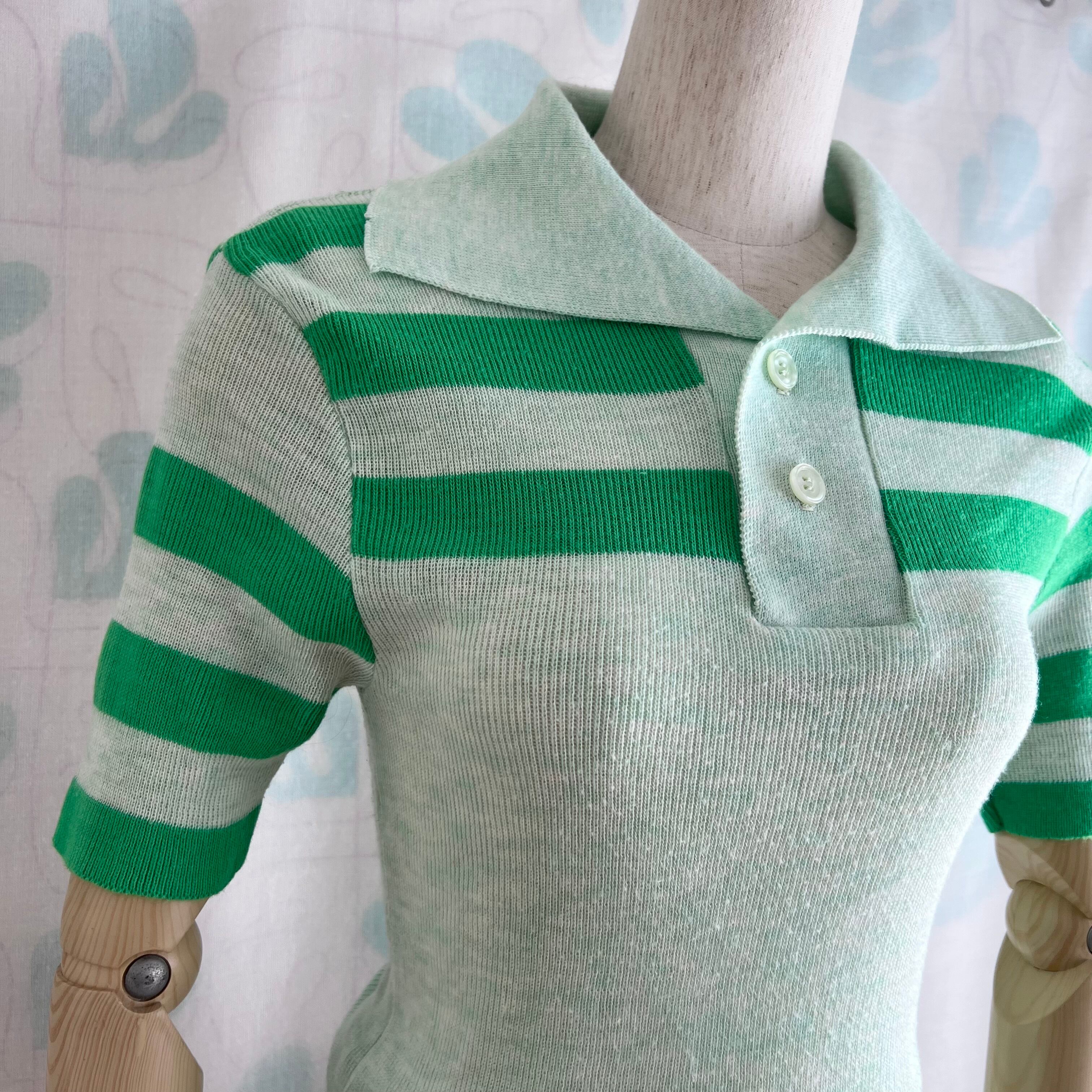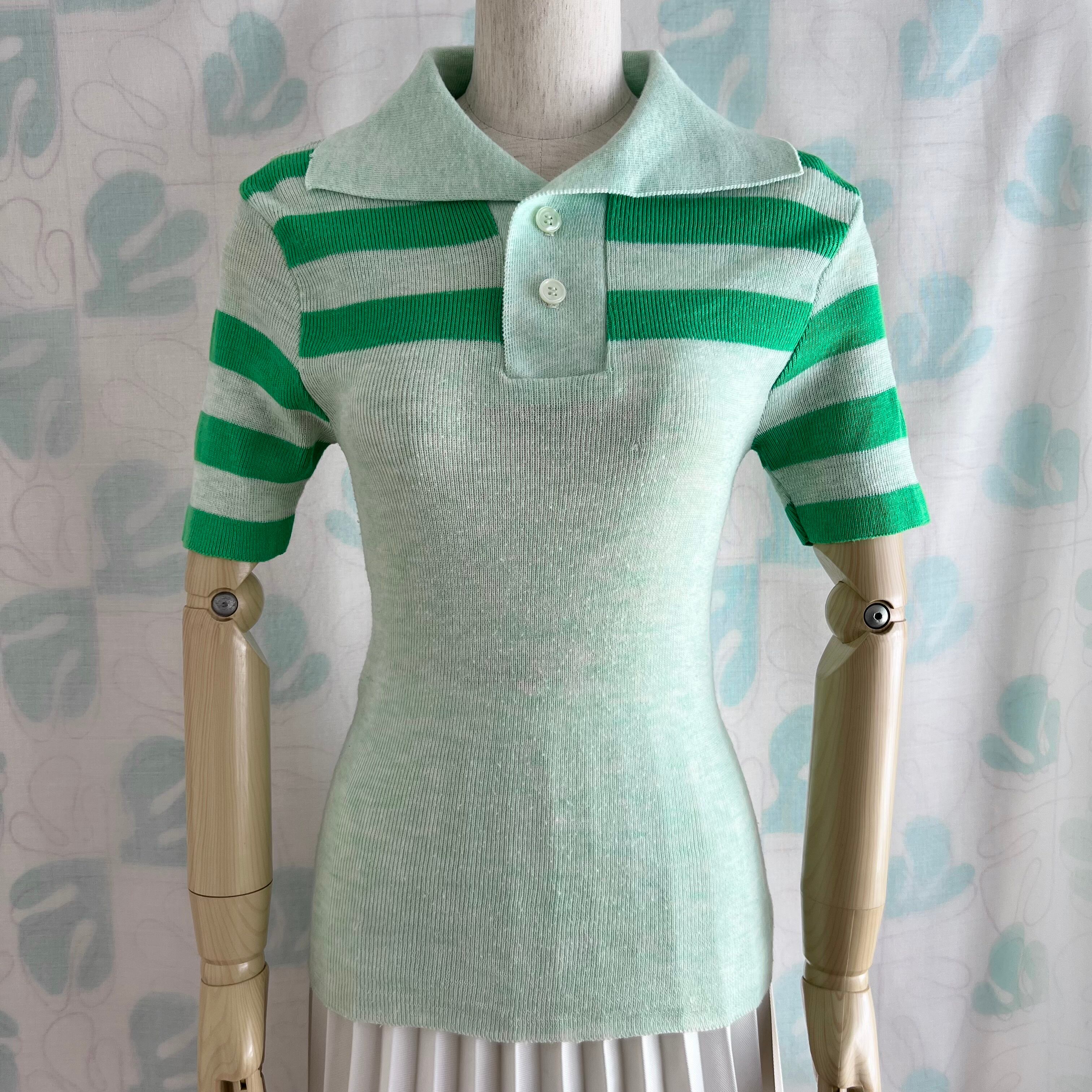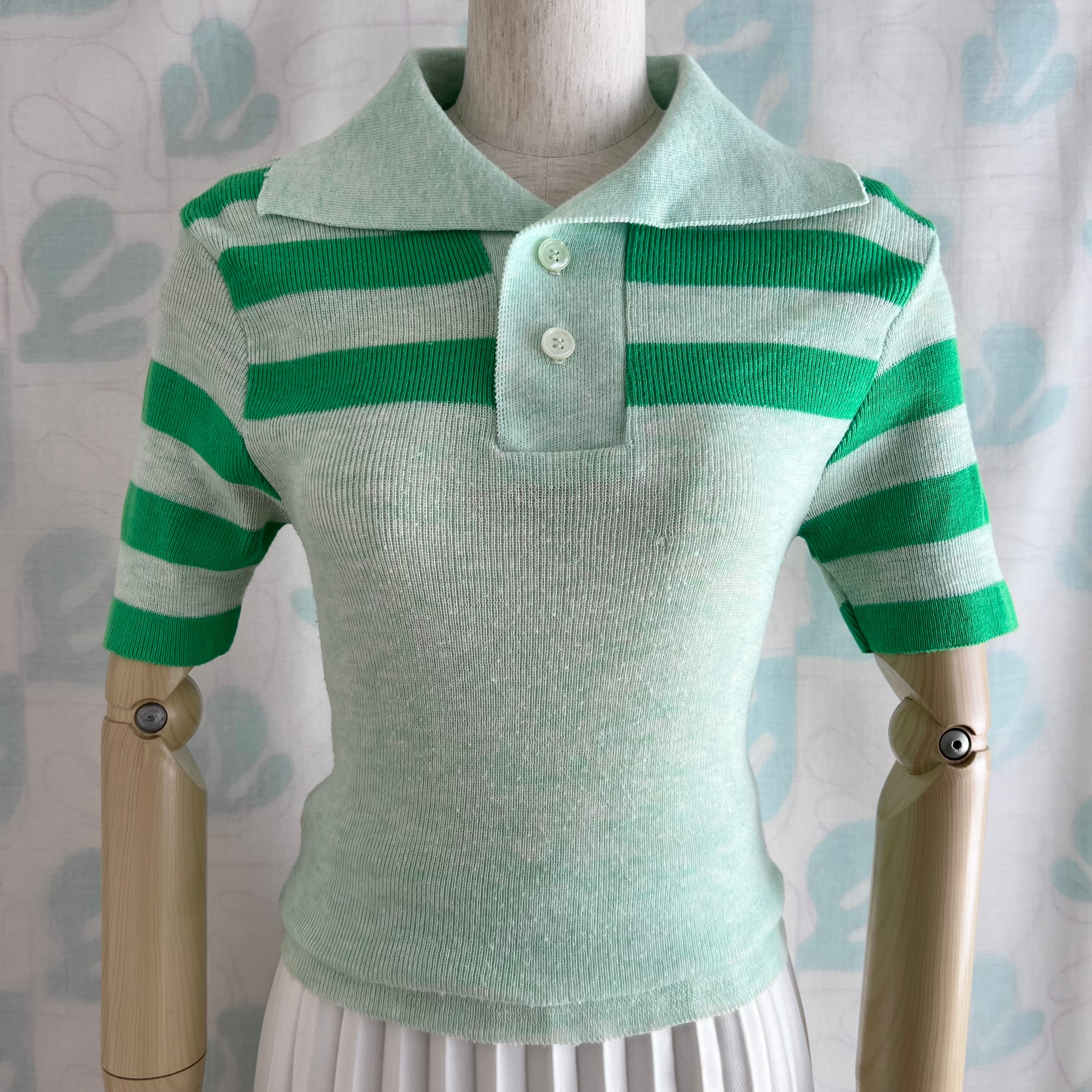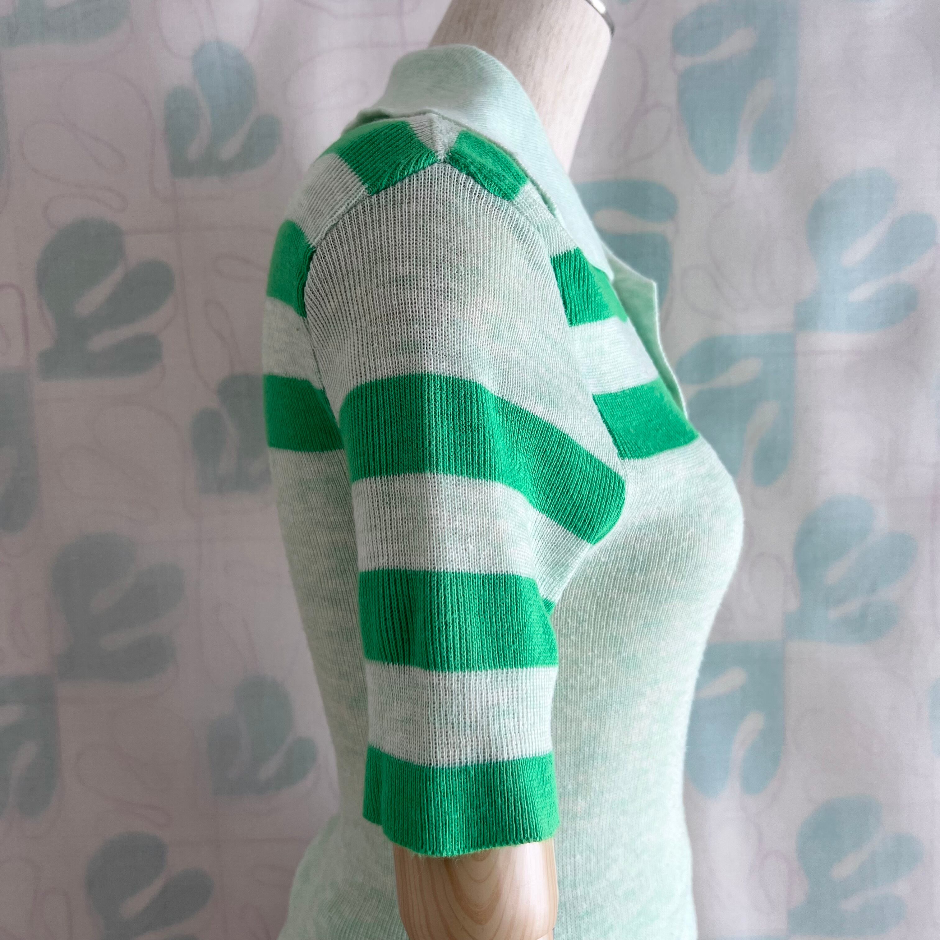 大きな襟とボーダー使いのバランスもキュート。伸縮性のあるリブ編み。少し大きめのシェル調ボタン。