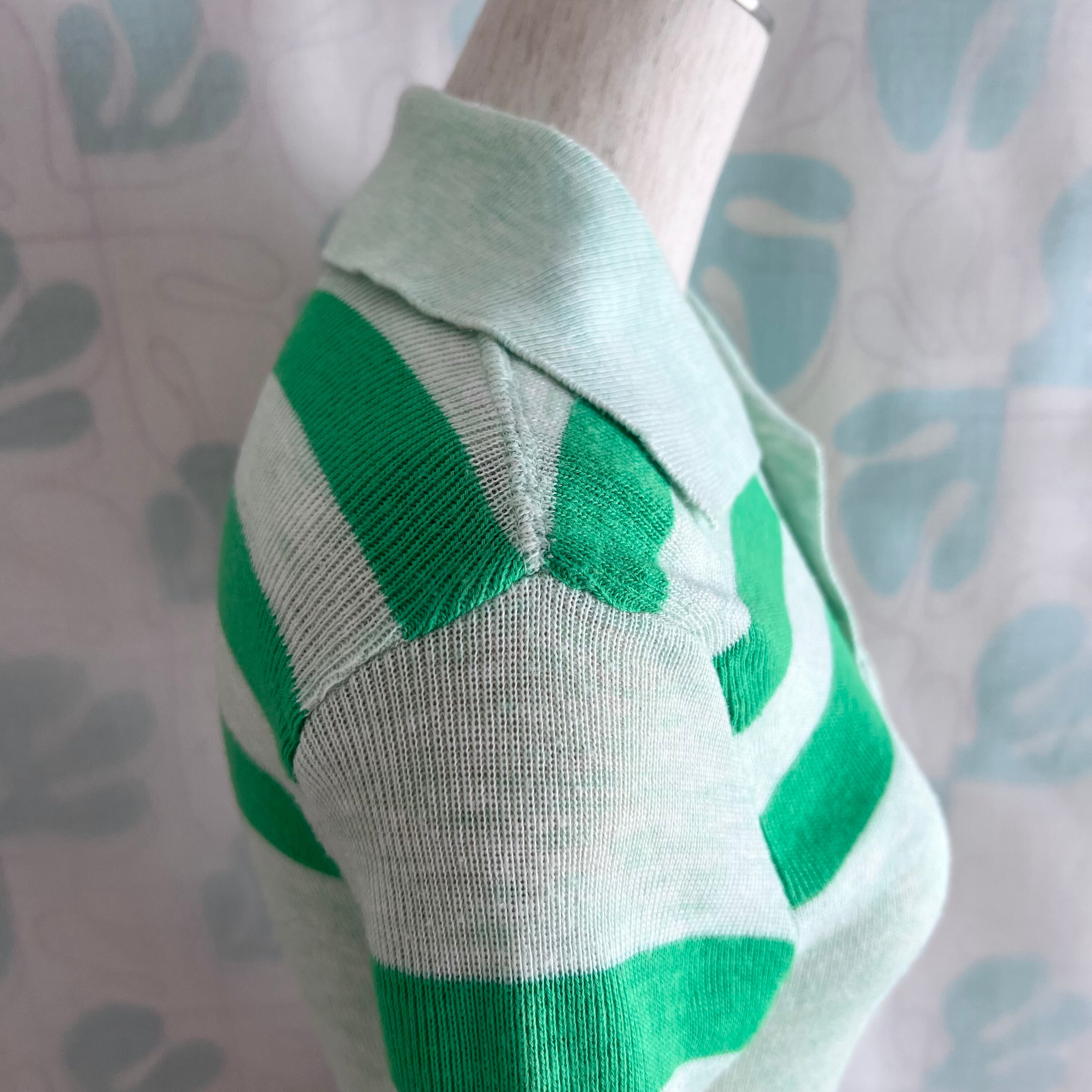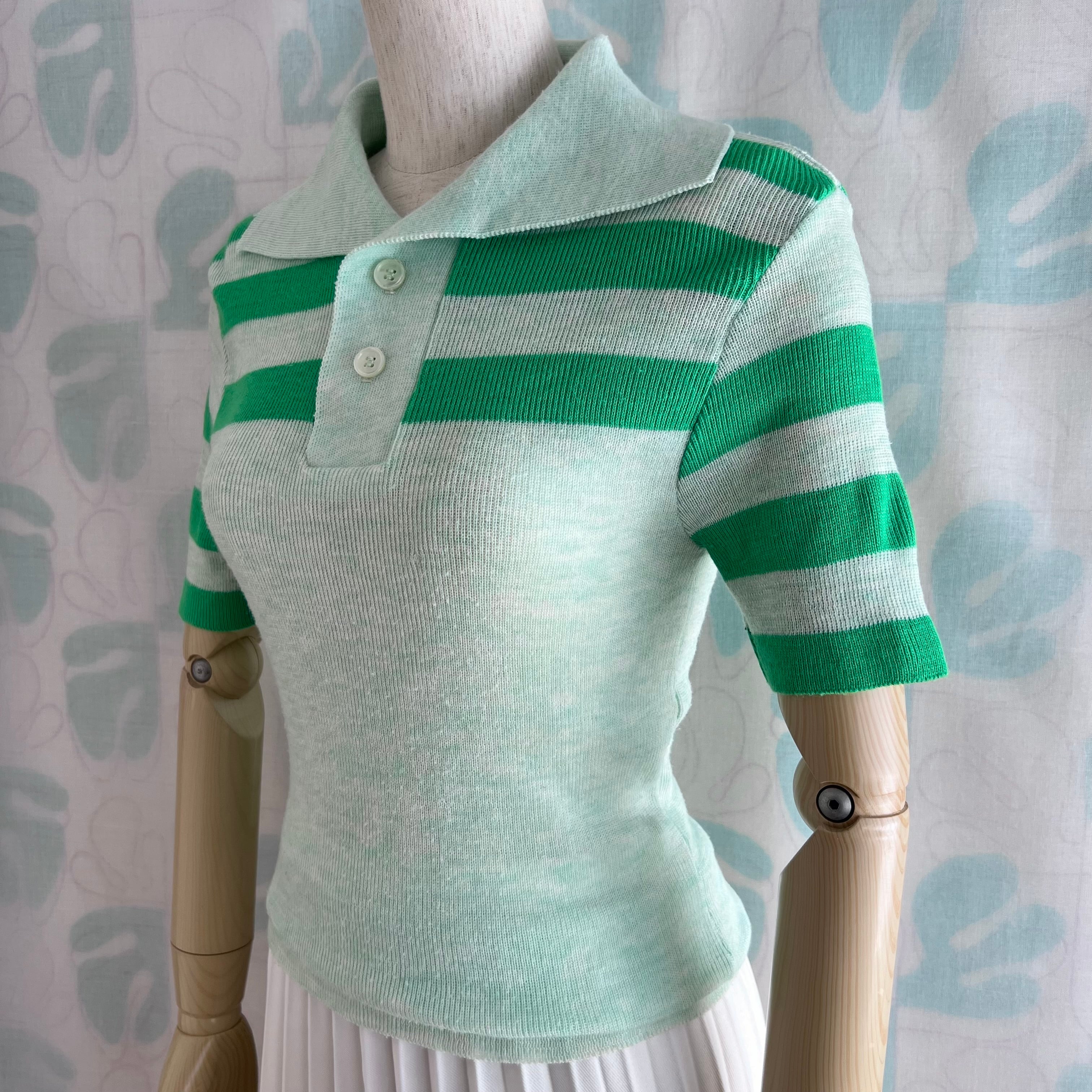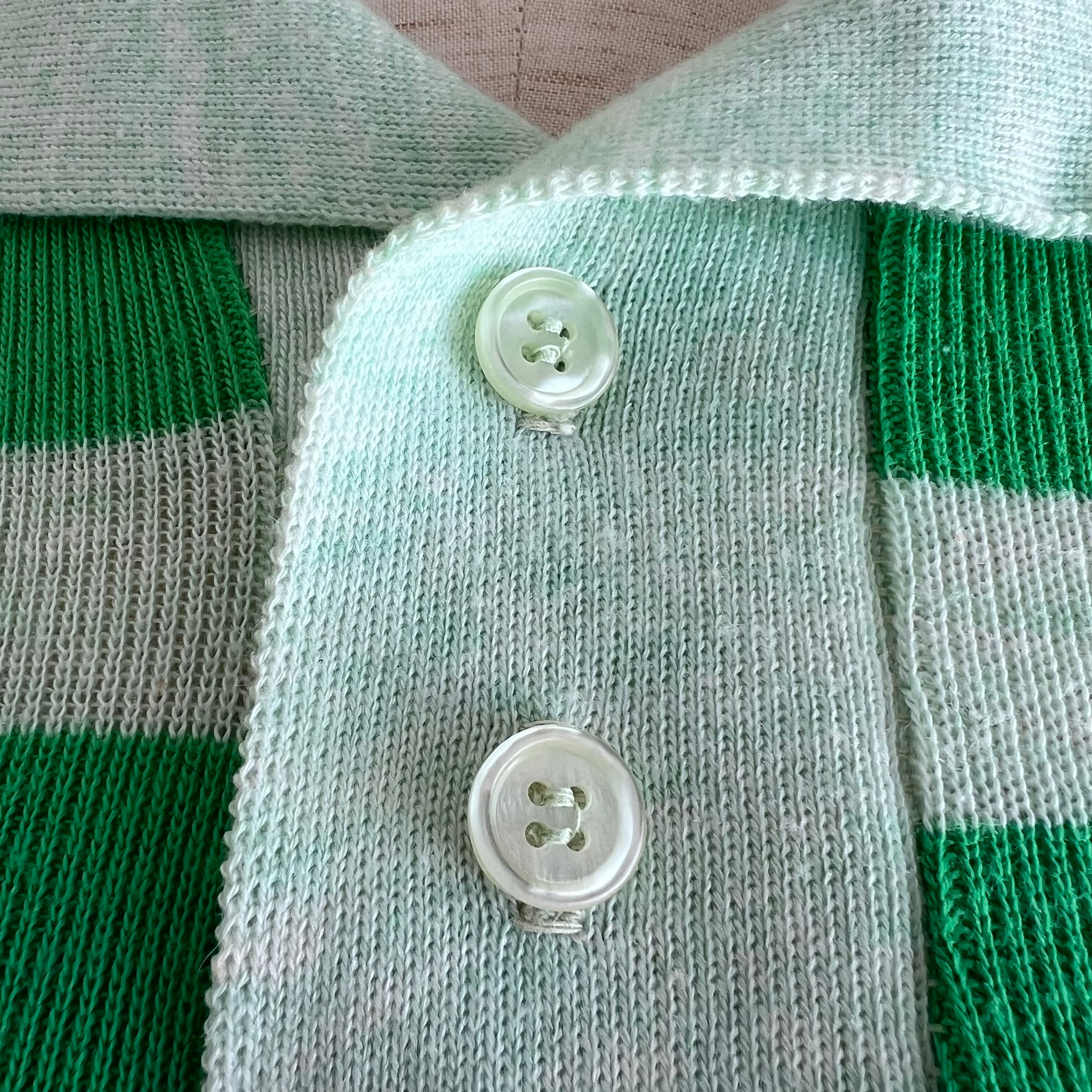 大きな襟とボーダー使いのバランスもキュート。伸縮性のあるリブ編み。少し大きめのシェル調ボタン。