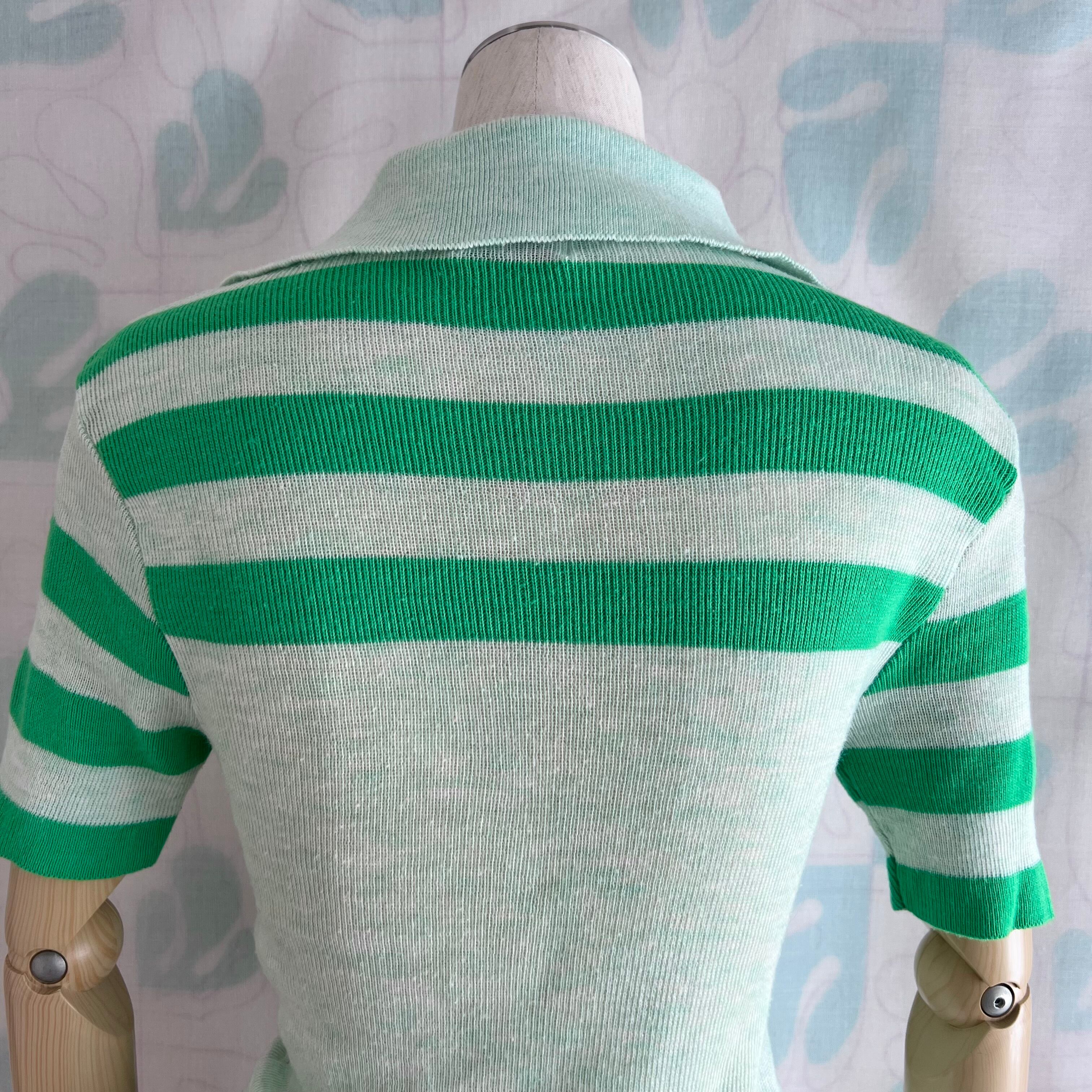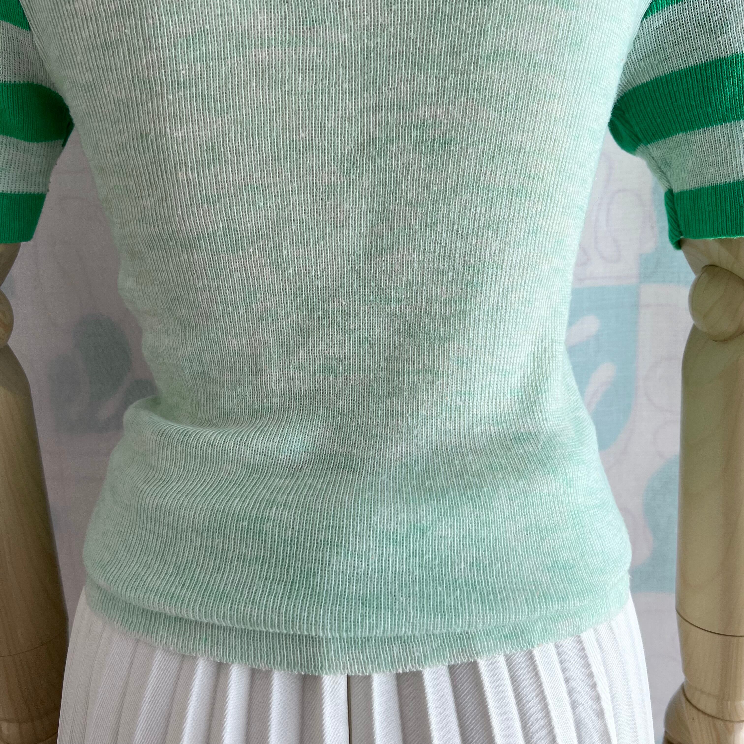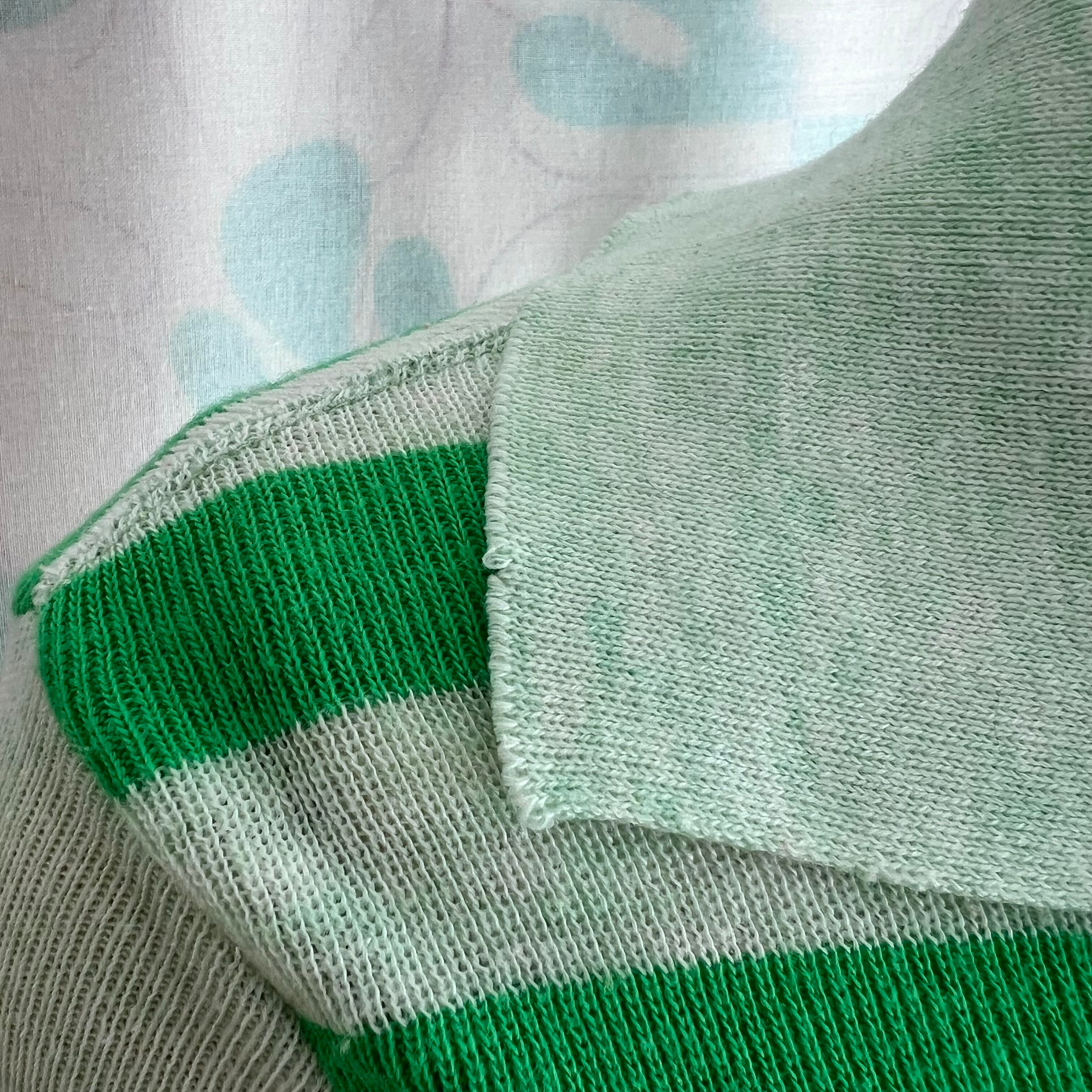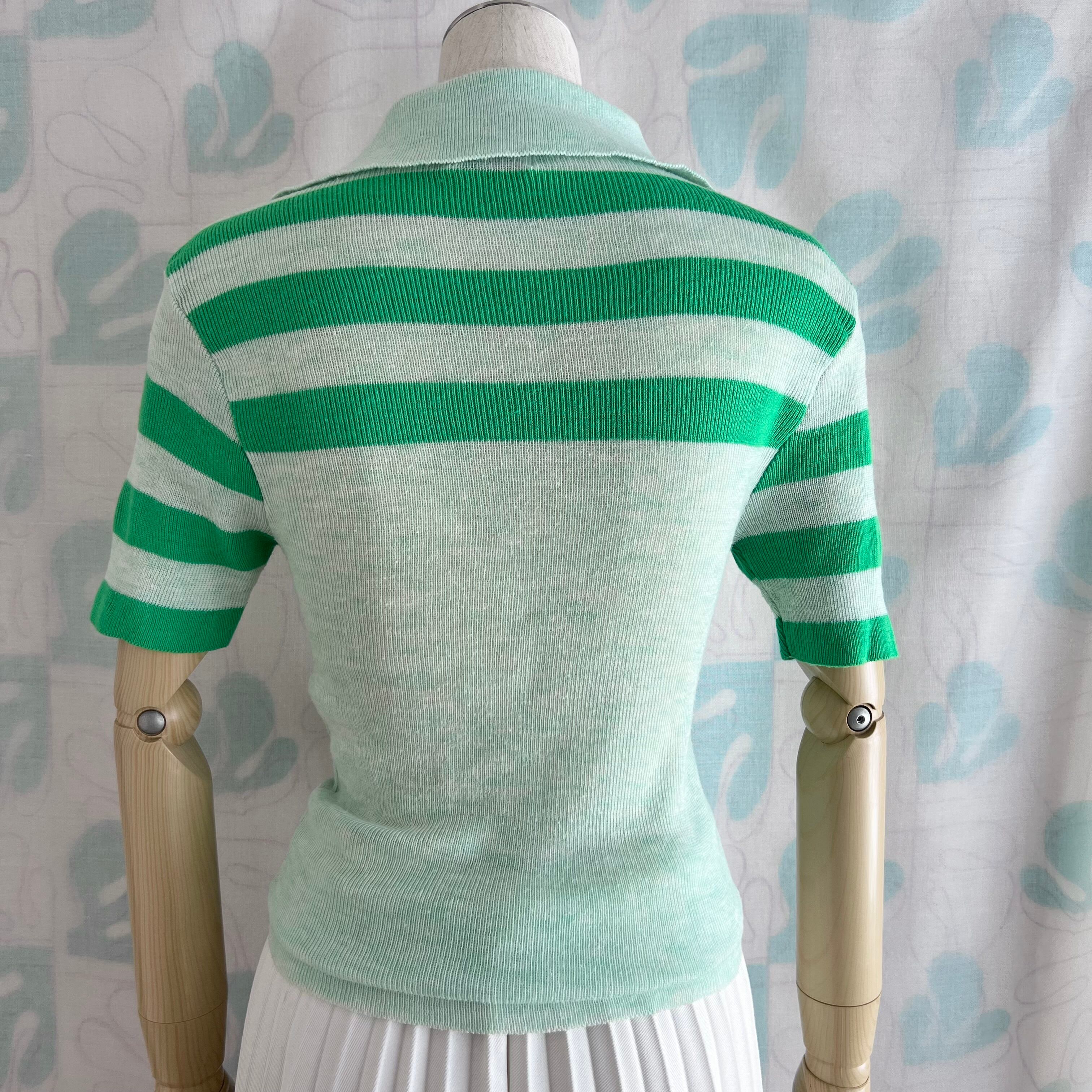 大きな襟とボーダー使いのバランスもキュート。伸縮性のあるリブ編み。少し大きめのシェル調ボタン。
