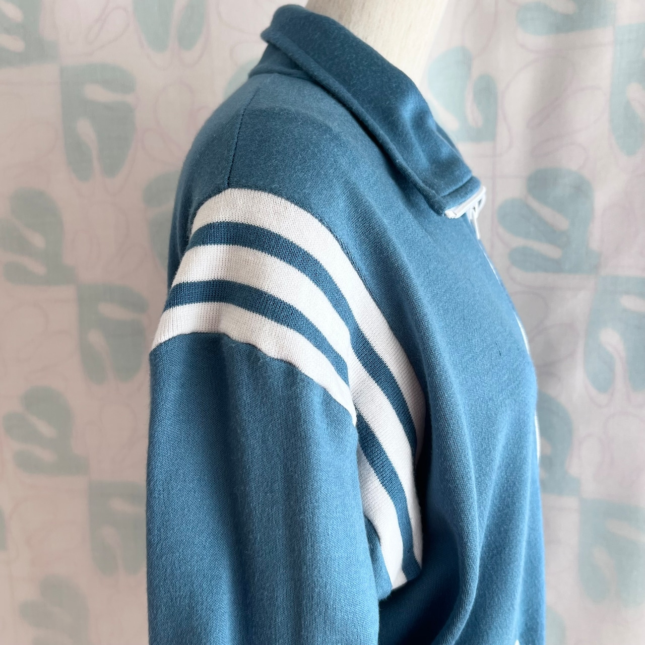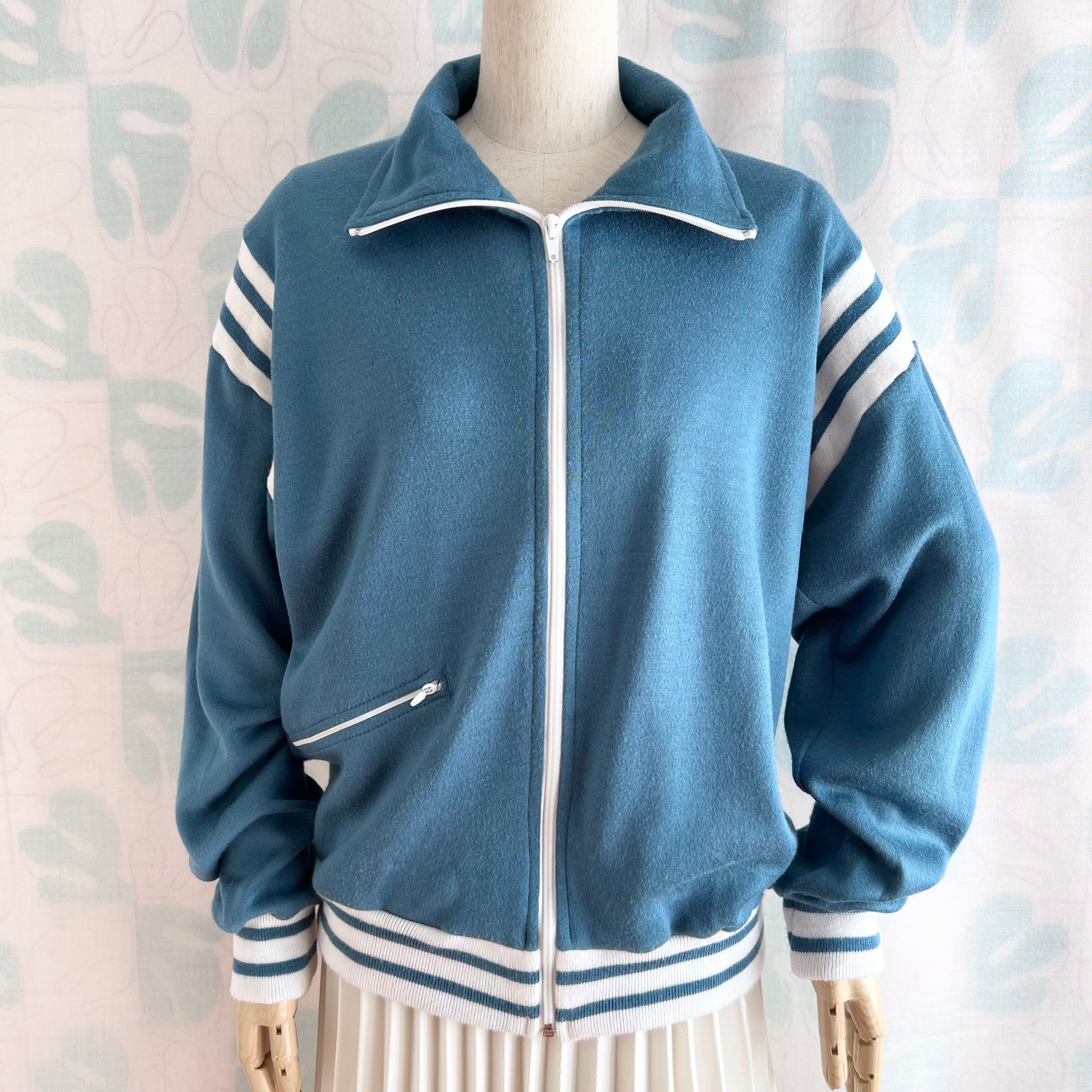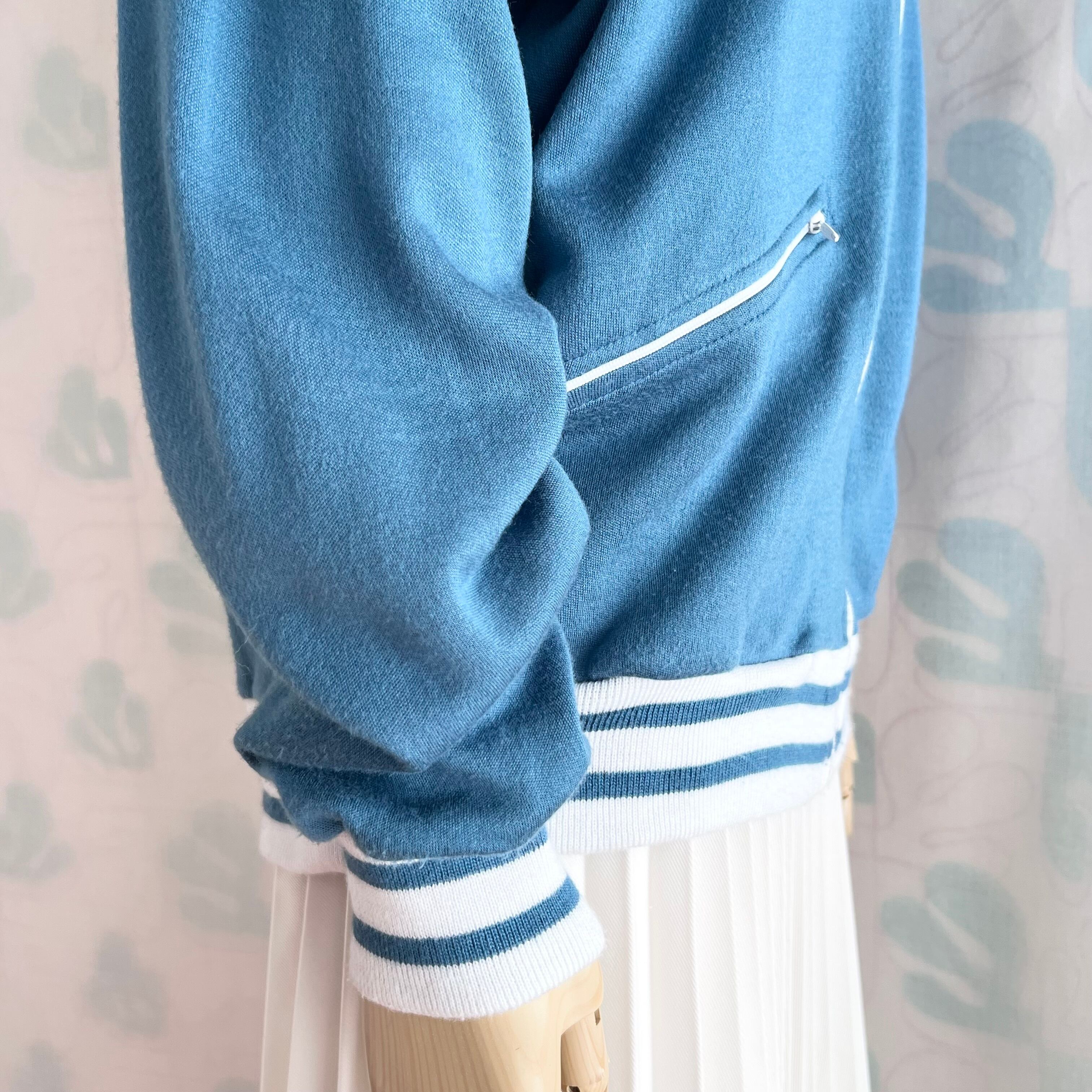 くすんだブルーのボディに、肩と裾のホワイトラインが特徴的なレトロなデザインです。