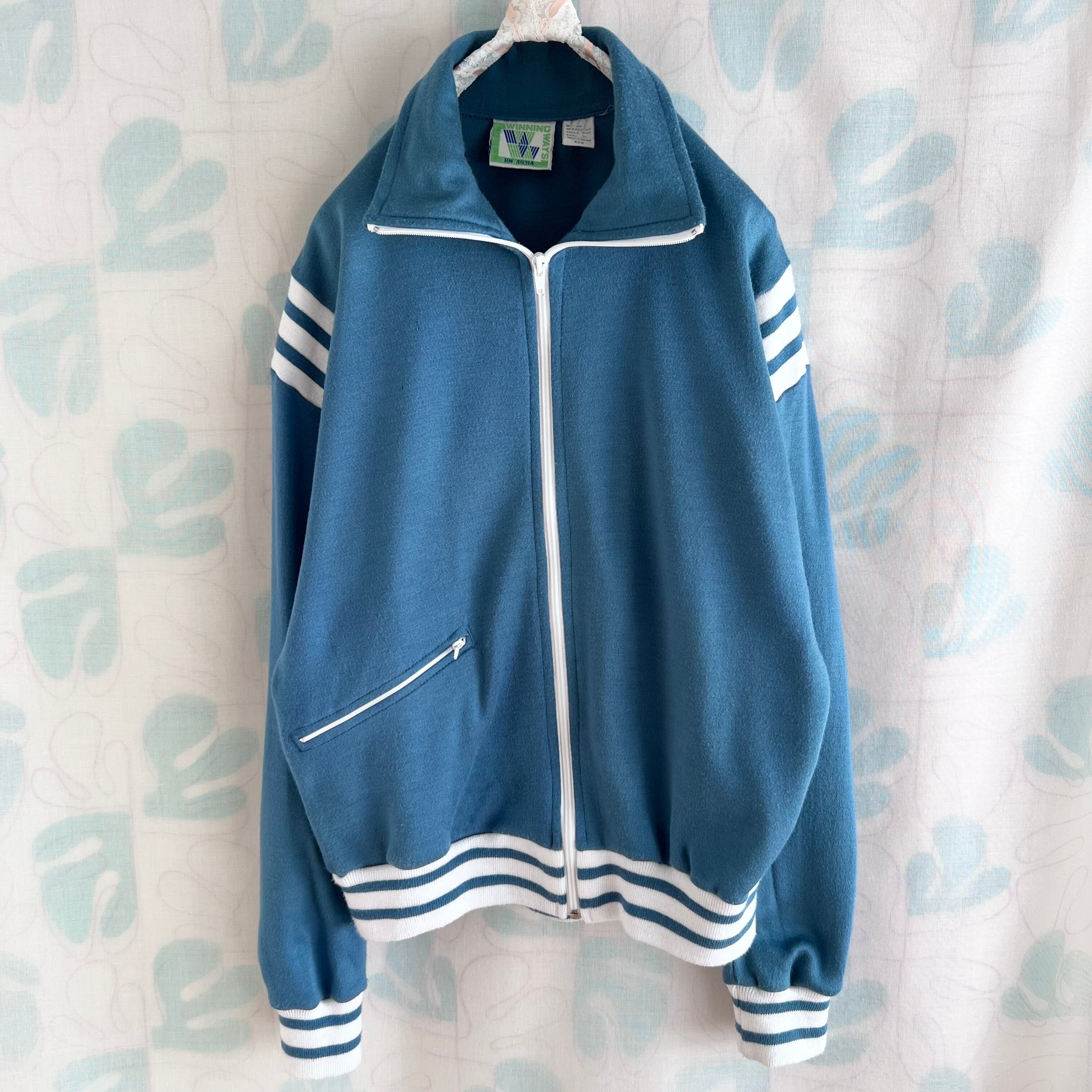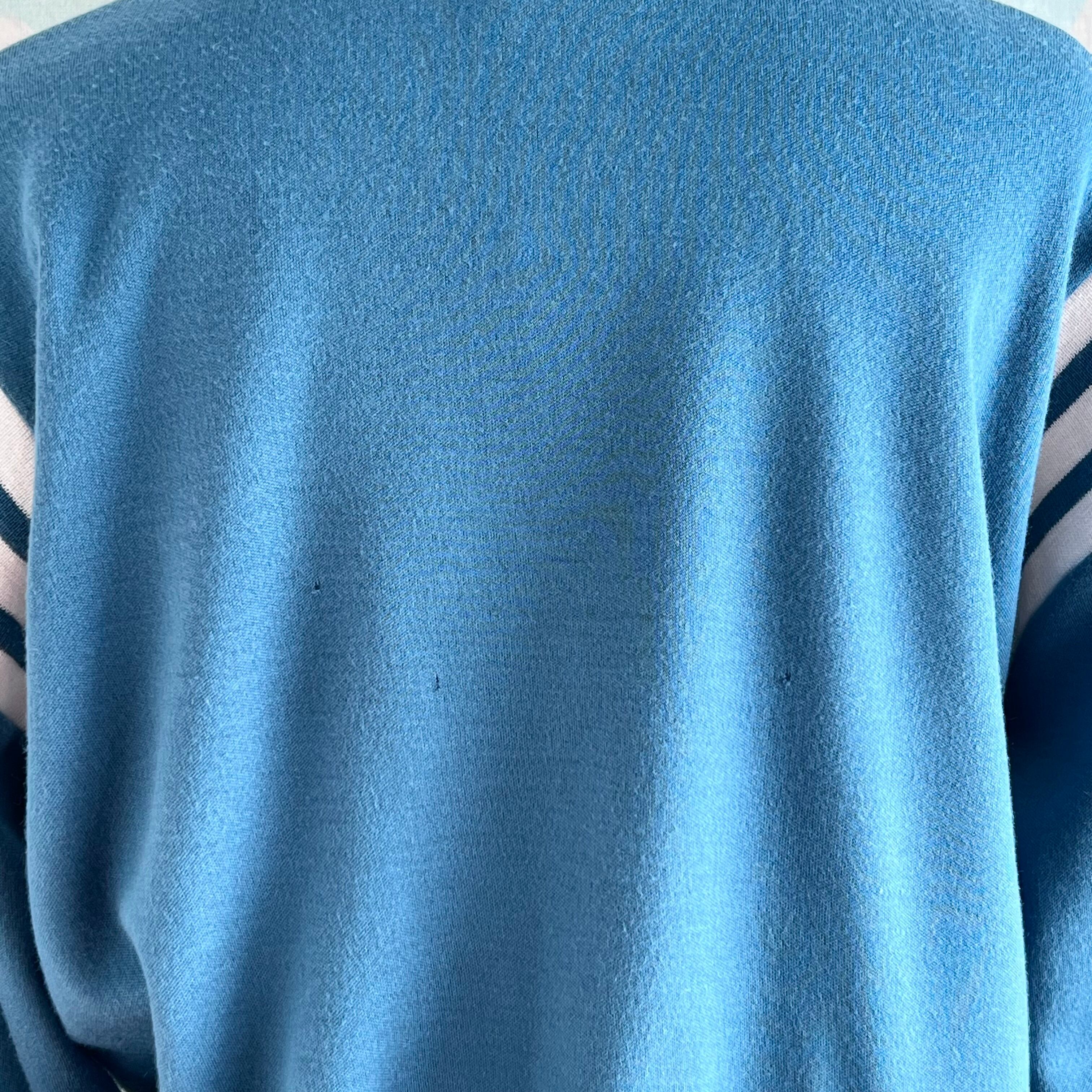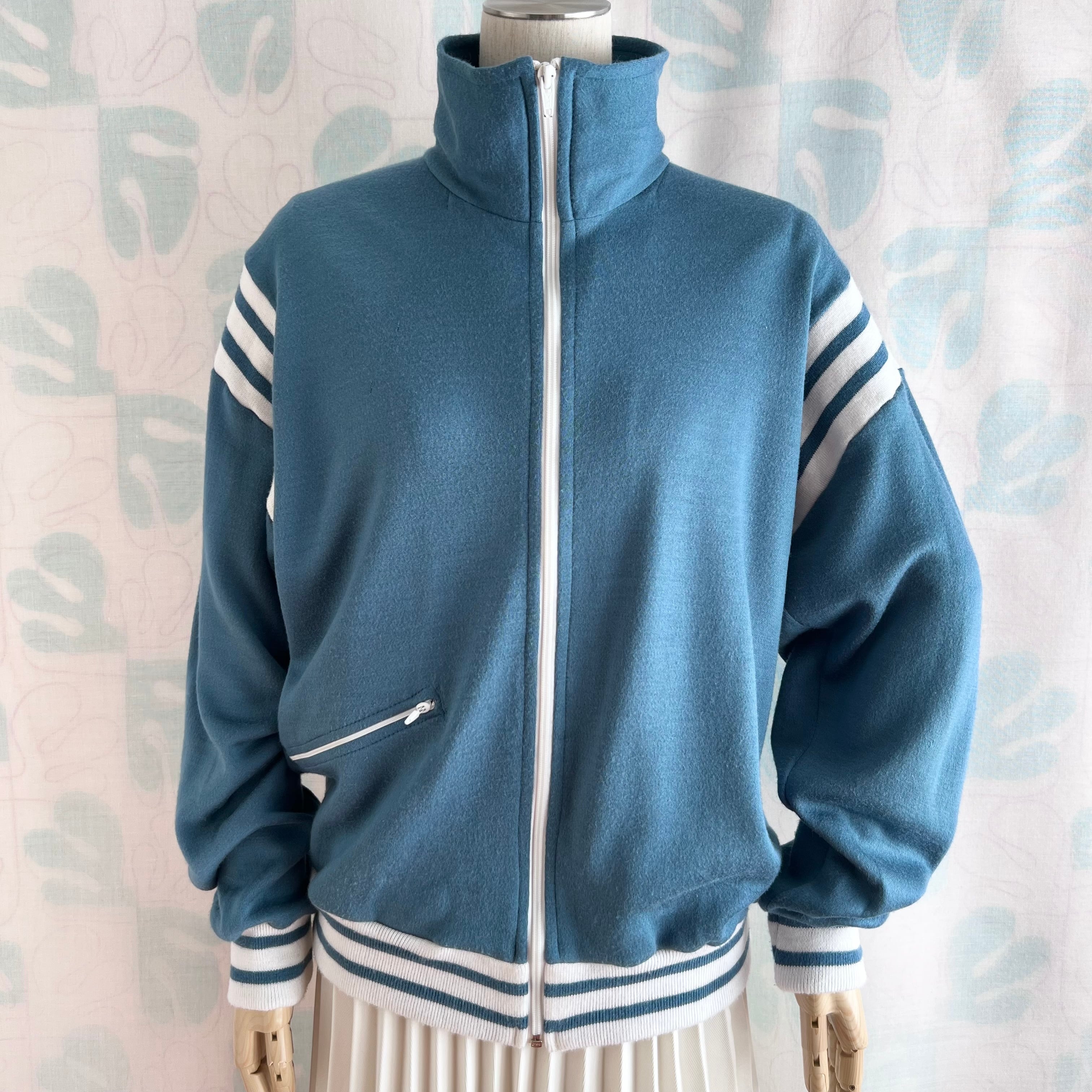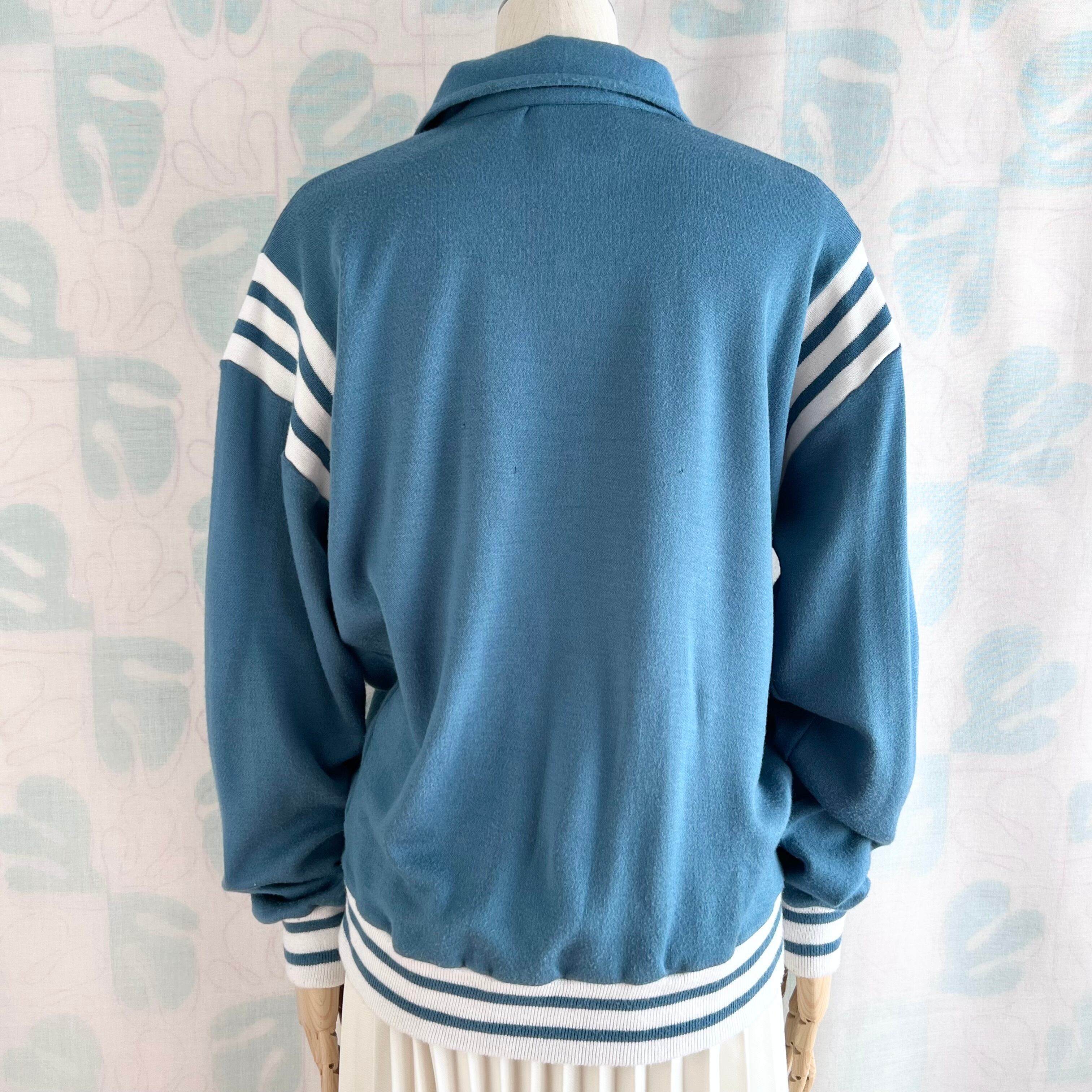 くすんだブルーのボディに、肩と裾のホワイトラインが特徴的なレトロなデザインです。