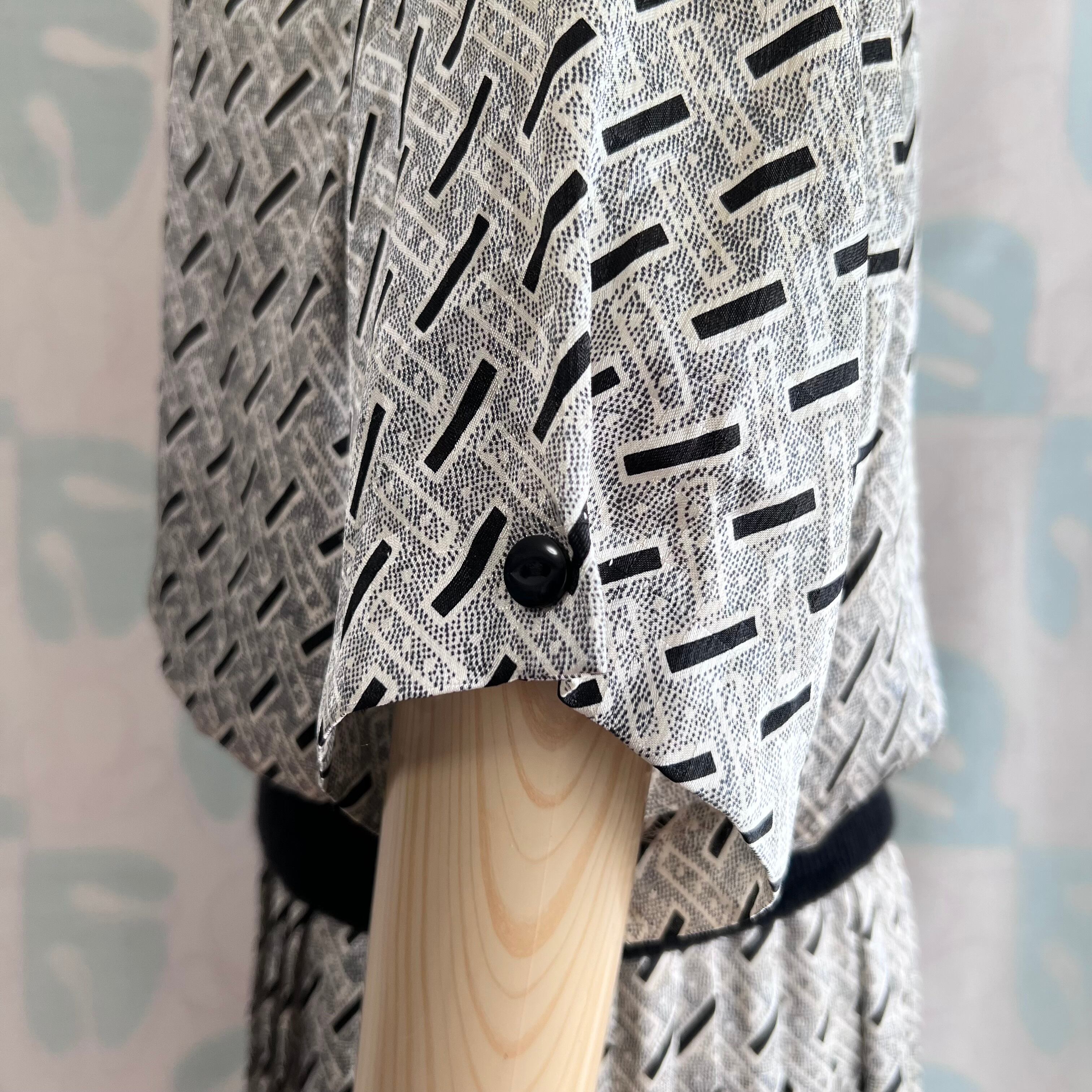 ツルっと柔らかく光沢と表情のある織り地に幾何学柄プリント。