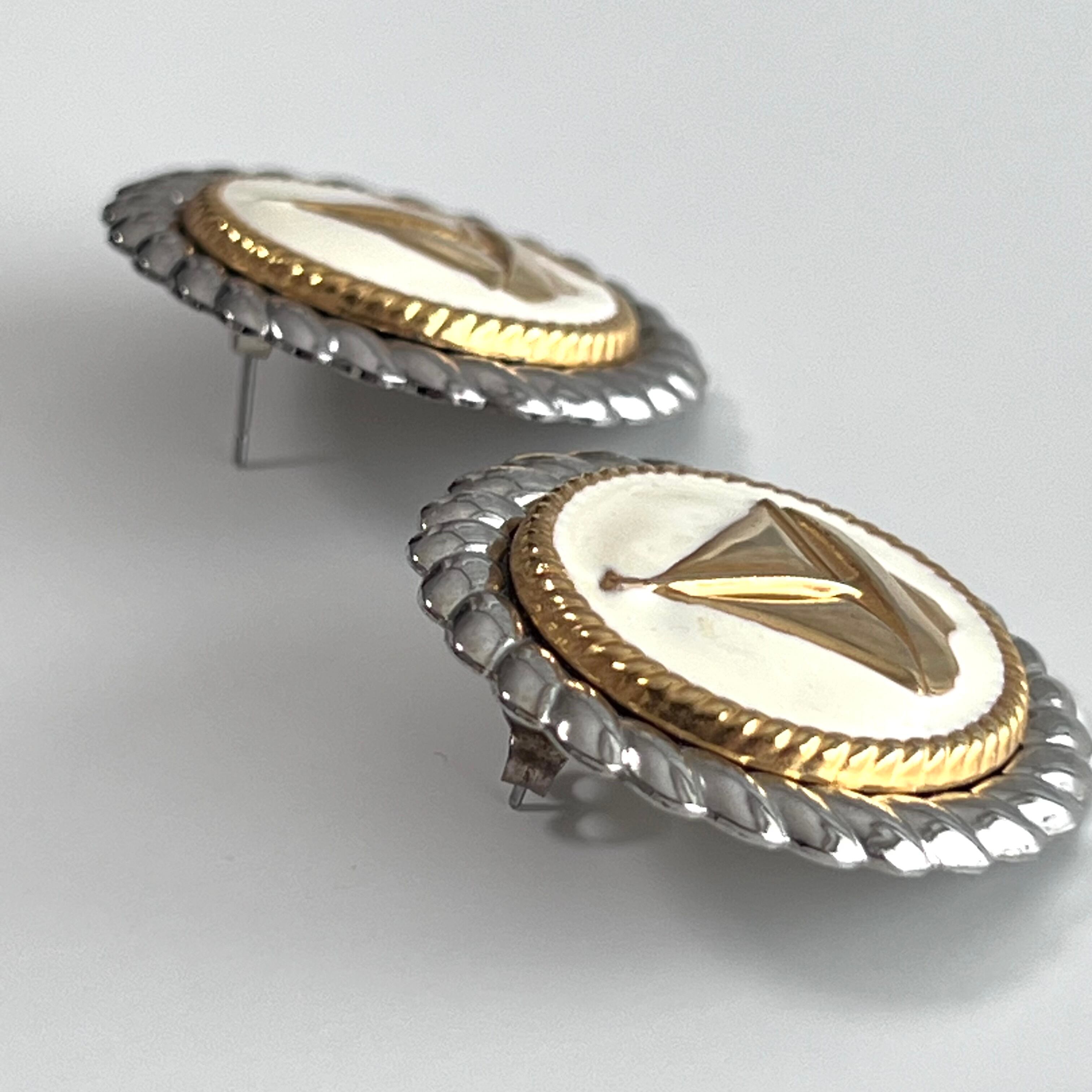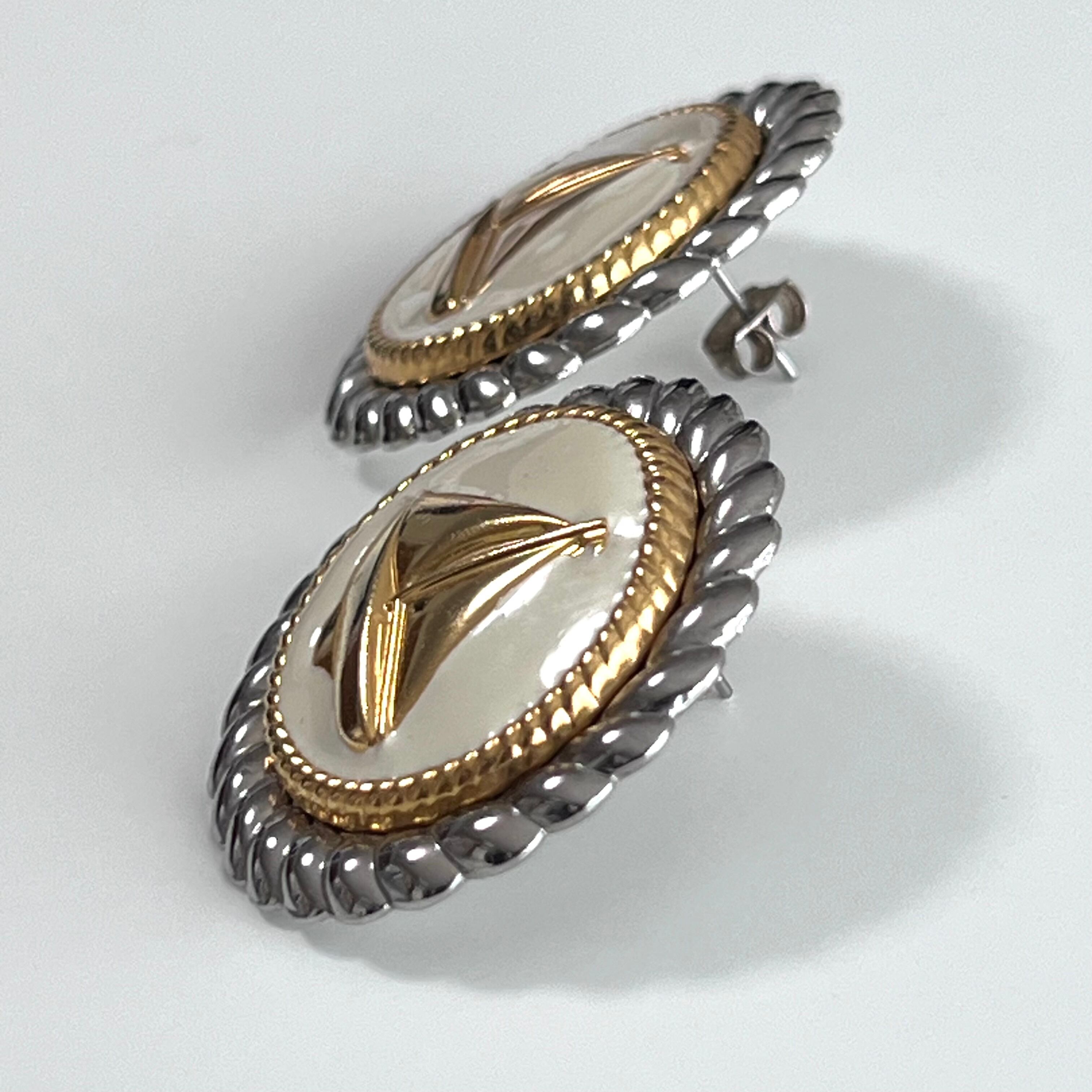 {コンディション}目立つものではありませんが、片耳ヨットの左に極小の凹み、ゴールドヨットの帆に極小のペイントロス(黒い汚れに見えます)。もう片耳、ヨットの下に極小の凹み、帆の周りエナメルのペイントロス(こちらも黒い汚れに見えます)があります。裏側ピンの付け根に接着剤跡があります。