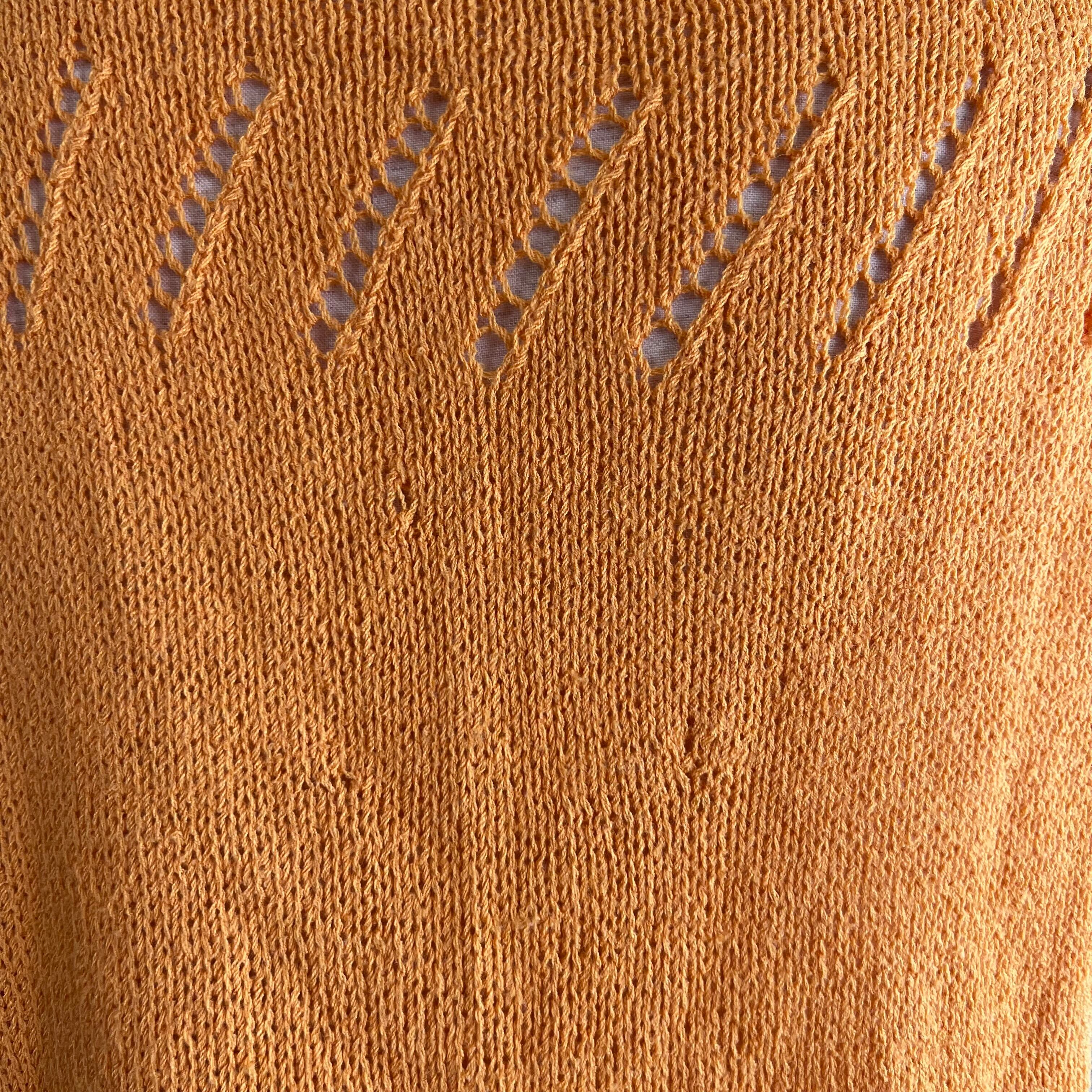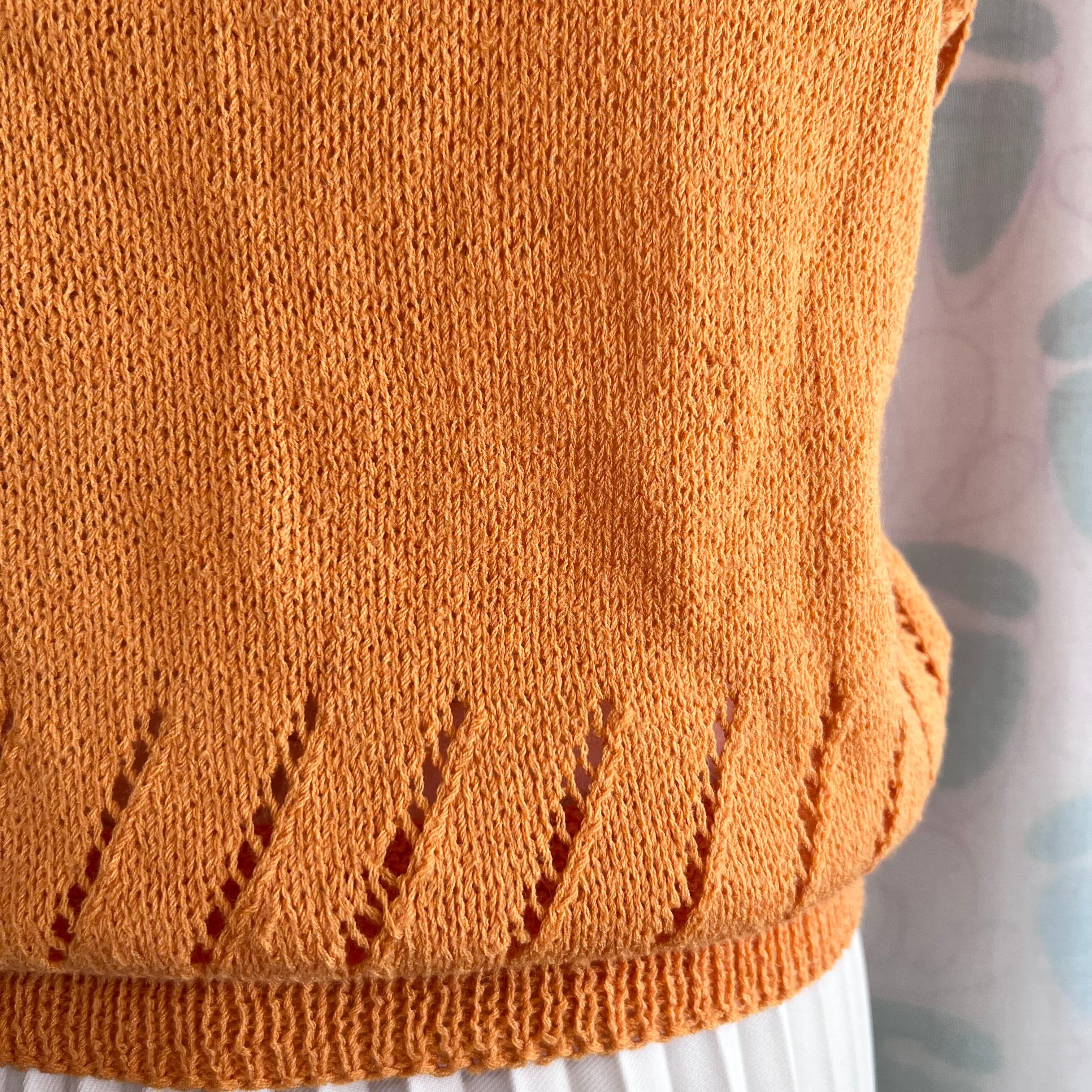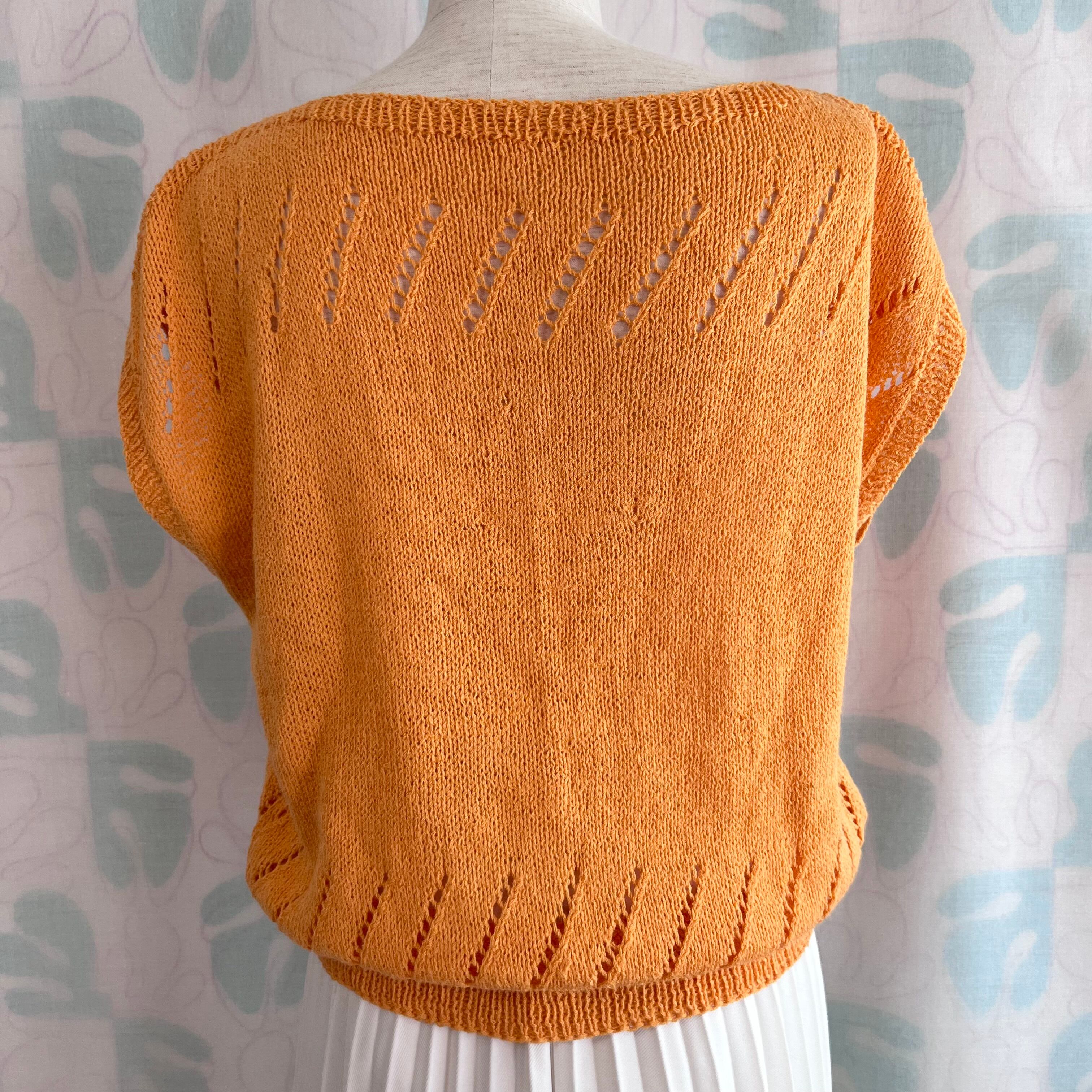 透かし編み模様が入った鮮やかオレンジのサマーニットです。