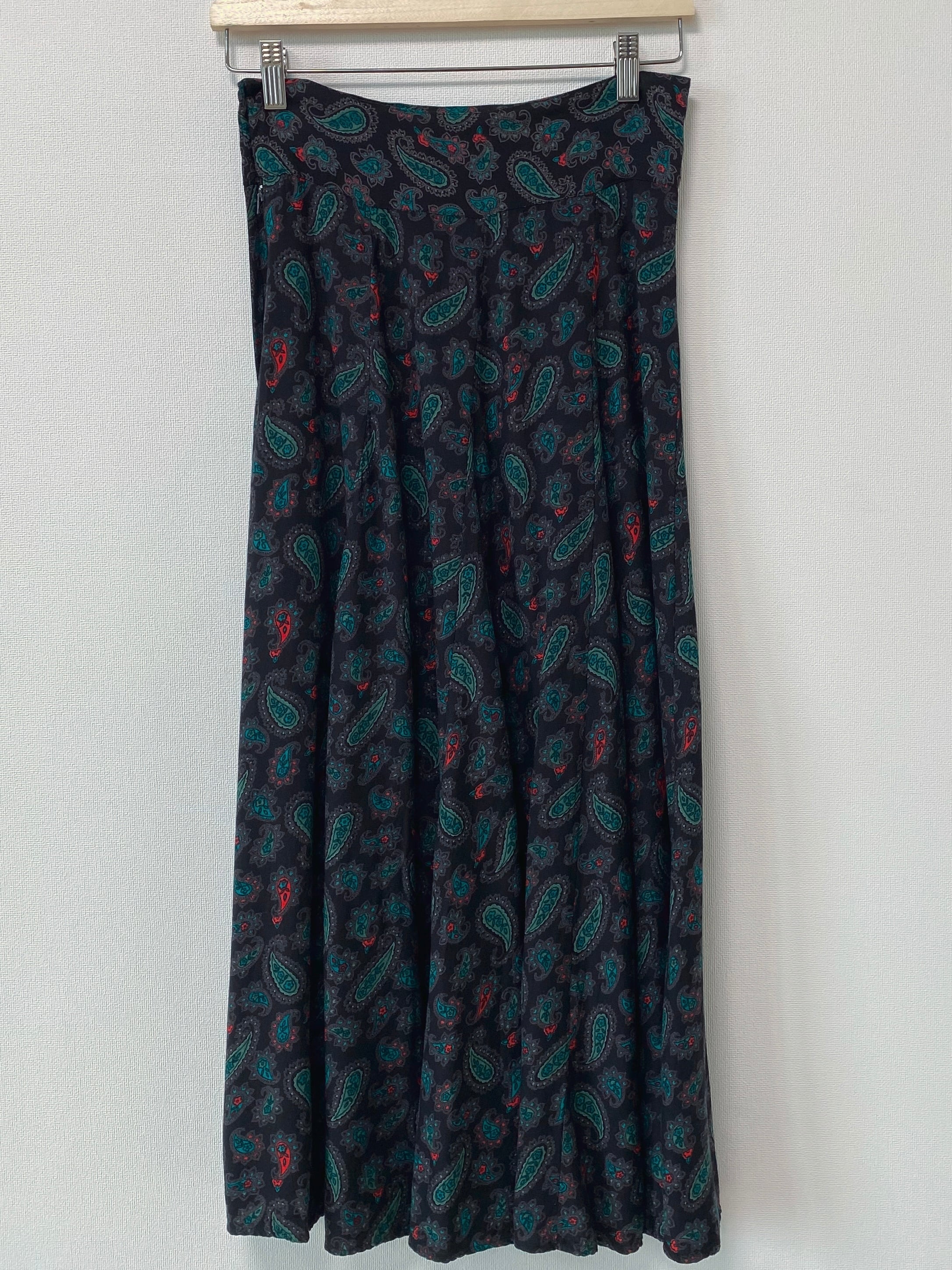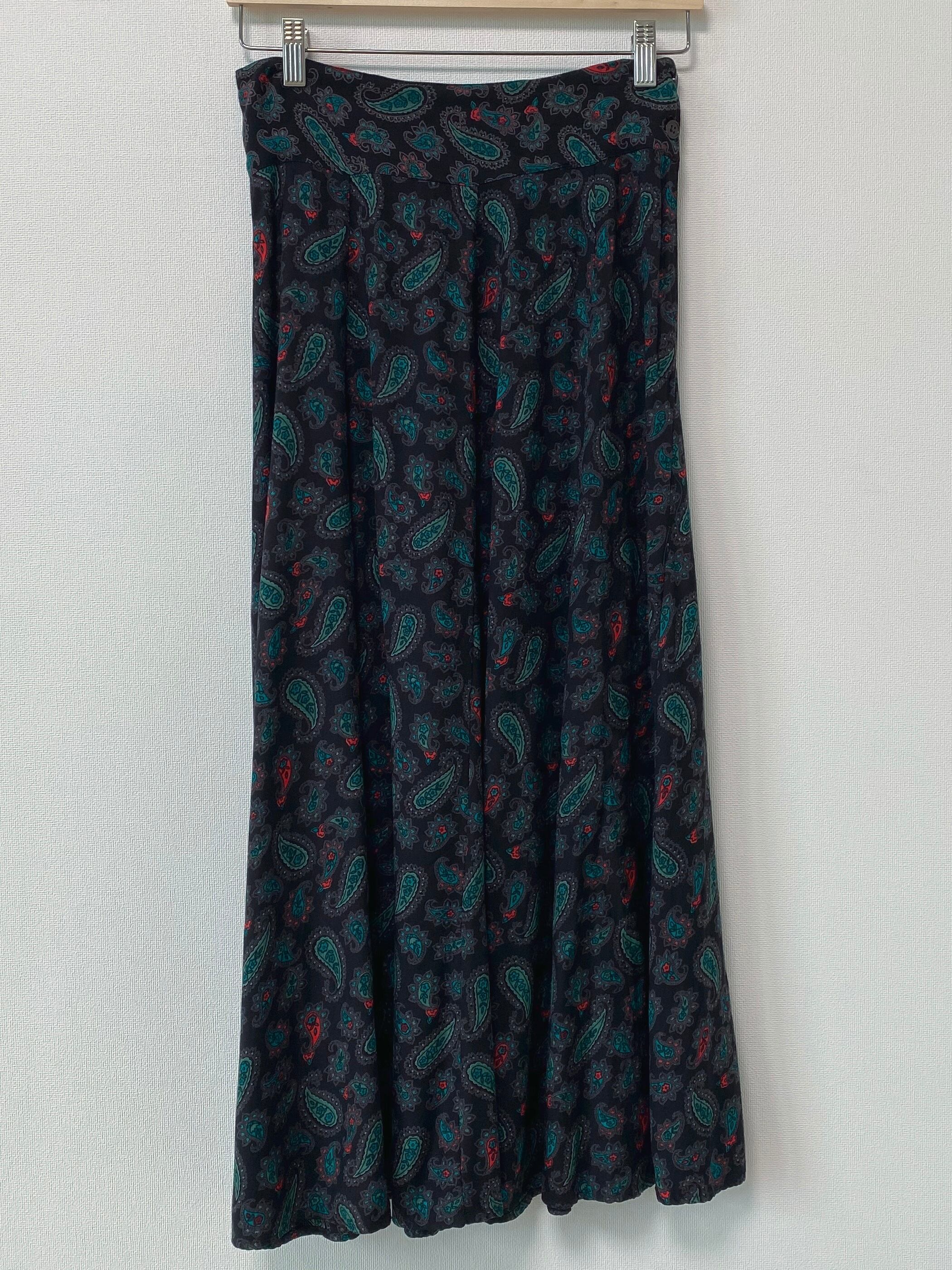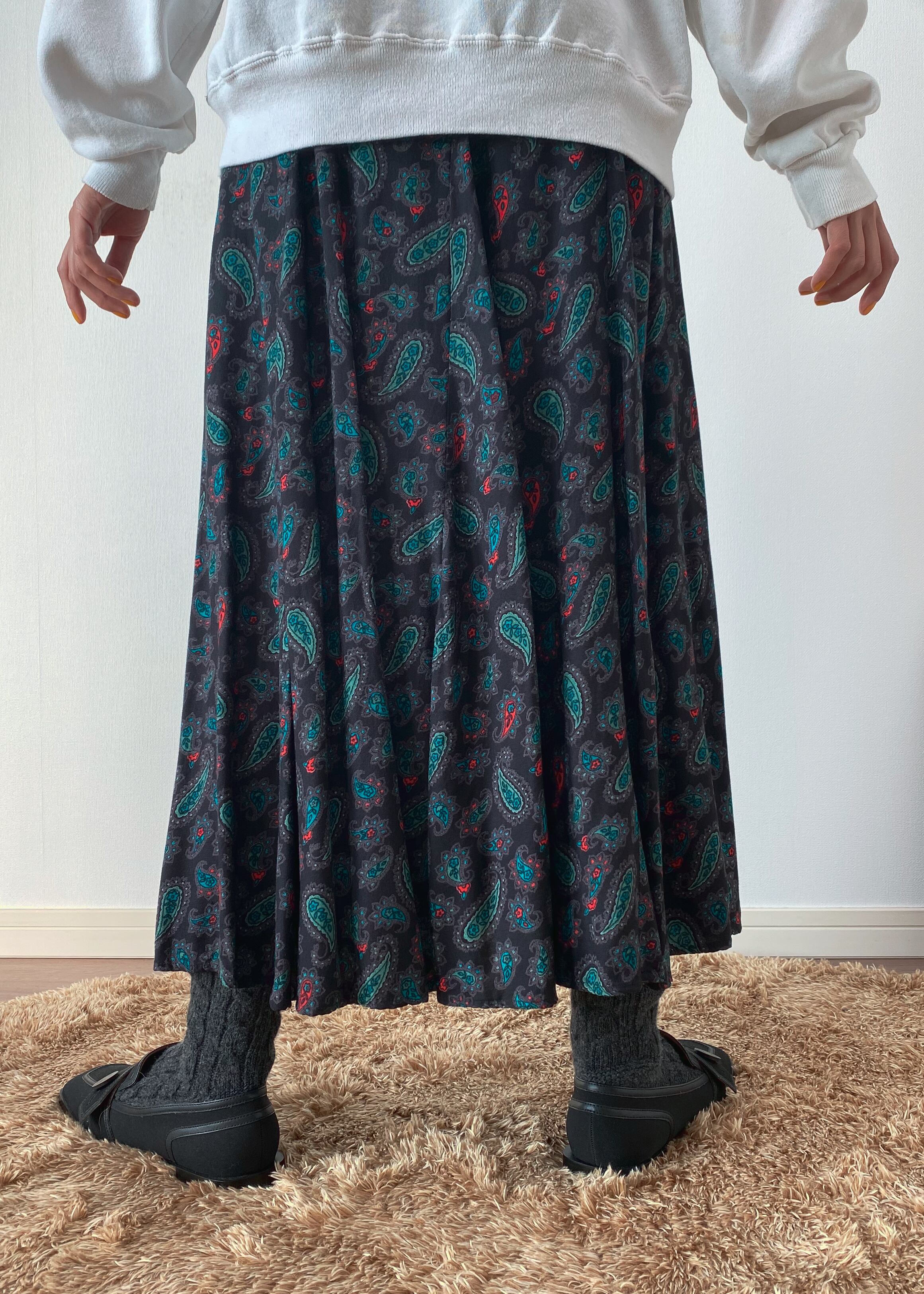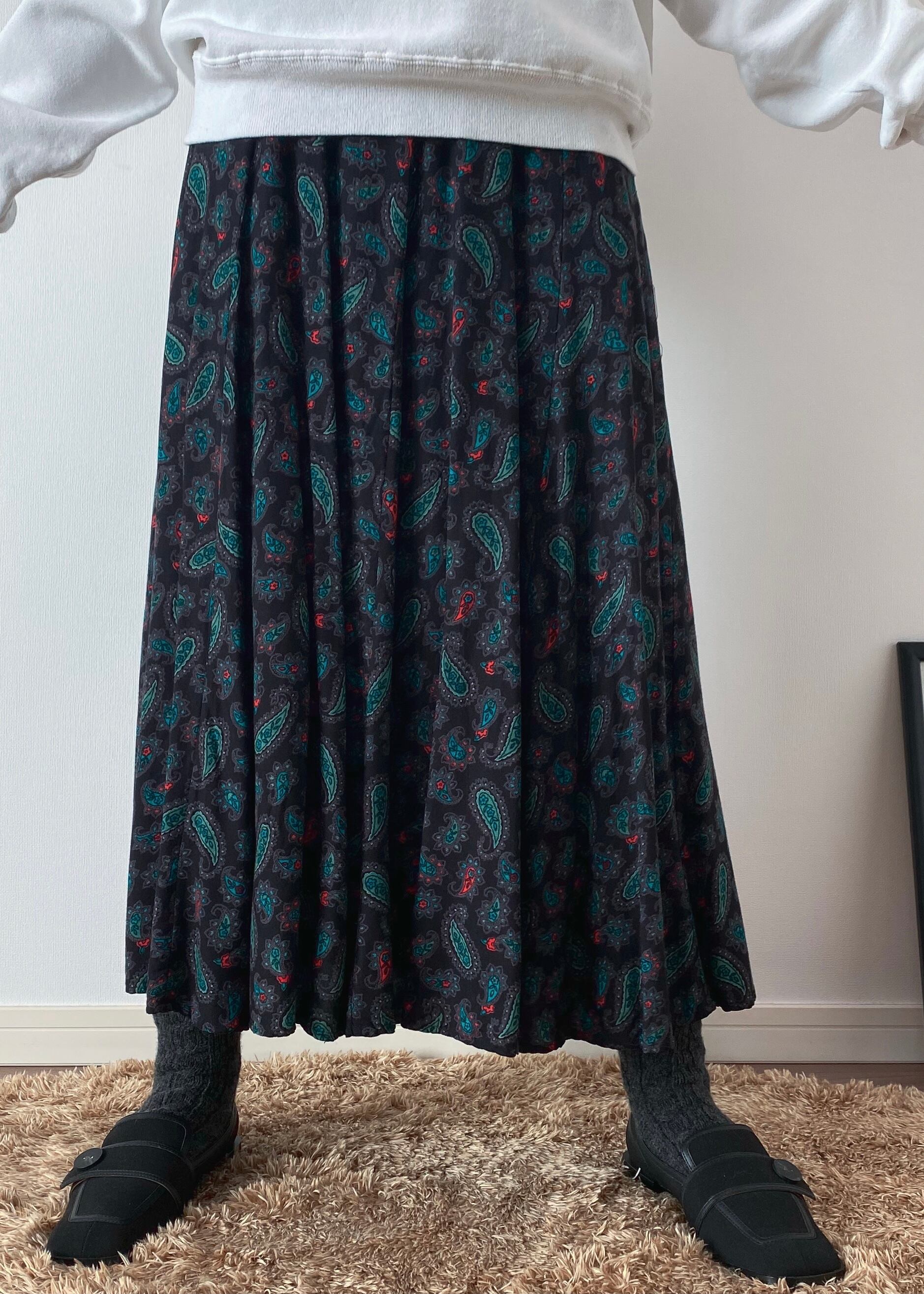黒地にグリーンのペイズリー、散らばった赤色が効いてます。8枚はぎのレーヨン100%なので、落ち感がとても綺麗で、歩くと優雅に揺れます。ボリューム感のあるトップスとの相性が◎。