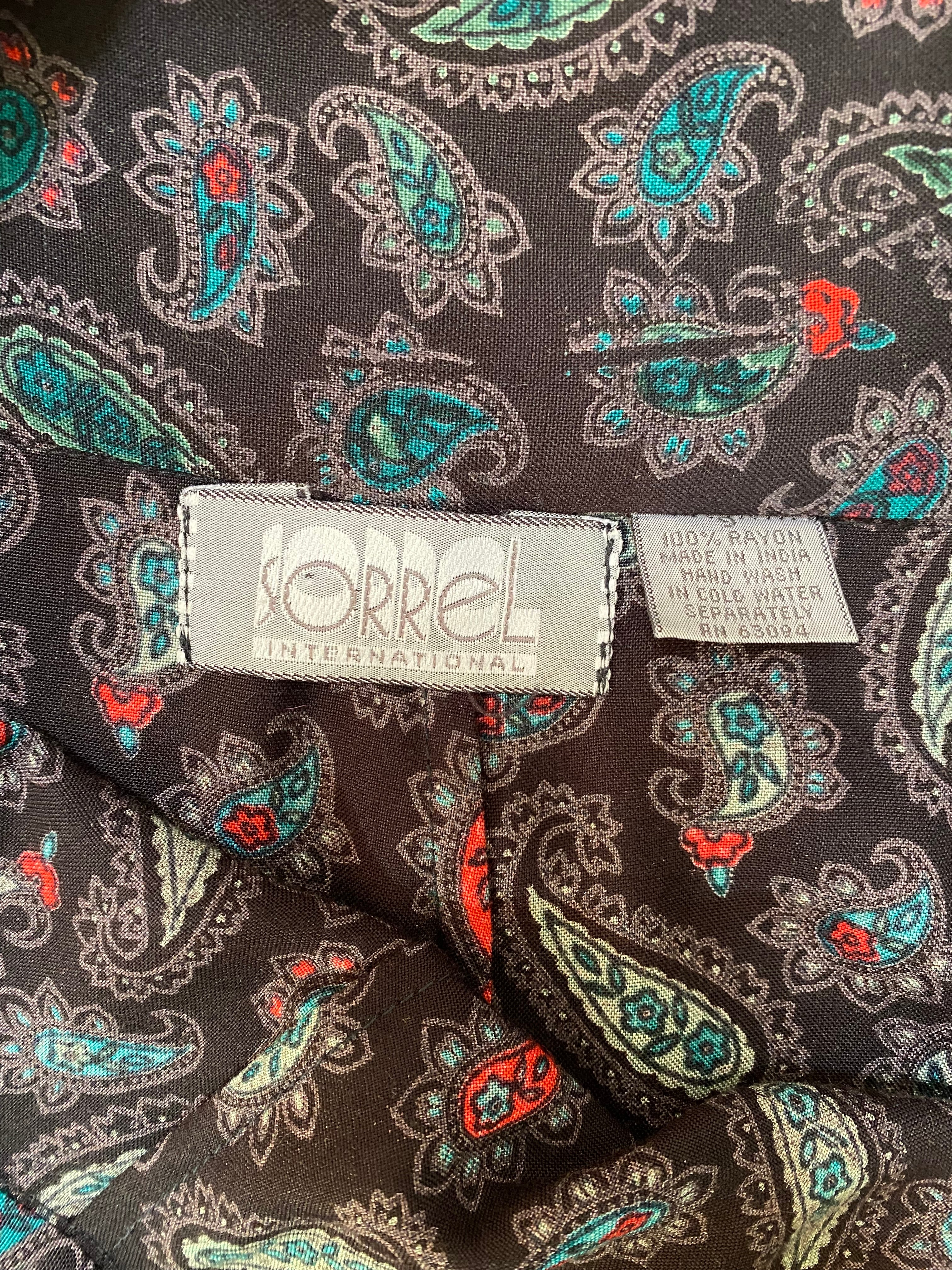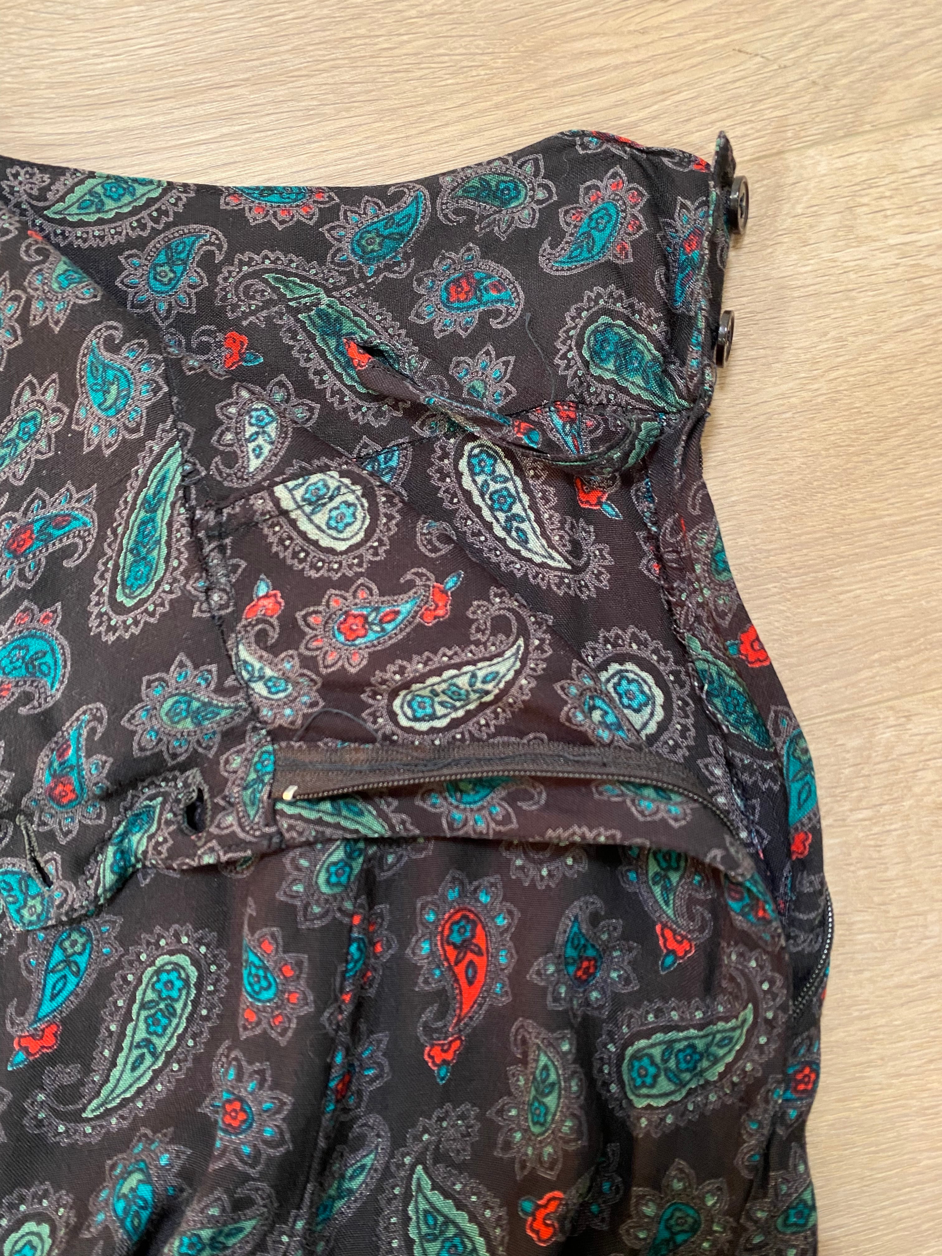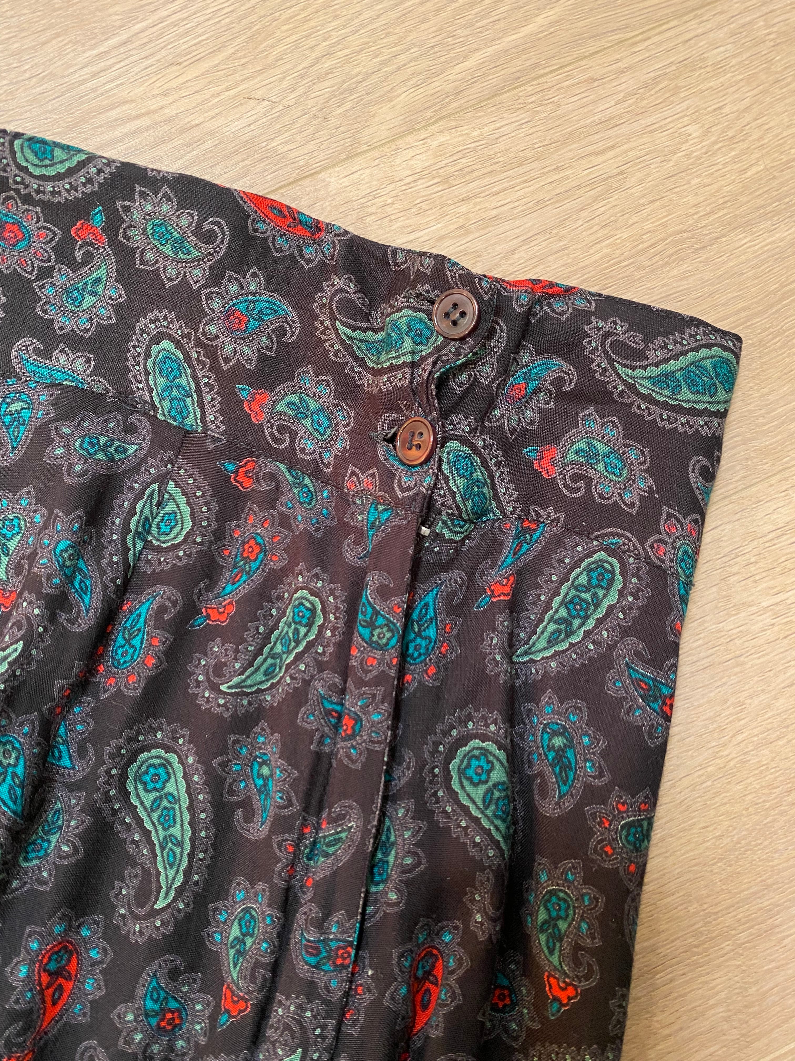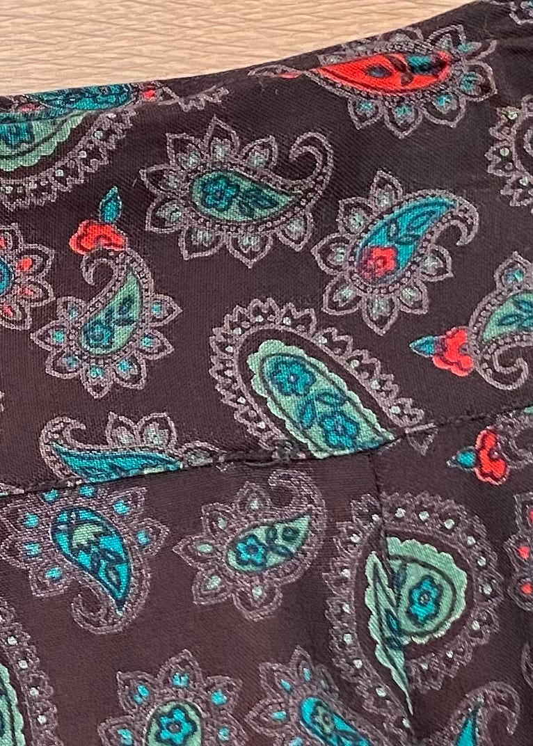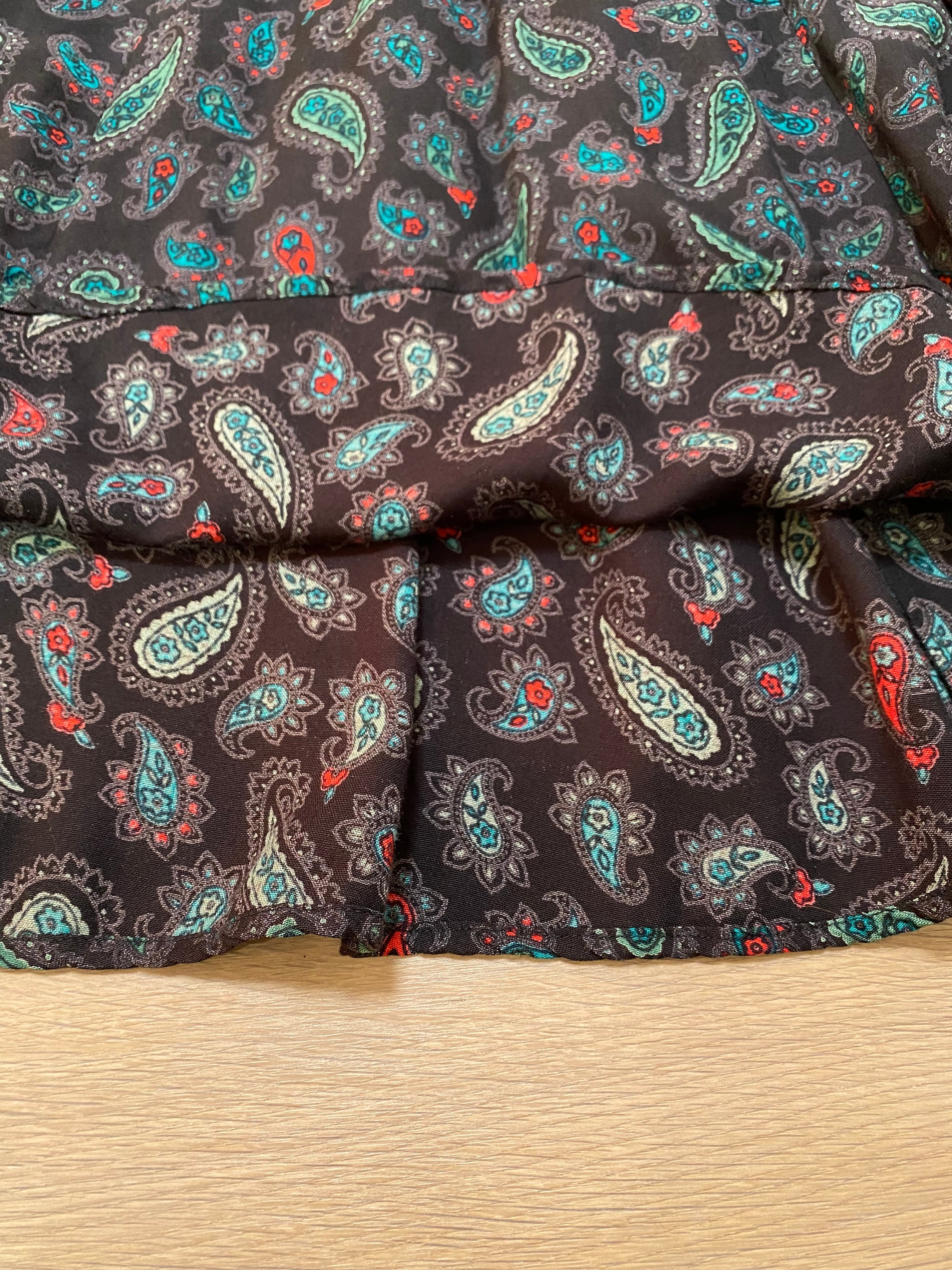 黒地にグリーンのペイズリー、散らばった赤色が効いてます。8枚はぎのレーヨン100%なので、落ち感がとても綺麗で、歩くと優雅に揺れます。ボリューム感のあるトップスとの相性が◎。