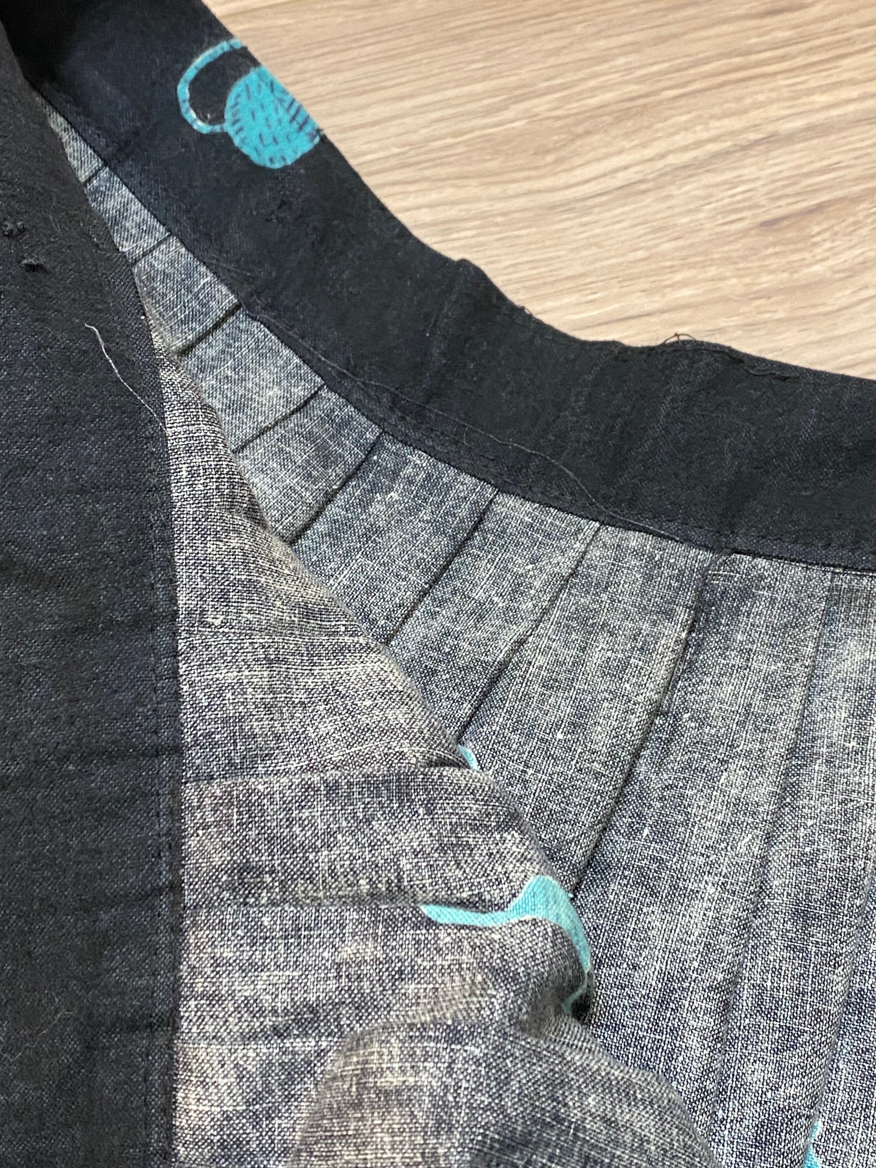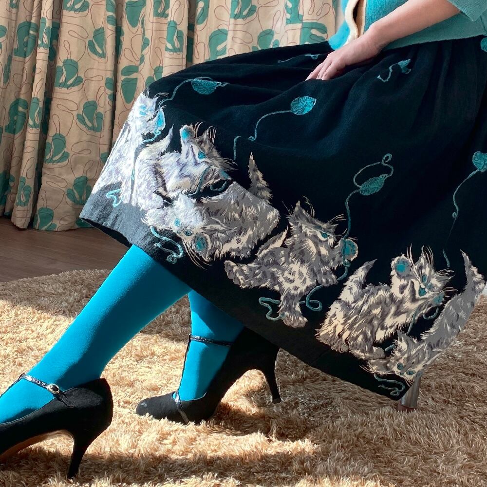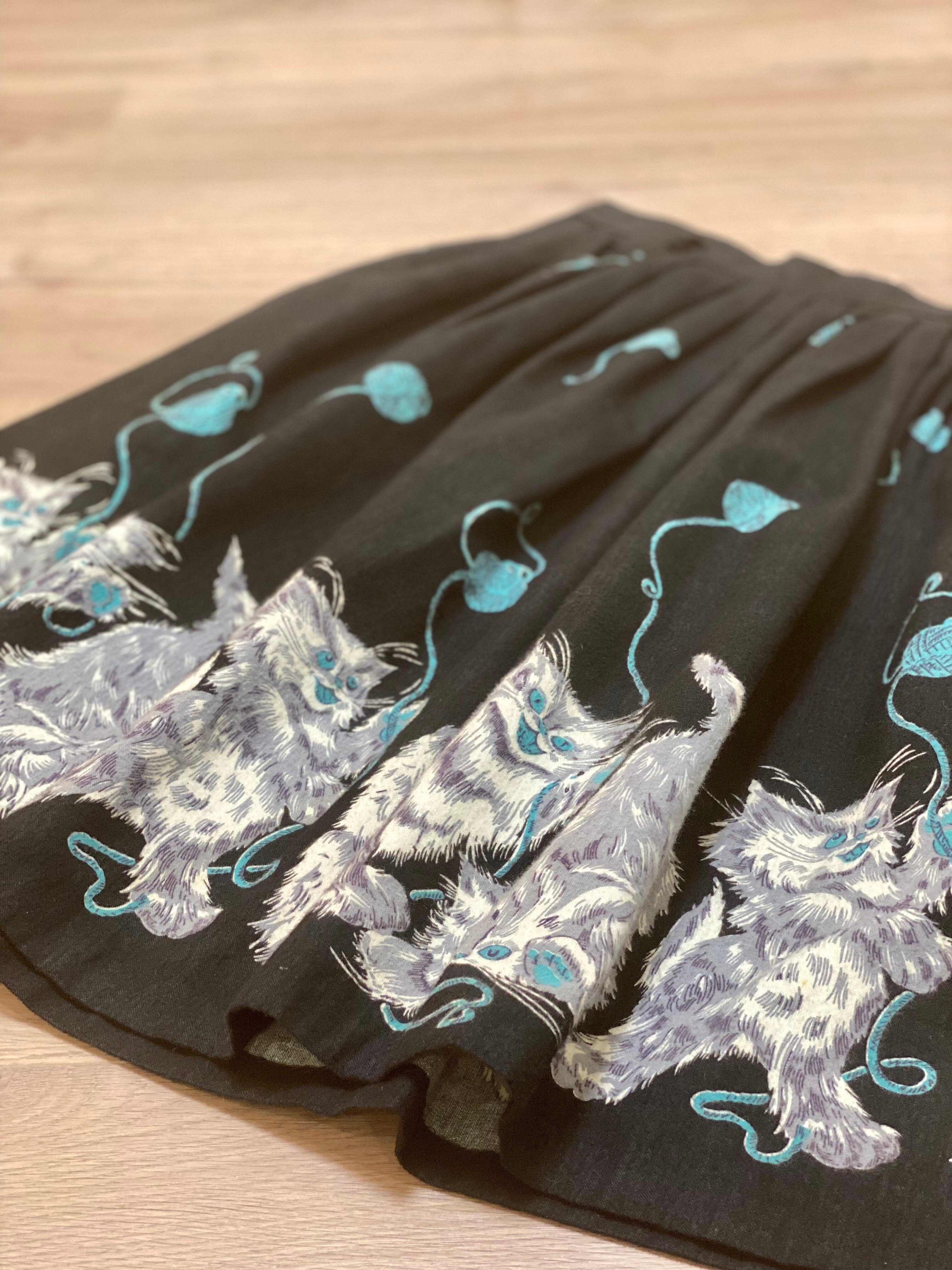 毛糸玉と遊ぶネコ柄。ウエストはタックギャザーでボリュームたっぷりのシルエット。コレクターさんにはたまらないアイテムですね。ハンドメイドかと思われます。フィット&フレアーでお楽しみ下さい。