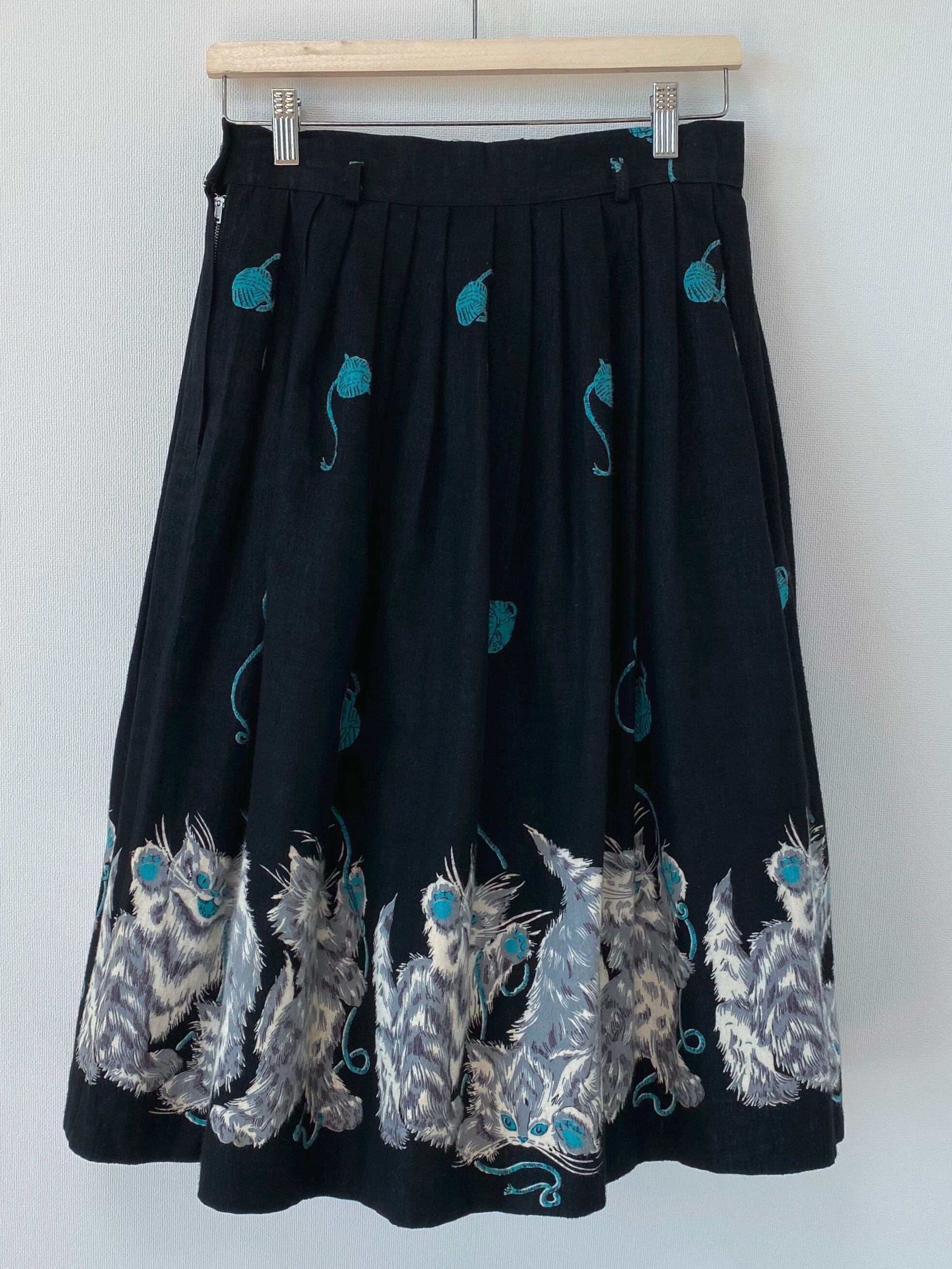 50's〜60's cat and yarn ball pattern wool flare skirt
