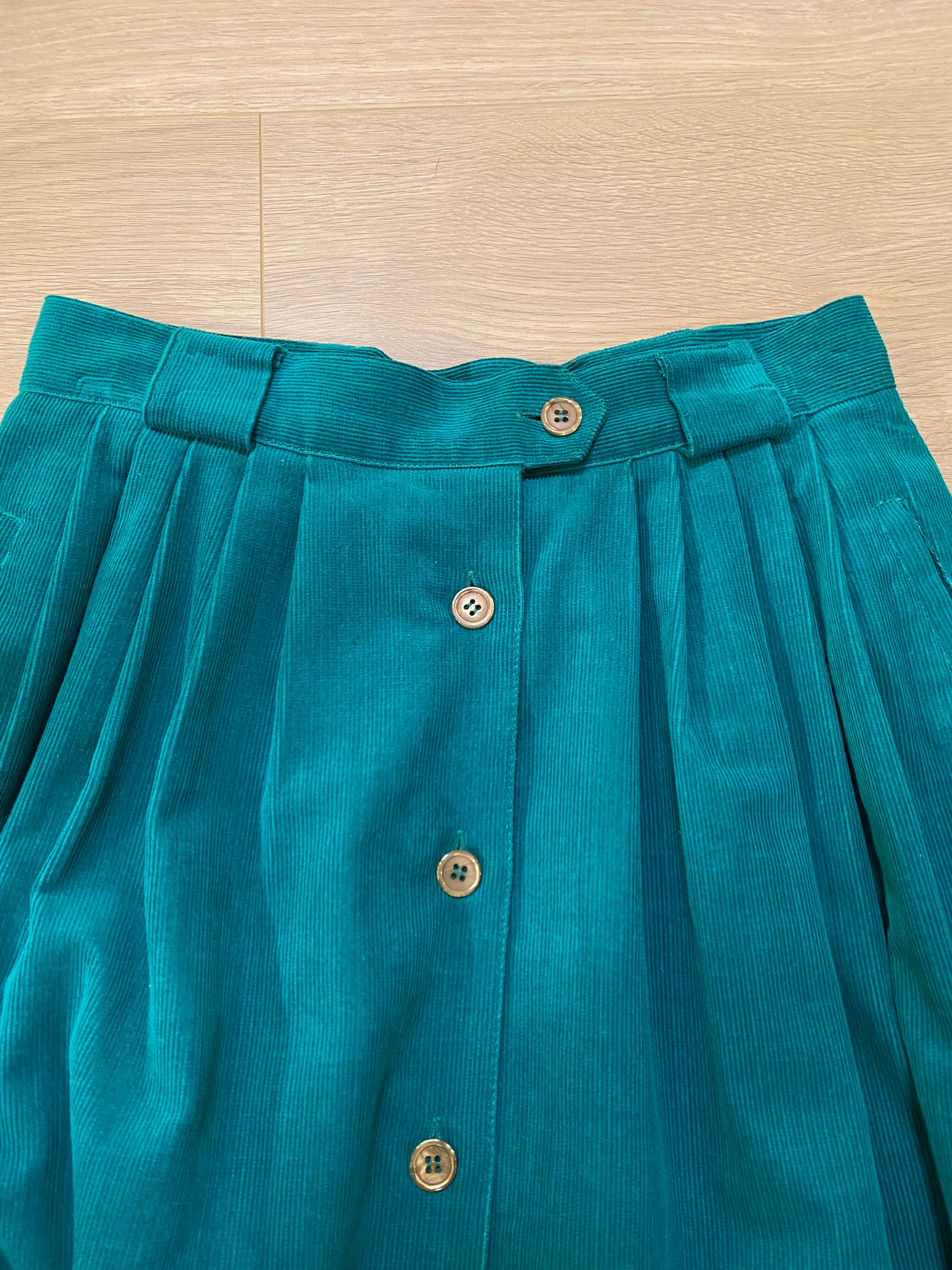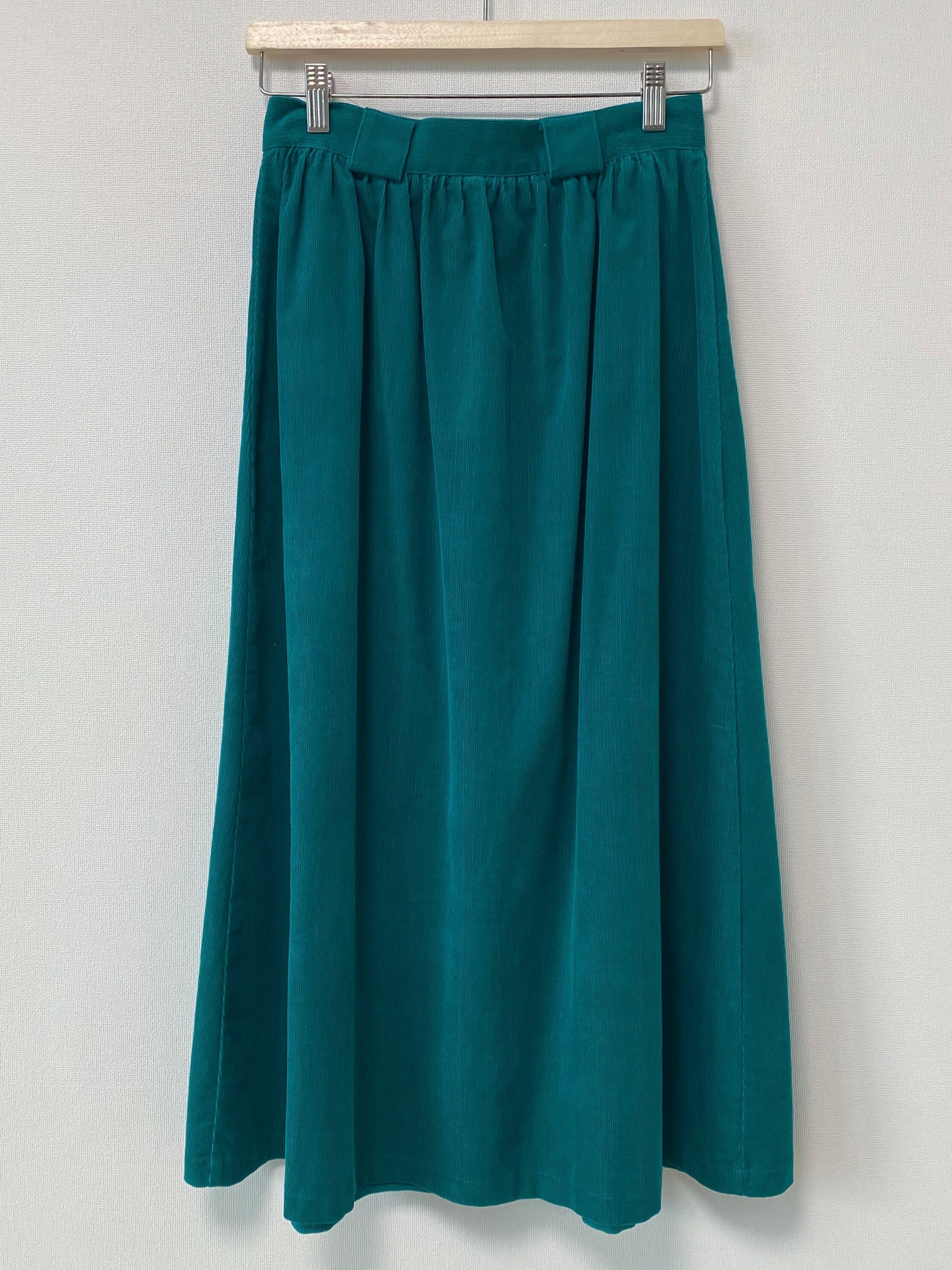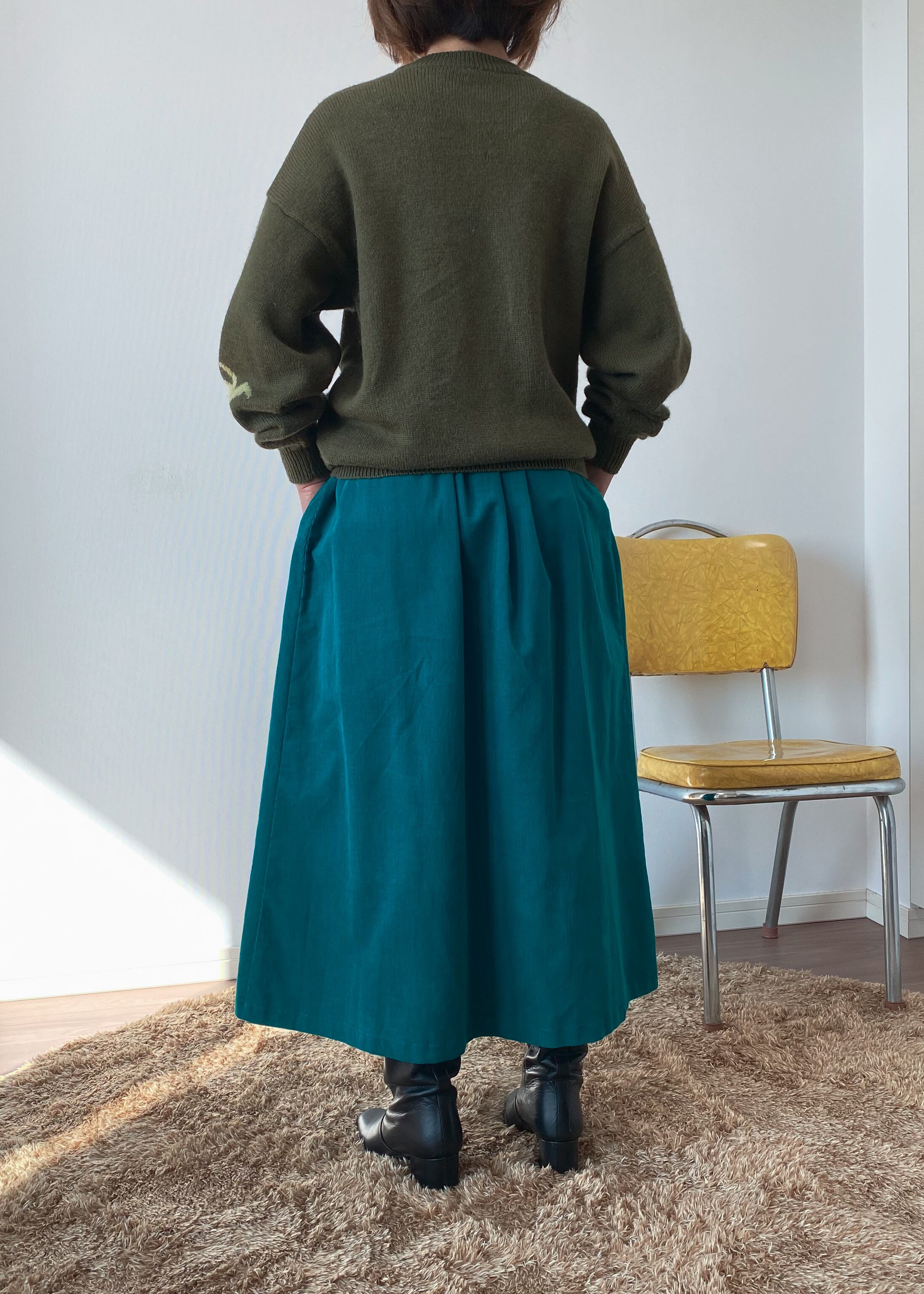 発色の良いエメラルドグリーンのフレアースカート。フロントはタック使いでボリュームがあり、バックはギャザー使いで控えめなデザインです。