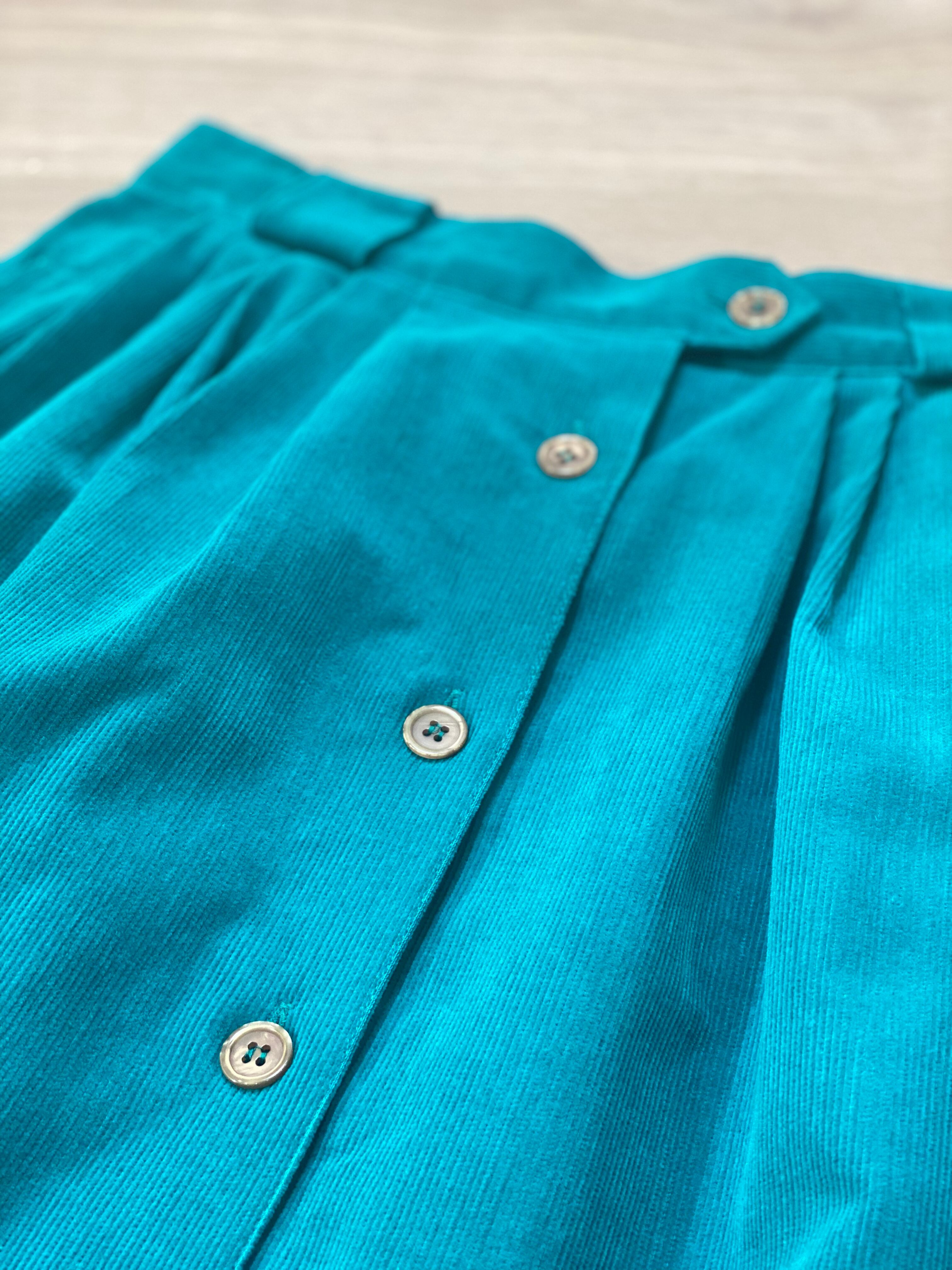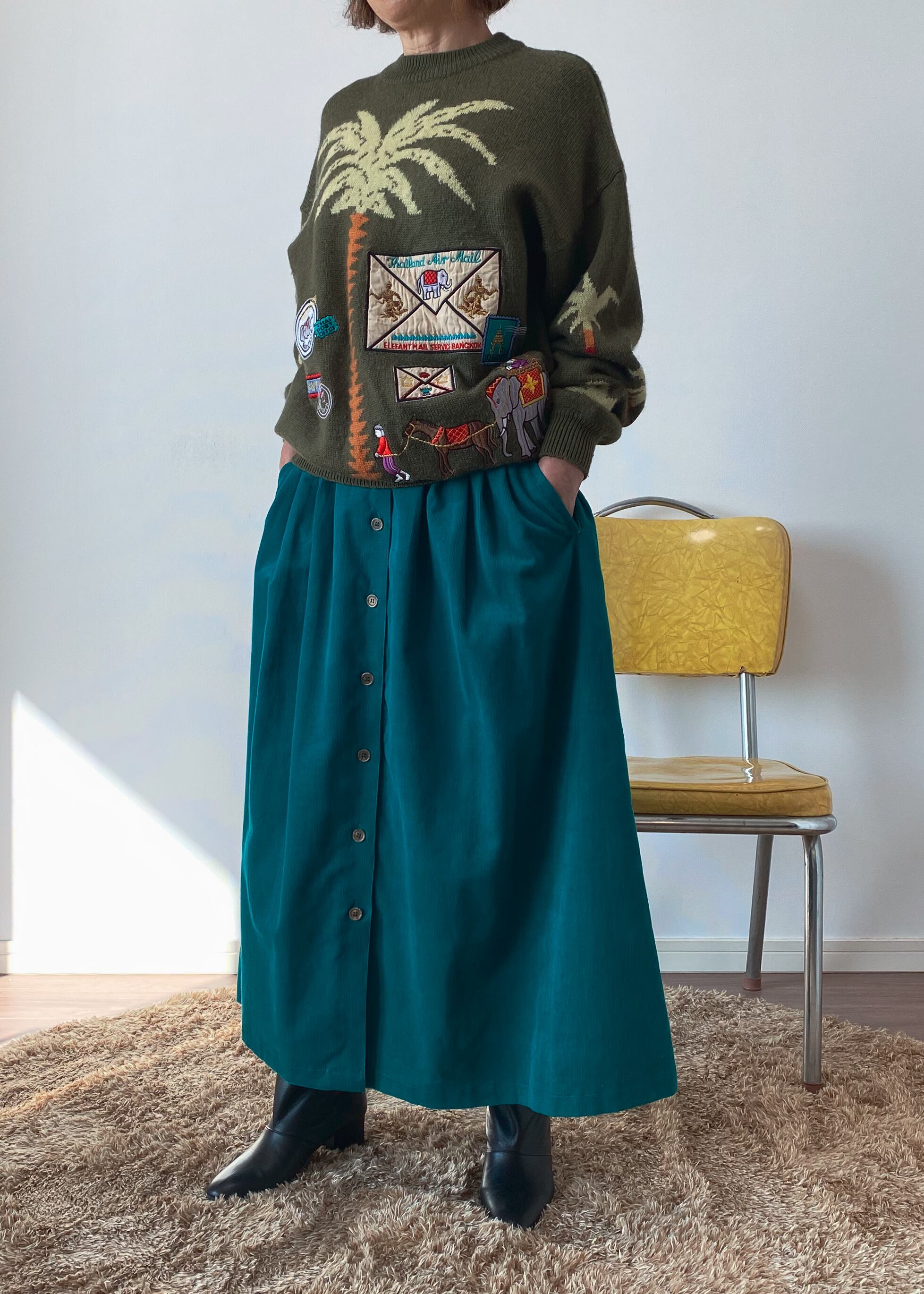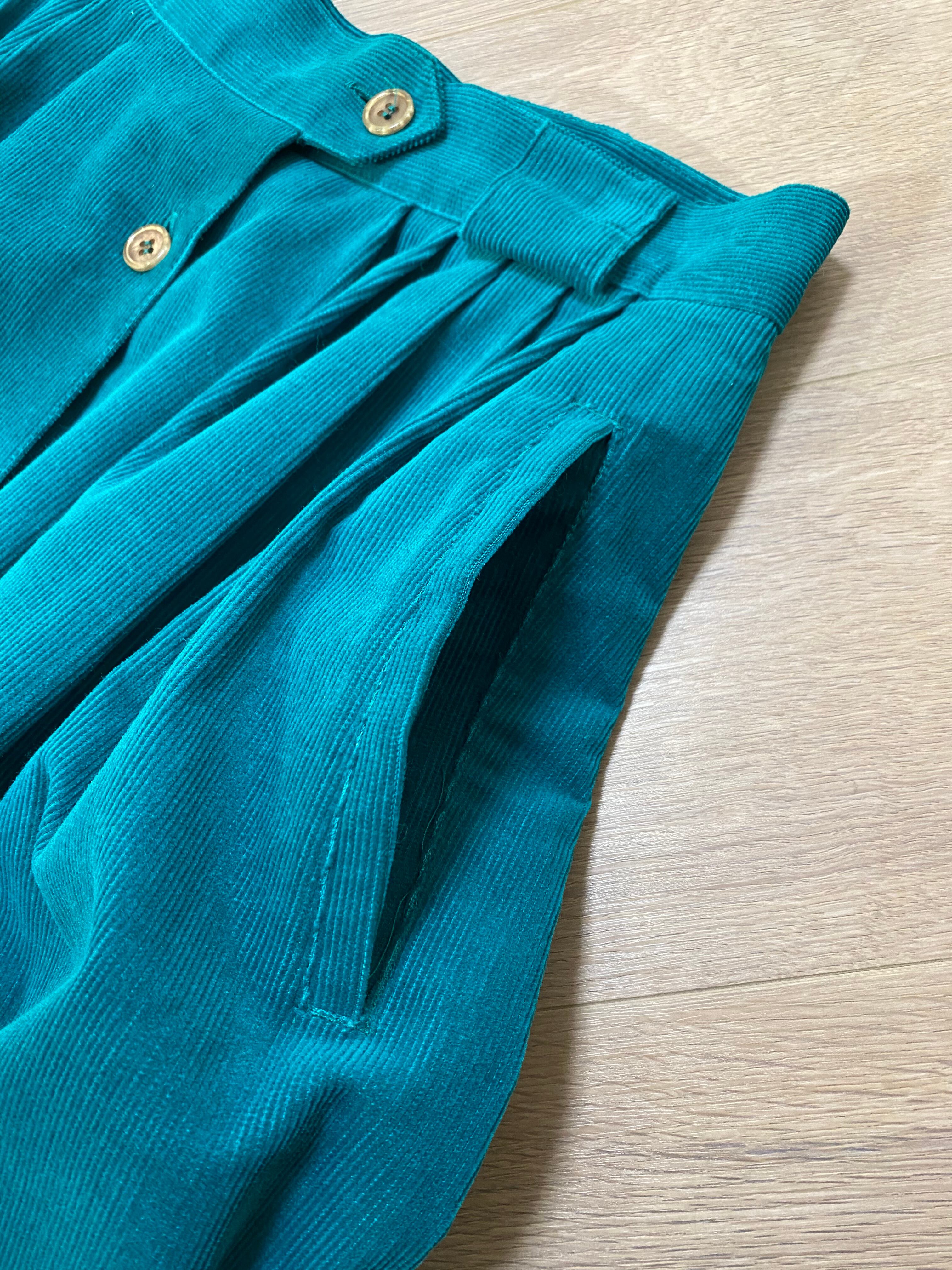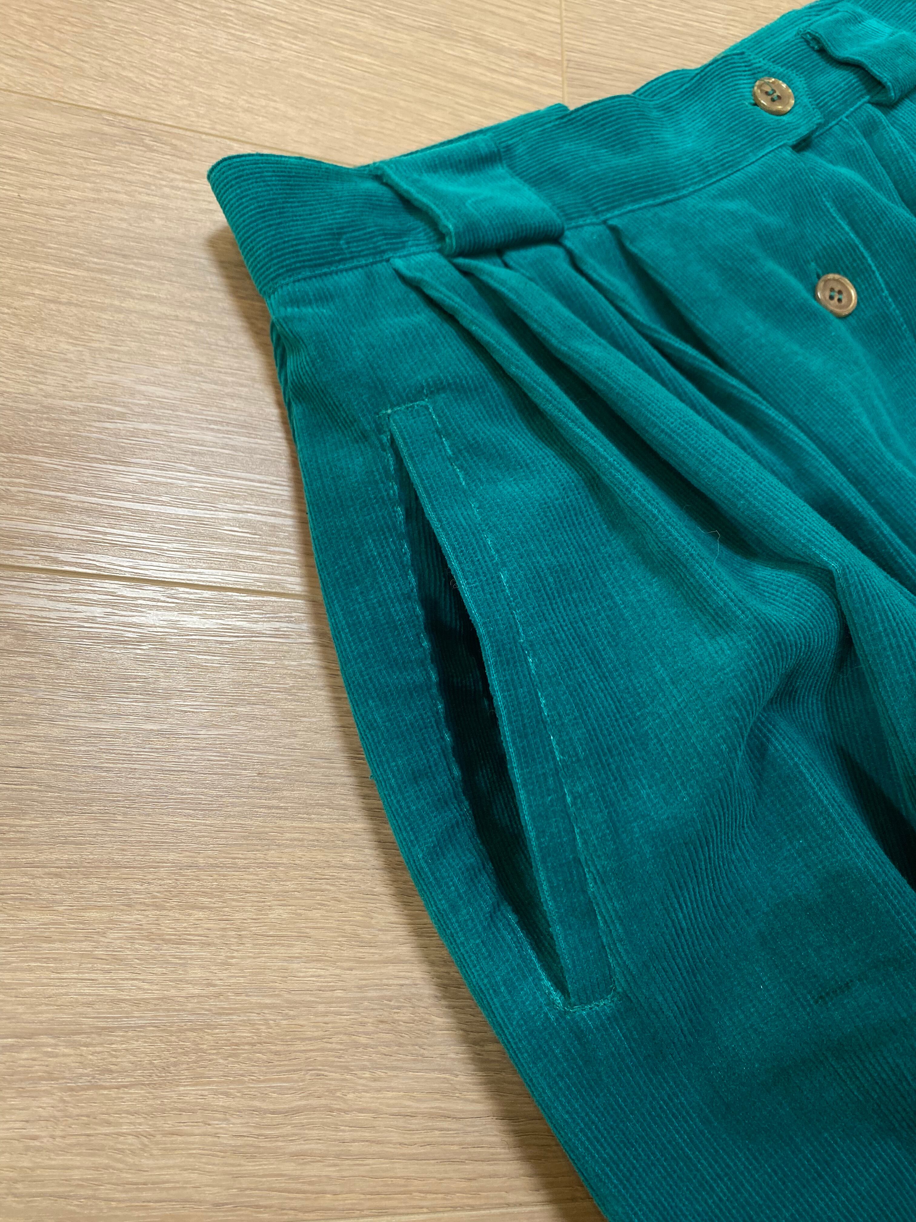 発色の良いエメラルドグリーンのフレアースカート。フロントはタック使いでボリュームがあり、バックはギャザー使いで控えめなデザインです。