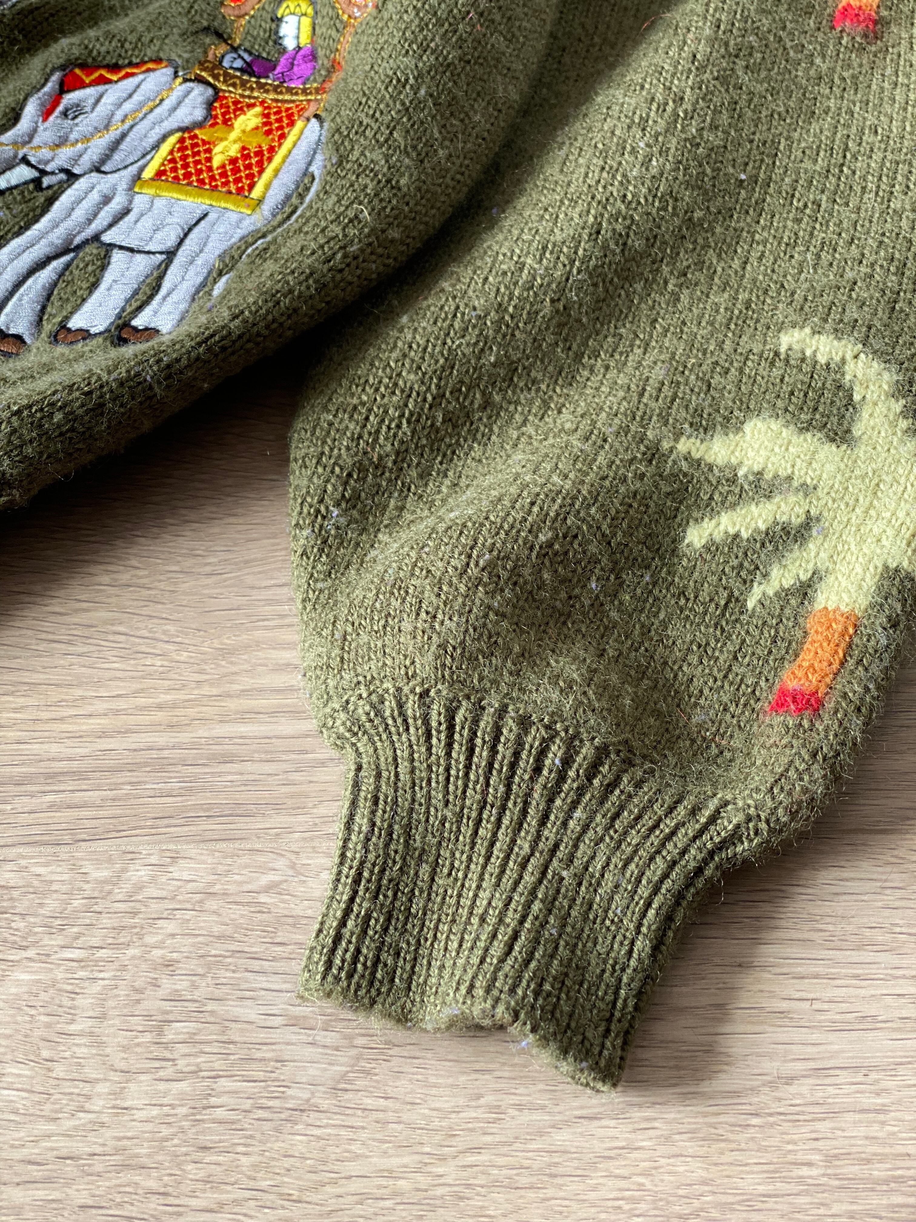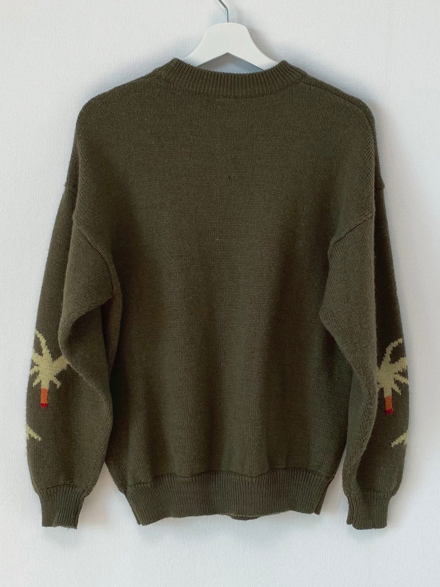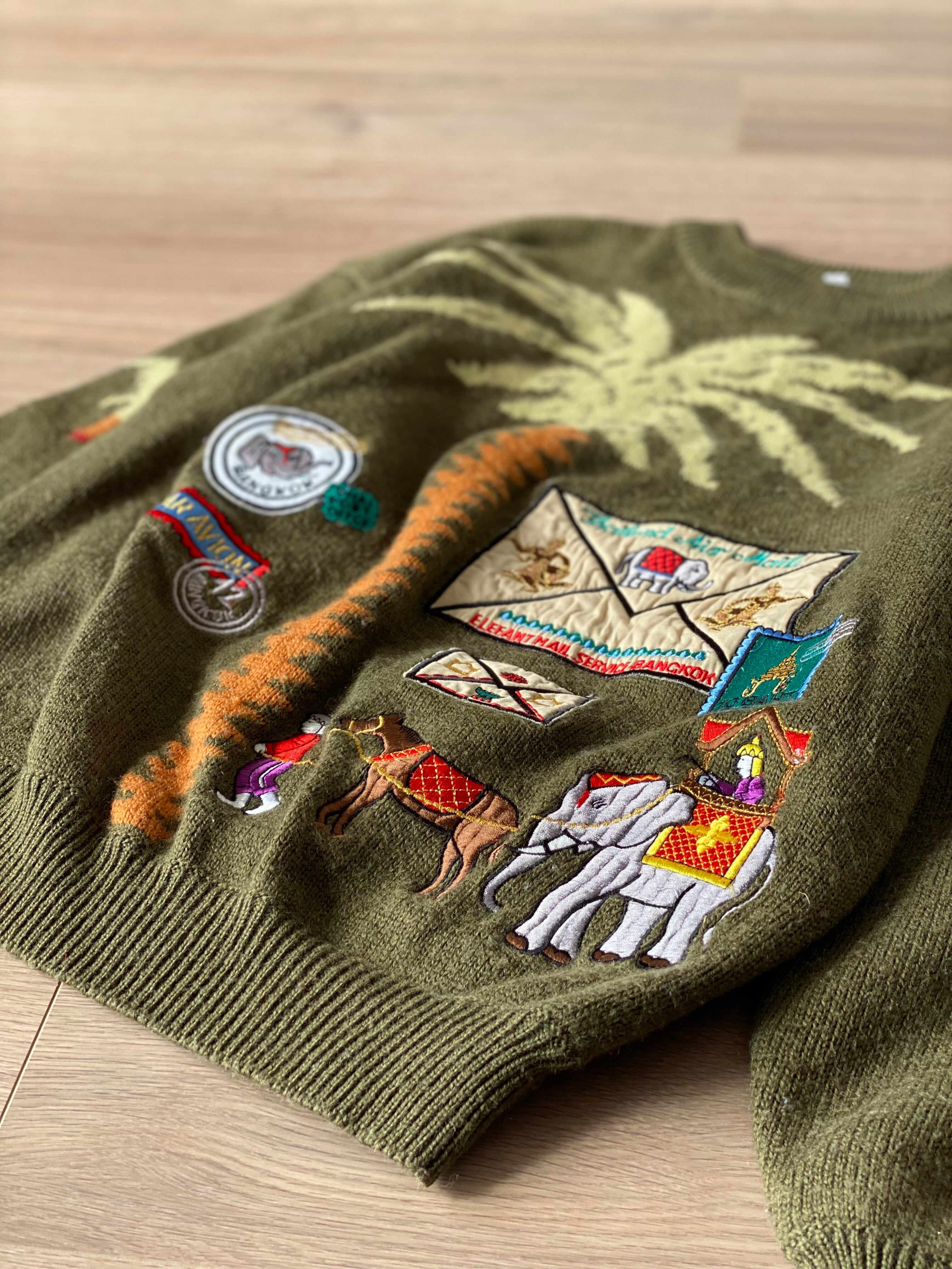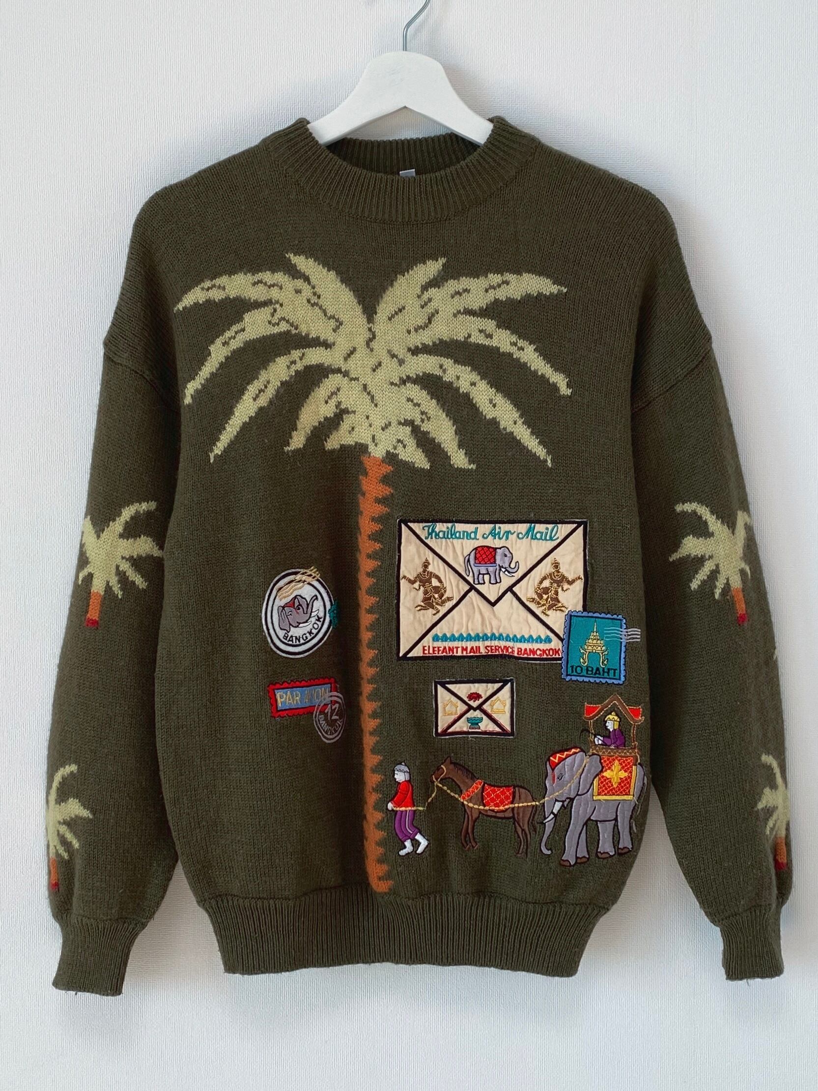 椰子の木模様が袖にもあしらわれ、「バンコク」のエアメールや切手、象などのアップリケが可愛いニットです。ベースの色が落ち着いたオリーブグリーンなので合わせやすい1着です。
