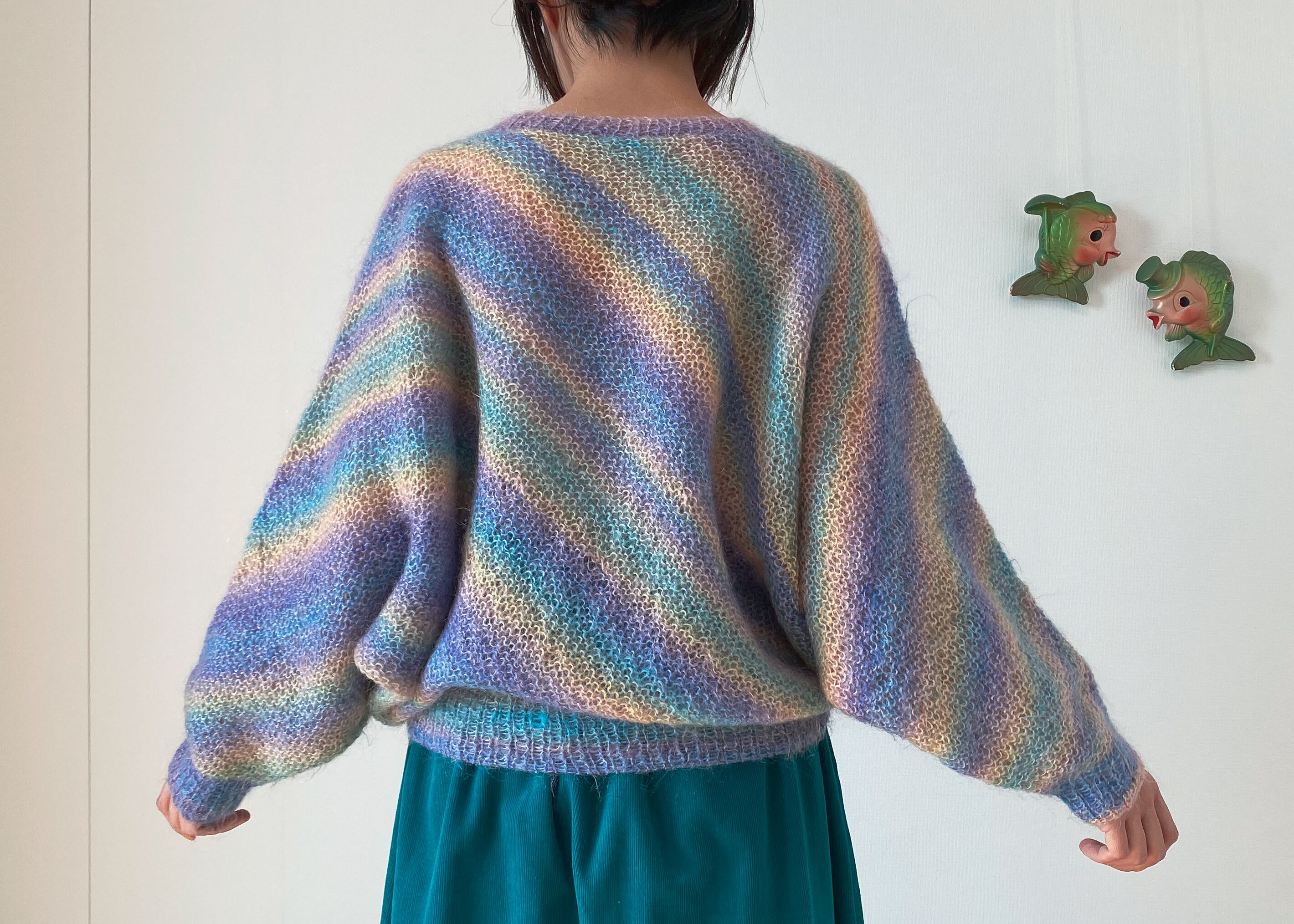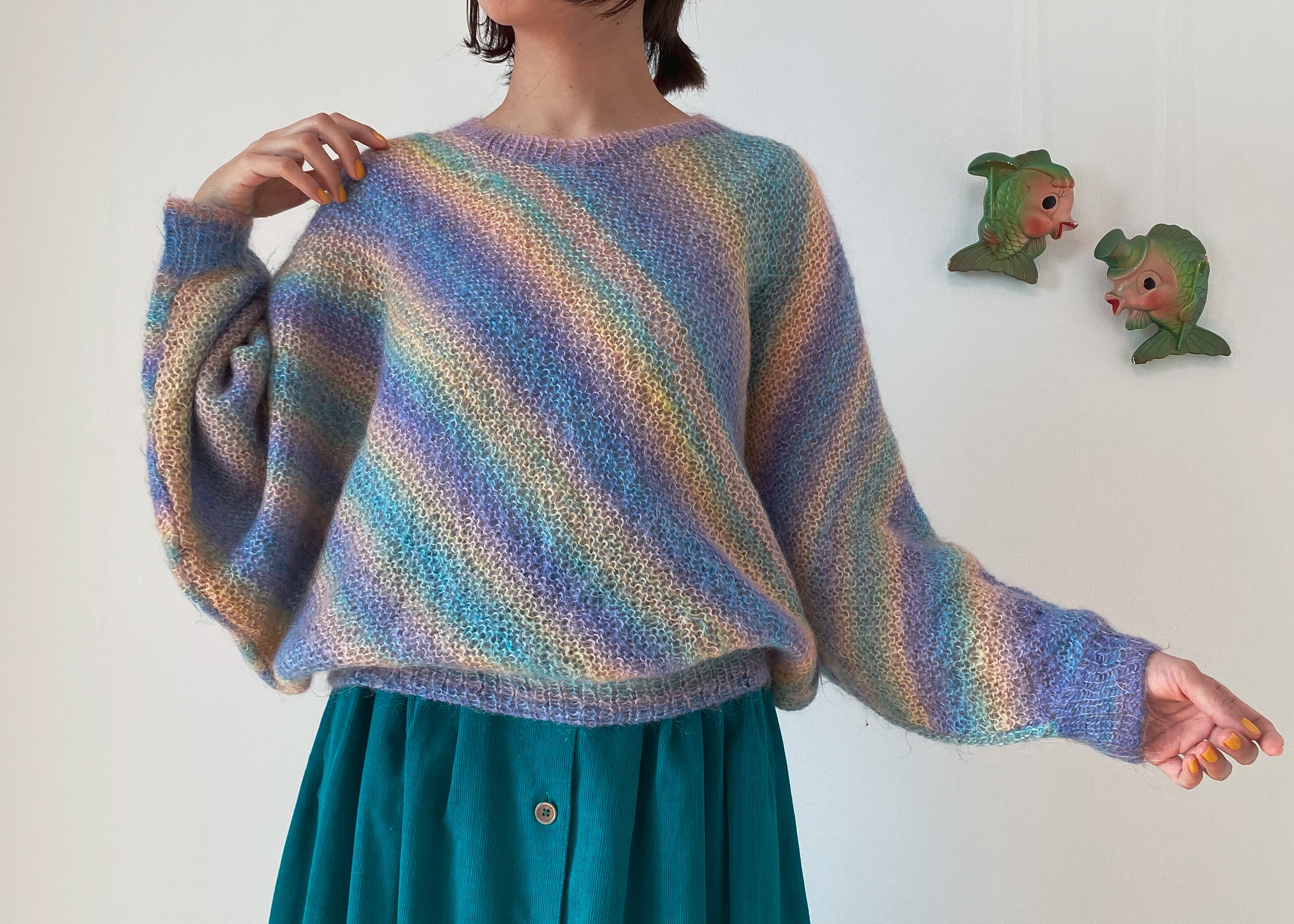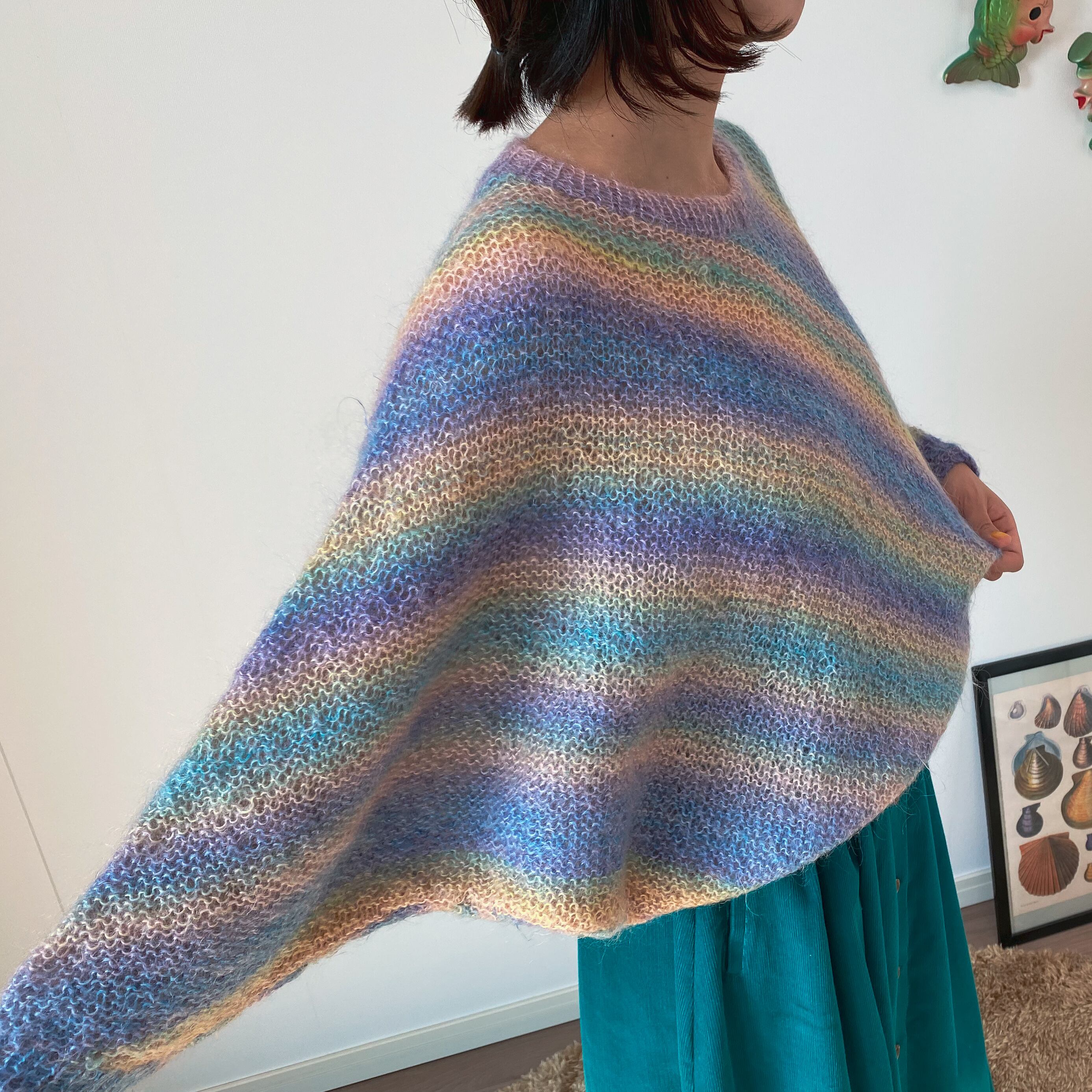 ショート丈のモヘアニット。ウエストからのドルマンスリーブでゆったりと優雅なシルエット。斜めの虹色ボーダーが本当に可愛いアイテムです。