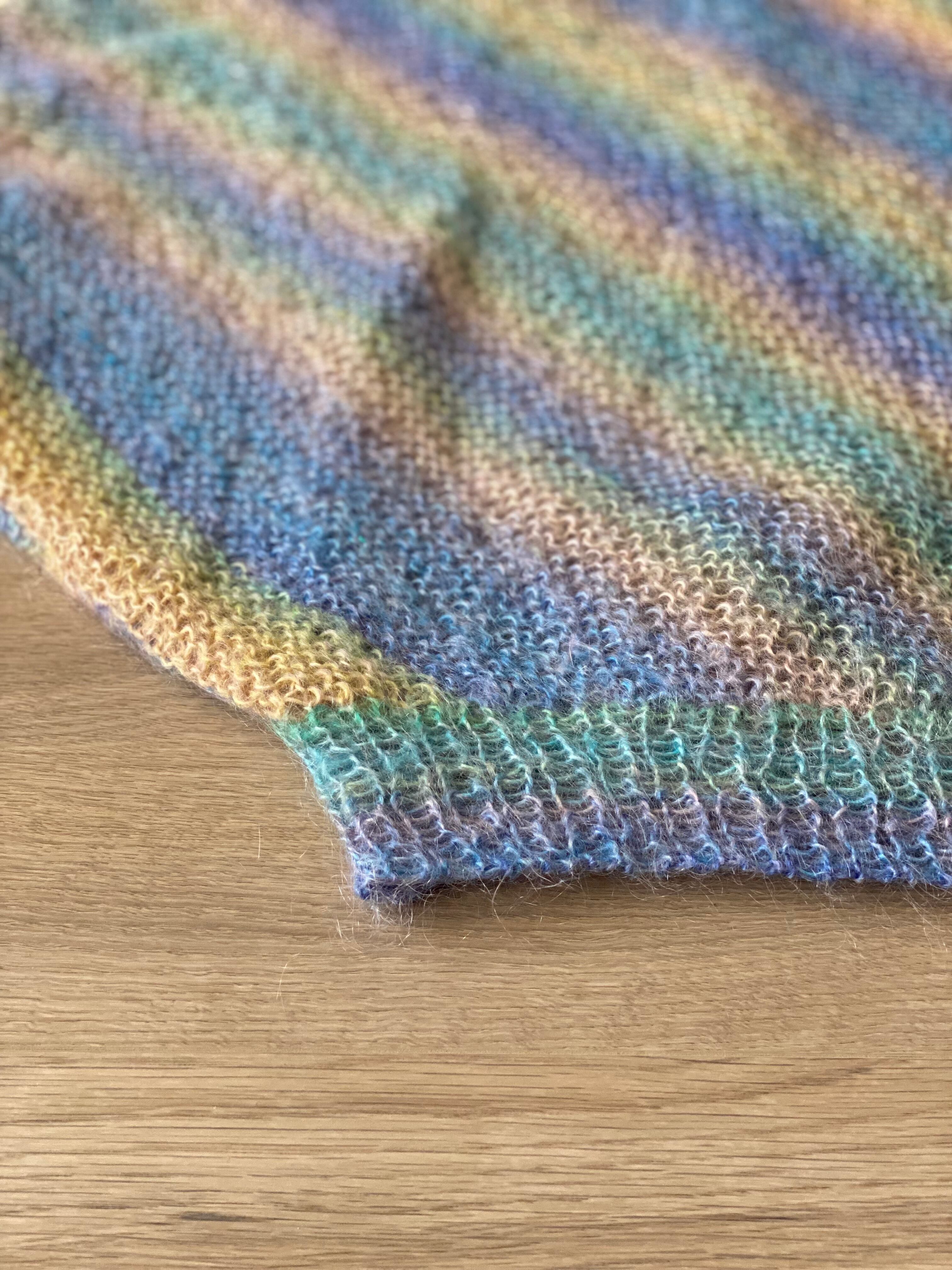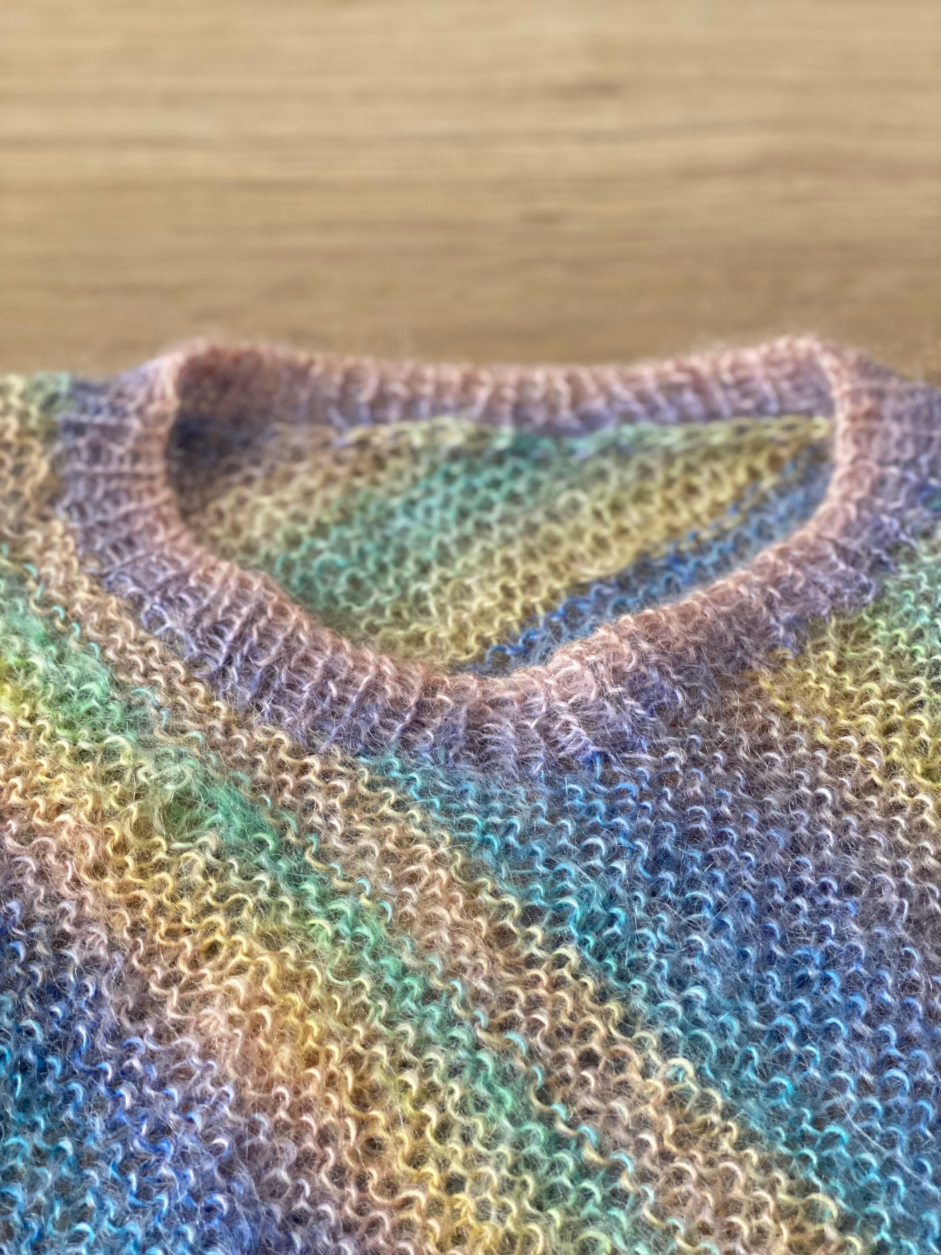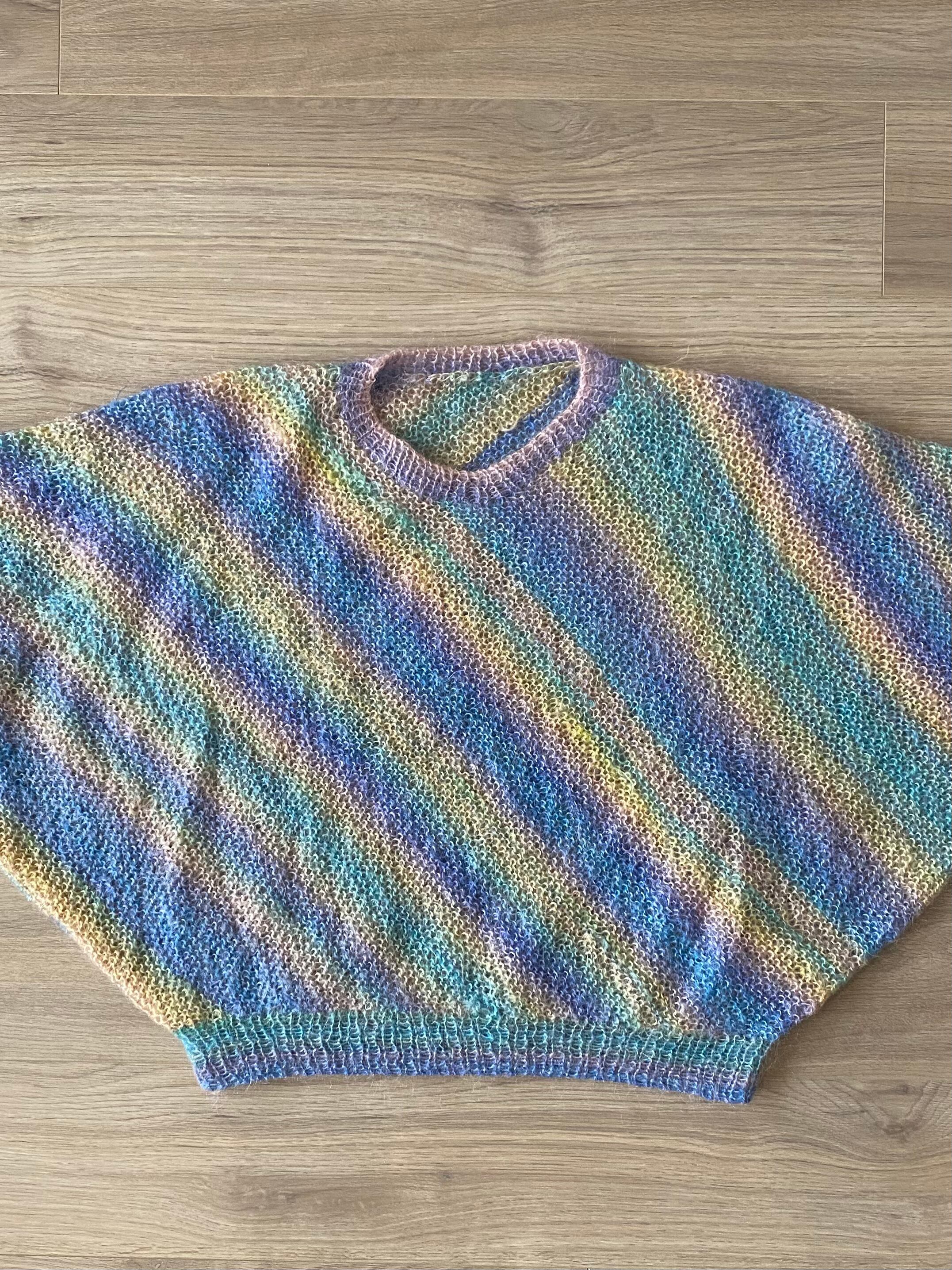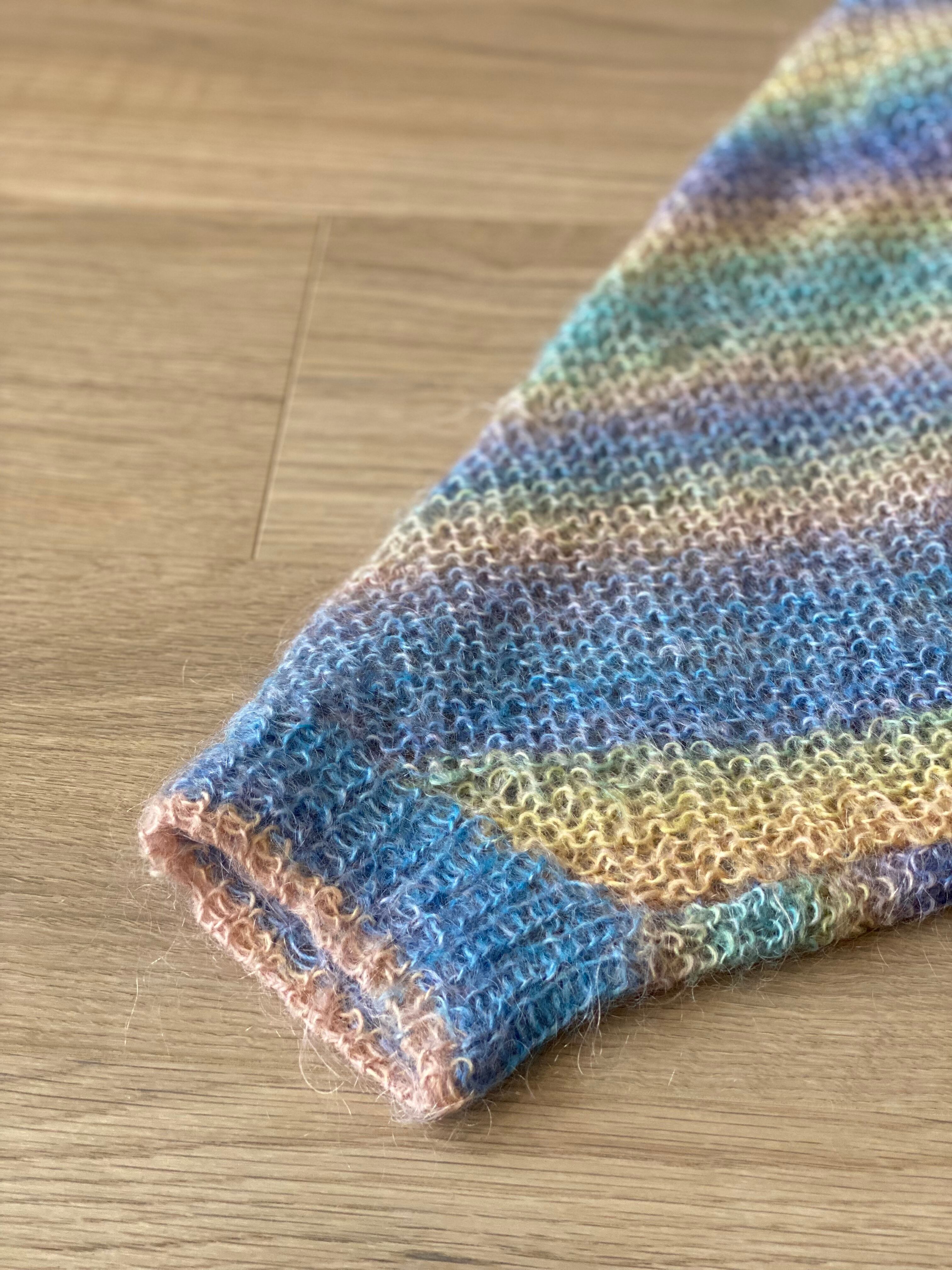 ショート丈のモヘアニット。ウエストからのドルマンスリーブでゆったりと優雅なシルエット。斜めの虹色ボーダーが本当に可愛いアイテムです。