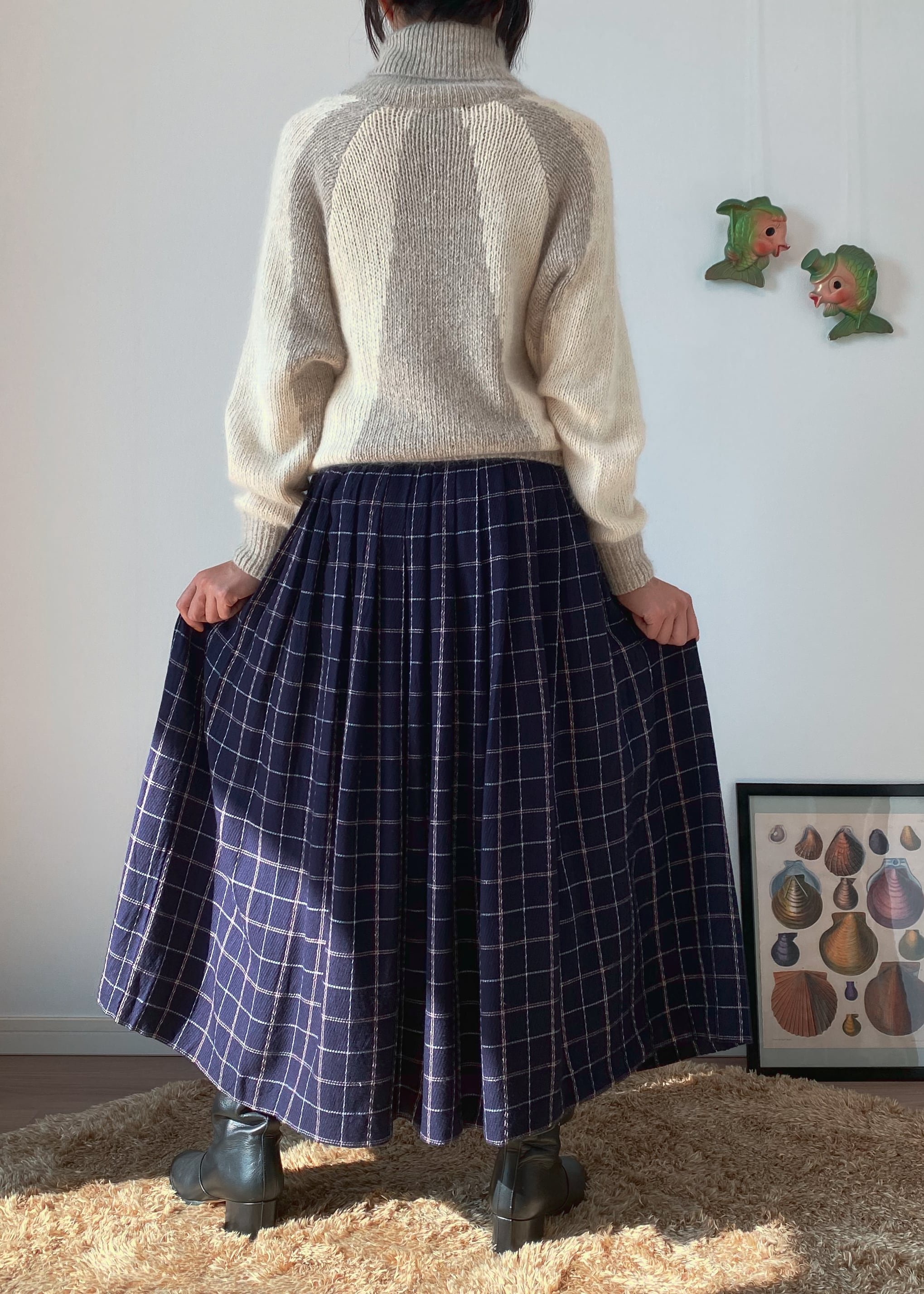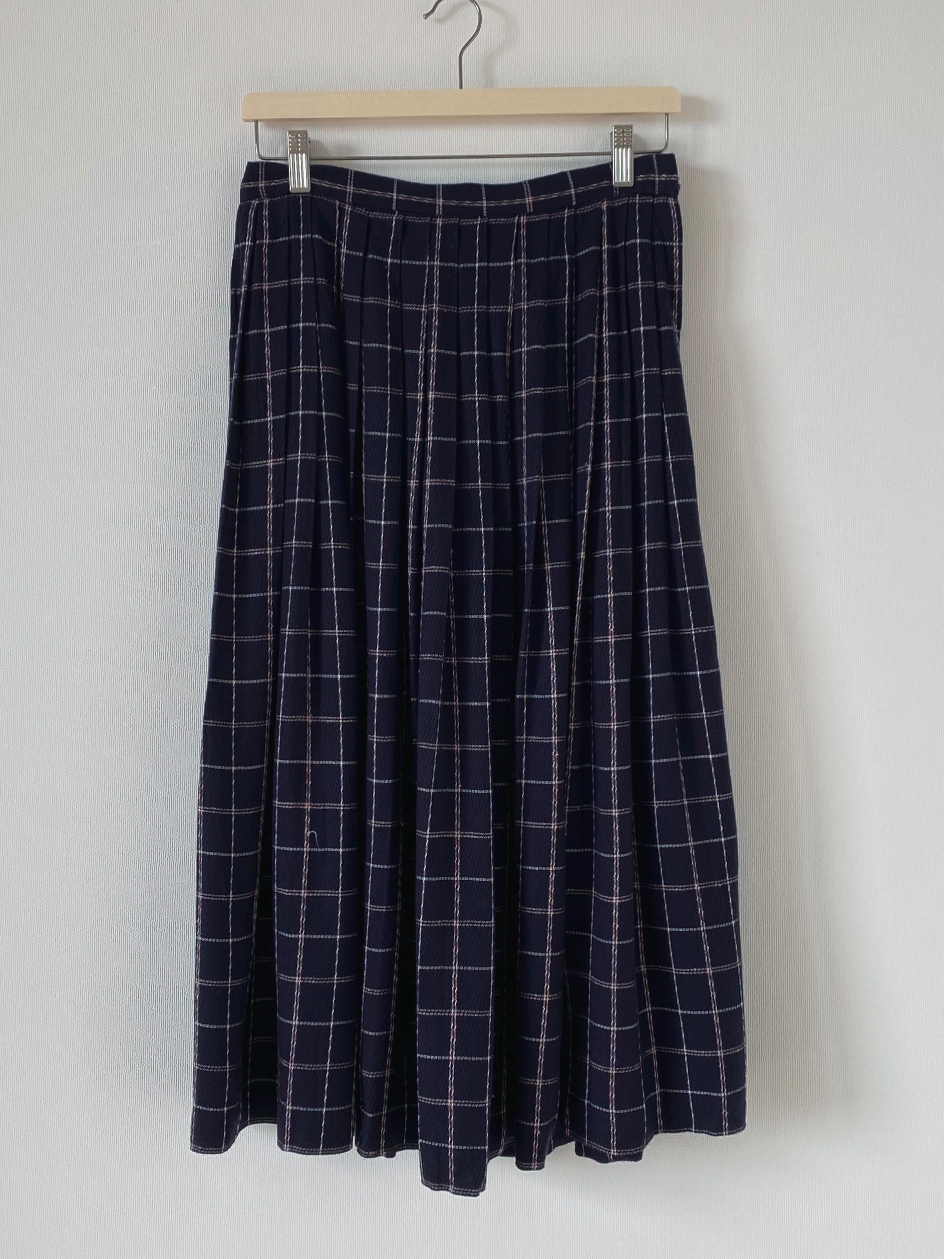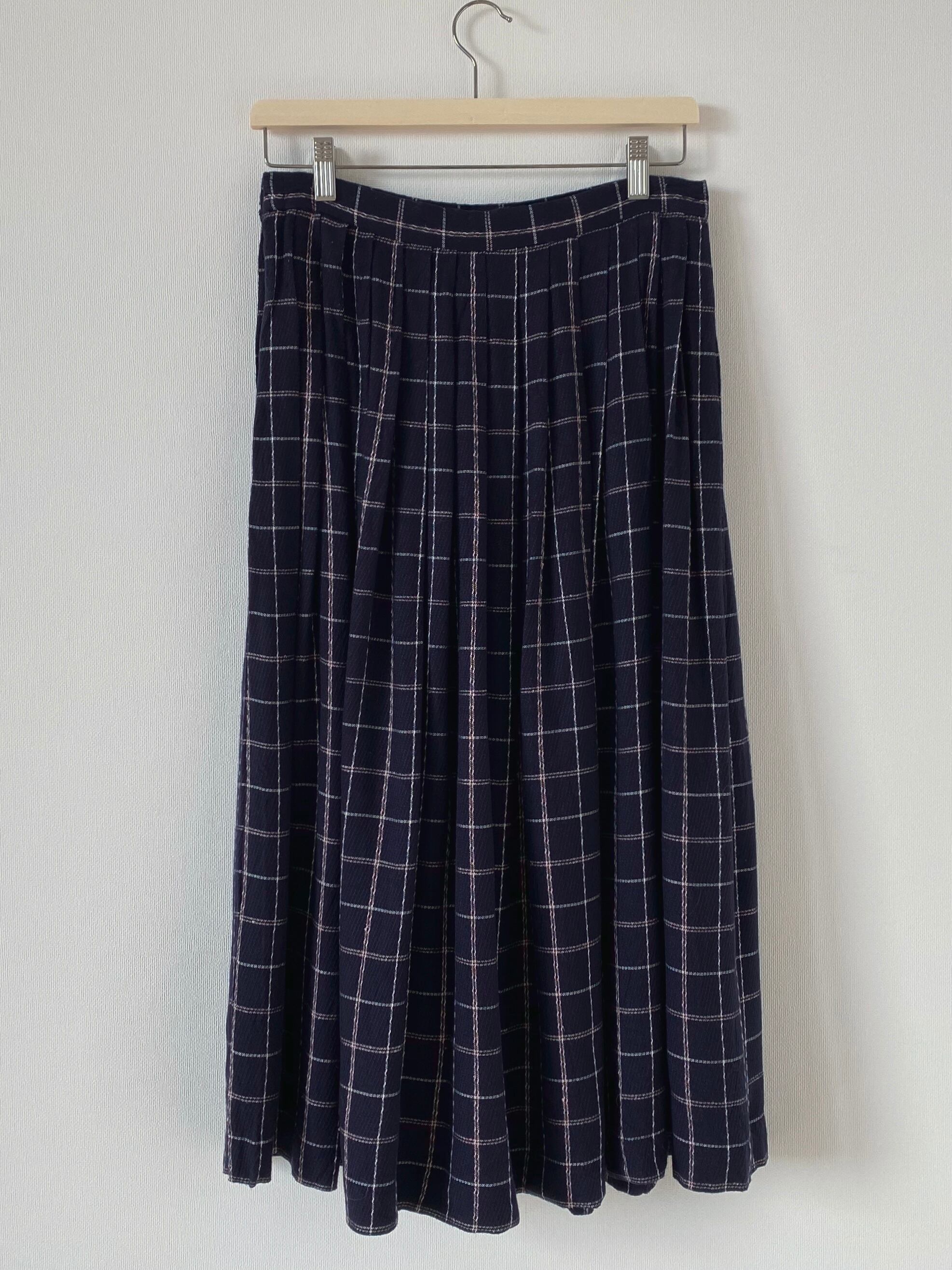 ネイビー生地に白糸とピンク糸のチェック柄です。ウエスト部分タックから裾に向かっての緩いプリーツデザインでボリューム感が可愛いです。合わせる靴でトラッドにもレディライクにもお楽しみ頂けます。