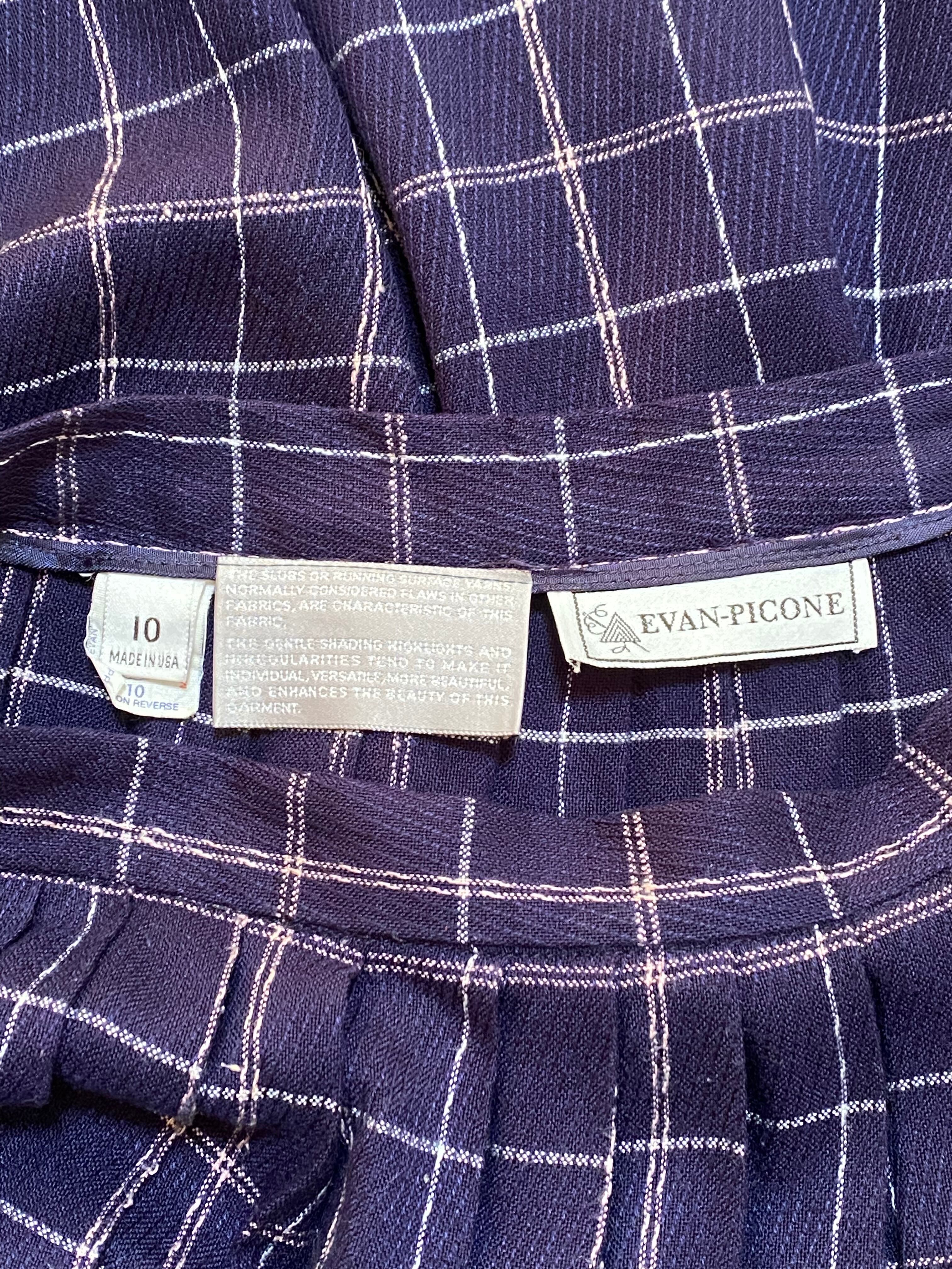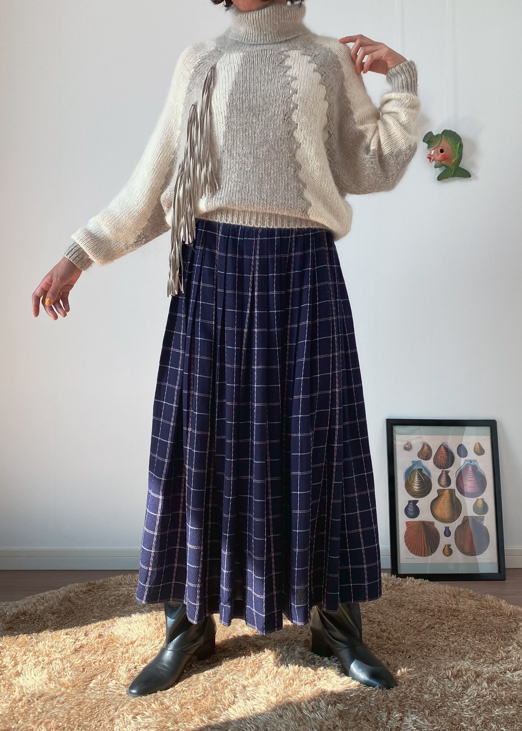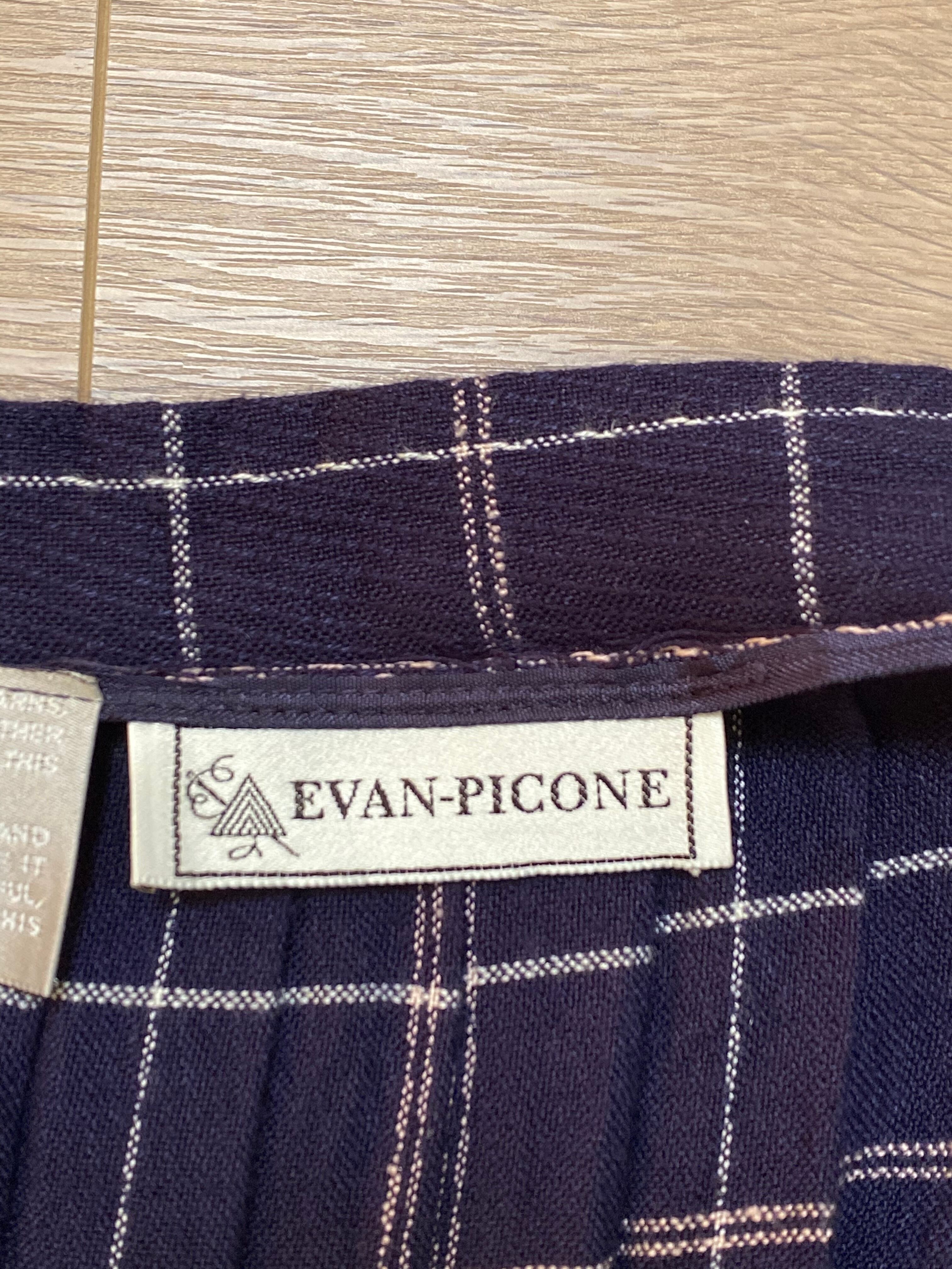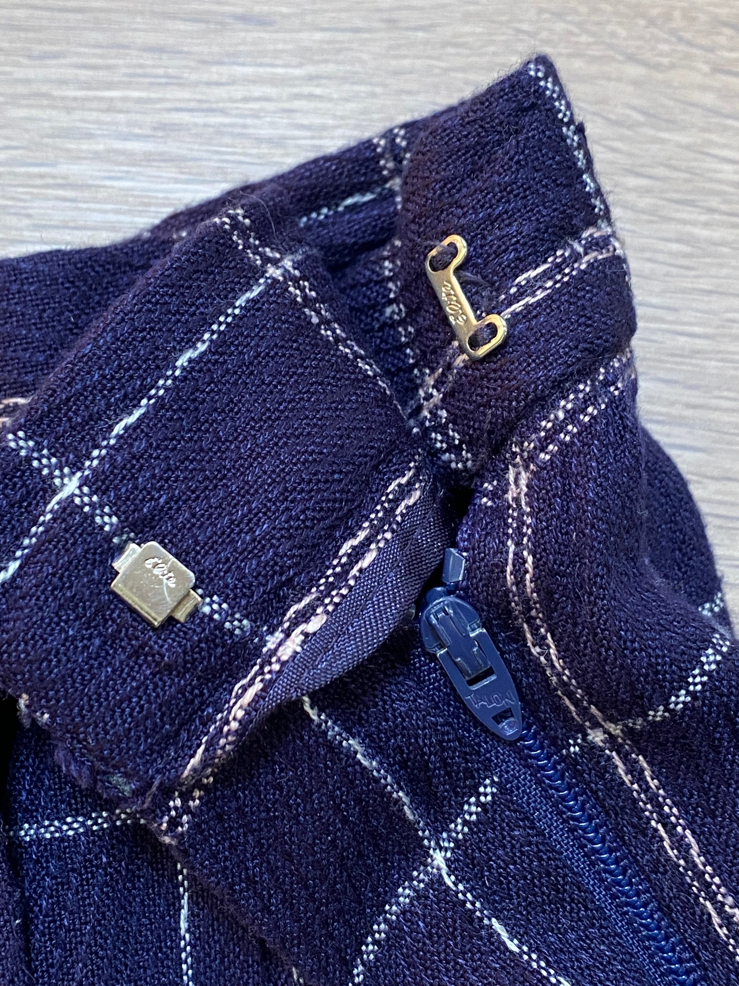 ネイビー生地に白糸とピンク糸のチェック柄です。ウエスト部分タックから裾に向かっての緩いプリーツデザインでボリューム感が可愛いです。合わせる靴でトラッドにもレディライクにもお楽しみ頂けます。