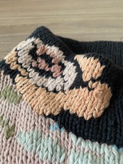 大きなバラと幾何学柄は淡い色、襟と袖口、裾のリブは黒でスパイシーに。花柄だけど甘すぎない雰囲気のセーターです。