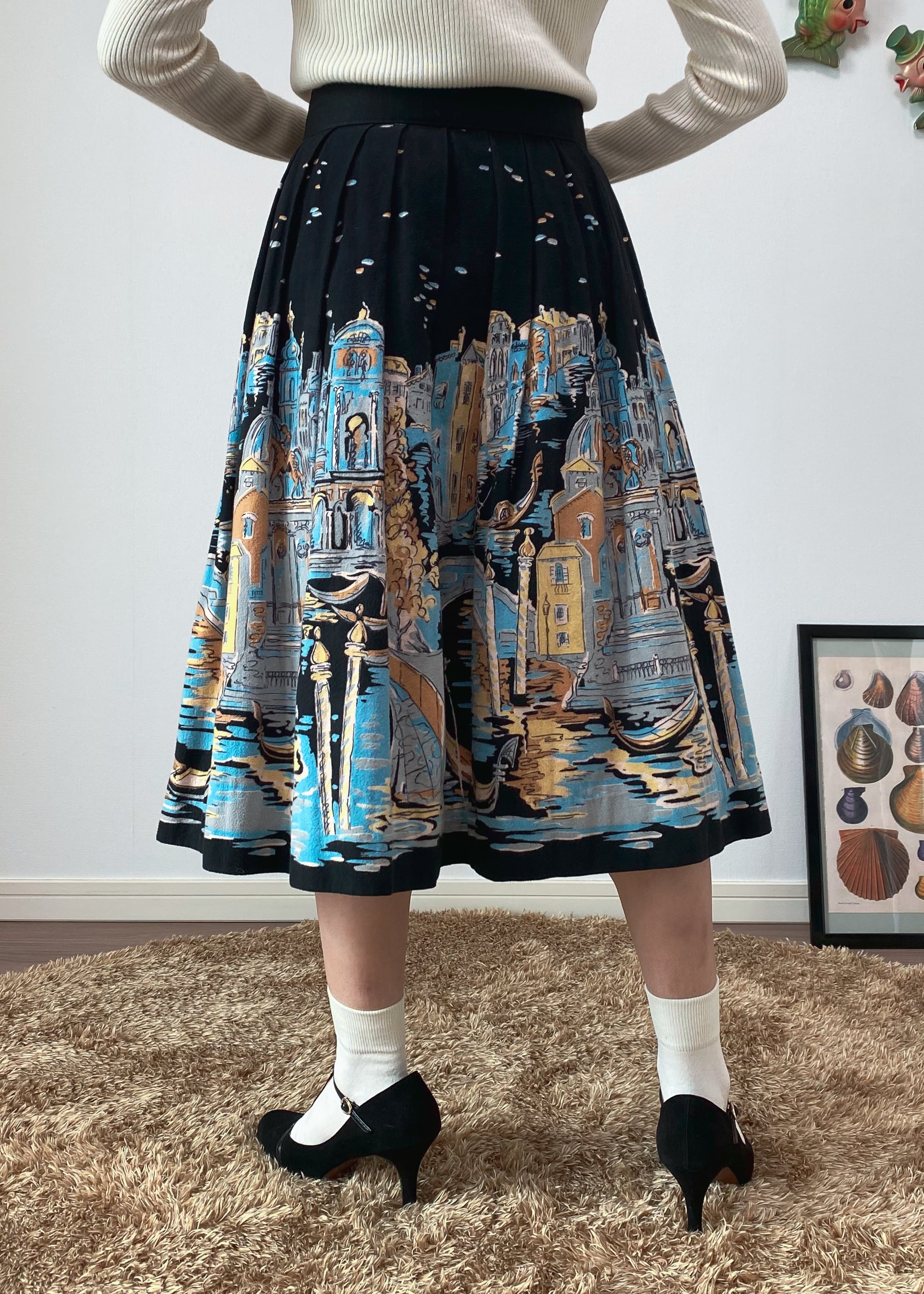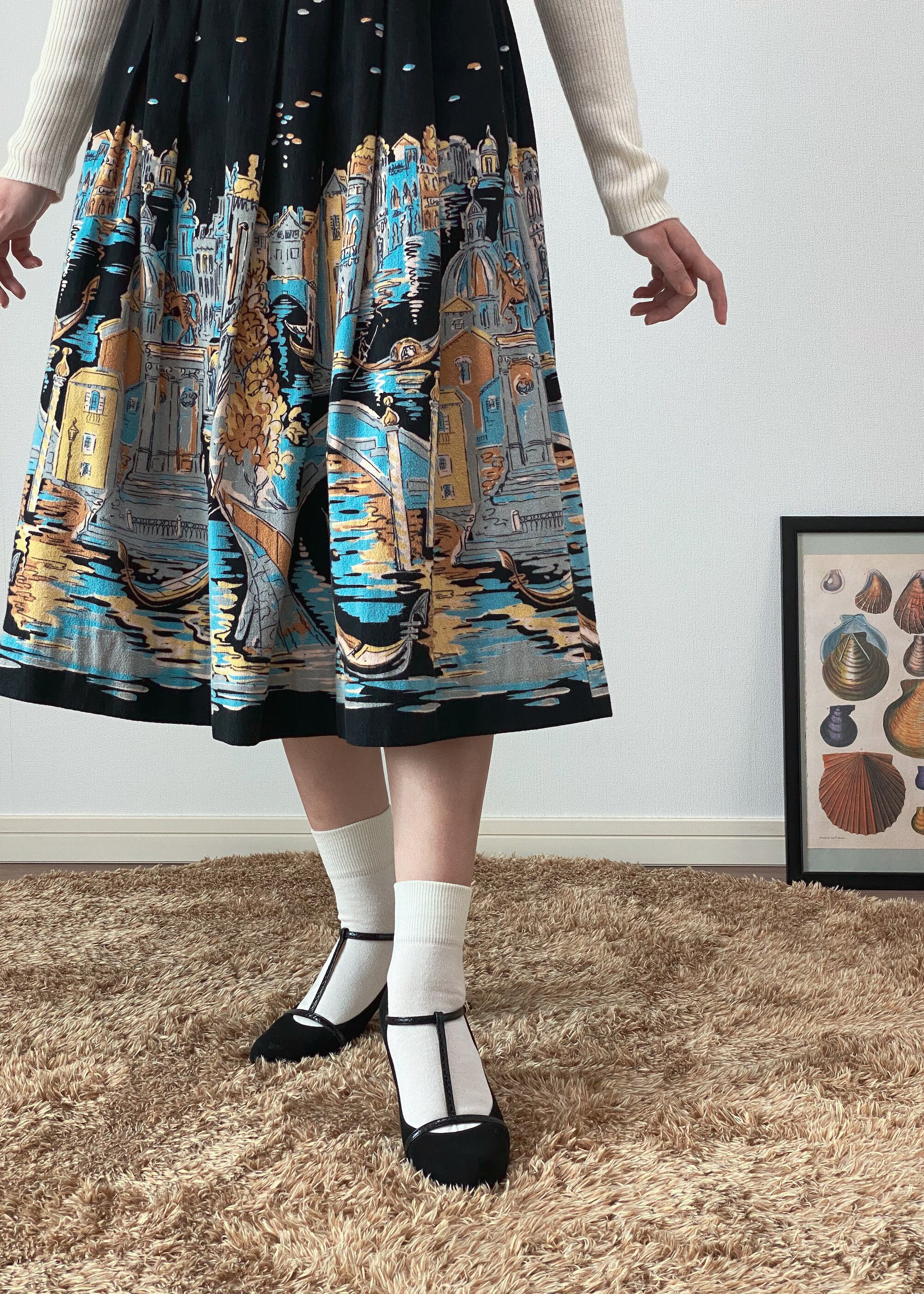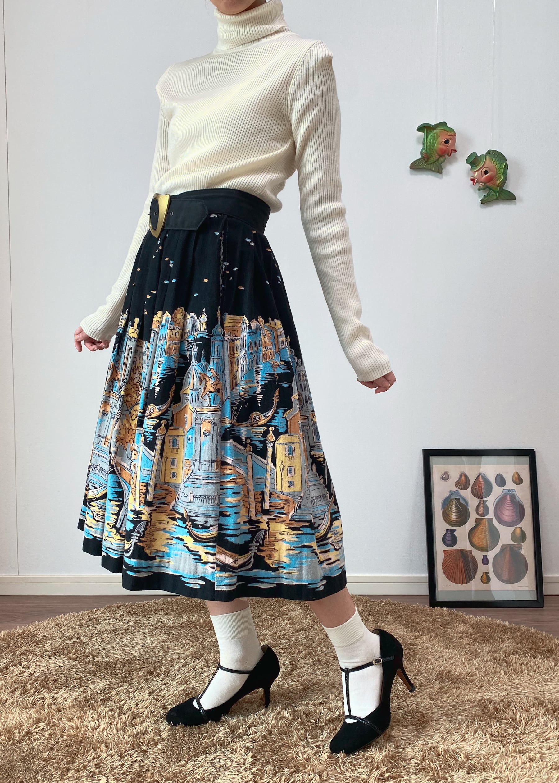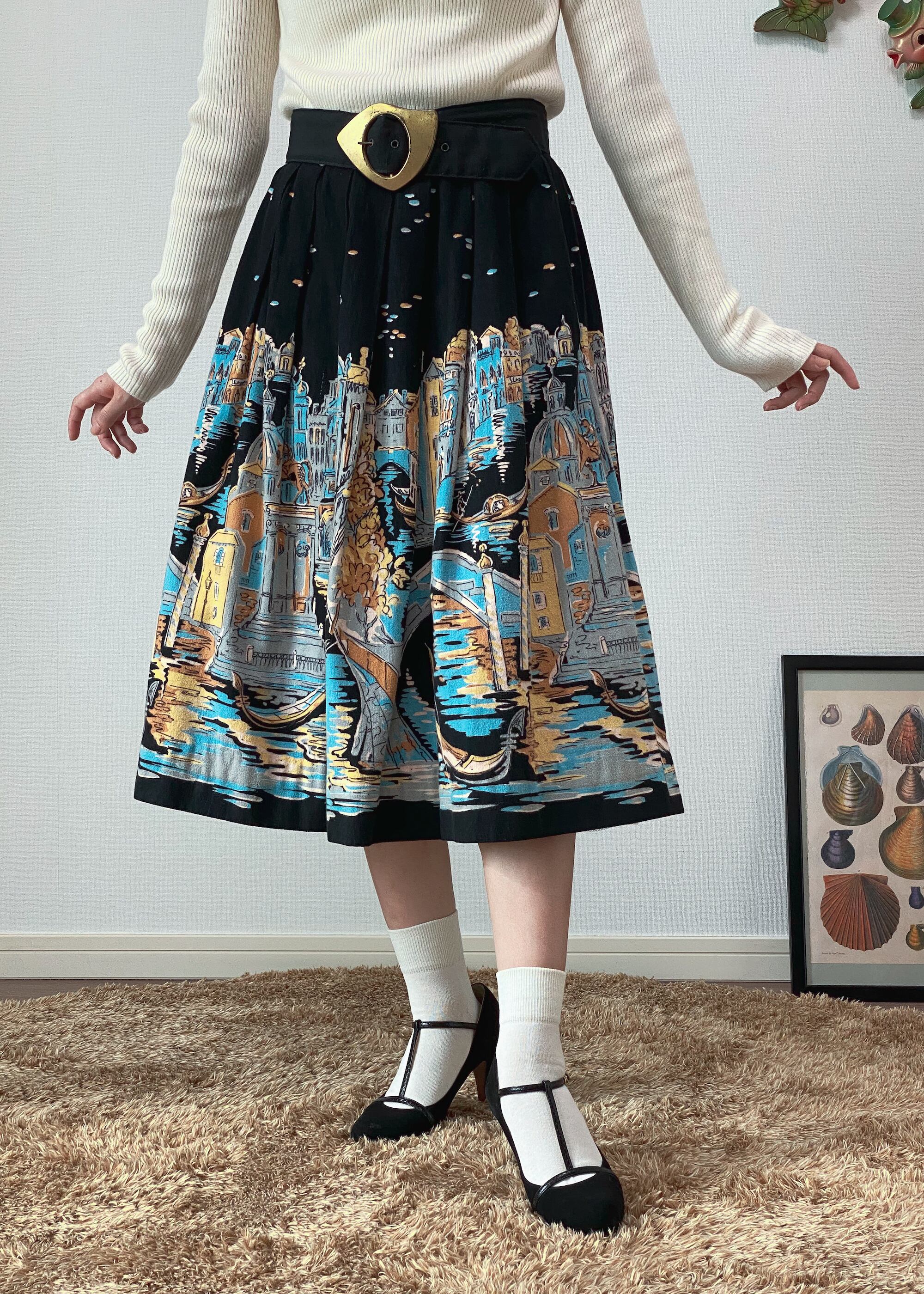 ベネチアの街並みがプリントされたタックスカート。ハンドメイドかと思われます。優しいタッチのプリント風景に思わずほっこりします。太めのベルトとパニエでフィット&フレアーな着こなしに。